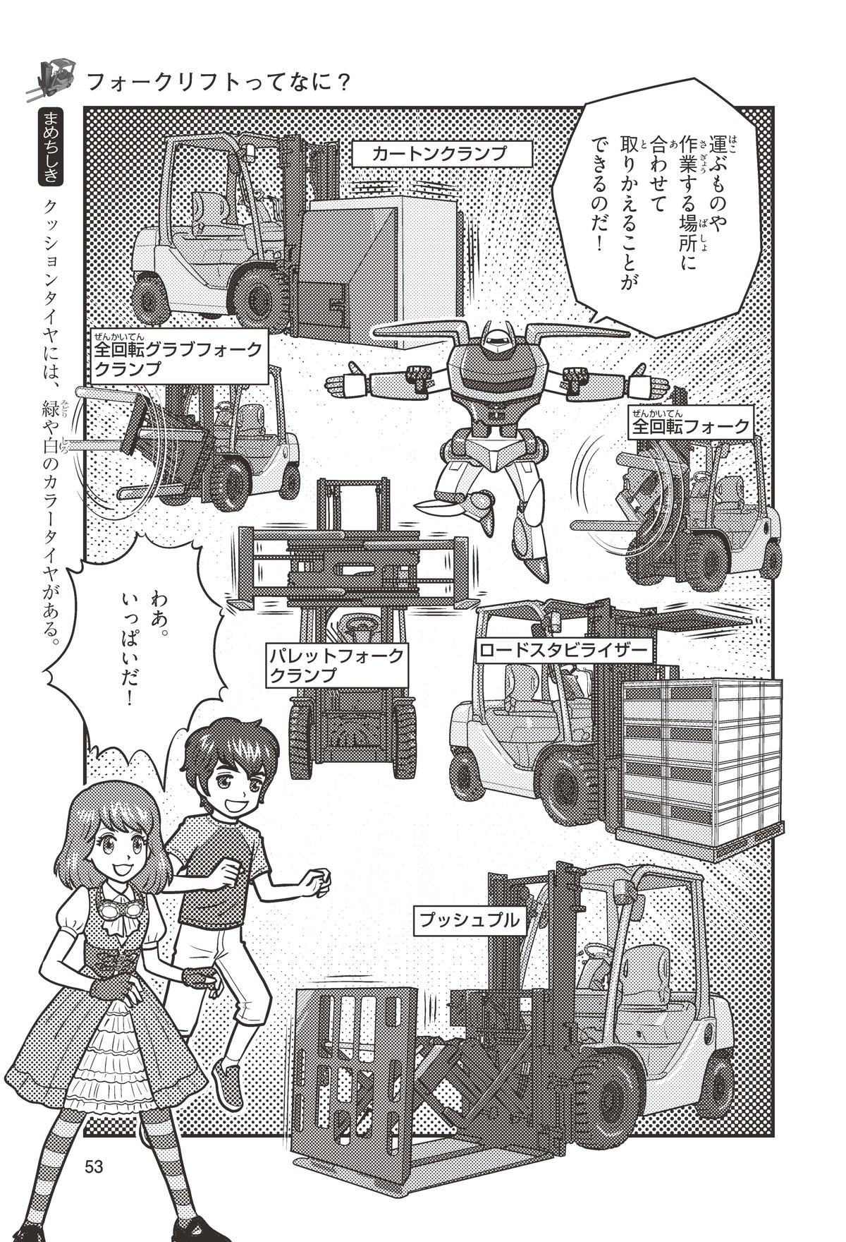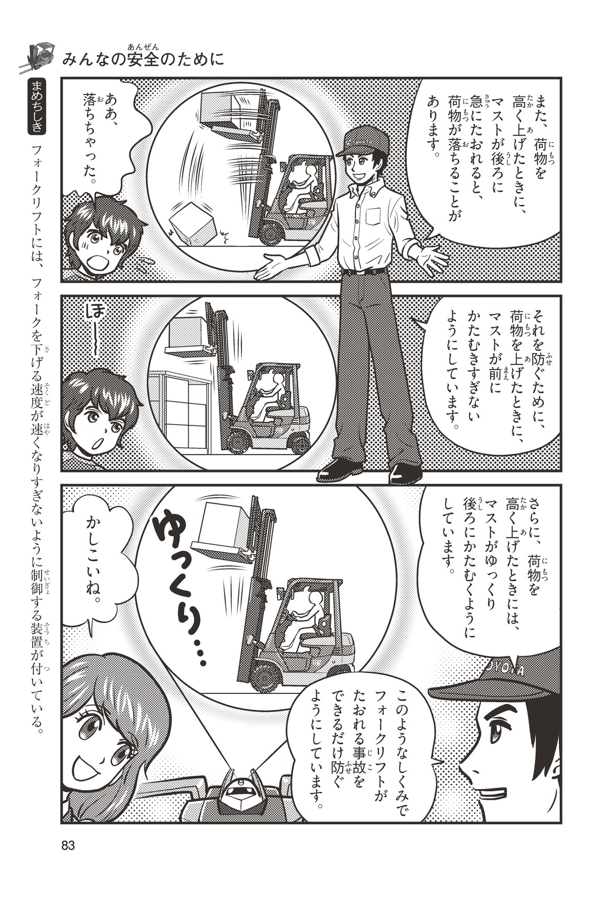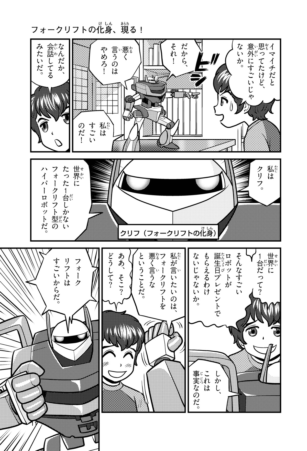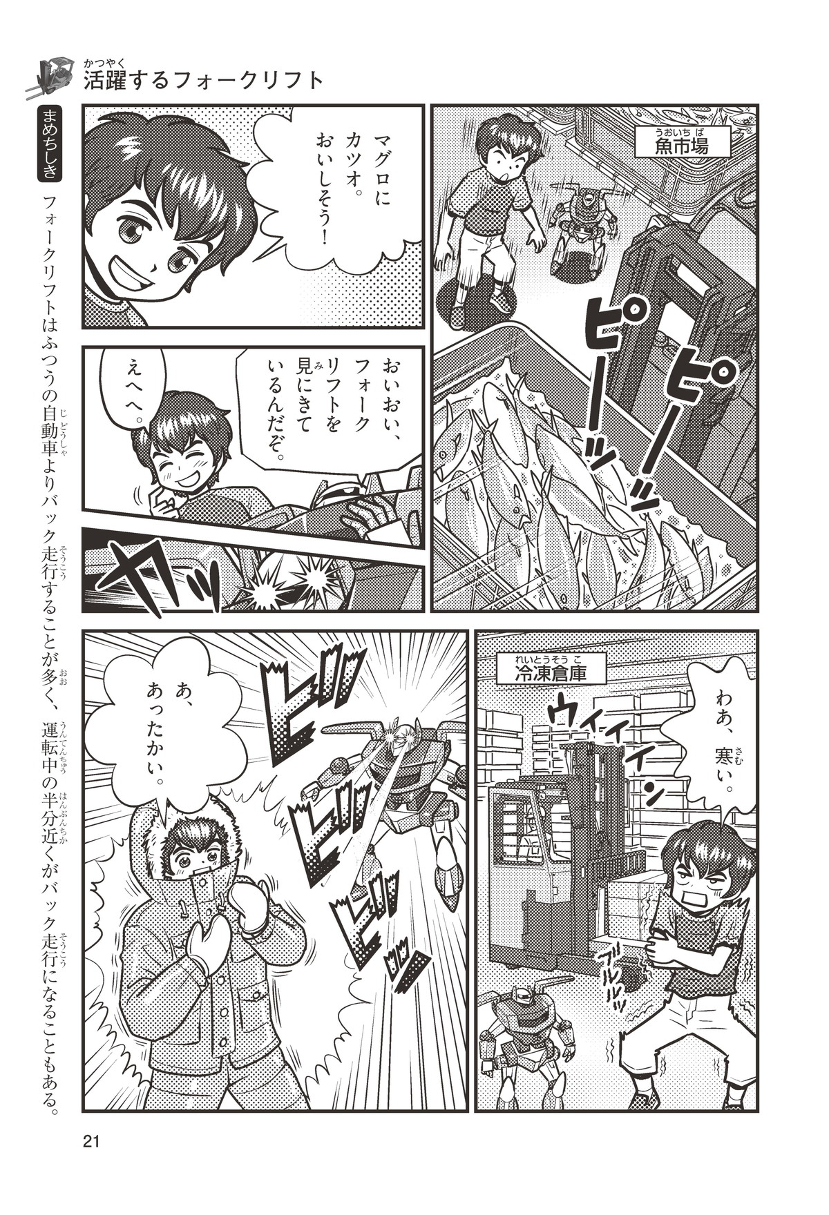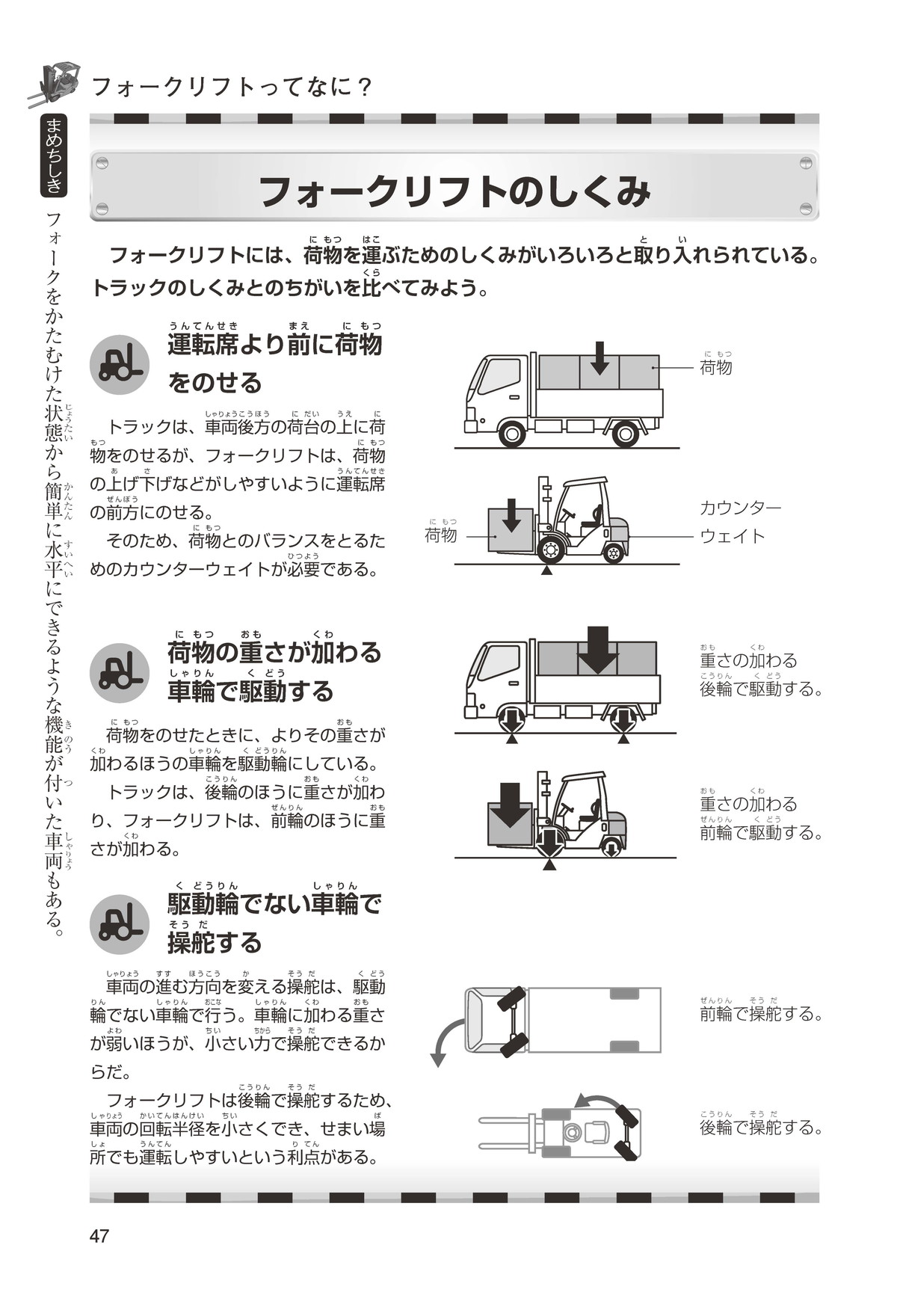お父さんから誕生日プレゼントに「フォークリフト」のラジコンをもらった、小学5年生のケイタ。フォークリフトとは、工場や倉庫、港などで、荷物の運搬に活躍する自動車のこと。荷物を安全に効率よく運ぶために、多くの工夫がされているんだ。そんなフォークリフトのしくみや種類、最新のフォークリフトなど、たくさんのひみつを、フォークリフトの化身、クリフが教えてくれるよ。