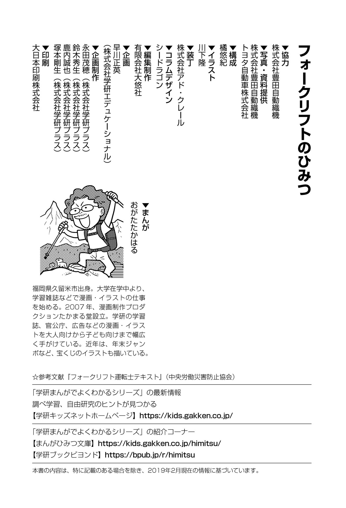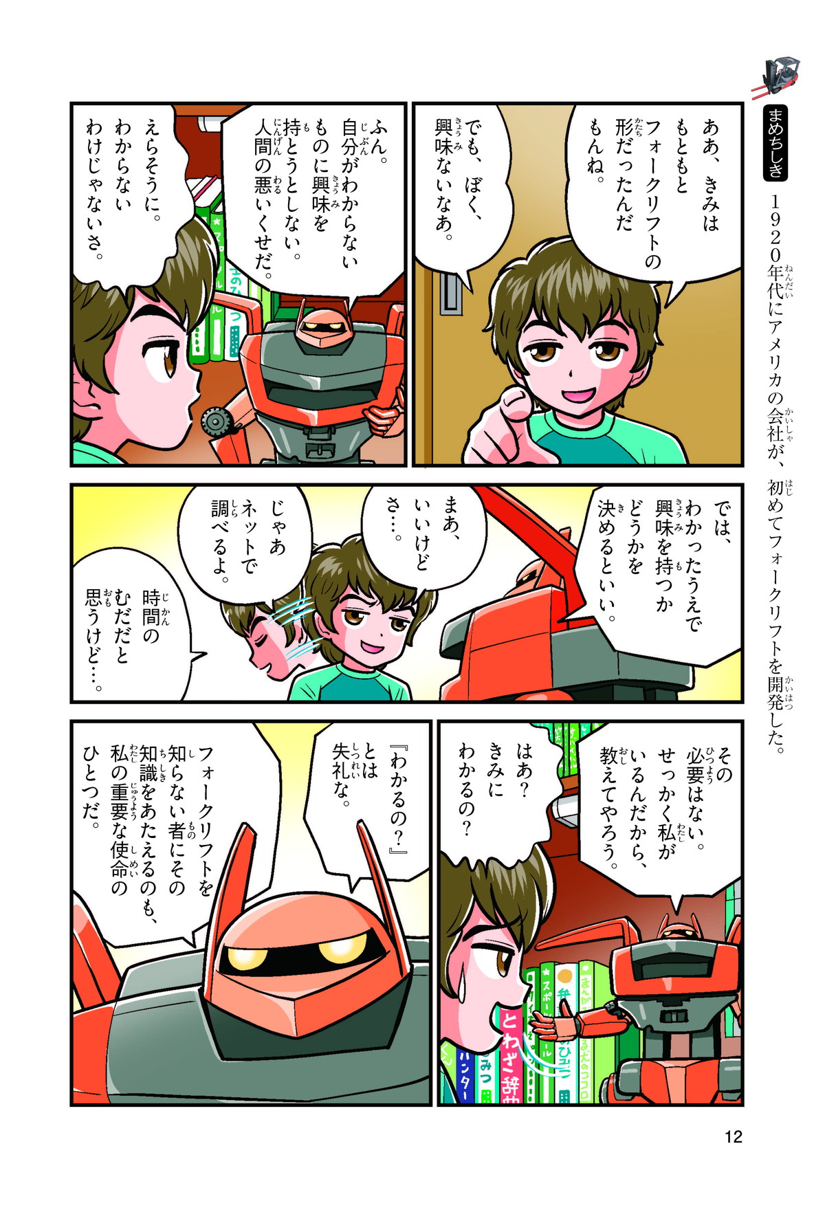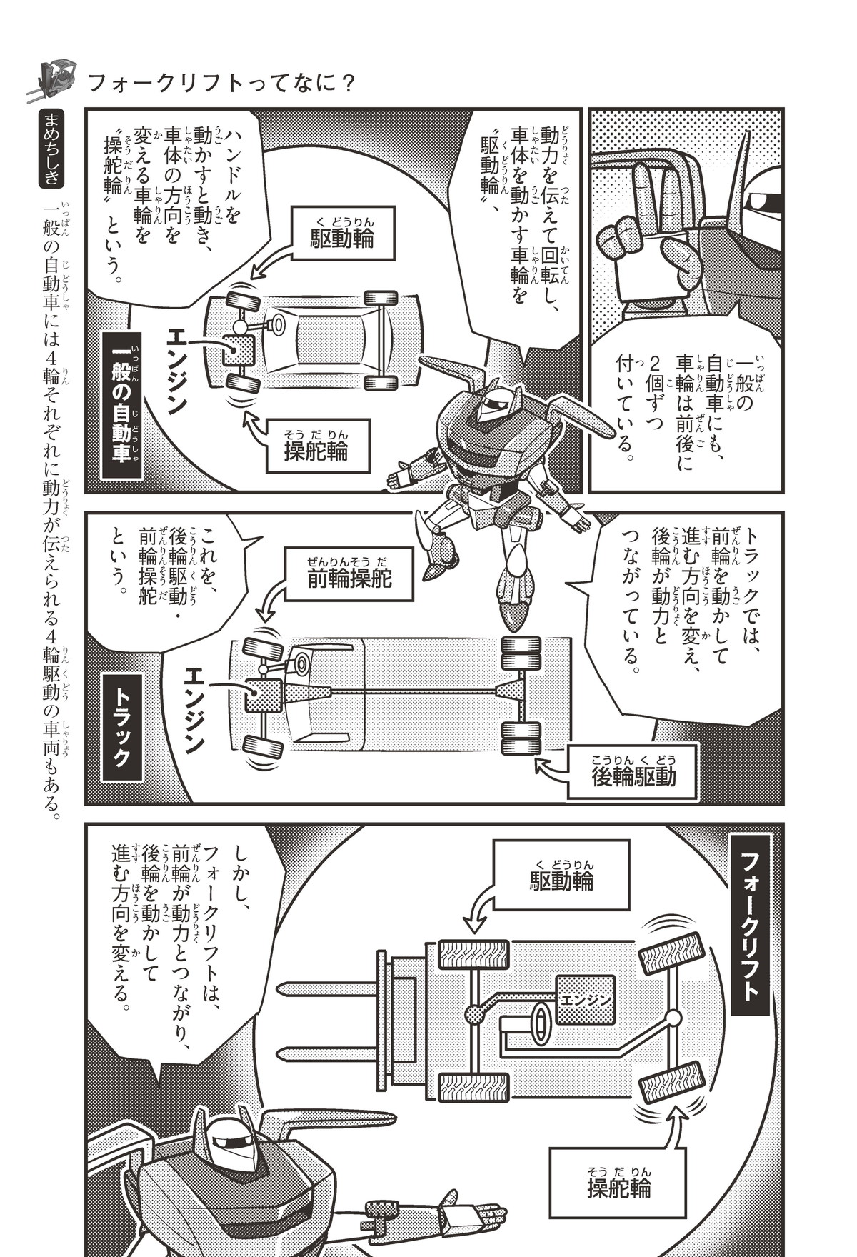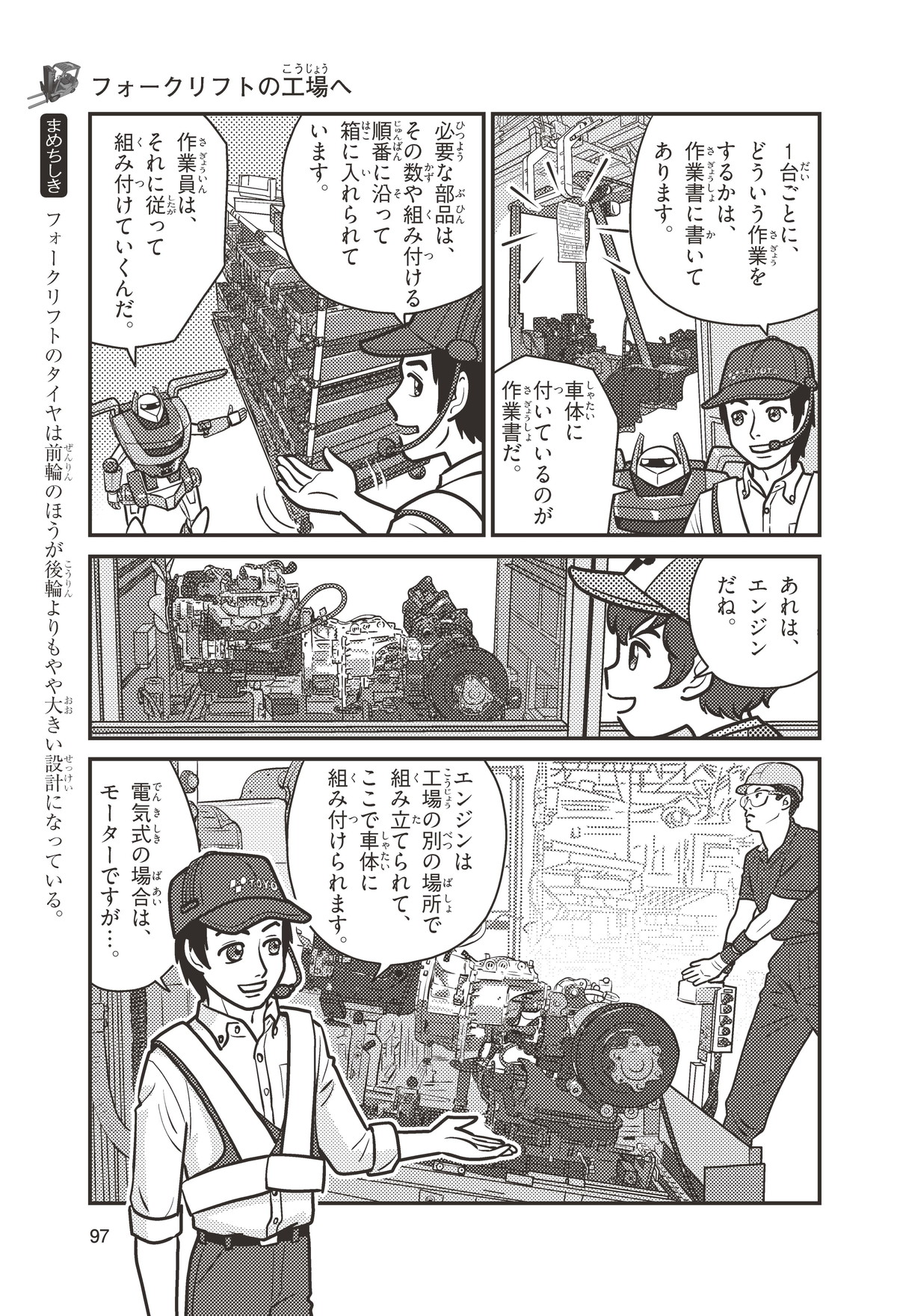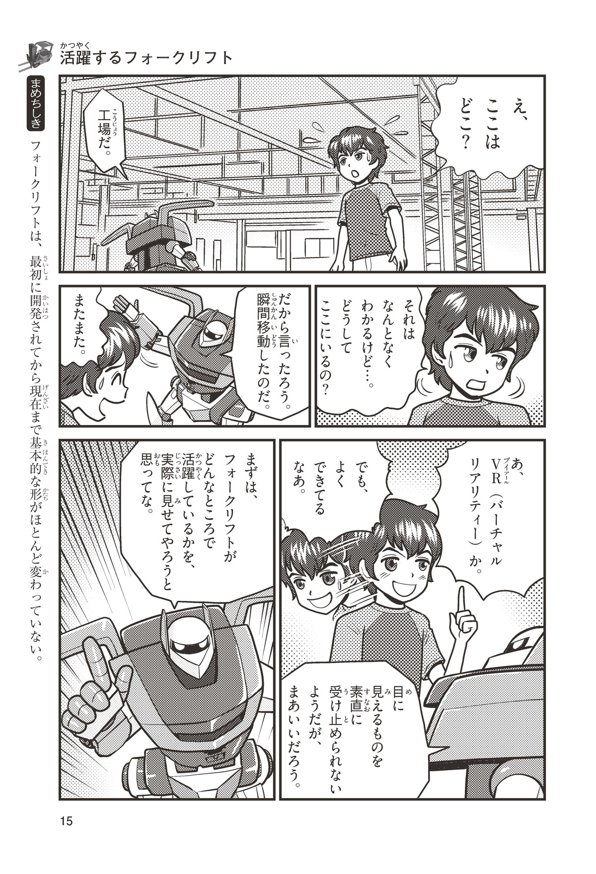 お父さんから誕生日プレゼントに「フォークリフト」のラジコンをもらった、小学5年生のケイタ。フォークリフトとは、工場や倉庫、港などで、荷物の運搬に活躍する自動車のこと。荷物を安全に効率よく運ぶために、多くの工夫がされているんだ。そんなフォークリフトのしくみや種類、最新のフォークリフトなど、たくさんのひみつを、フォークリフトの化身、クリフが教えてくれるよ。