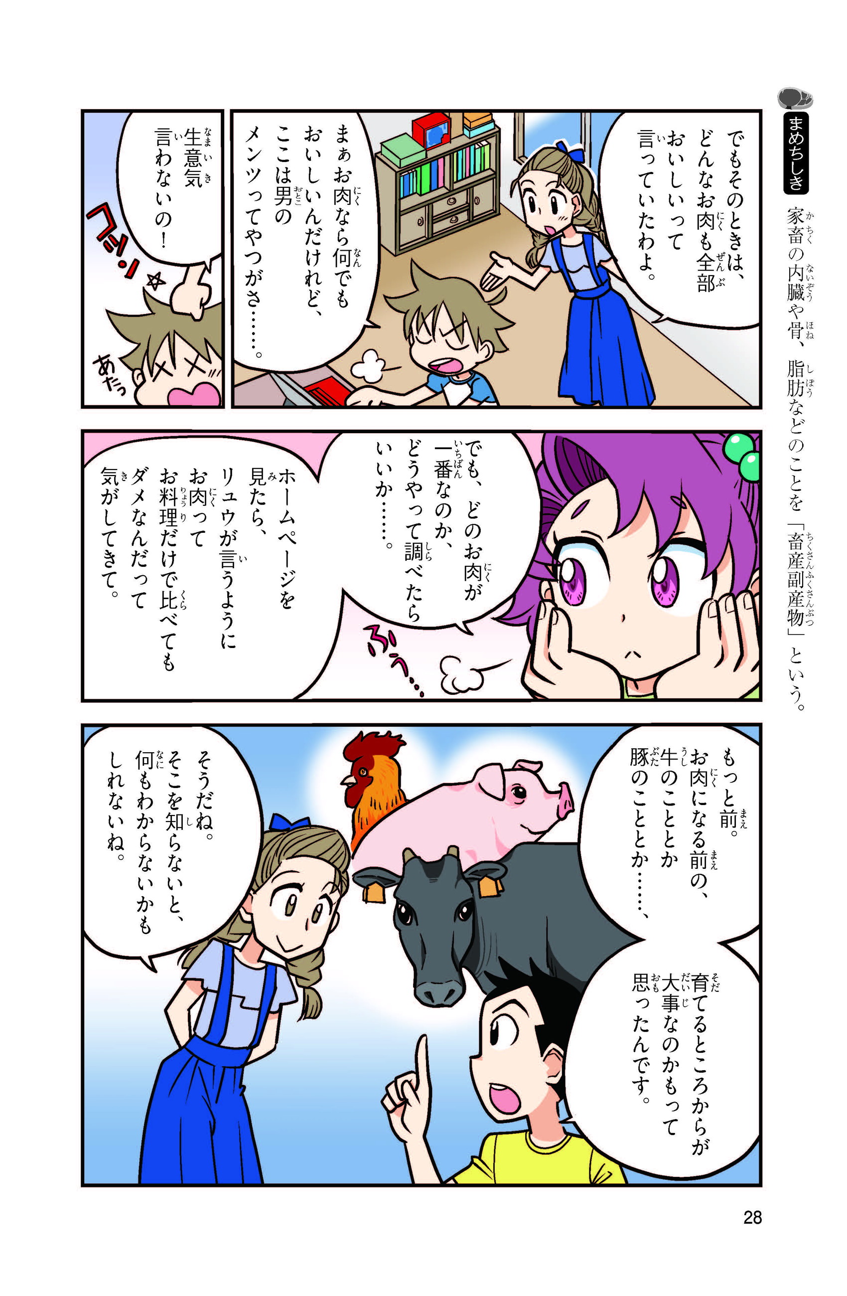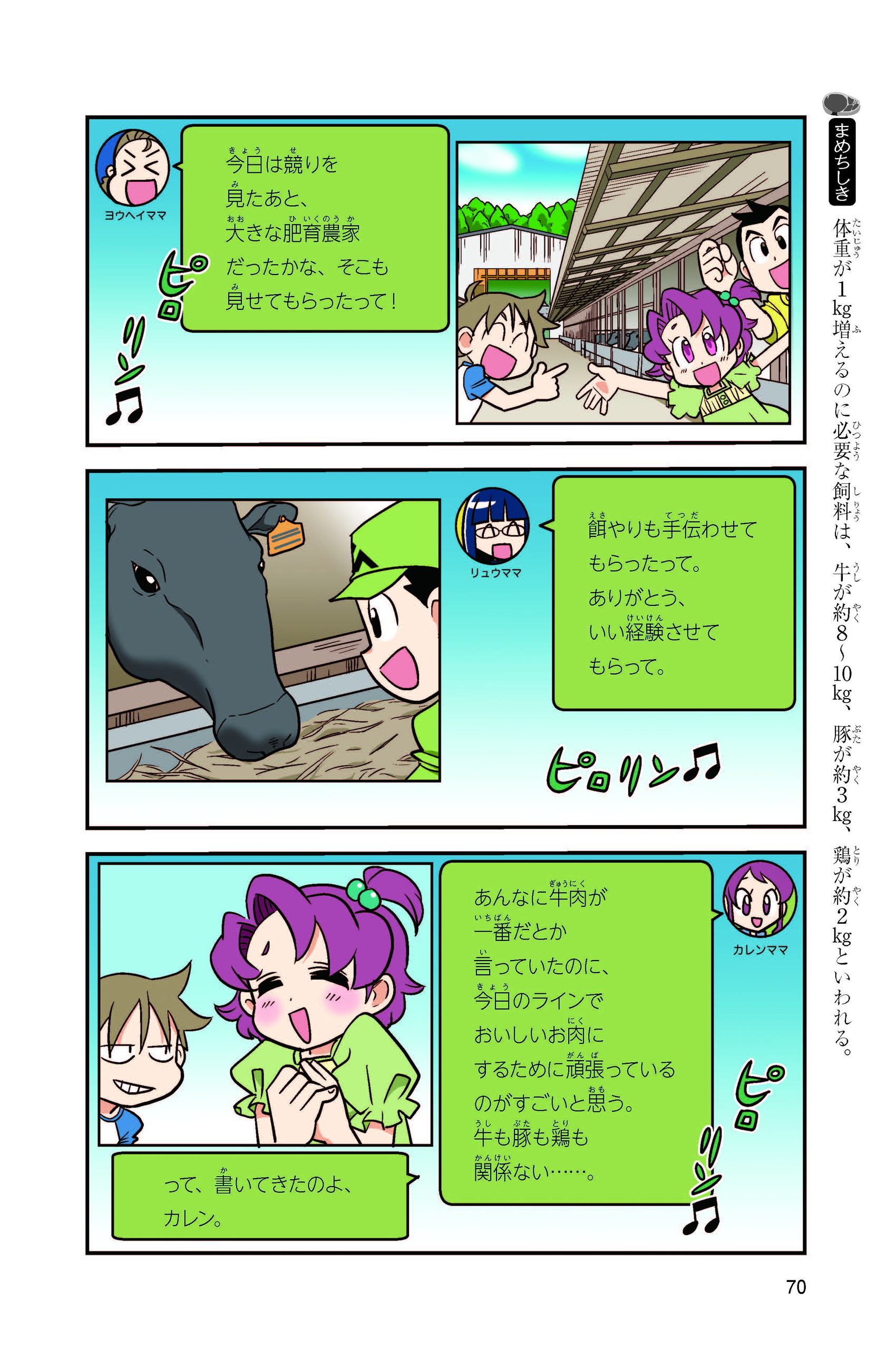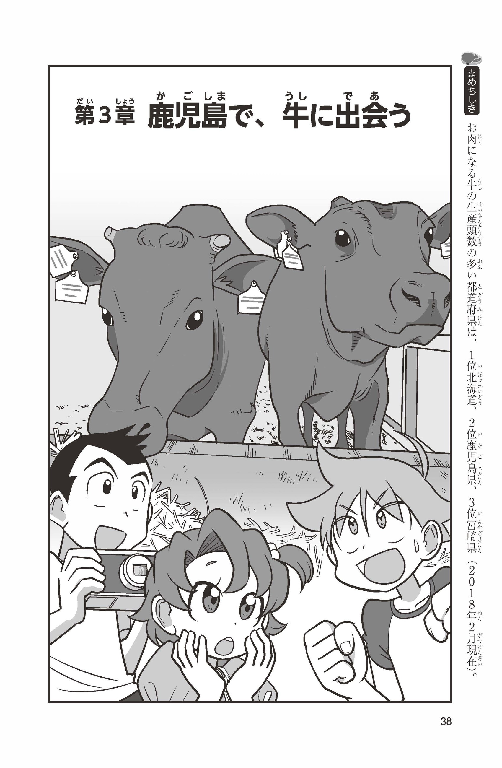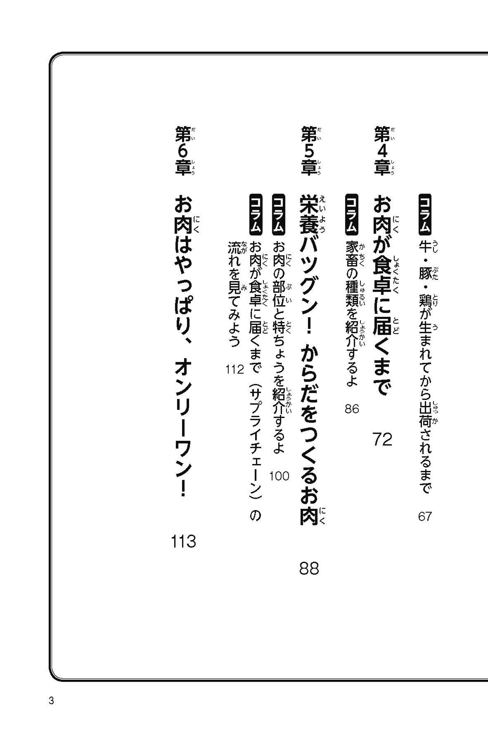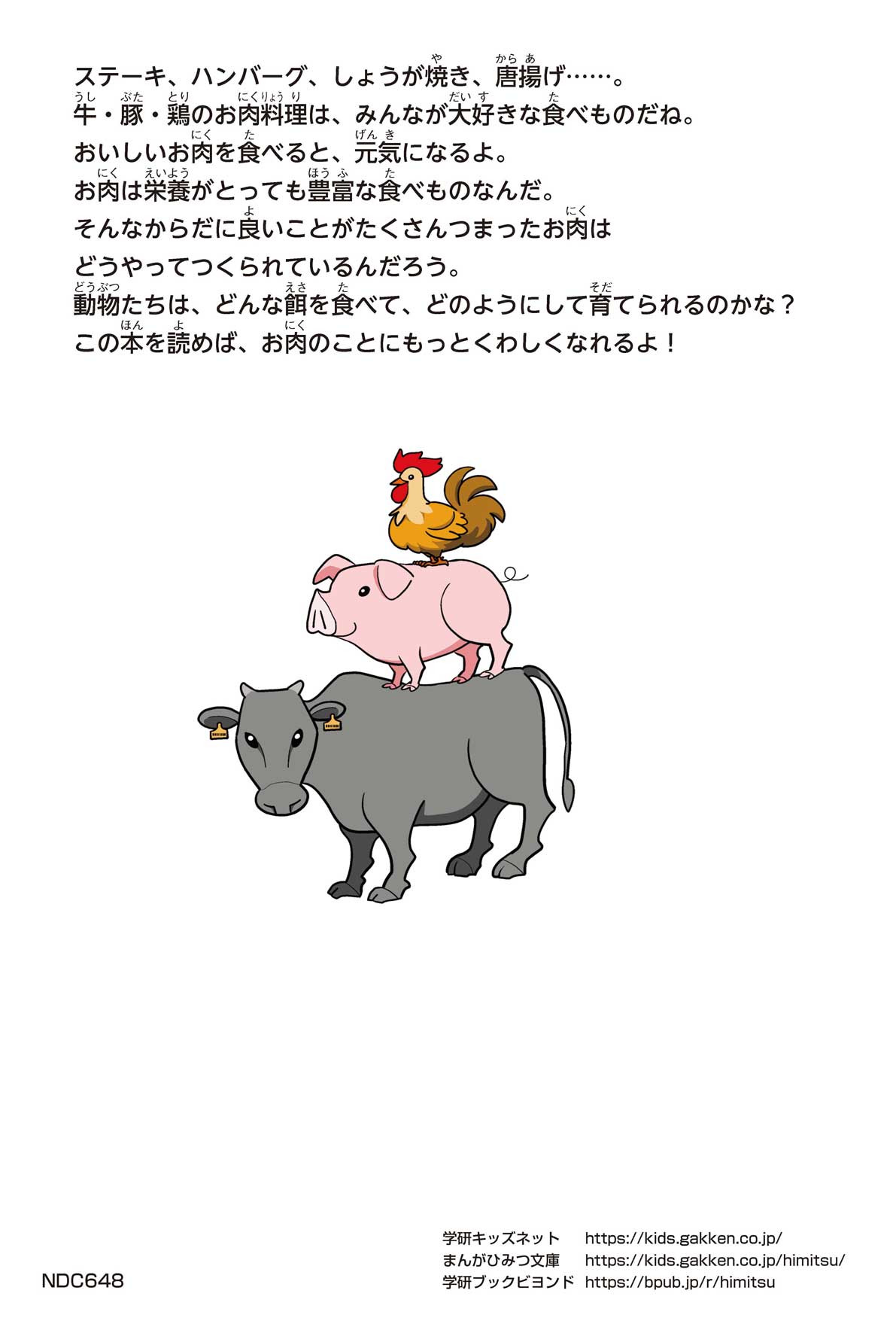 学級委員のリュウ、おませなカレン、ガキ大将(だいしょう)のヨウヘイは、おさななじみの仲良しトリオ。牛肉・豚肉(ぶたにく)・鶏肉(とりにく)のどのお肉が一番かを決めるため、小学5年生の夏休みに3人は牛を育てているヨウヘイのおじさんを訪(たず)ねて鹿児島(かごしま)に向かったよ。どうやってお肉が食卓(しょくたく)に届(とど)くのか、お肉のひみつは何か、最後にたどりついた答えは……?