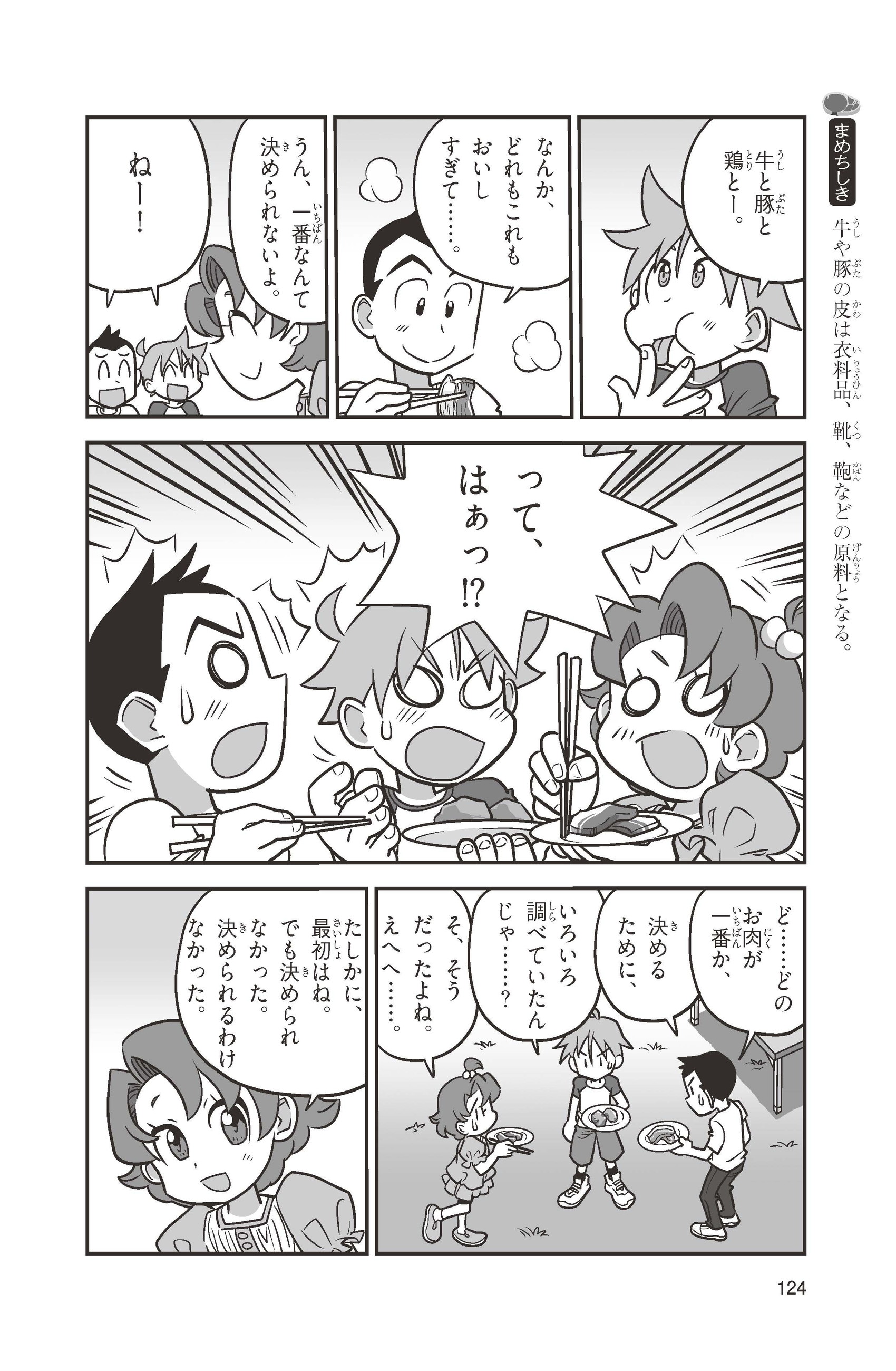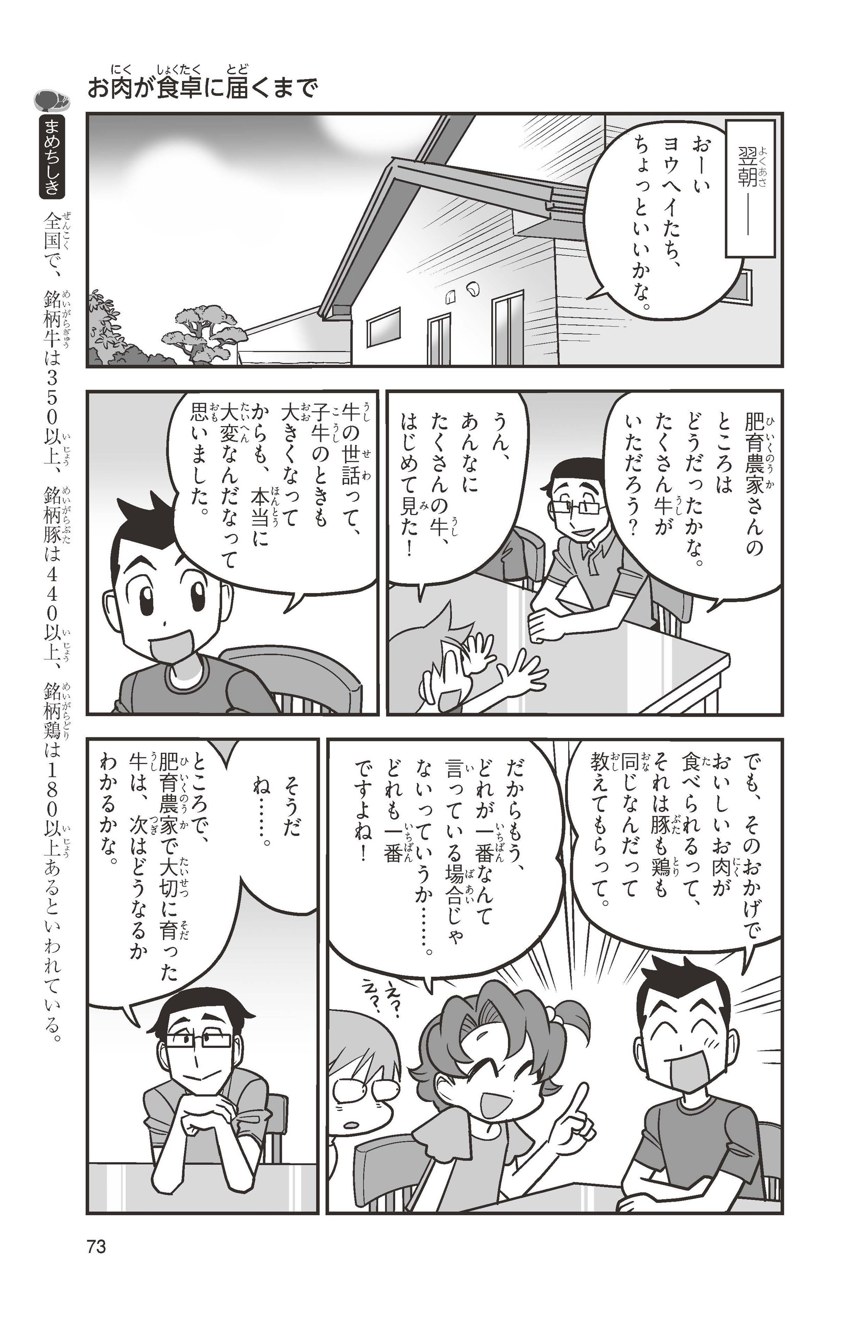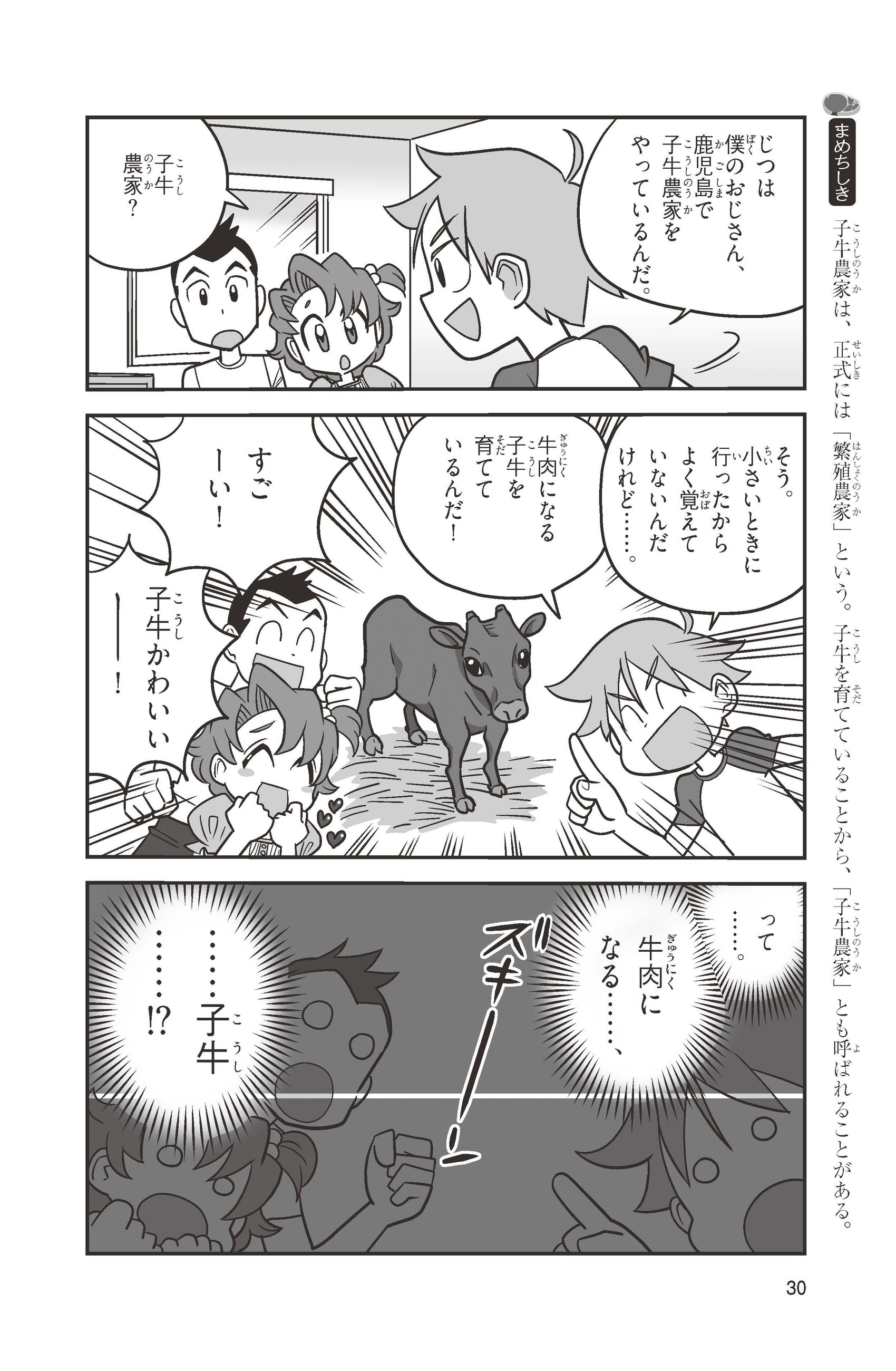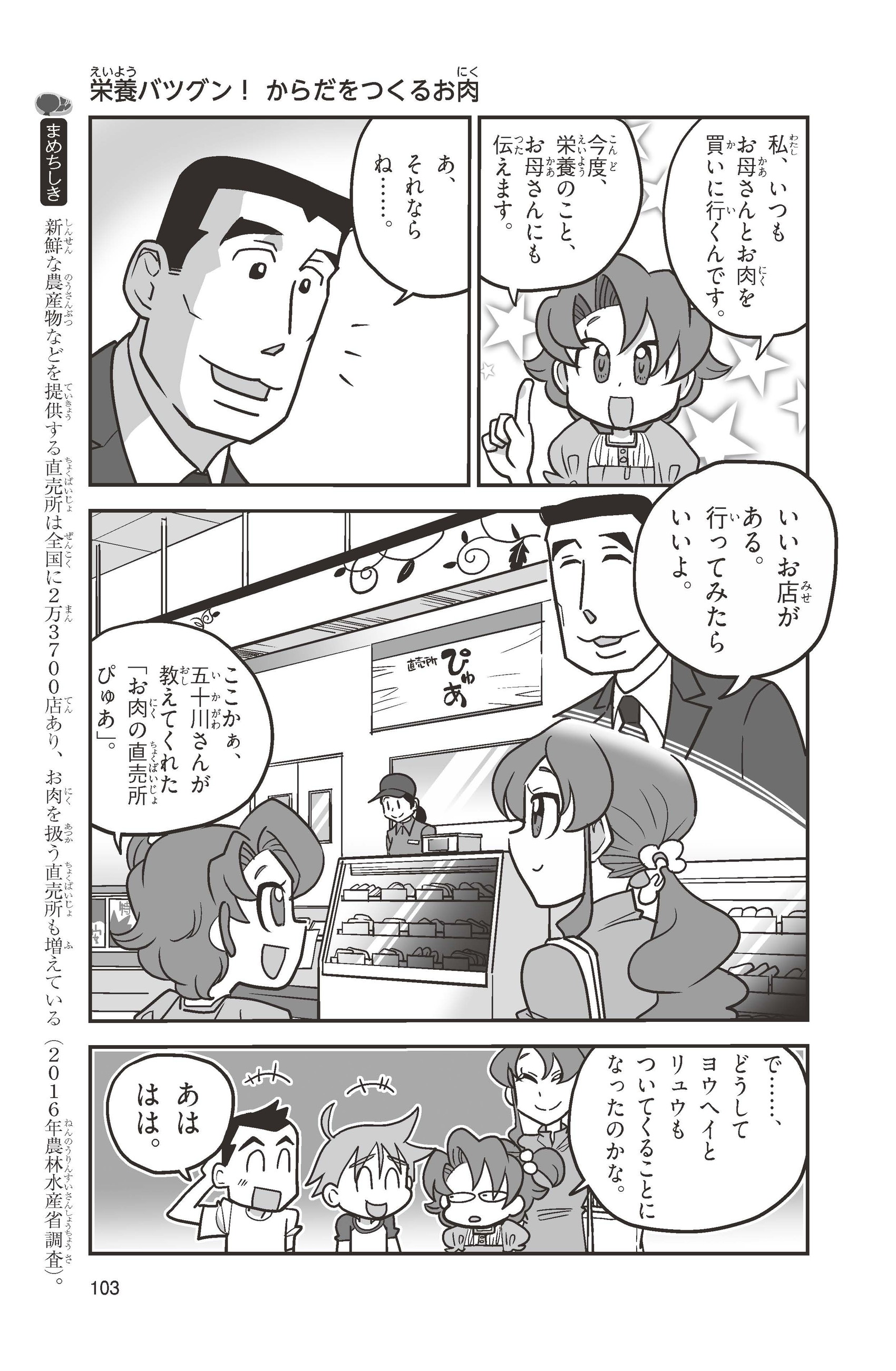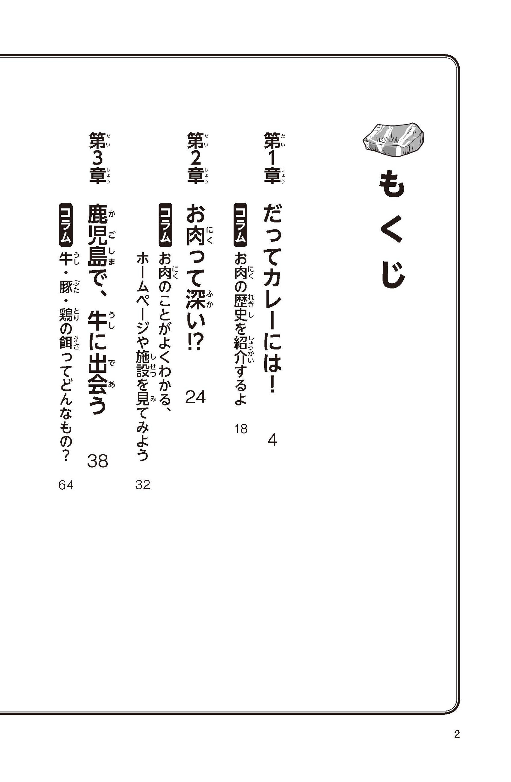学級委員のリュウ、おませなカレン、ガキ大将(だいしょう)のヨウヘイは、おさななじみの仲良しトリオ。牛肉・豚肉(ぶたにく)・鶏肉(とりにく)のどのお肉が一番かを決めるため、小学5年生の夏休みに3人は牛を育てているヨウヘイのおじさんを訪(たず)ねて鹿児島(かごしま)に向かったよ。どうやってお肉が食卓(しょくたく)に届(とど)くのか、お肉のひみつは何か、最後にたどりついた答えは……?