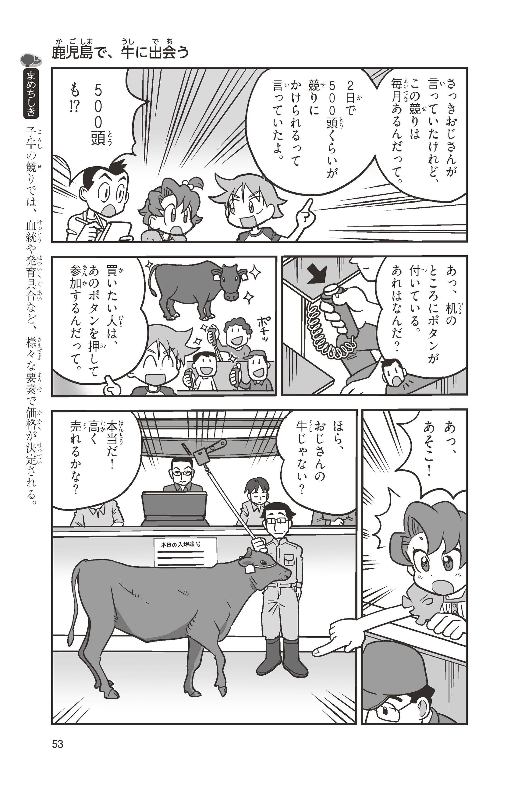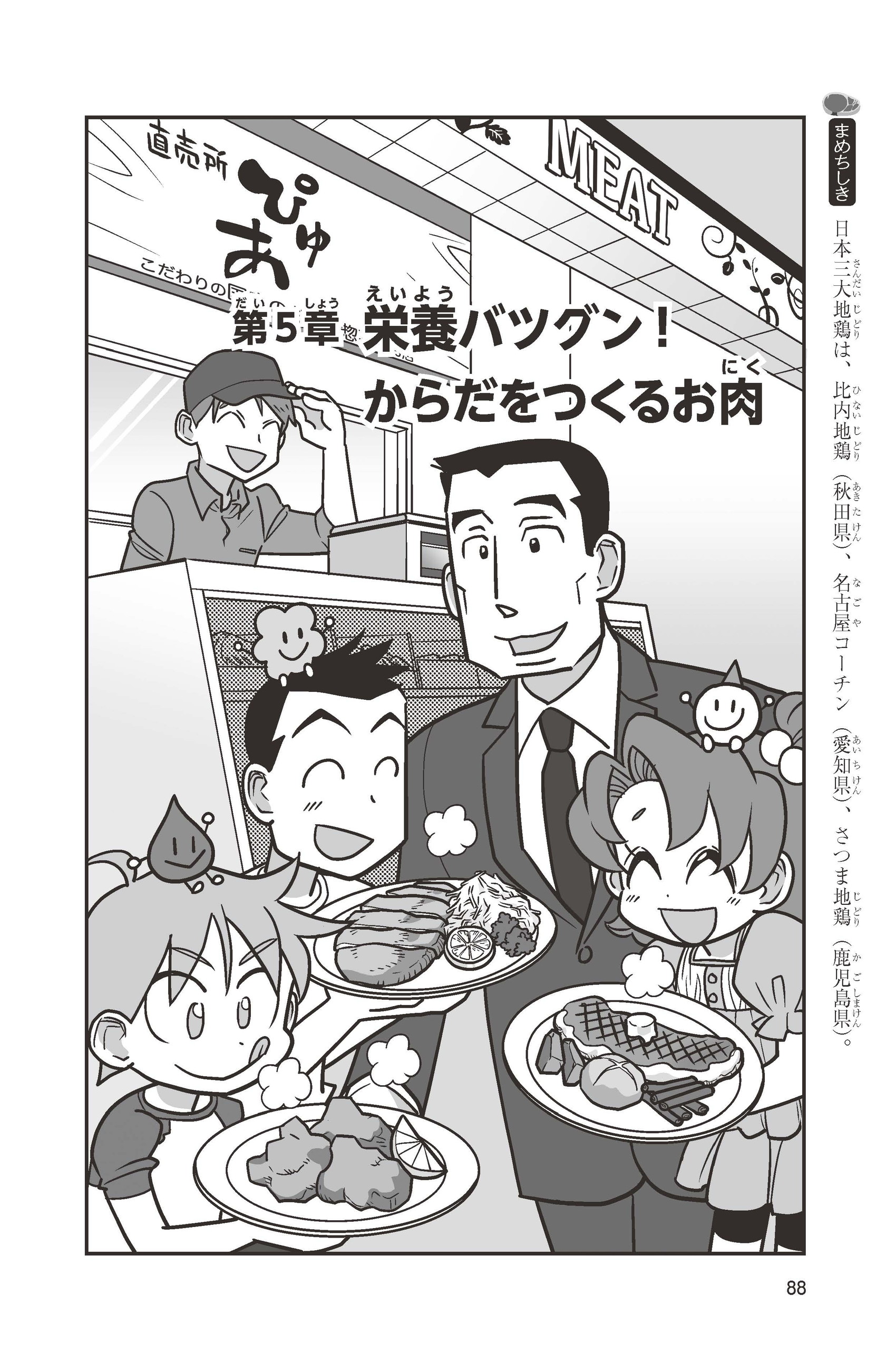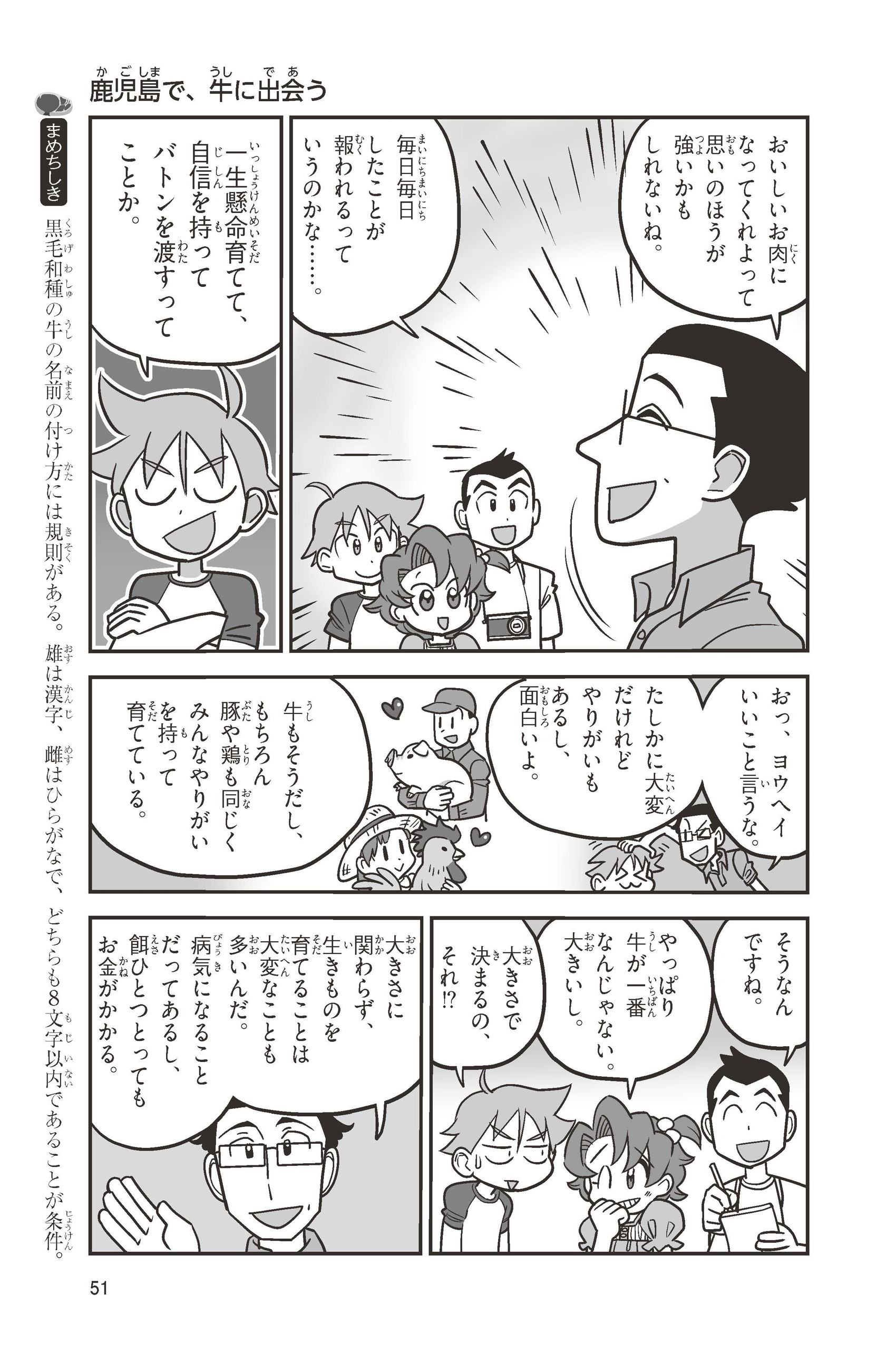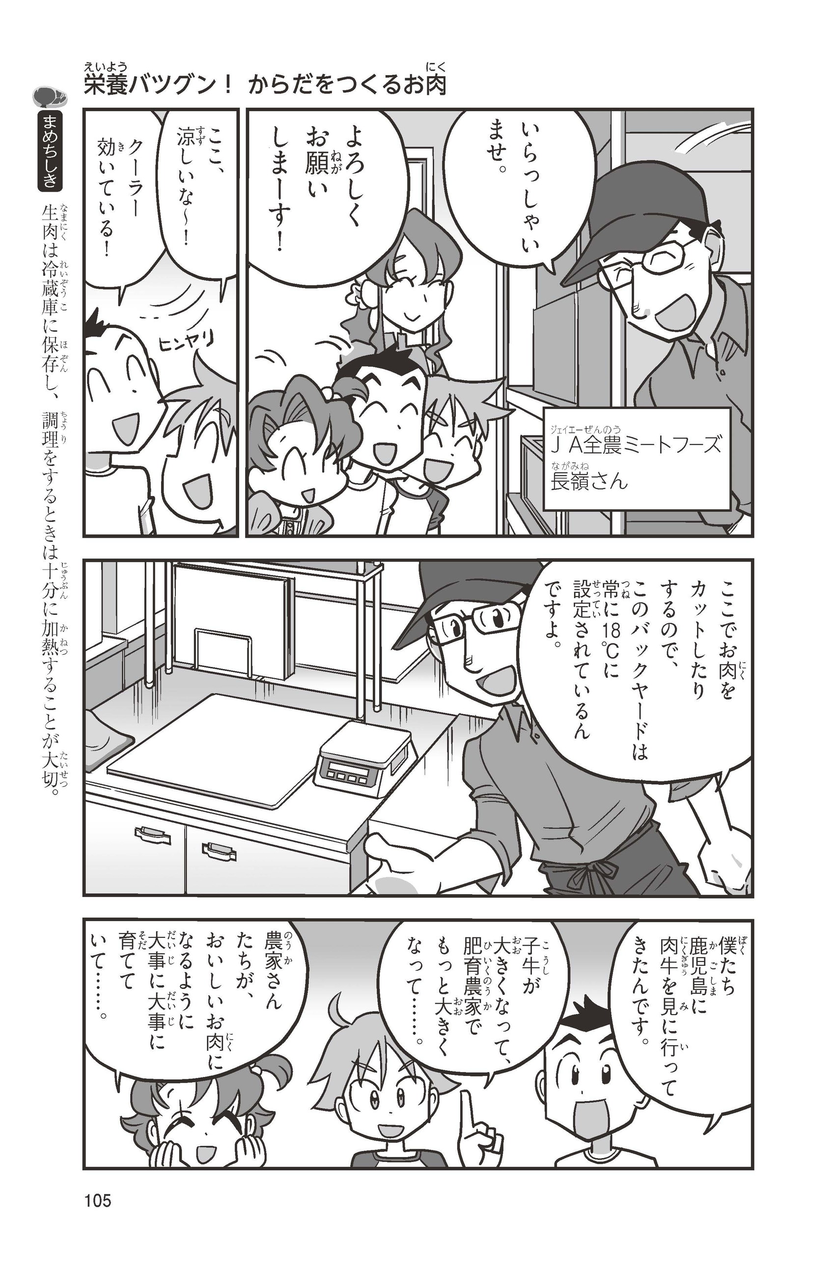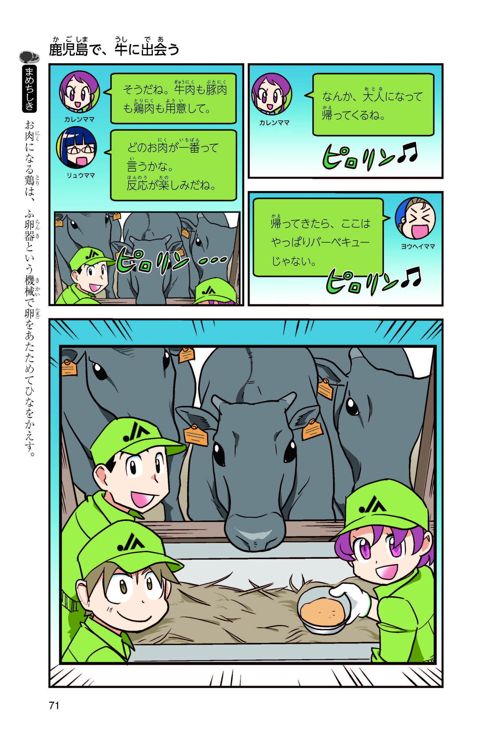 学級委員のリュウ、おませなカレン、ガキ大将(だいしょう)のヨウヘイは、おさななじみの仲良しトリオ。牛肉・豚肉(ぶたにく)・鶏肉(とりにく)のどのお肉が一番かを決めるため、小学5年生の夏休みに3人は牛を育てているヨウヘイのおじさんを訪(たず)ねて鹿児島(かごしま)に向かったよ。どうやってお肉が食卓(しょくたく)に届(とど)くのか、お肉のひみつは何か、最後にたどりついた答えは……?