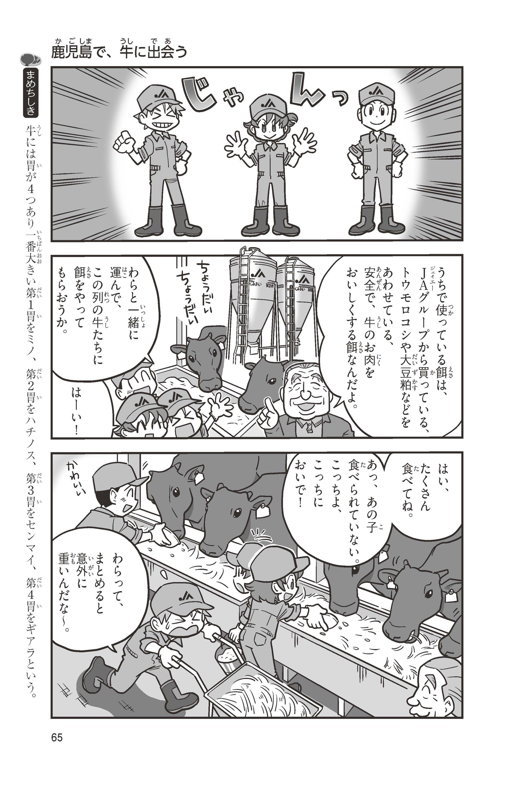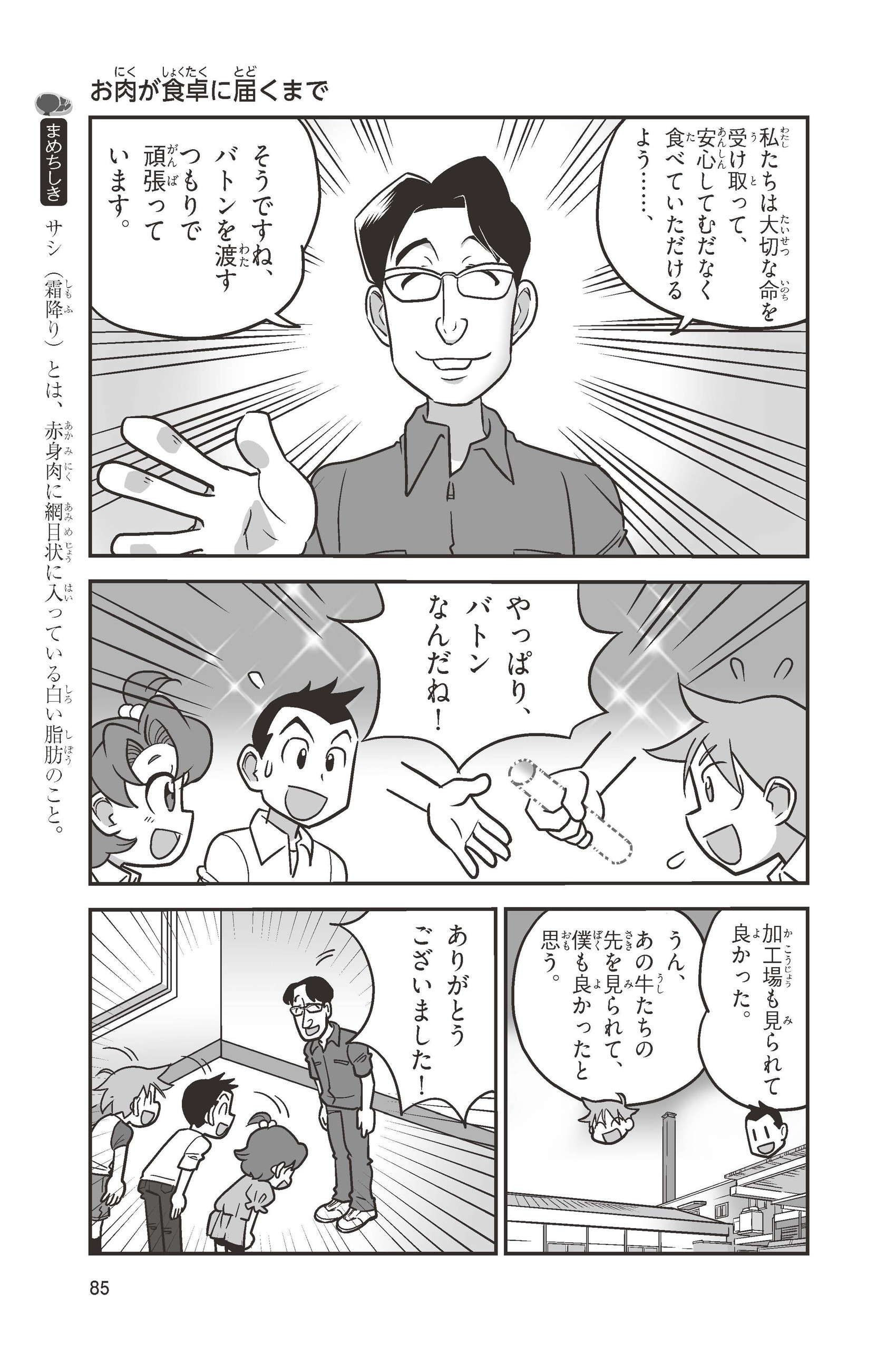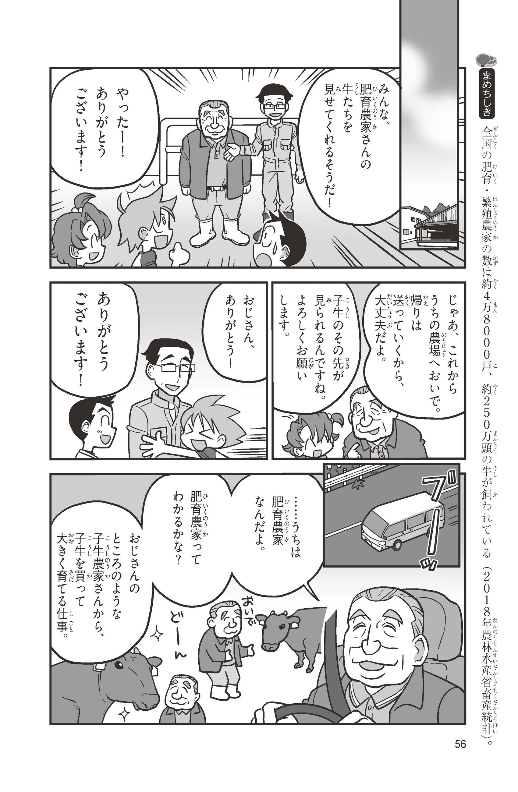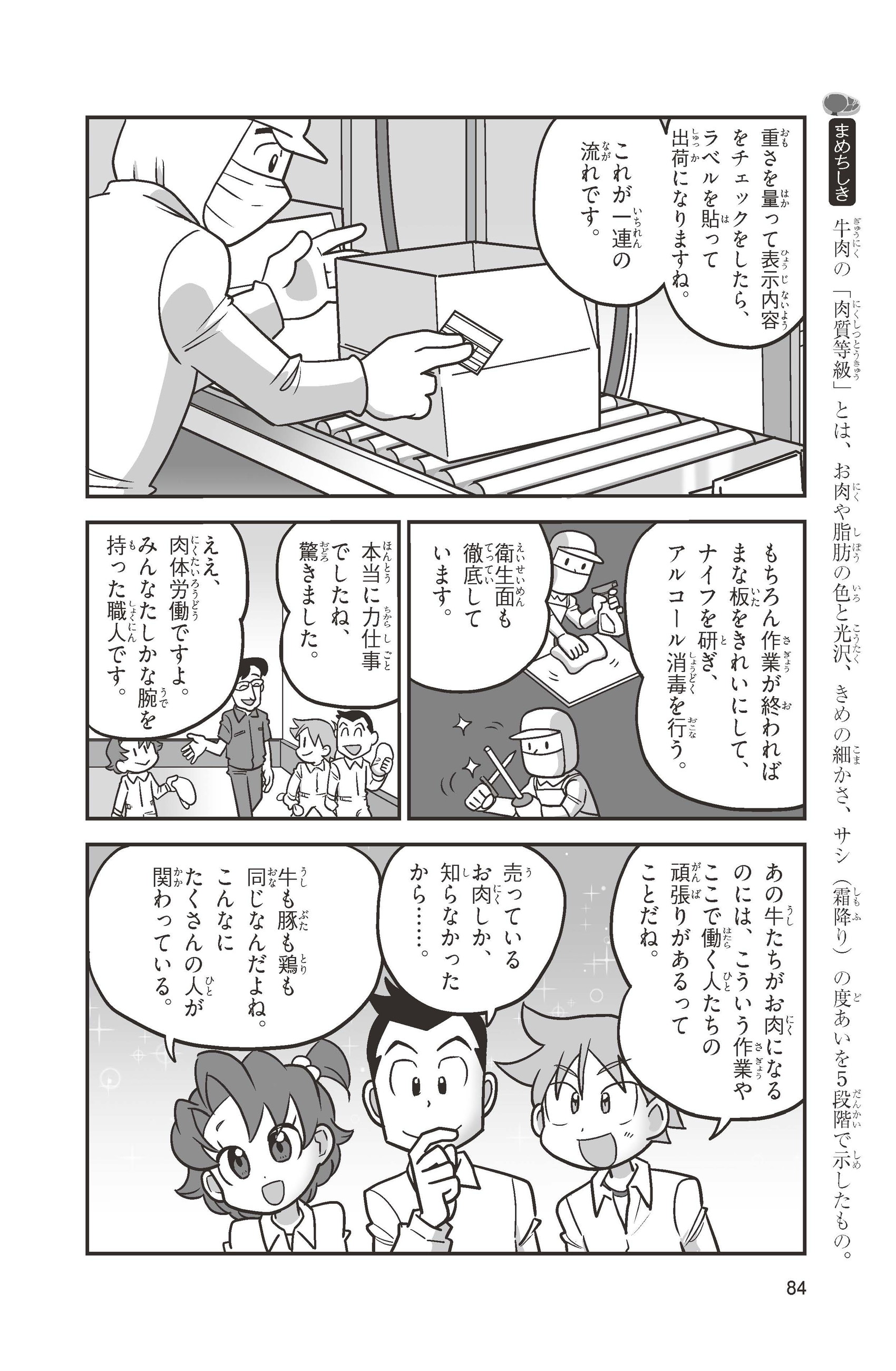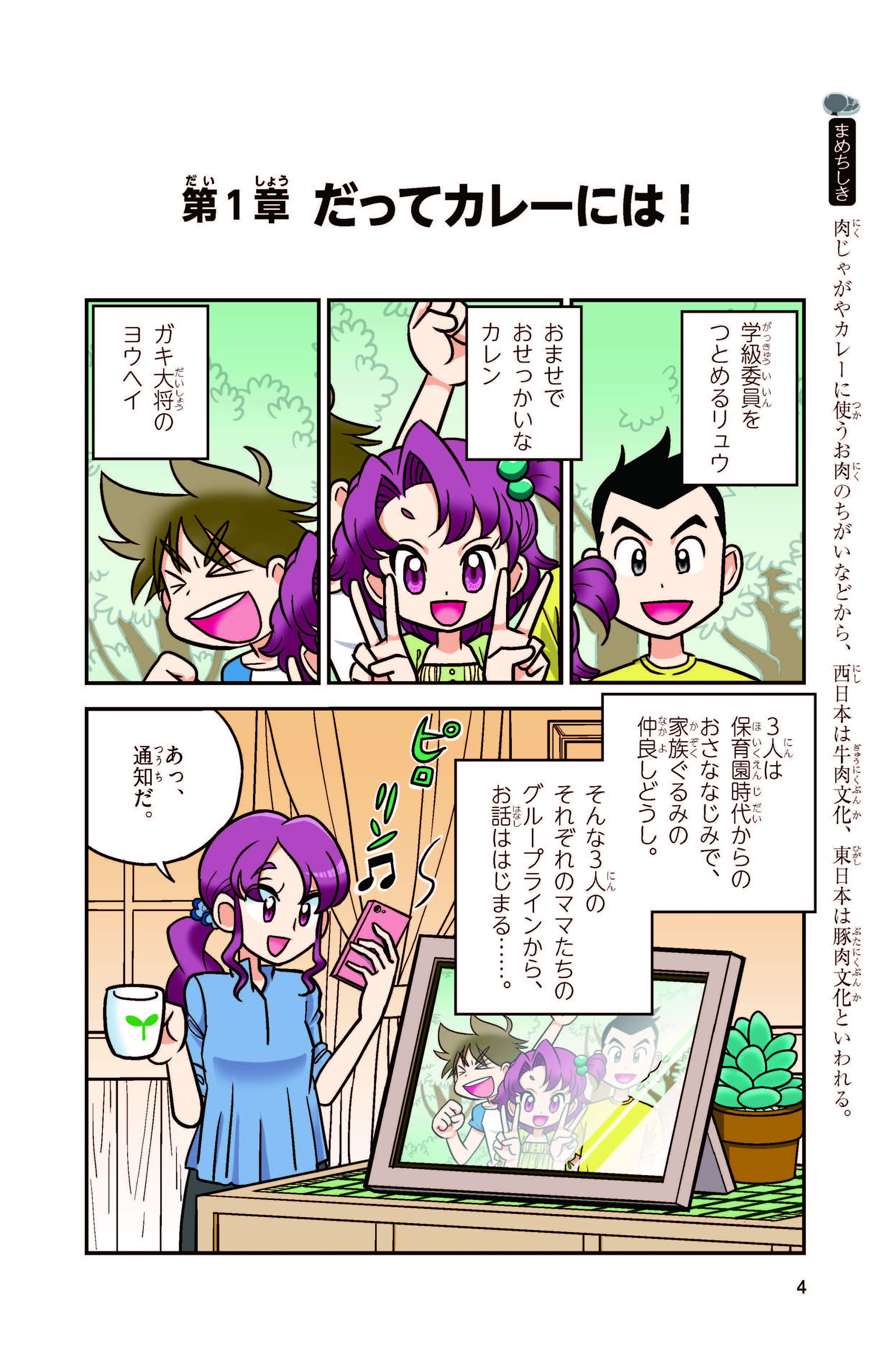 学級委員のリュウ、おませなカレン、ガキ大将(だいしょう)のヨウヘイは、おさななじみの仲良しトリオ。牛肉・豚肉(ぶたにく)・鶏肉(とりにく)のどのお肉が一番かを決めるため、小学5年生の夏休みに3人は牛を育てているヨウヘイのおじさんを訪(たず)ねて鹿児島(かごしま)に向かったよ。どうやってお肉が食卓(しょくたく)に届(とど)くのか、お肉のひみつは何か、最後にたどりついた答えは……?