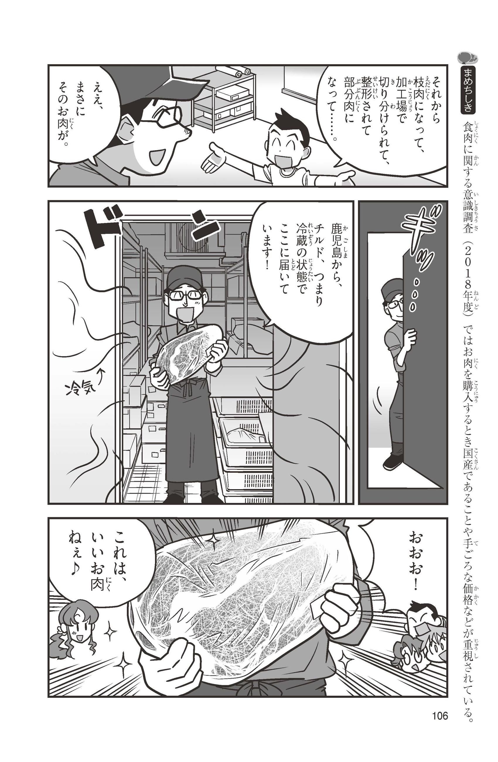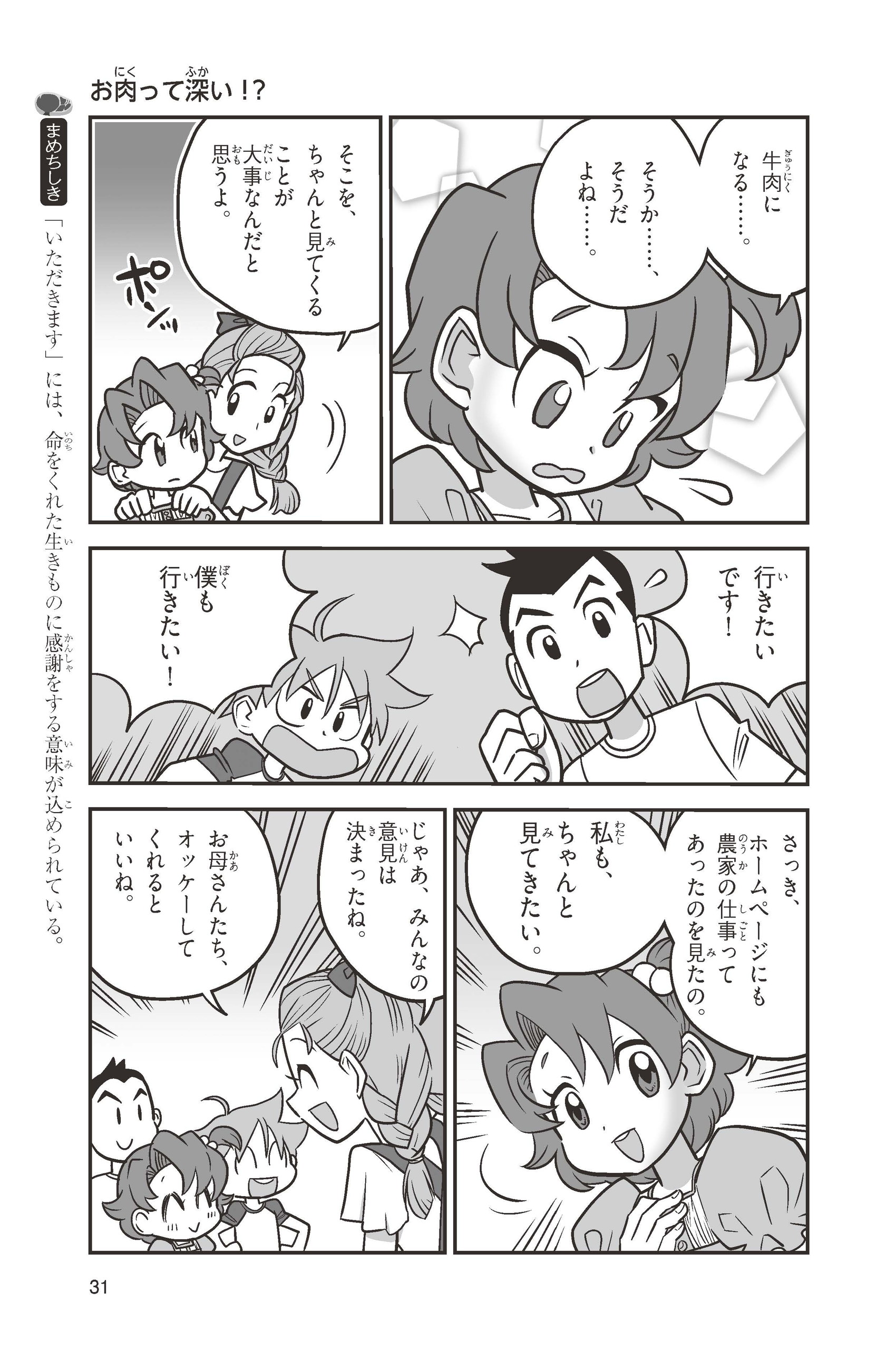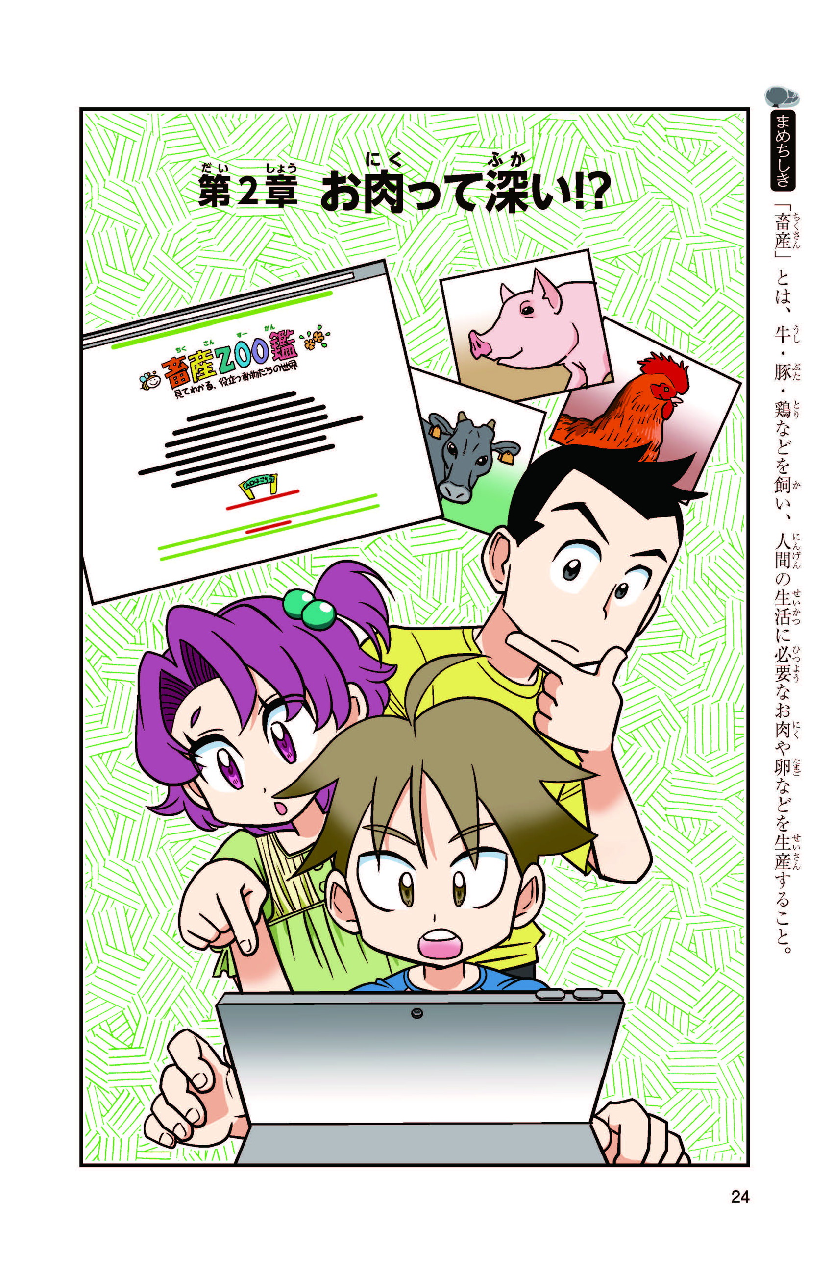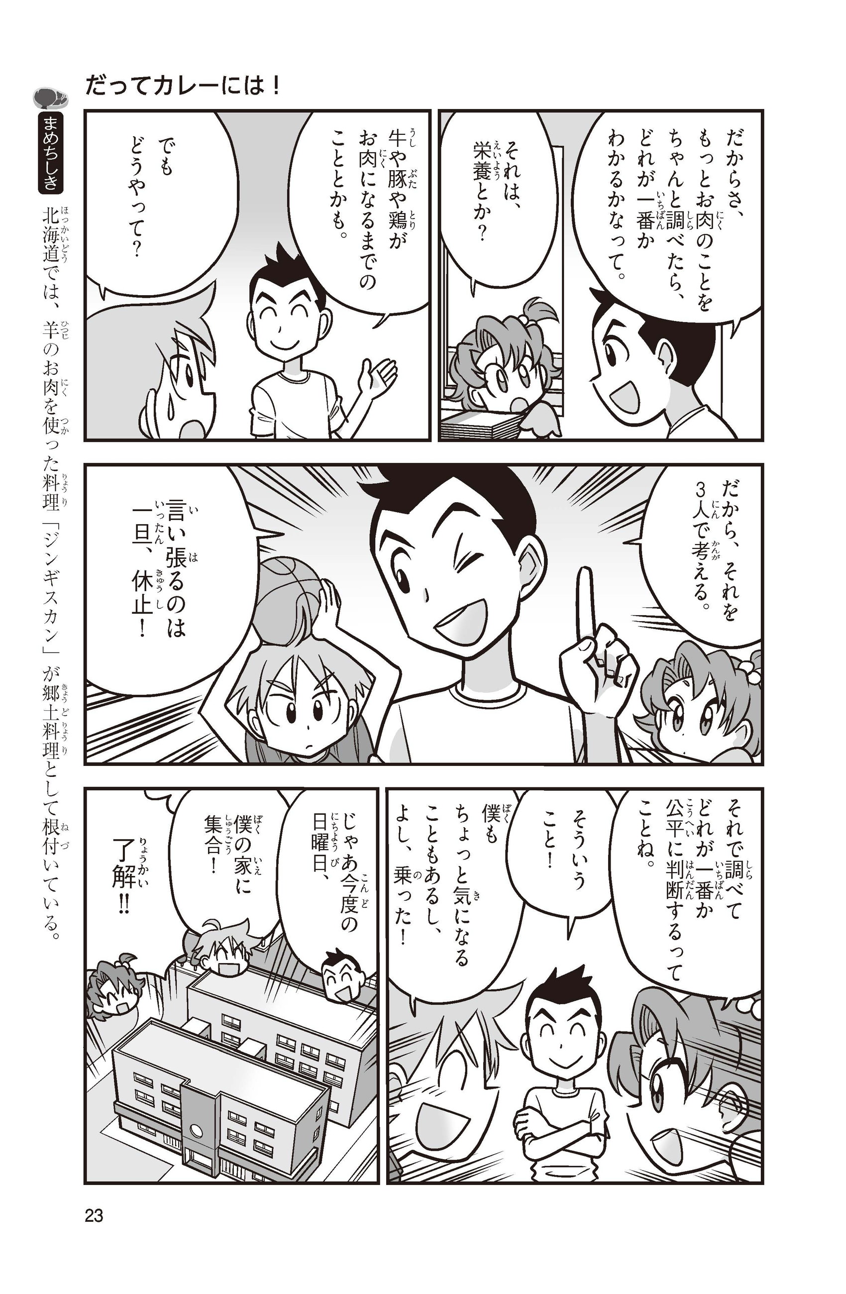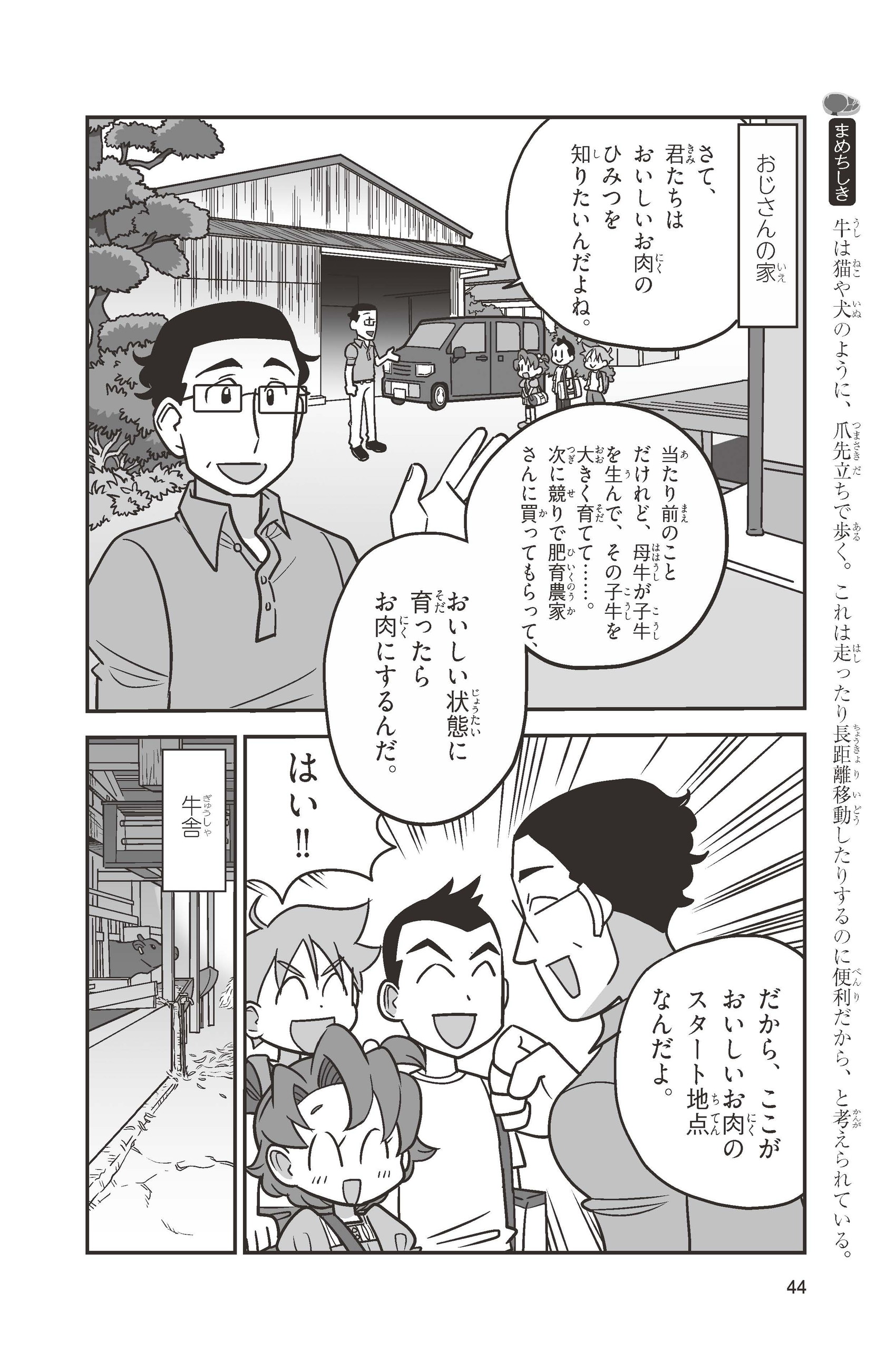 学級委員のリュウ、おませなカレン、ガキ大将(だいしょう)のヨウヘイは、おさななじみの仲良しトリオ。牛肉・豚肉(ぶたにく)・鶏肉(とりにく)のどのお肉が一番かを決めるため、小学5年生の夏休みに3人は牛を育てているヨウヘイのおじさんを訪(たず)ねて鹿児島(かごしま)に向かったよ。どうやってお肉が食卓(しょくたく)に届(とど)くのか、お肉のひみつは何か、最後にたどりついた答えは……?