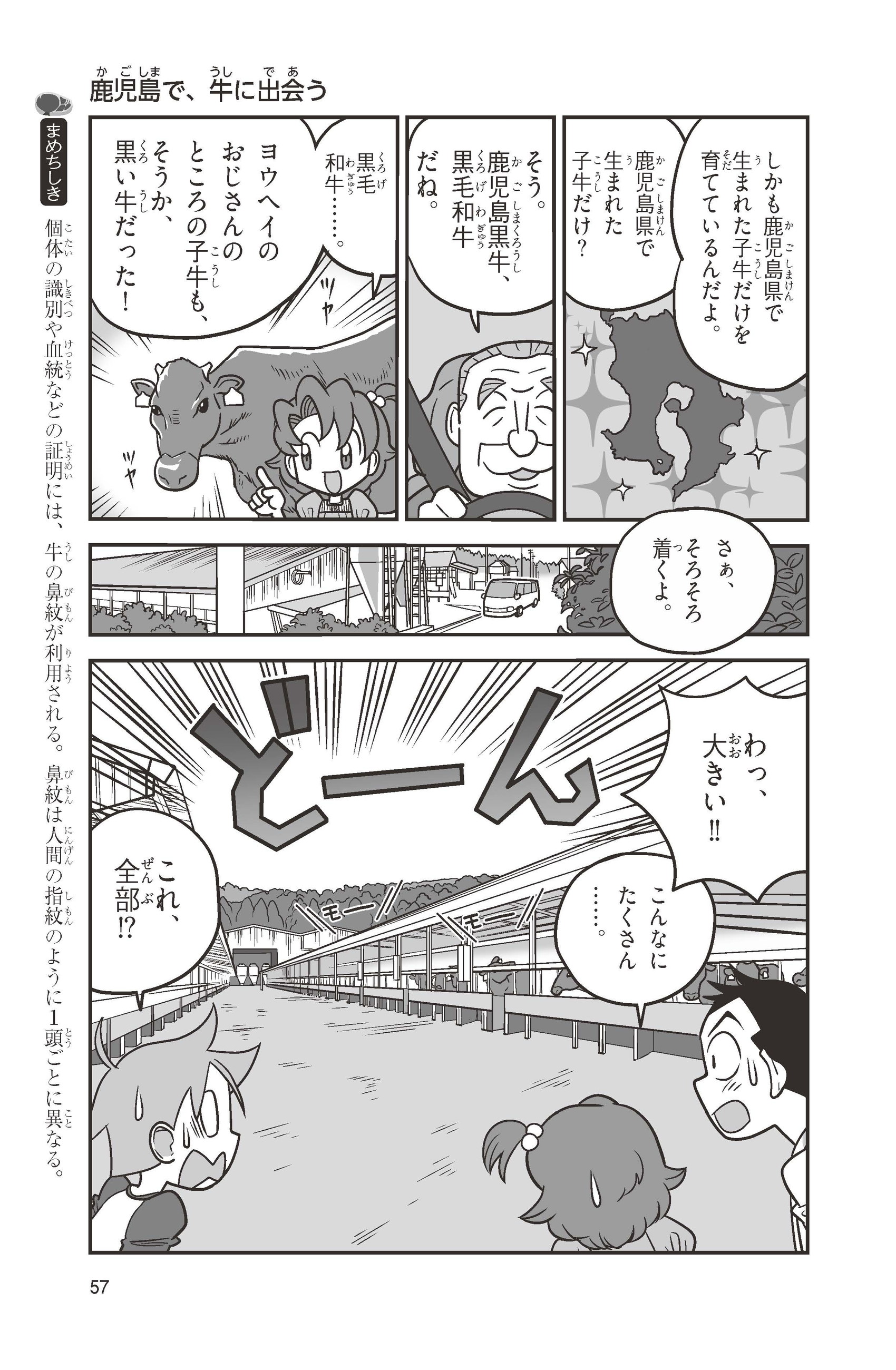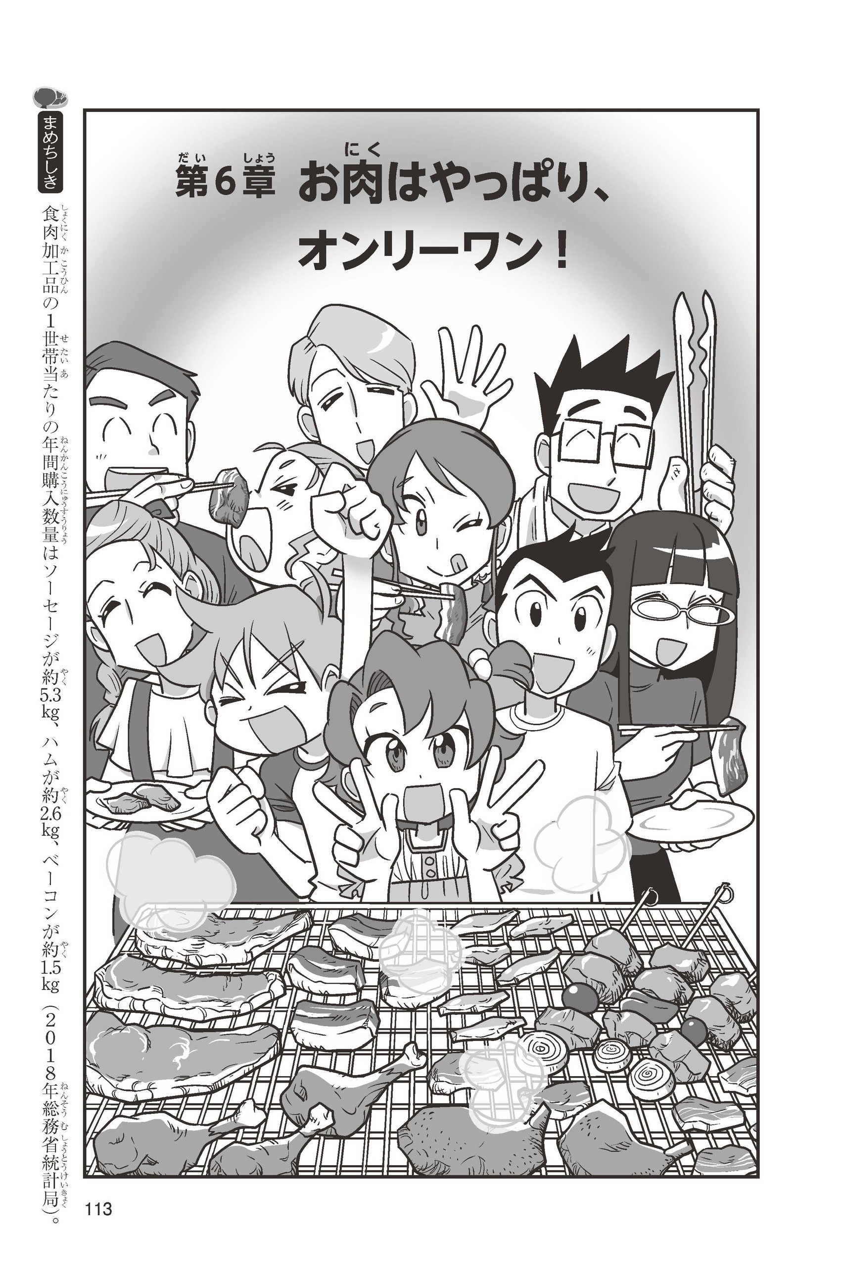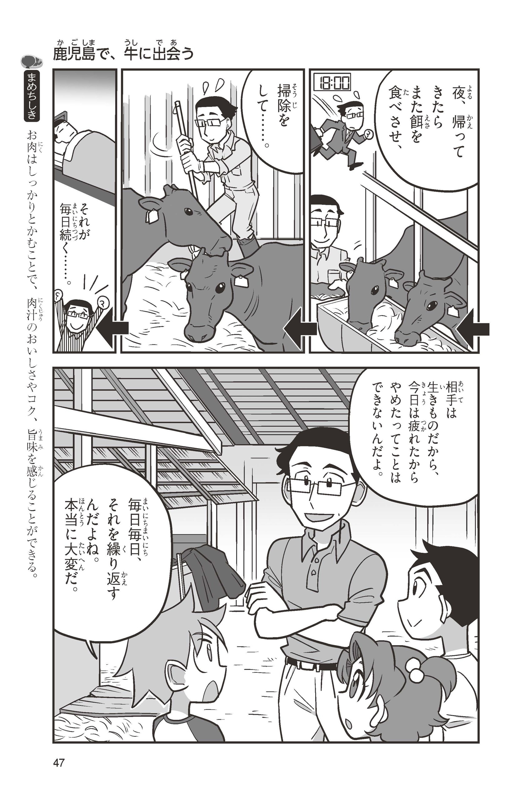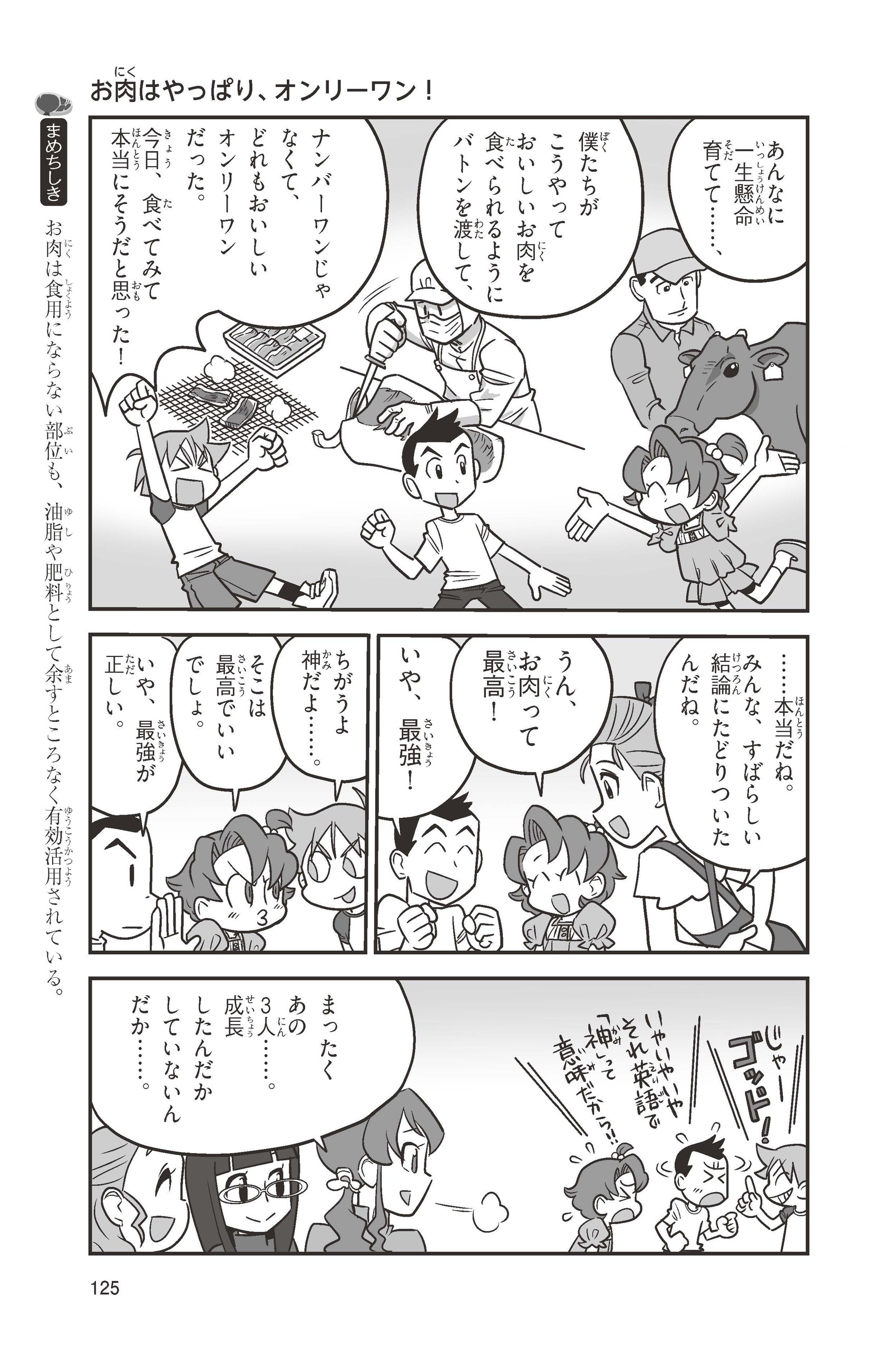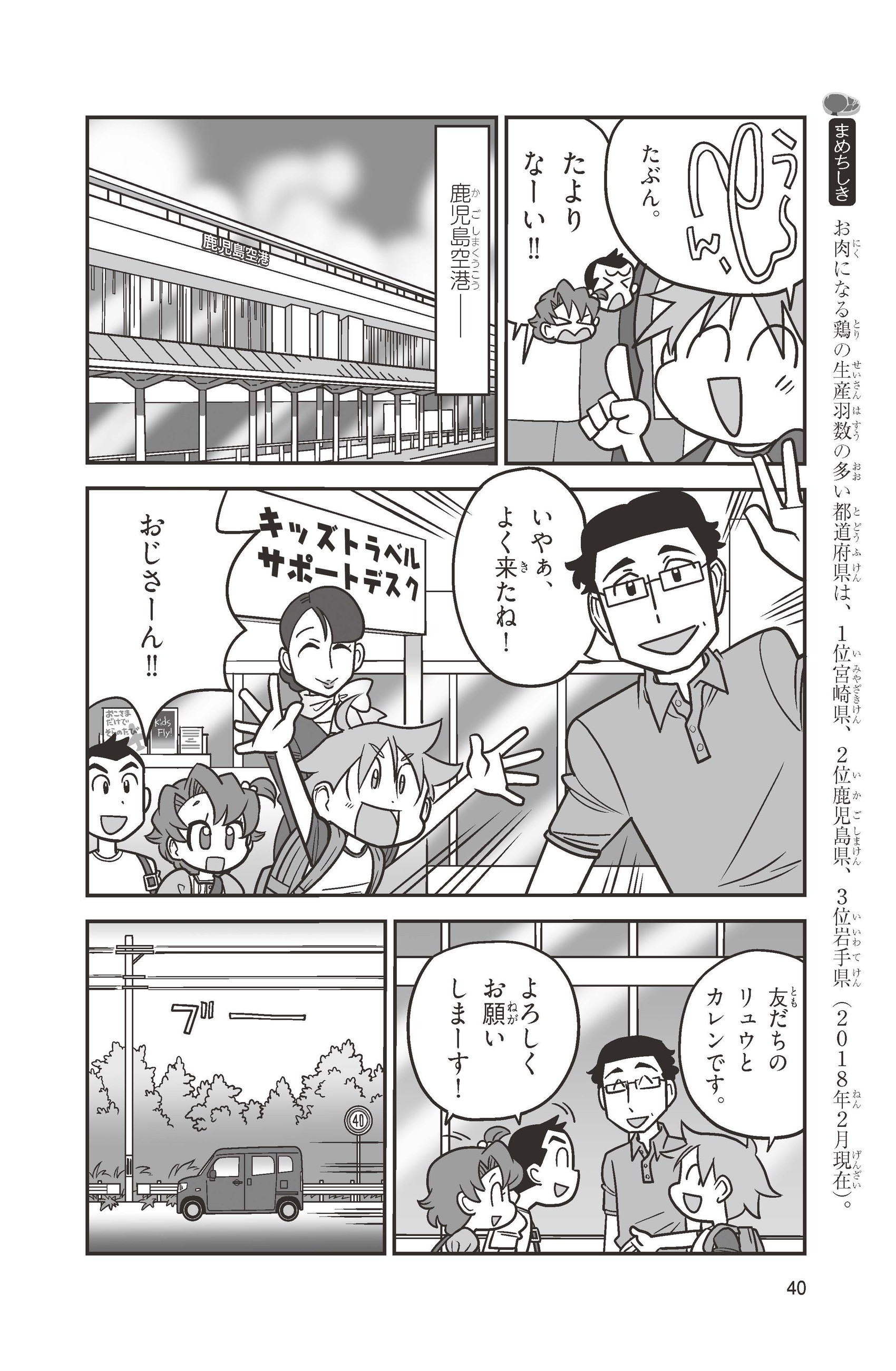 学級委員のリュウ、おませなカレン、ガキ大将(だいしょう)のヨウヘイは、おさななじみの仲良しトリオ。牛肉・豚肉(ぶたにく)・鶏肉(とりにく)のどのお肉が一番かを決めるため、小学5年生の夏休みに3人は牛を育てているヨウヘイのおじさんを訪(たず)ねて鹿児島(かごしま)に向かったよ。どうやってお肉が食卓(しょくたく)に届(とど)くのか、お肉のひみつは何か、最後にたどりついた答えは……?