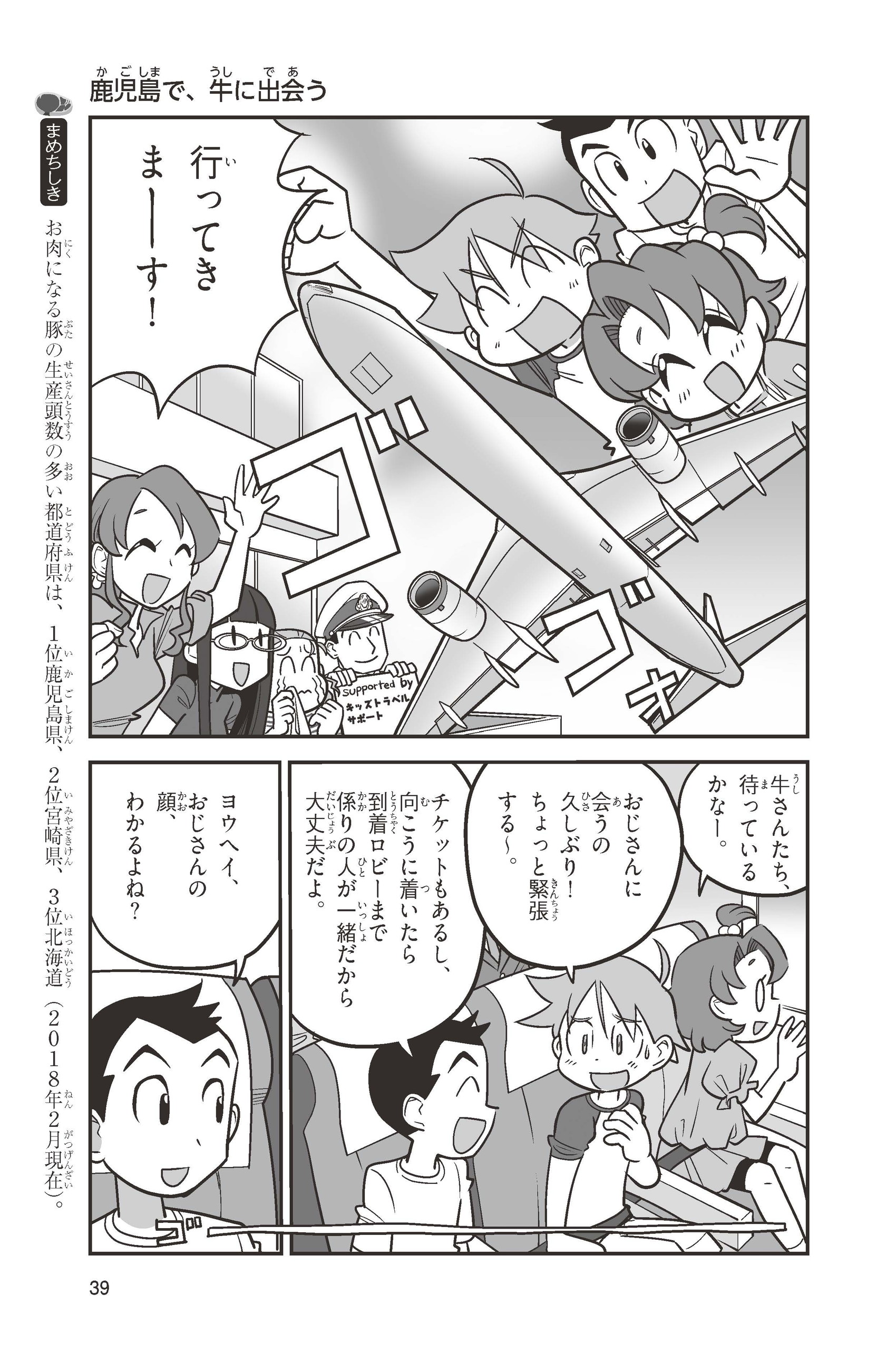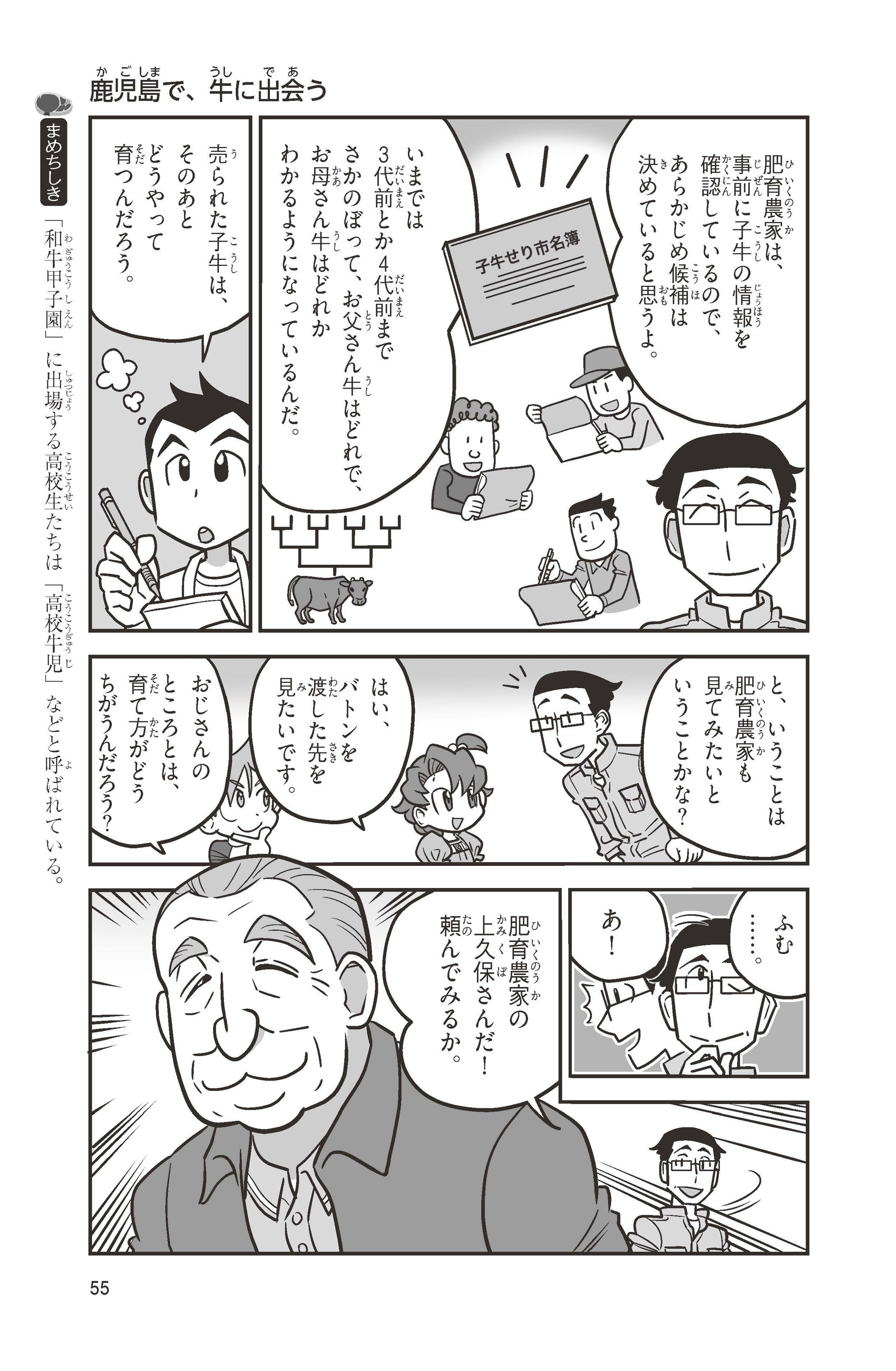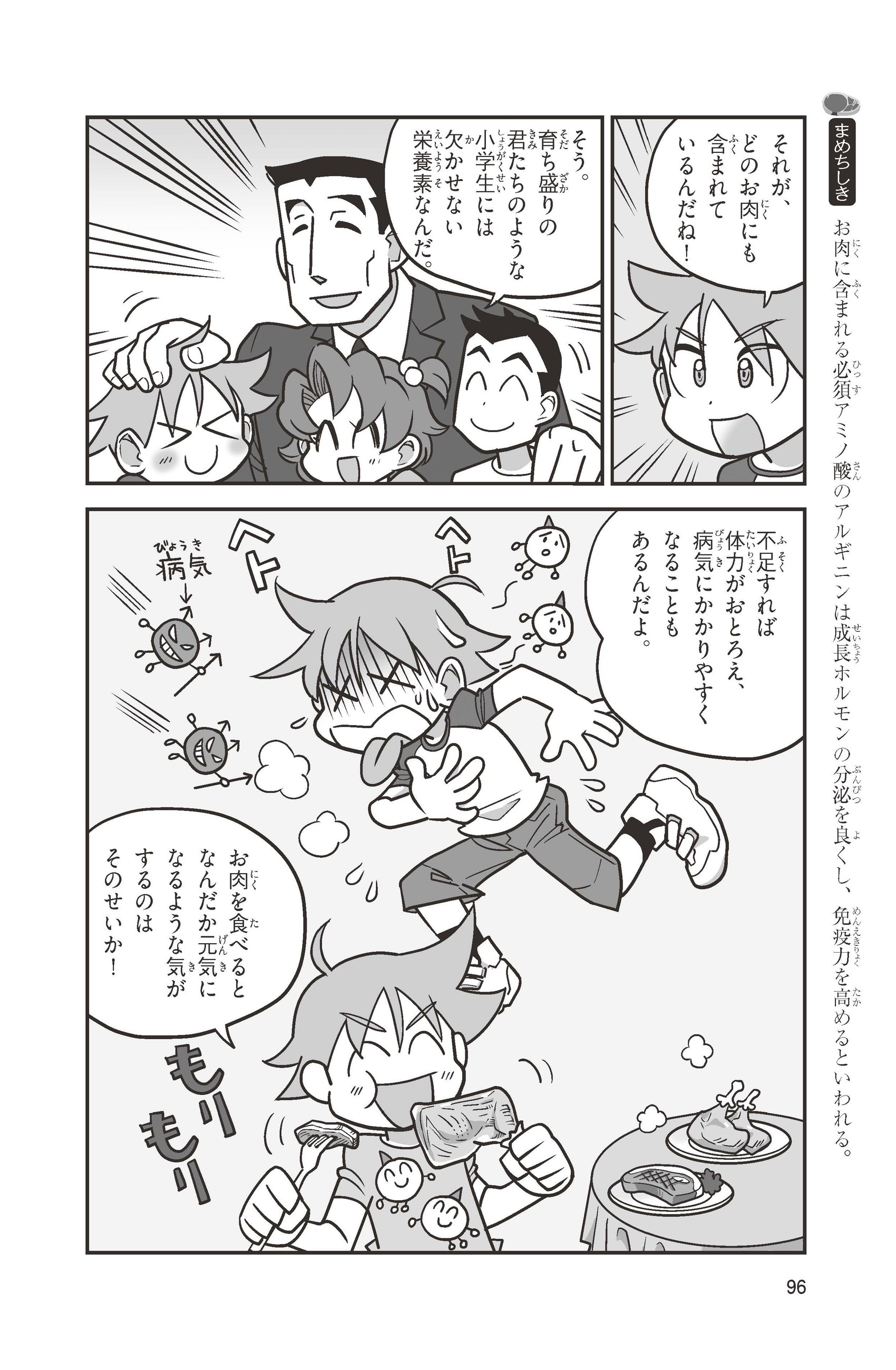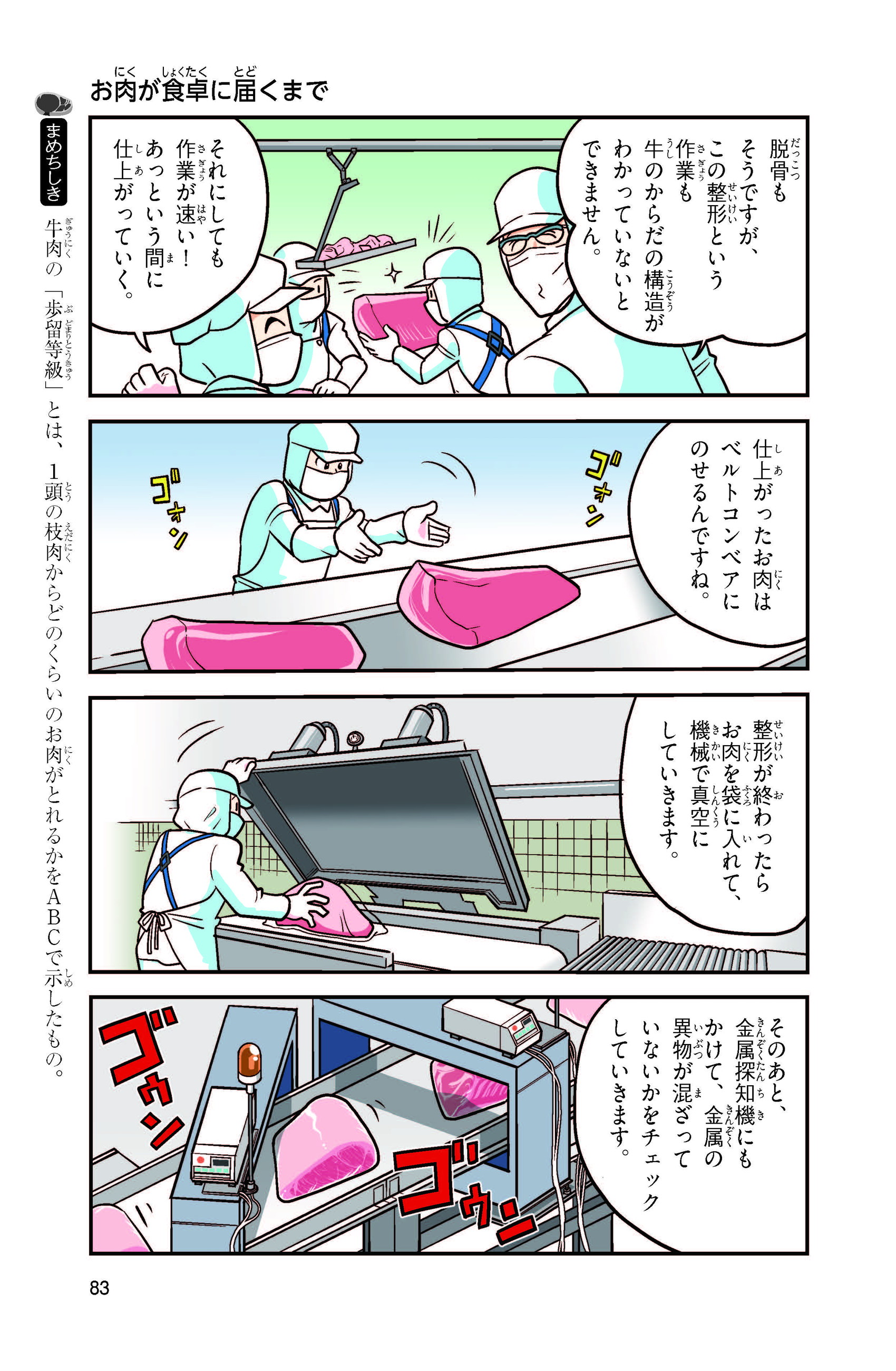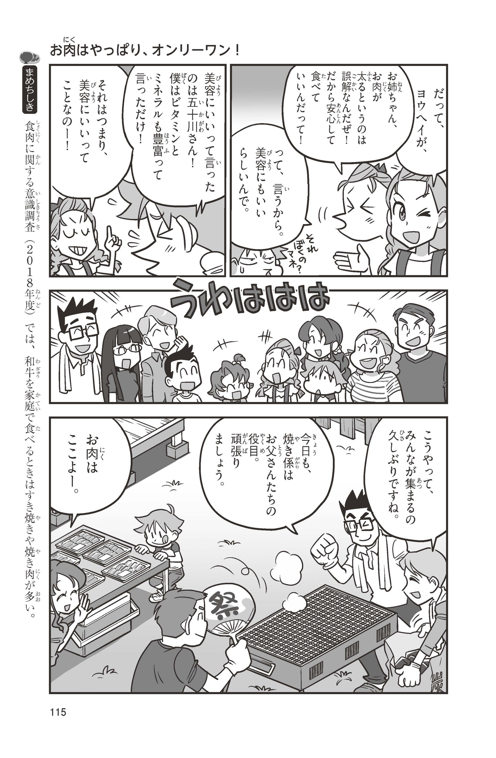 学級委員のリュウ、おませなカレン、ガキ大将(だいしょう)のヨウヘイは、おさななじみの仲良しトリオ。牛肉・豚肉(ぶたにく)・鶏肉(とりにく)のどのお肉が一番かを決めるため、小学5年生の夏休みに3人は牛を育てているヨウヘイのおじさんを訪(たず)ねて鹿児島(かごしま)に向かったよ。どうやってお肉が食卓(しょくたく)に届(とど)くのか、お肉のひみつは何か、最後にたどりついた答えは……?