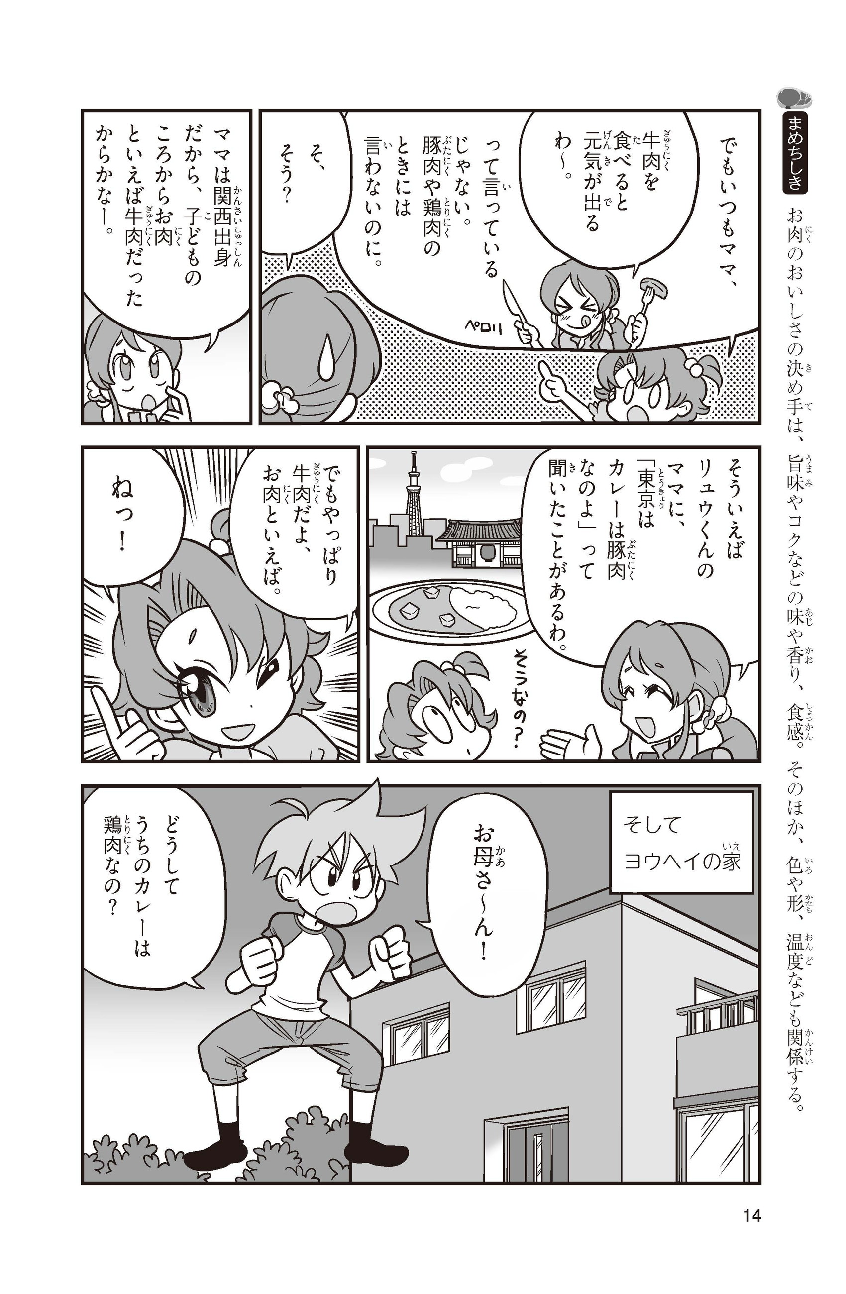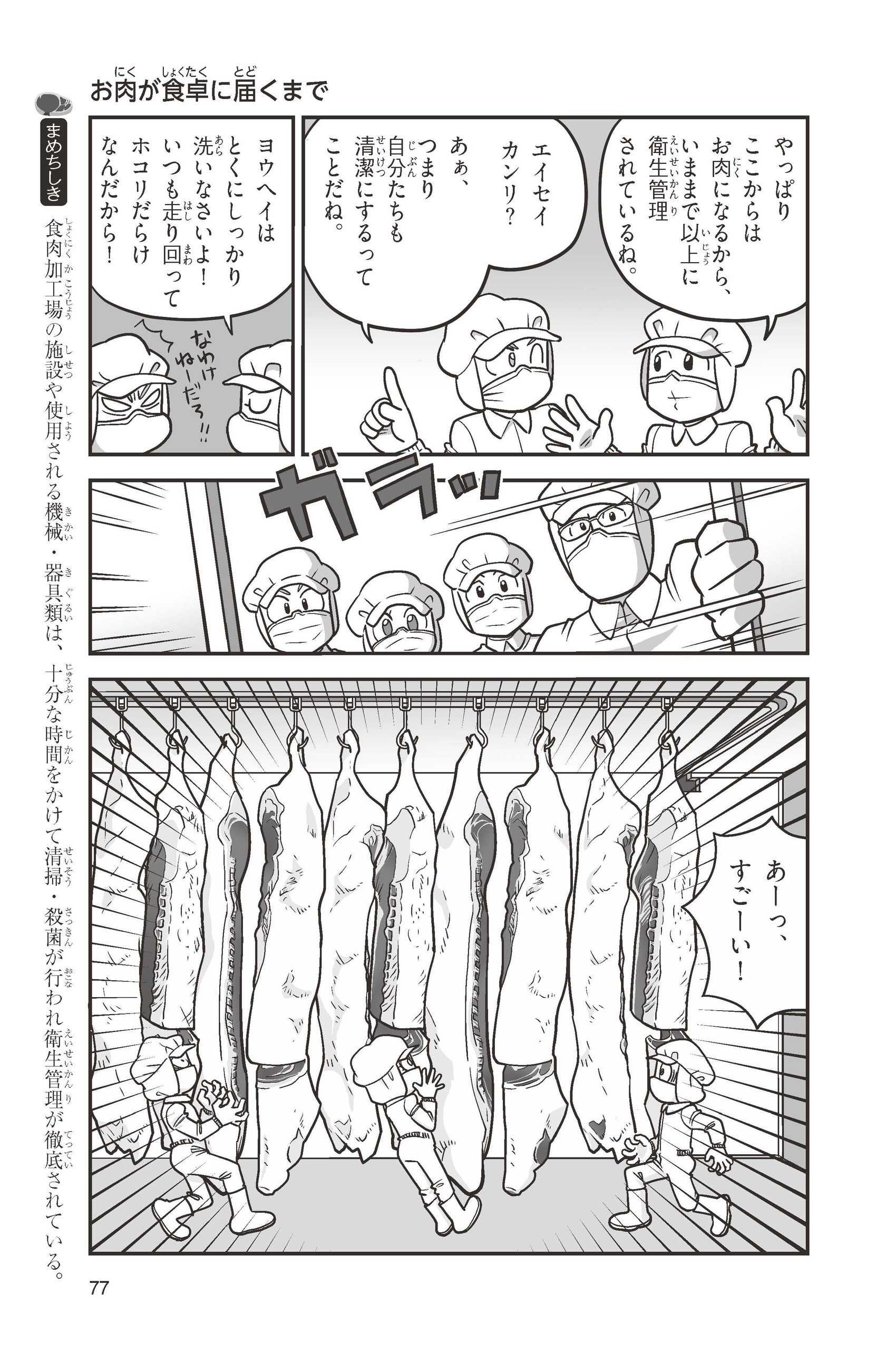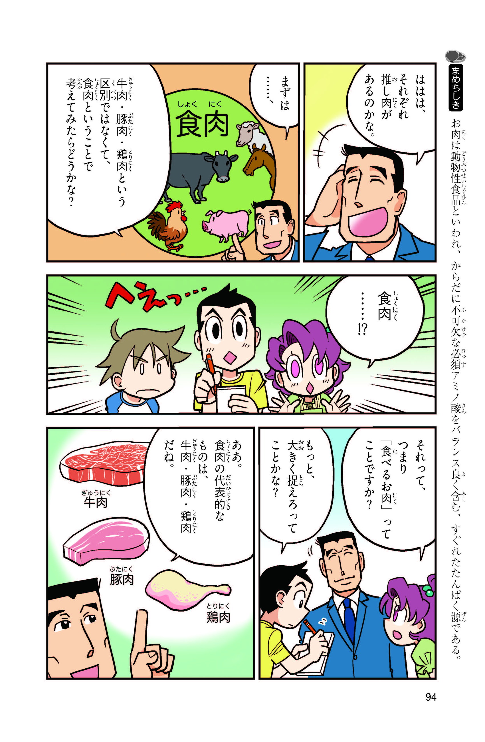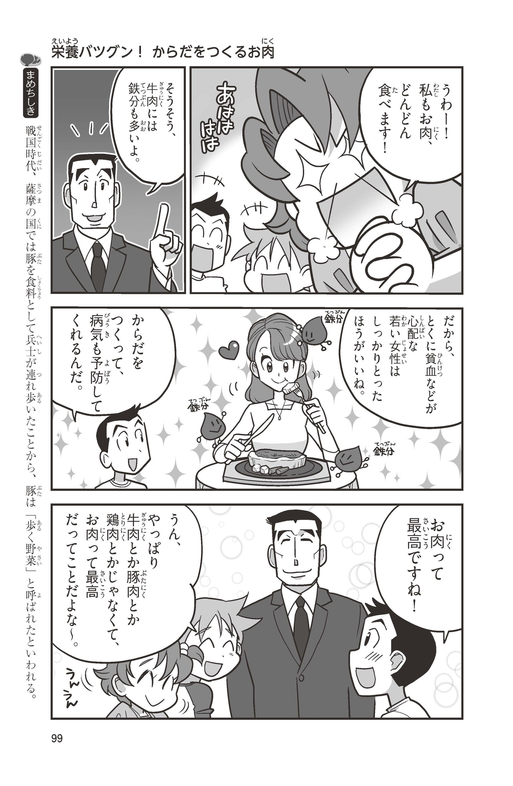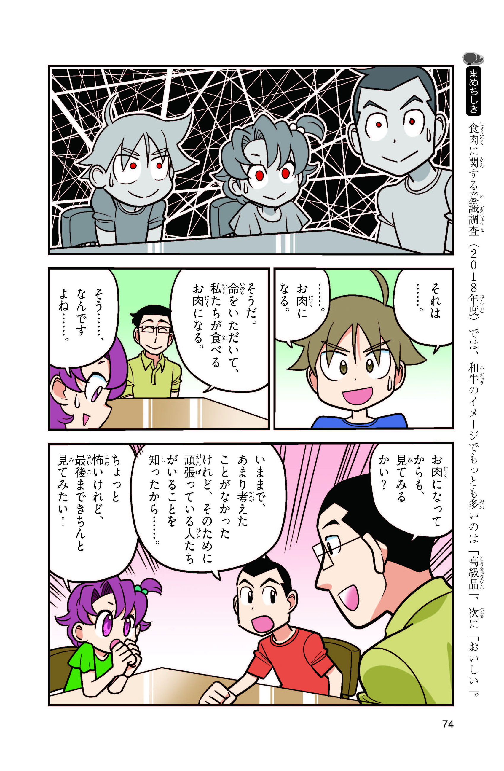 学級委員のリュウ、おませなカレン、ガキ大将(だいしょう)のヨウヘイは、おさななじみの仲良しトリオ。牛肉・豚肉(ぶたにく)・鶏肉(とりにく)のどのお肉が一番かを決めるため、小学5年生の夏休みに3人は牛を育てているヨウヘイのおじさんを訪(たず)ねて鹿児島(かごしま)に向かったよ。どうやってお肉が食卓(しょくたく)に届(とど)くのか、お肉のひみつは何か、最後にたどりついた答えは……?