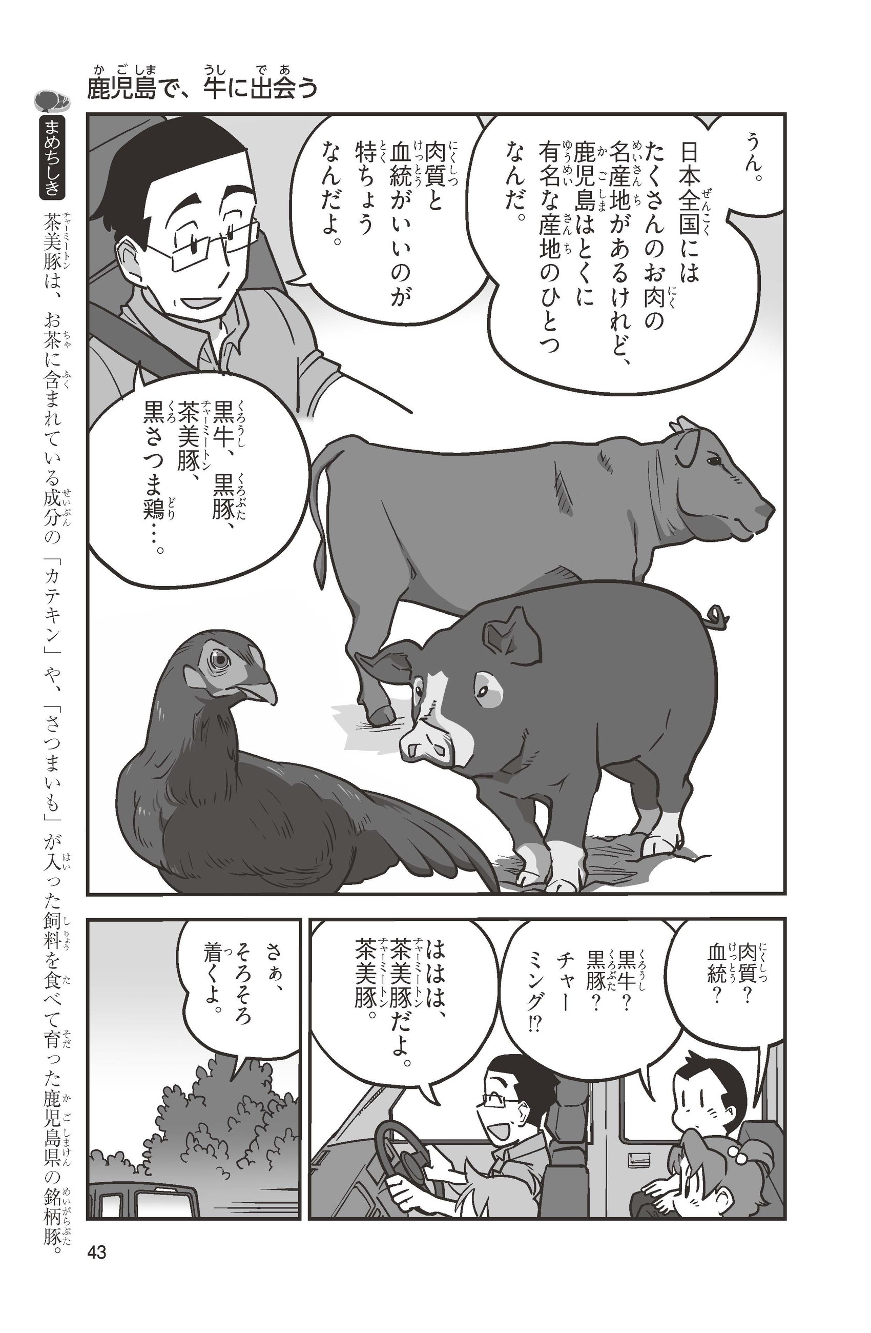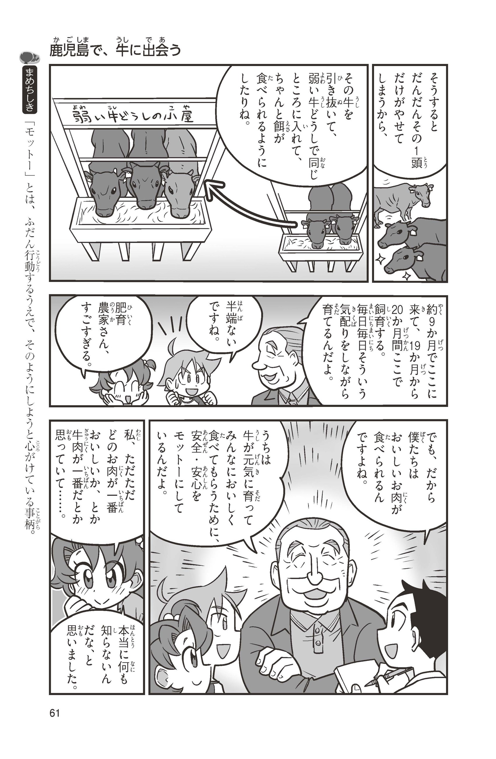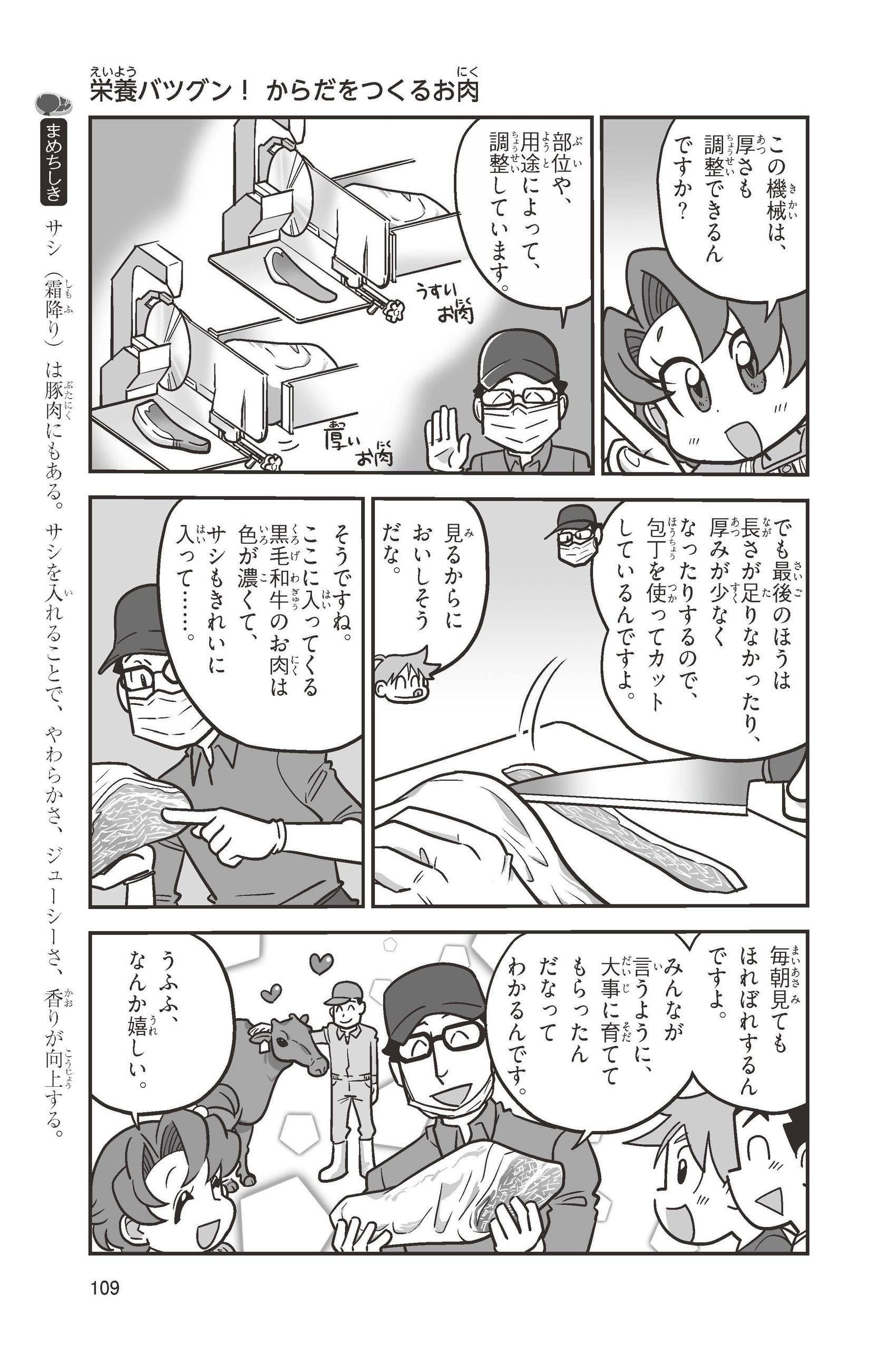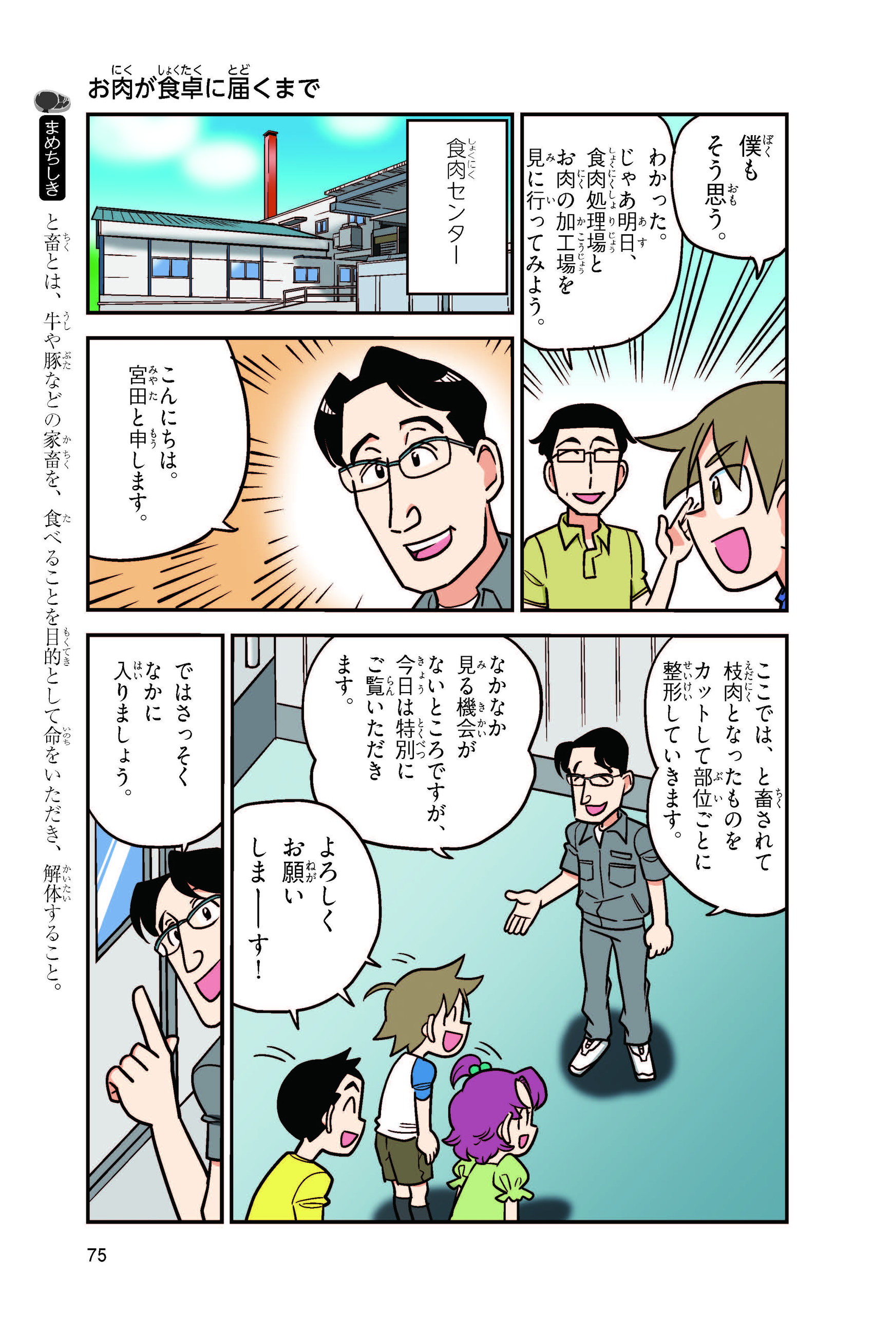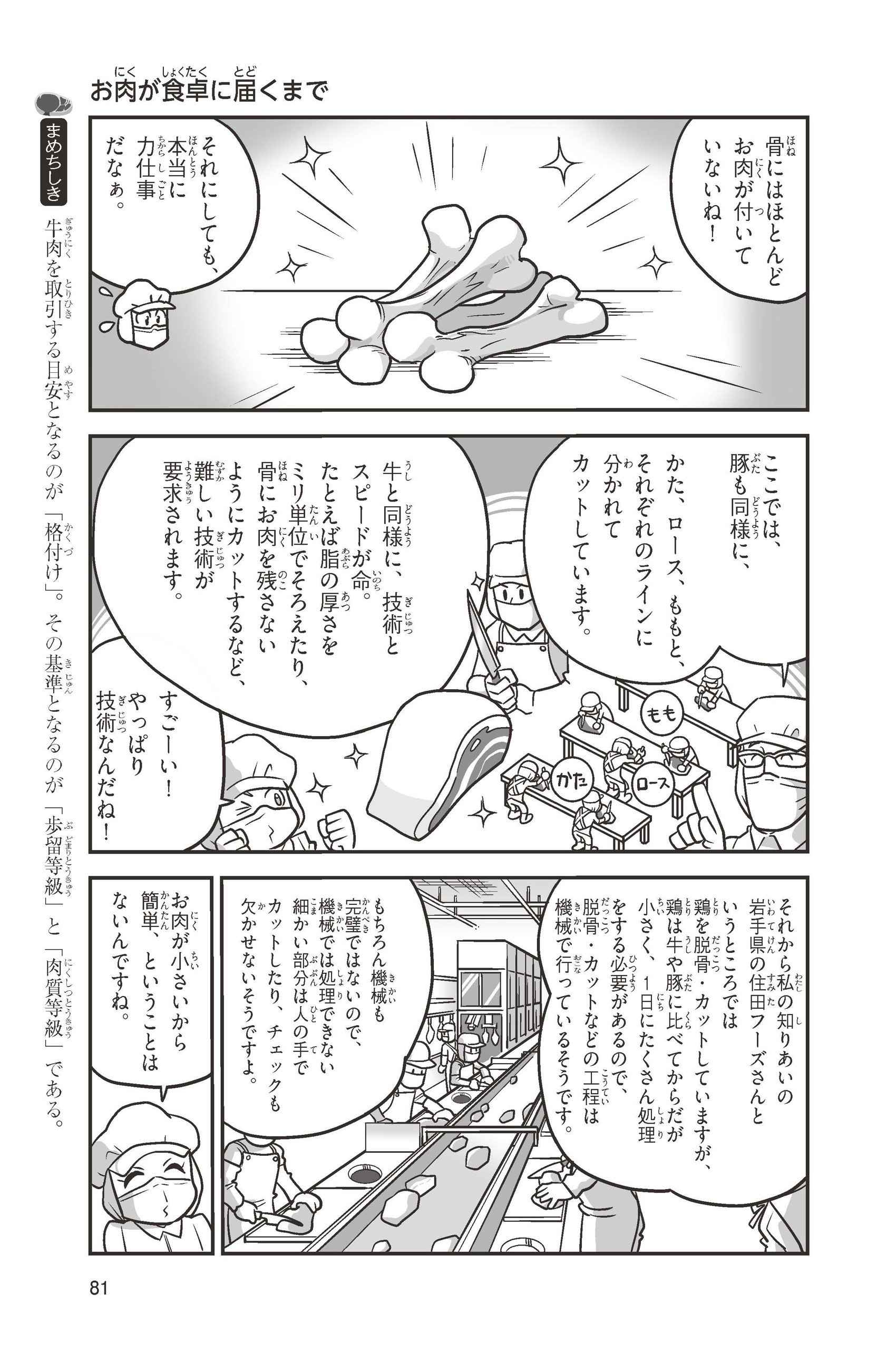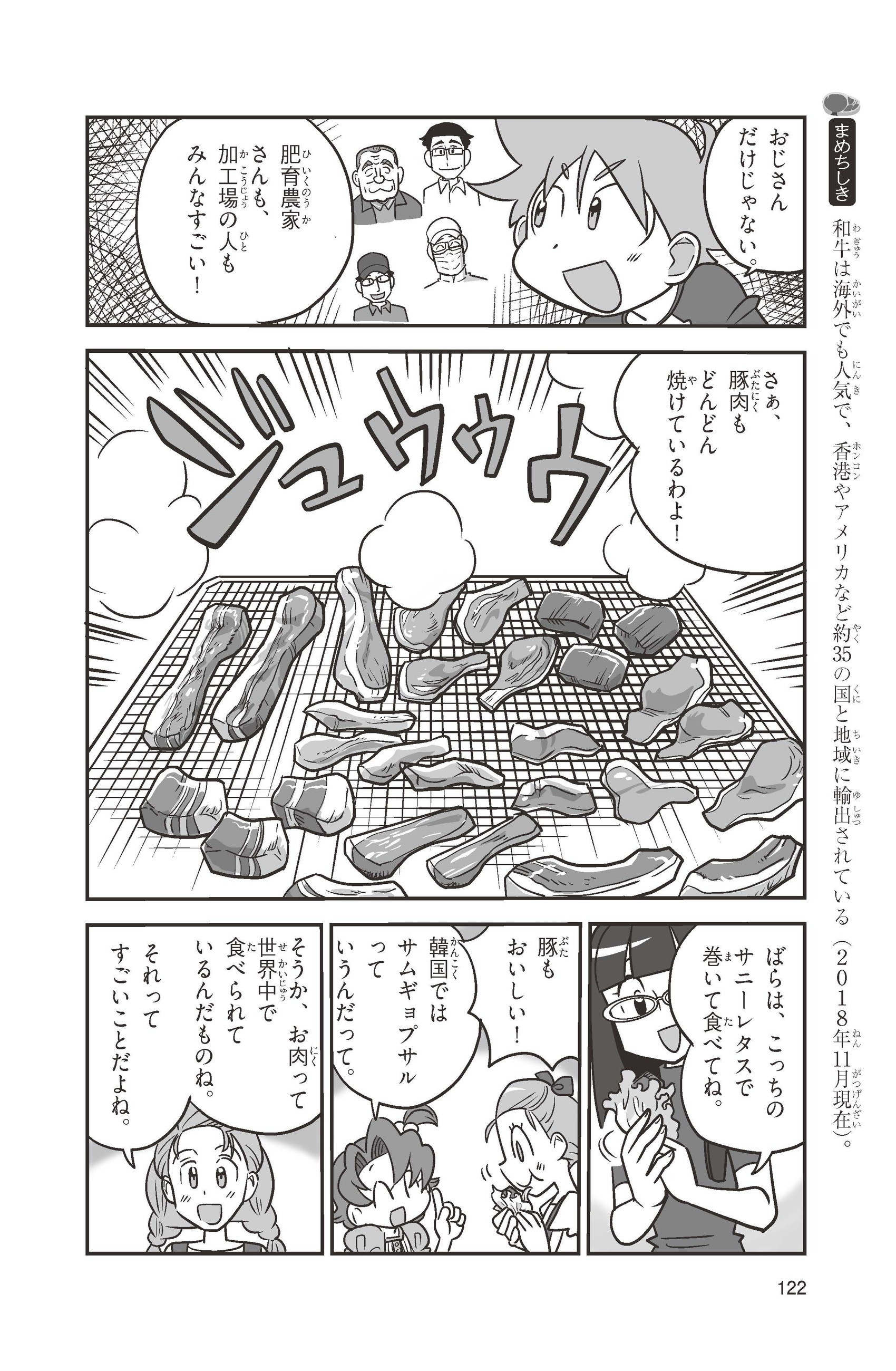 学級委員のリュウ、おませなカレン、ガキ大将(だいしょう)のヨウヘイは、おさななじみの仲良しトリオ。牛肉・豚肉(ぶたにく)・鶏肉(とりにく)のどのお肉が一番かを決めるため、小学5年生の夏休みに3人は牛を育てているヨウヘイのおじさんを訪(たず)ねて鹿児島(かごしま)に向かったよ。どうやってお肉が食卓(しょくたく)に届(とど)くのか、お肉のひみつは何か、最後にたどりついた答えは……?