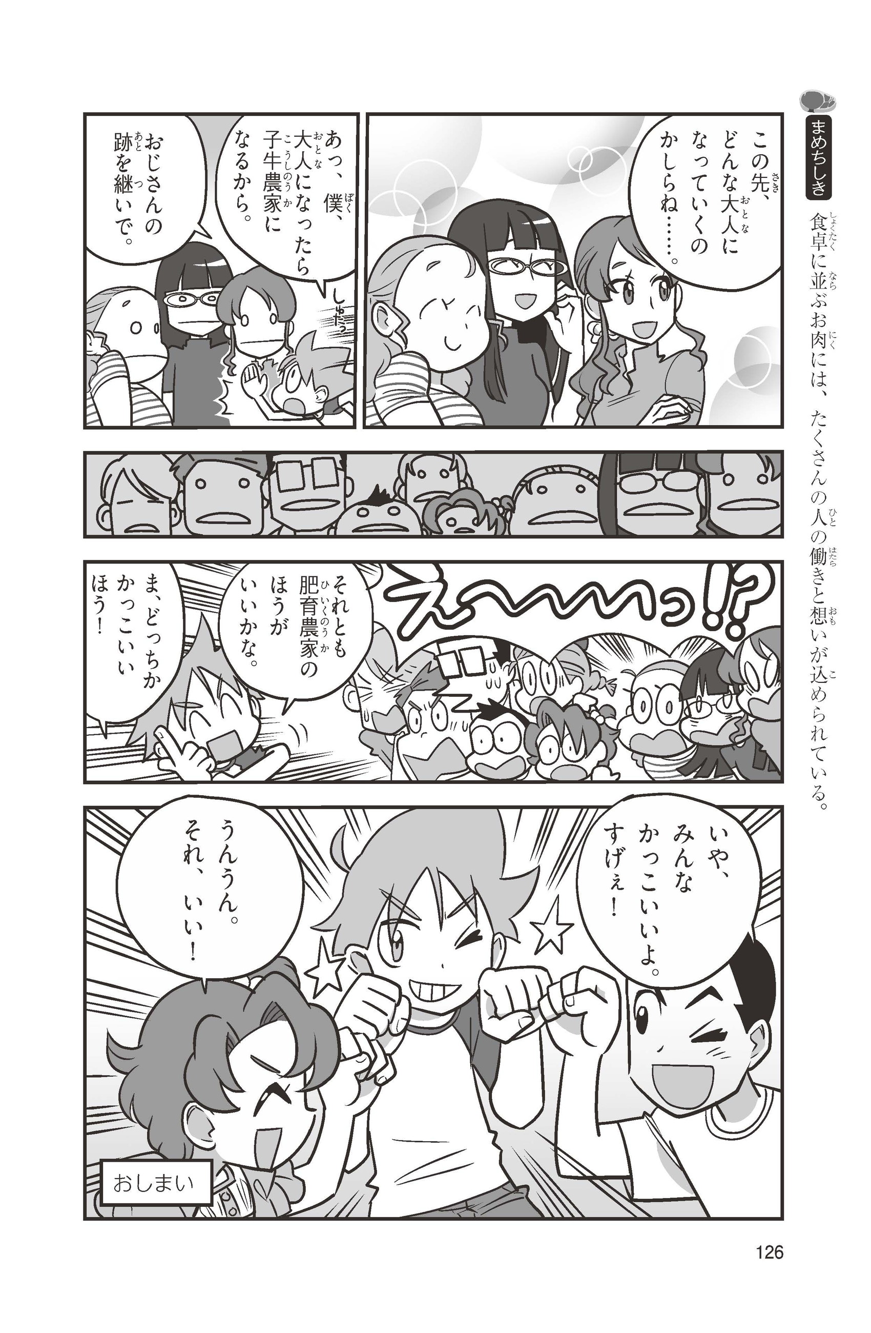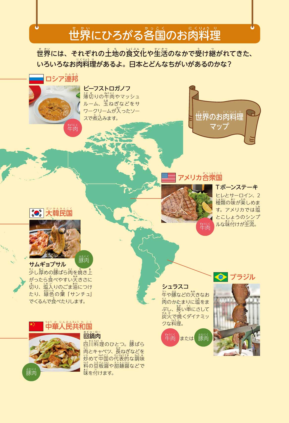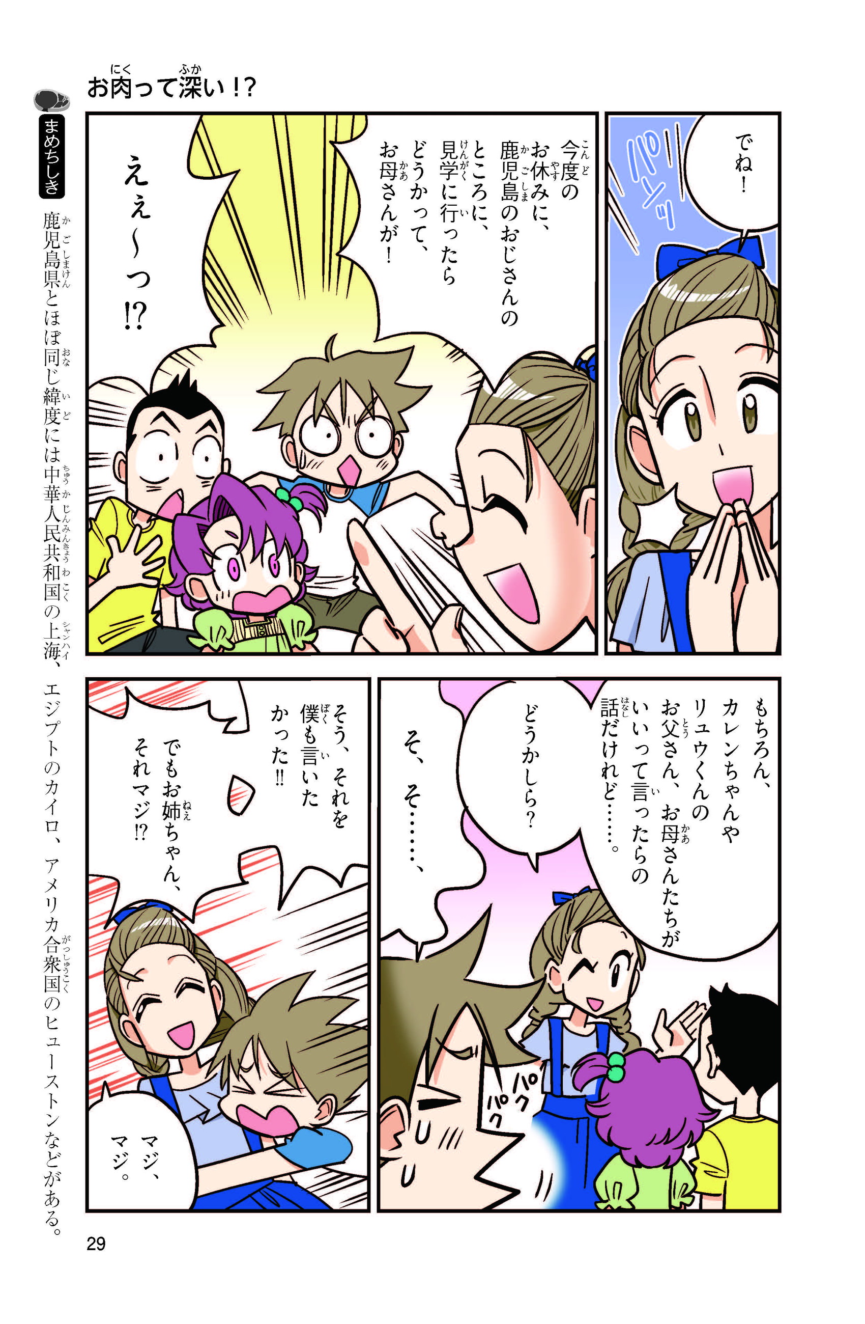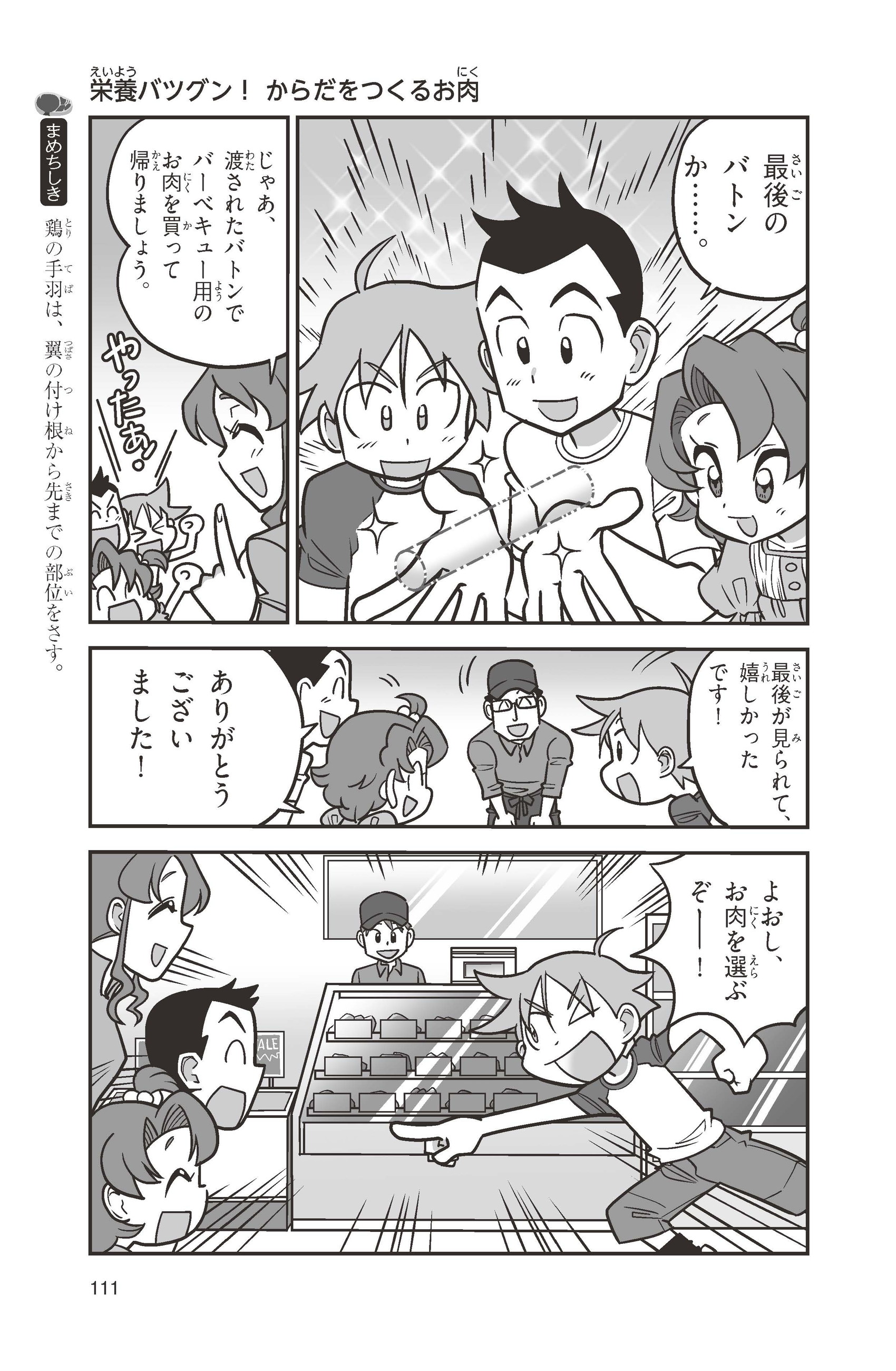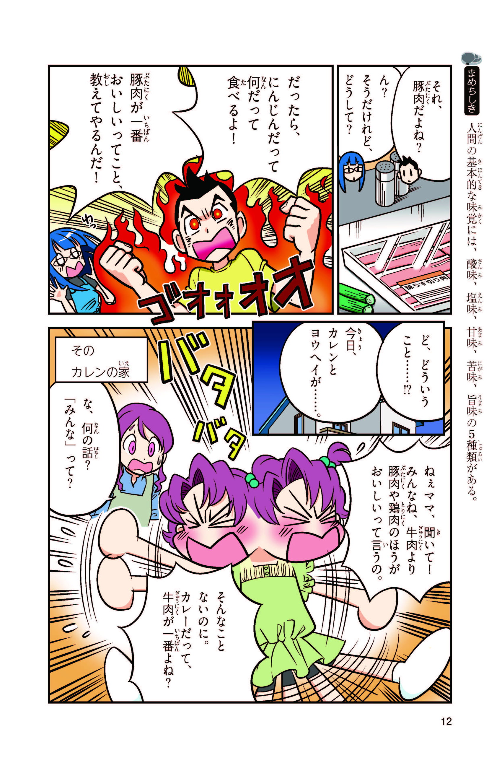 学級委員のリュウ、おませなカレン、ガキ大将(だいしょう)のヨウヘイは、おさななじみの仲良しトリオ。牛肉・豚肉(ぶたにく)・鶏肉(とりにく)のどのお肉が一番かを決めるため、小学5年生の夏休みに3人は牛を育てているヨウヘイのおじさんを訪(たず)ねて鹿児島(かごしま)に向かったよ。どうやってお肉が食卓(しょくたく)に届(とど)くのか、お肉のひみつは何か、最後にたどりついた答えは……?