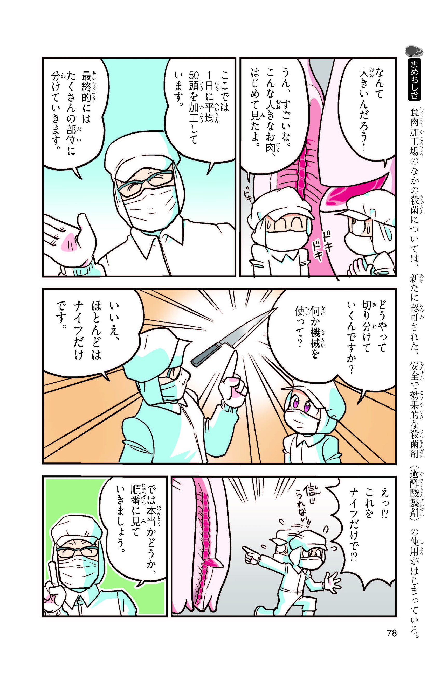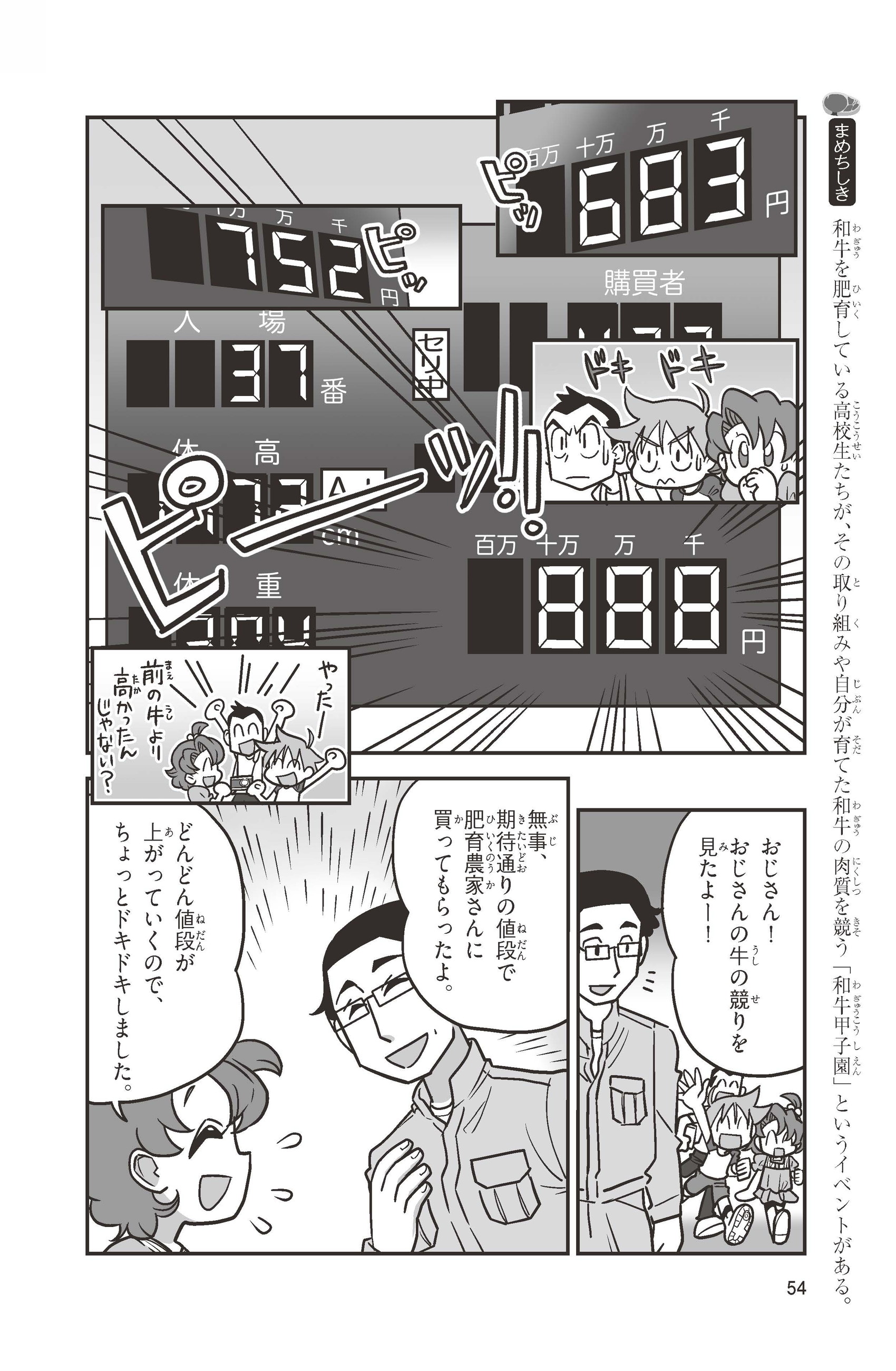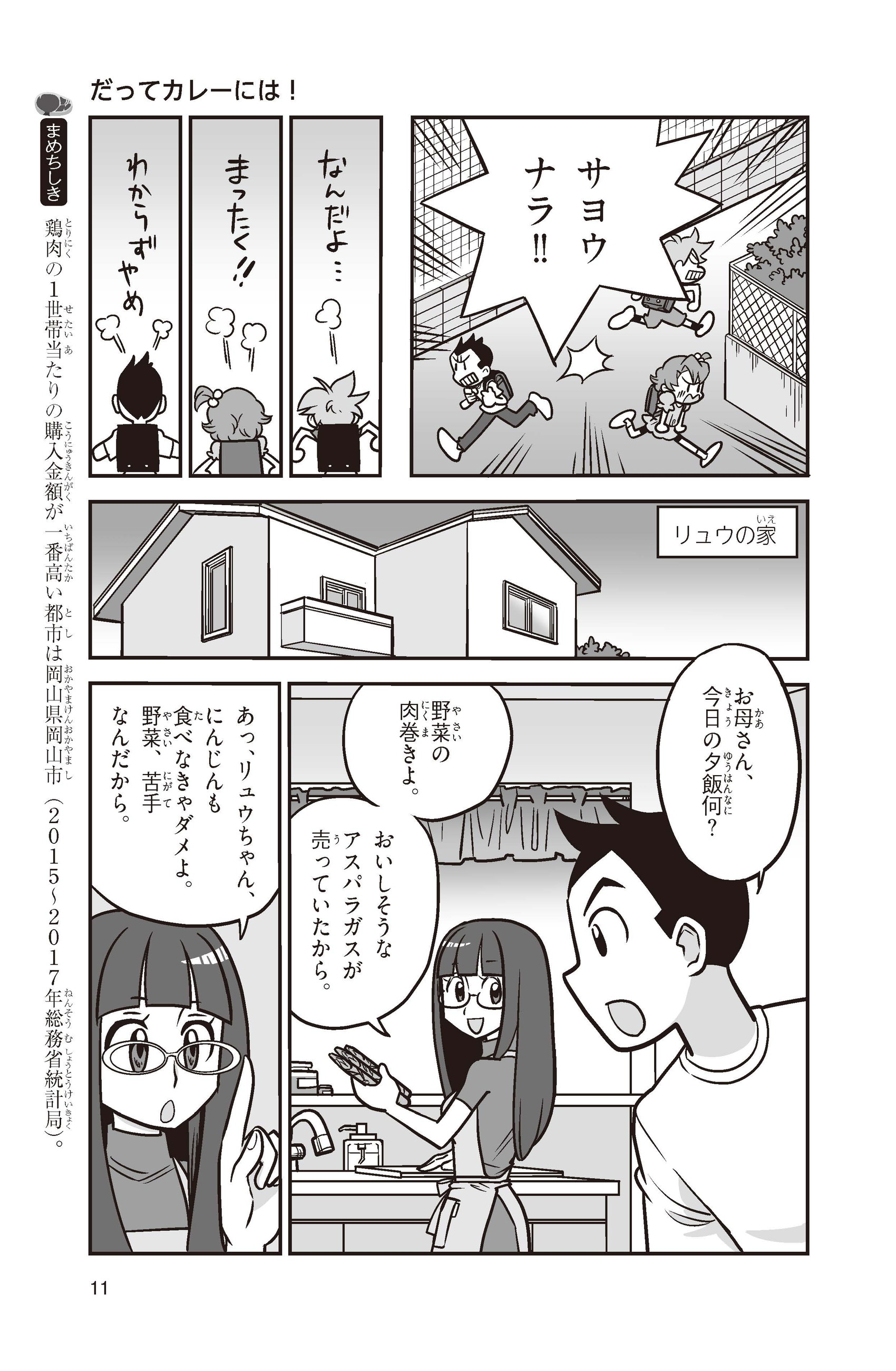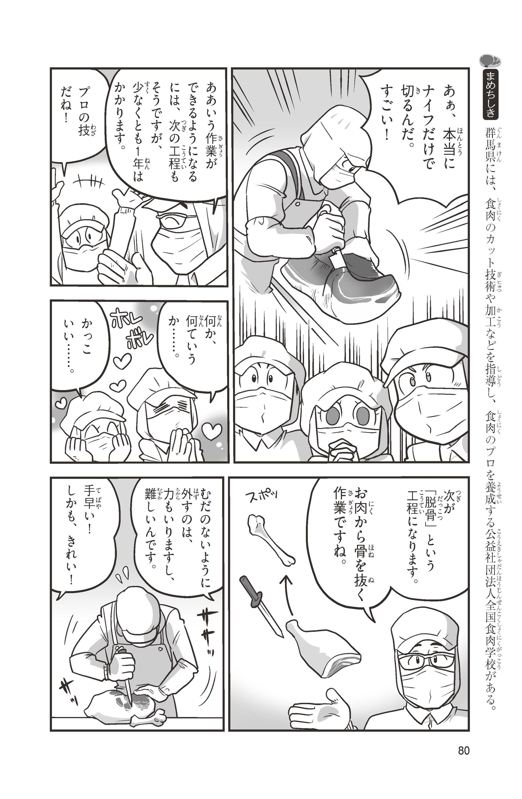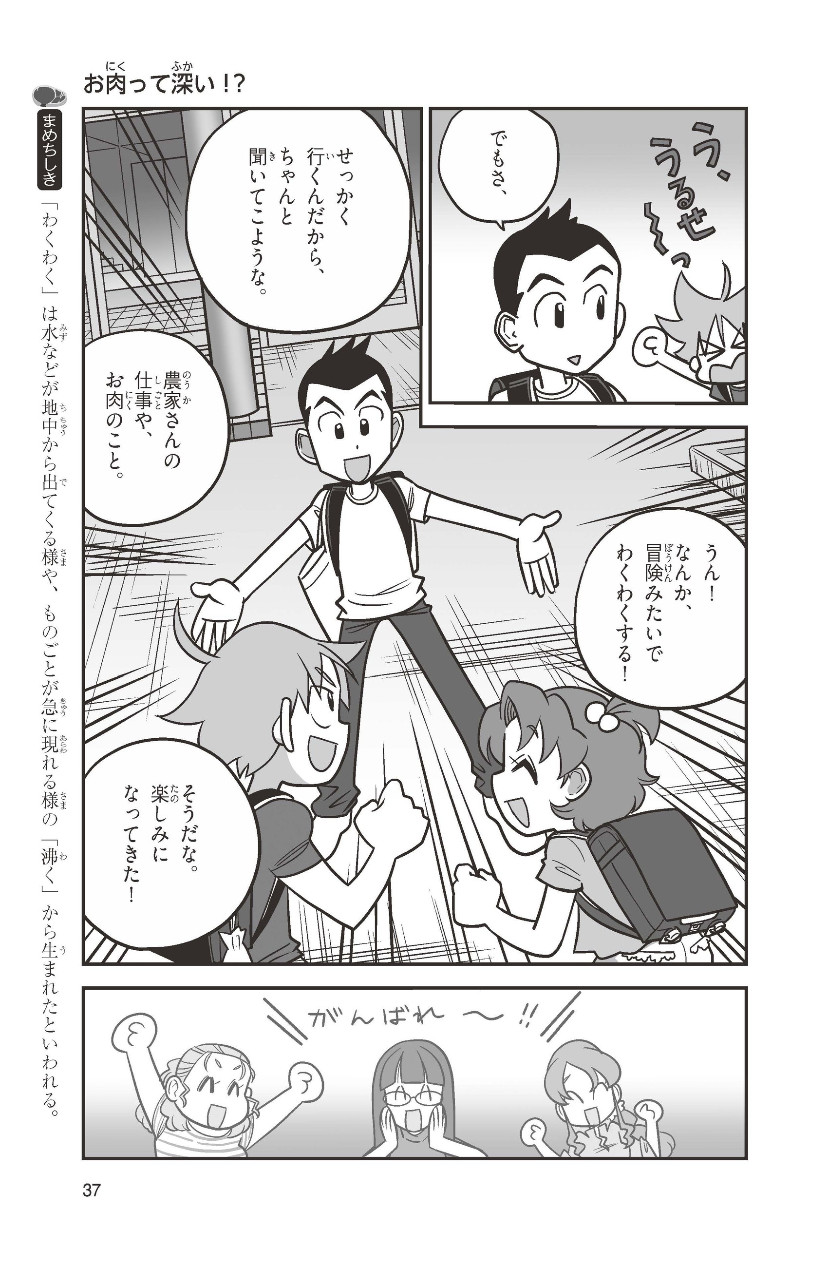 学級委員のリュウ、おませなカレン、ガキ大将(だいしょう)のヨウヘイは、おさななじみの仲良しトリオ。牛肉・豚肉(ぶたにく)・鶏肉(とりにく)のどのお肉が一番かを決めるため、小学5年生の夏休みに3人は牛を育てているヨウヘイのおじさんを訪(たず)ねて鹿児島(かごしま)に向かったよ。どうやってお肉が食卓(しょくたく)に届(とど)くのか、お肉のひみつは何か、最後にたどりついた答えは……?