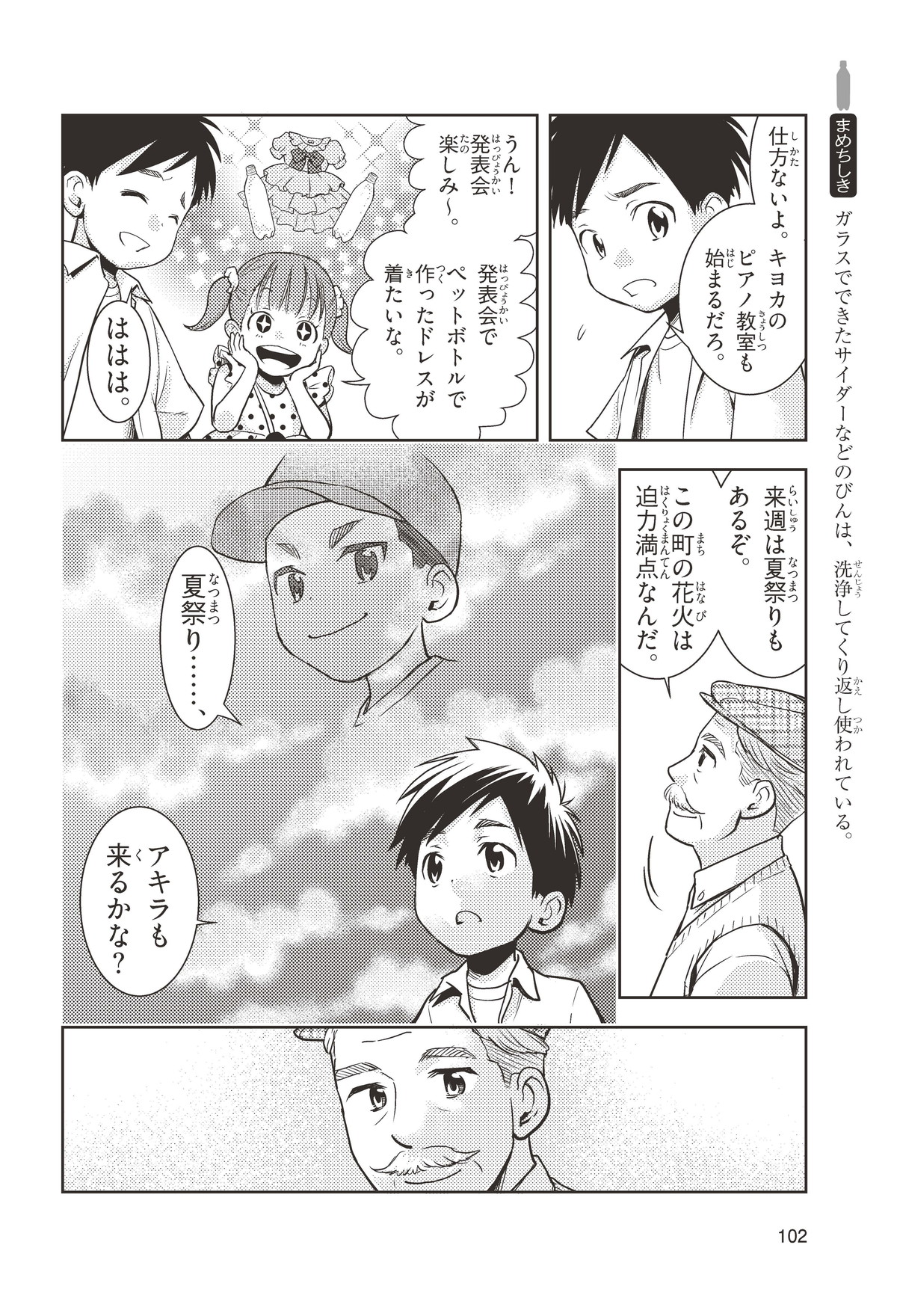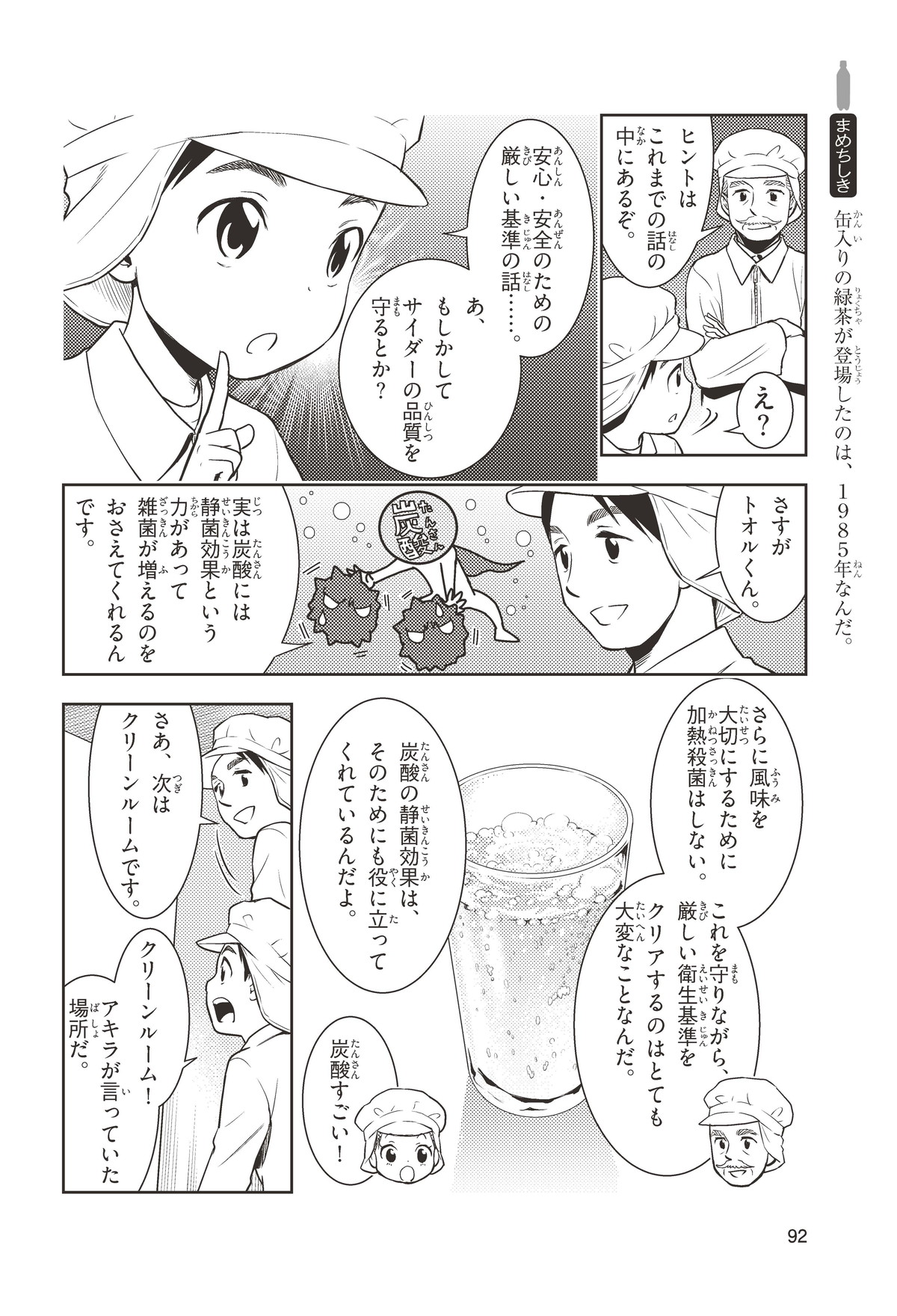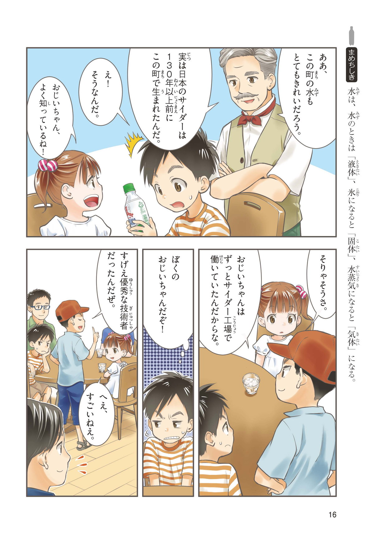 夏休みにおじいちゃんとおばあちゃんが住んでいる町に帰省するトオルとキヨカ。おじいちゃんが出してくれたサイダーは、ほのかな甘さとさわやかな香りが口の中ではじける。初めて飲んだキヨカは、キラキラと目をかがやかせる。「サイダーの味や香りは何だろう?」「このシュワシュワするあわは何だろう?」サイダーを好きになればなるほど生まれてくる不思議を、地元の少年アキラとさぐりにいくよ。