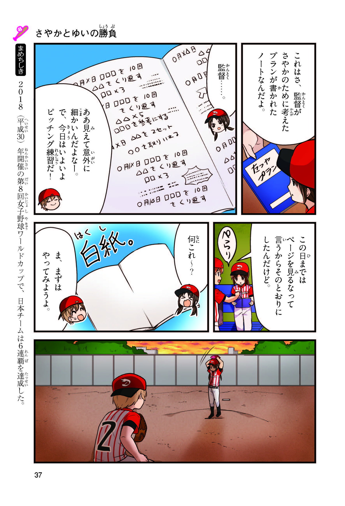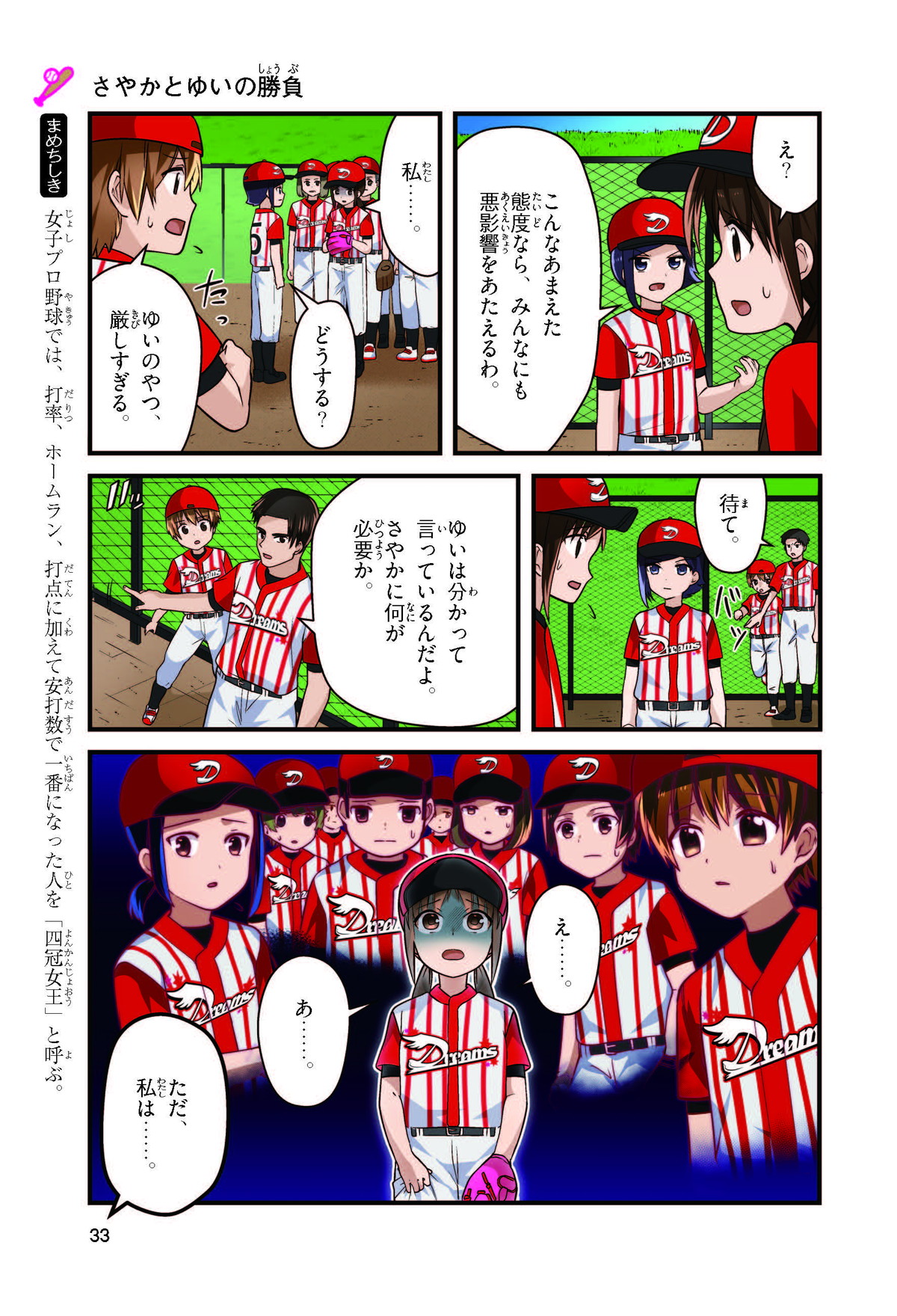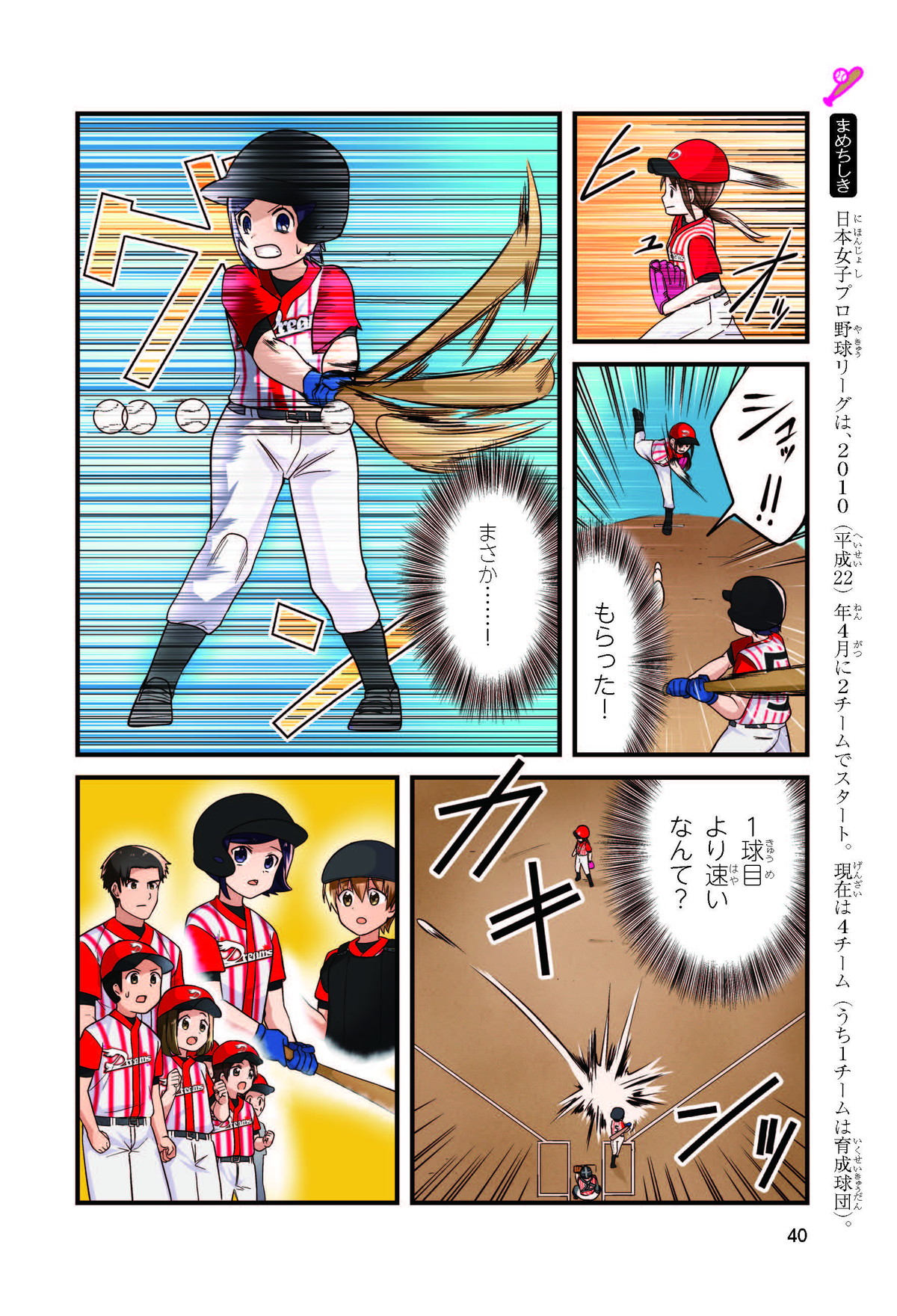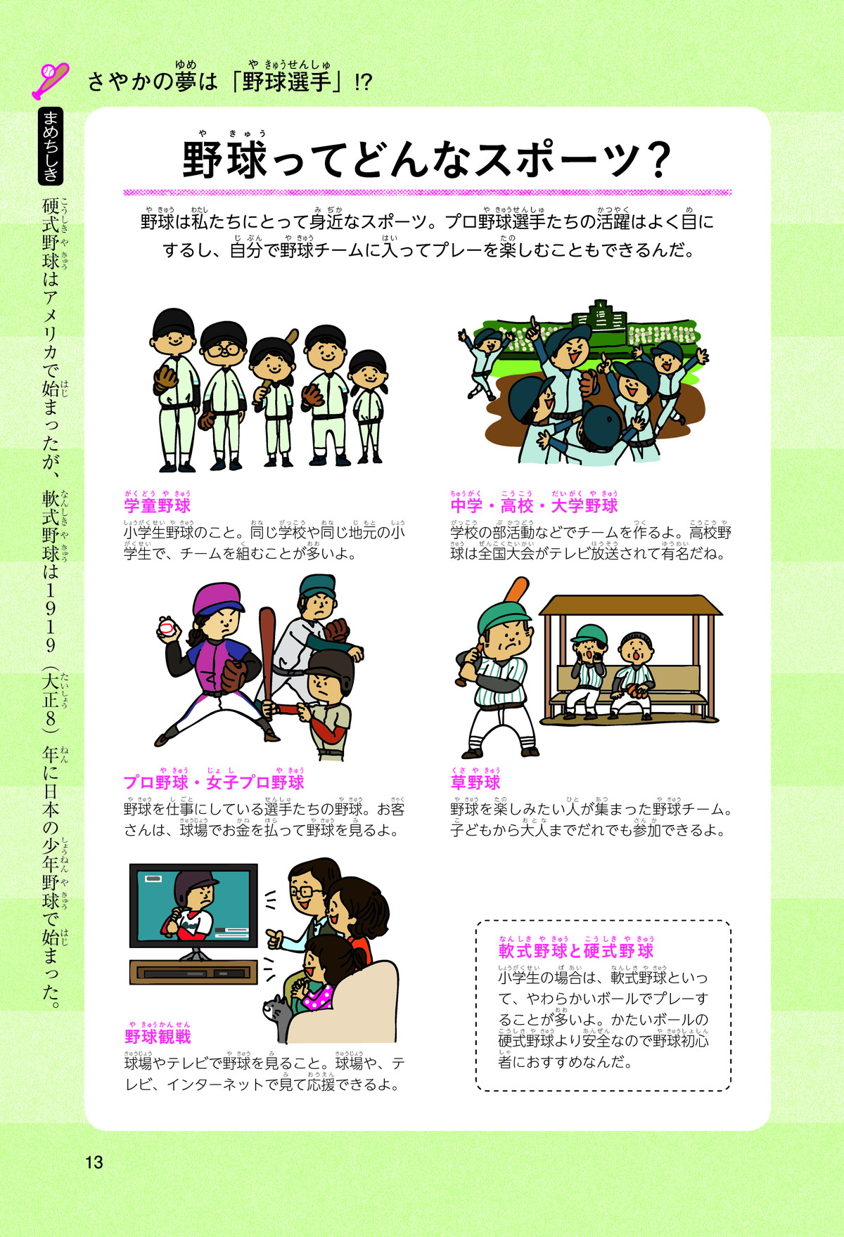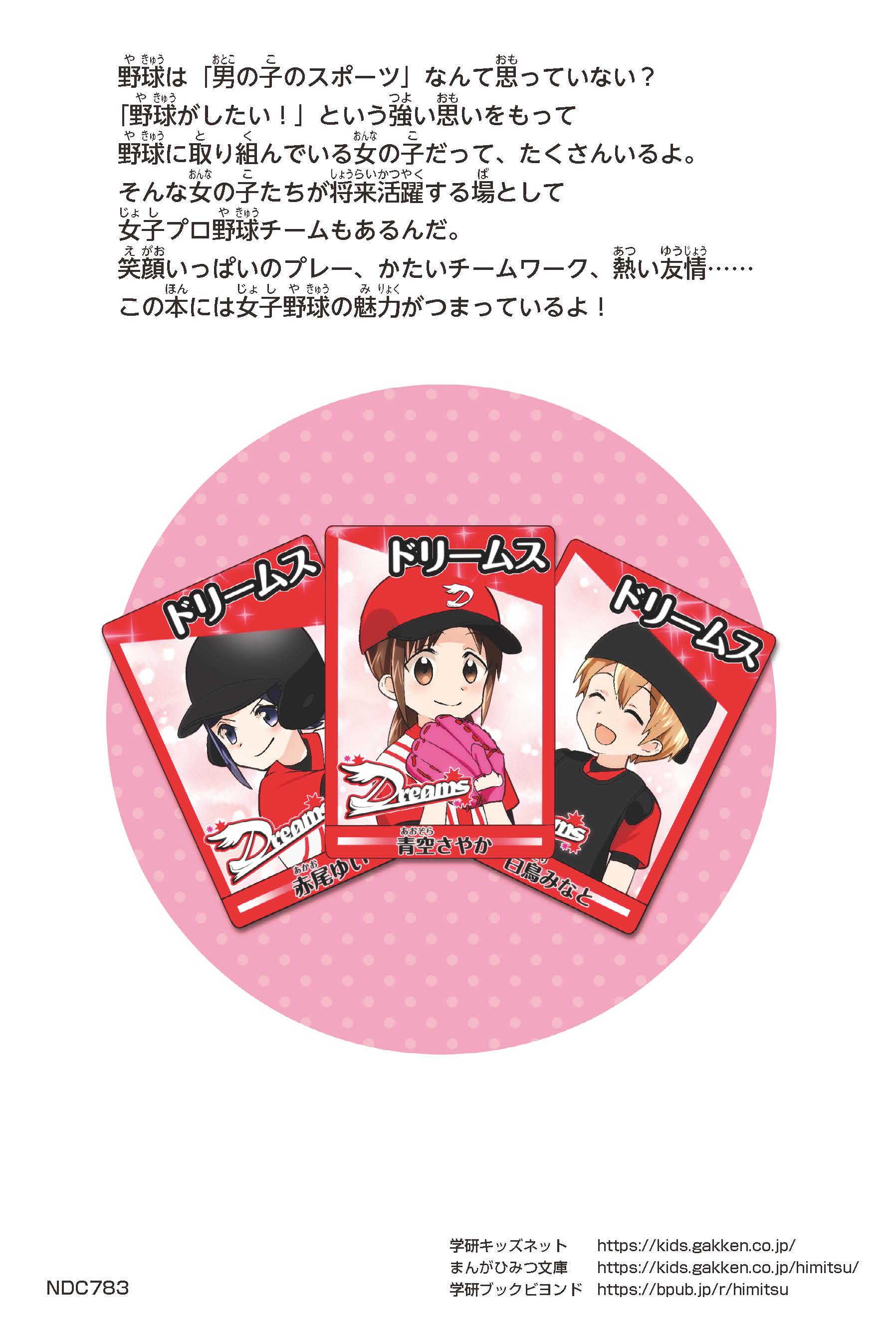 小学6年生のさやかは運動が大の苦手だけど、野球が大好き! ある日、友だちのゆいから、女の子も野球選手になれると聞いて、もっと野球のことが知りたくなるよ。野球をがんばる女の子たちが将来活躍(かつやく)する場として、女子プロ野球チームもあるんだ。笑顔いっぱいのプレー、かたいチームワーク、熱い友情……この本には女子野球の魅力(みりょく)がつまっているよ!