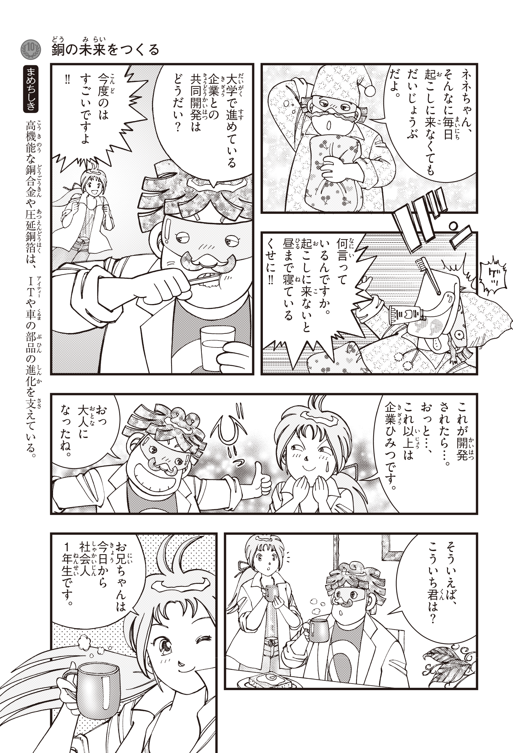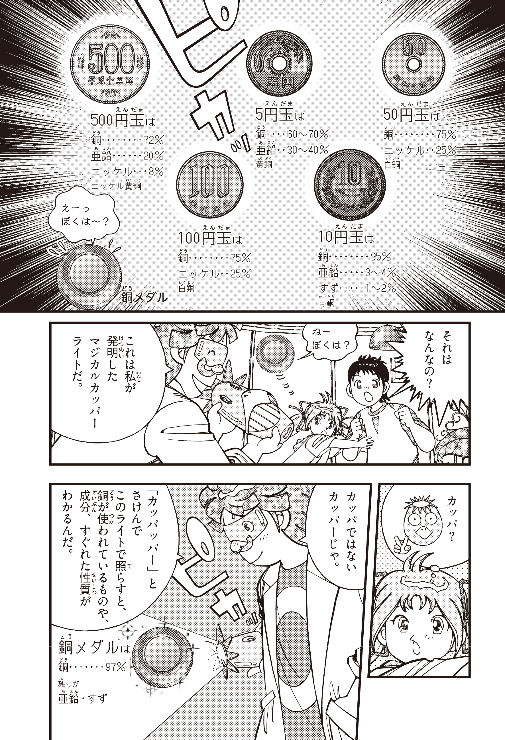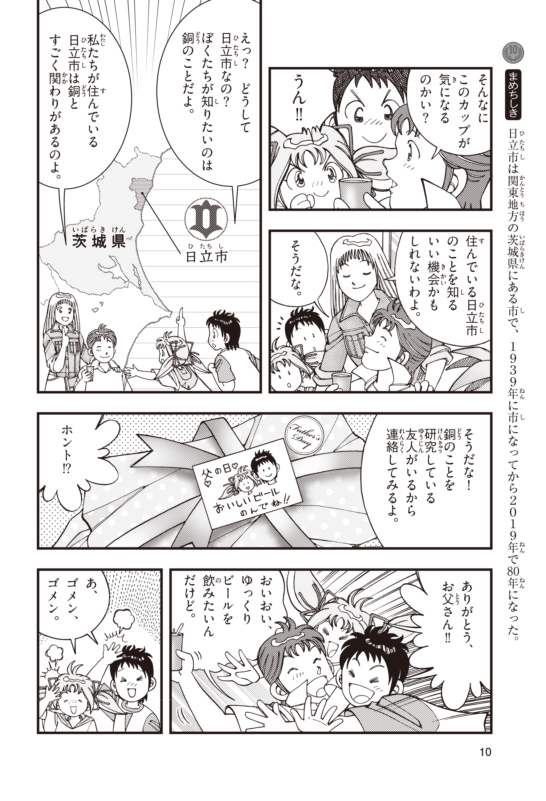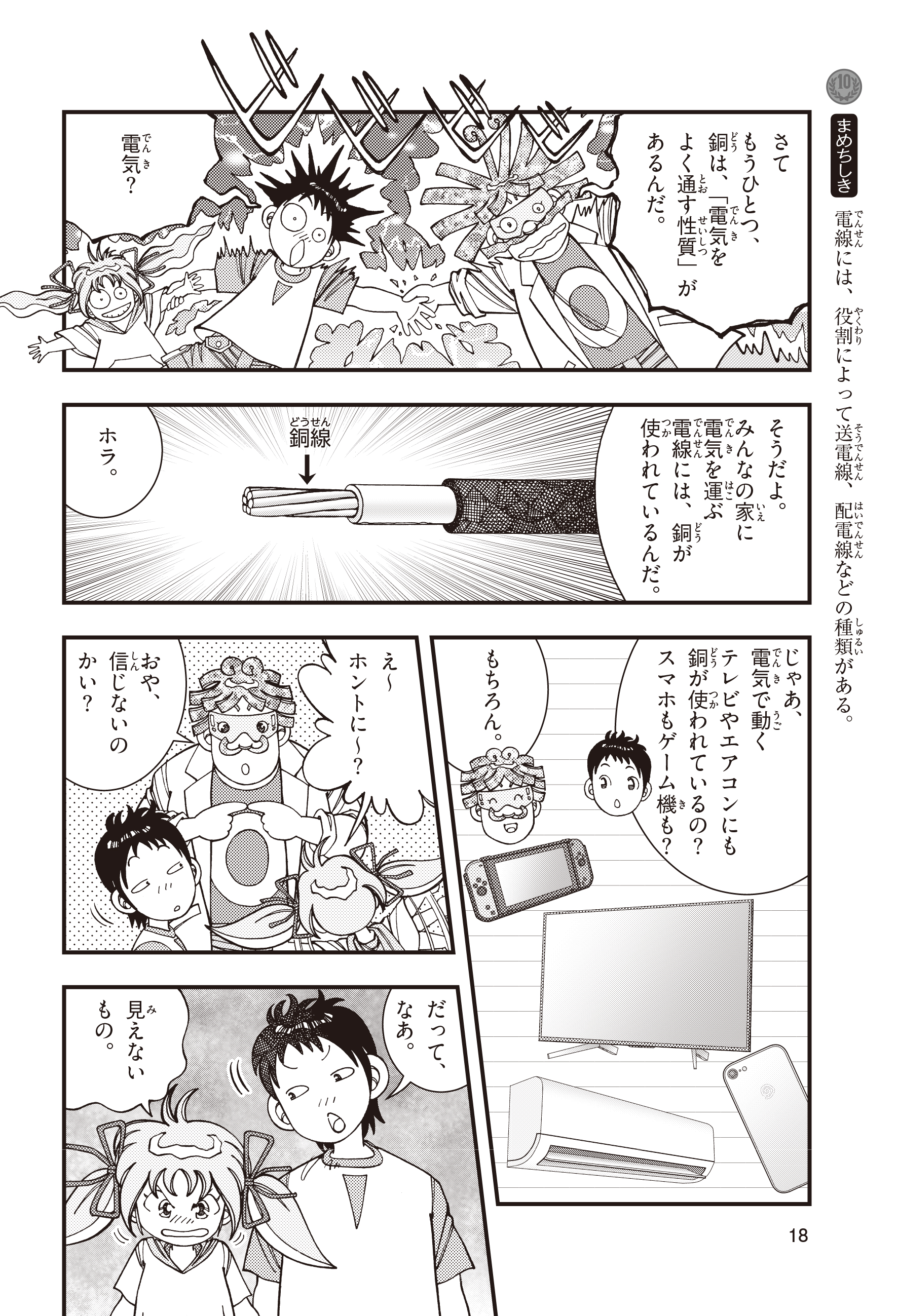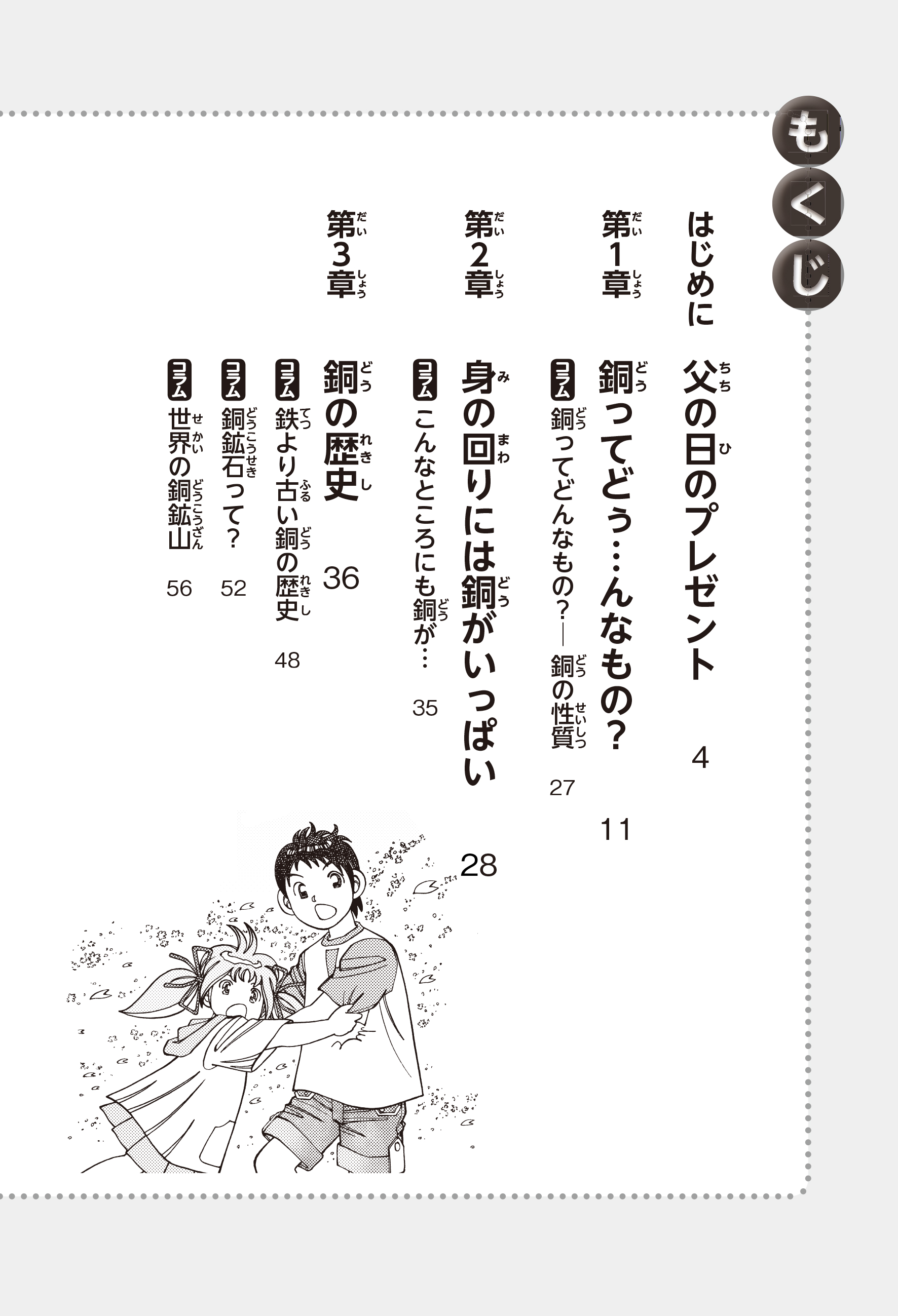 父の日のプレゼントに「銅のカップ」をプレゼントしたこういちとネネの兄妹。「冷たいビールがもっとおいしく飲めるカップ」っていうけど、どうしてなんだろう? 銅のことが知りたくなったふたりは調査にいくよ。 銅は電気を使うものにたくさん使われていて、いろいろな性質があるんだって。ずーっと昔から使われていて、そして今、進化している銅。ふたりといっしょに、銅のひみつを探りにいこう!