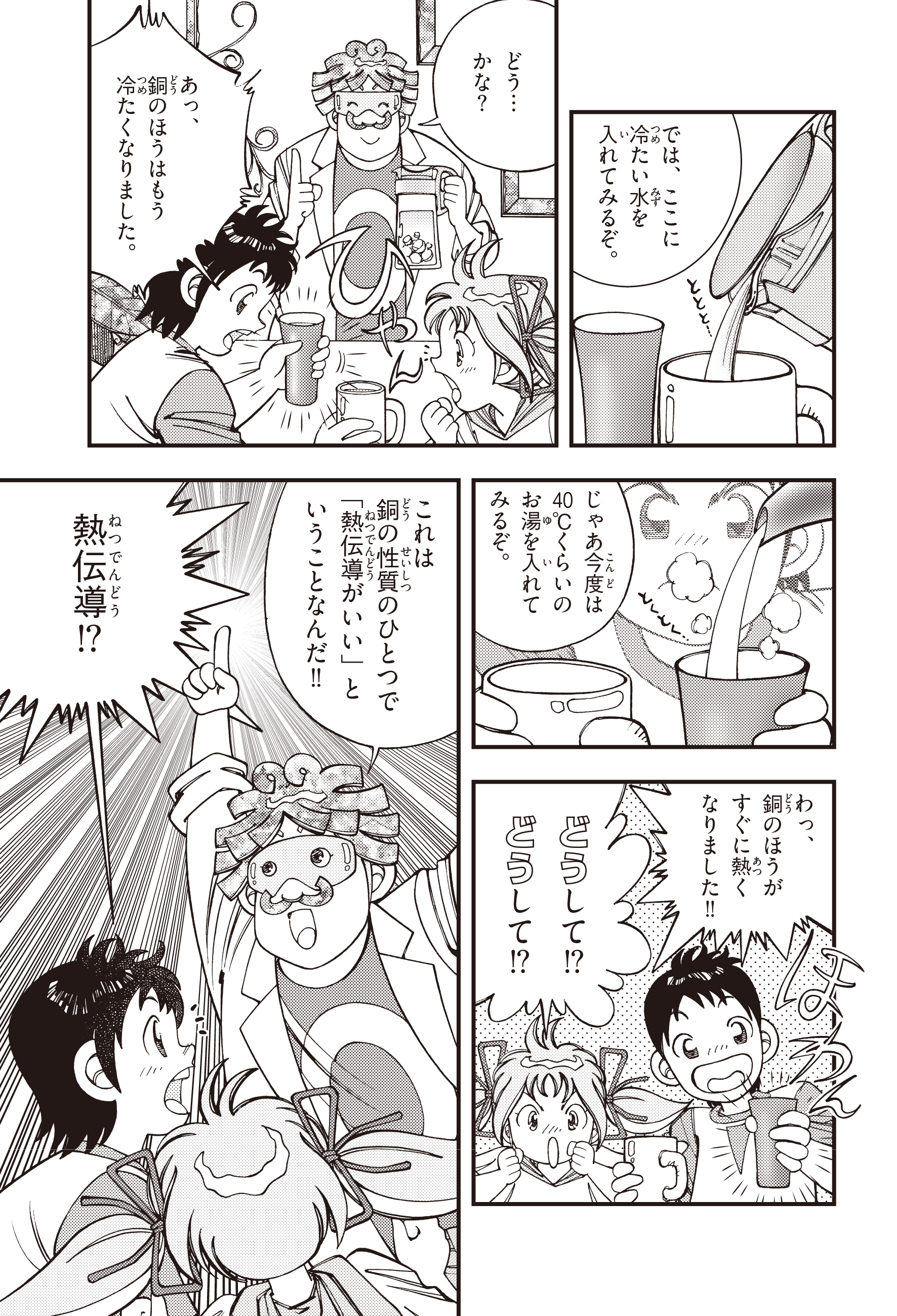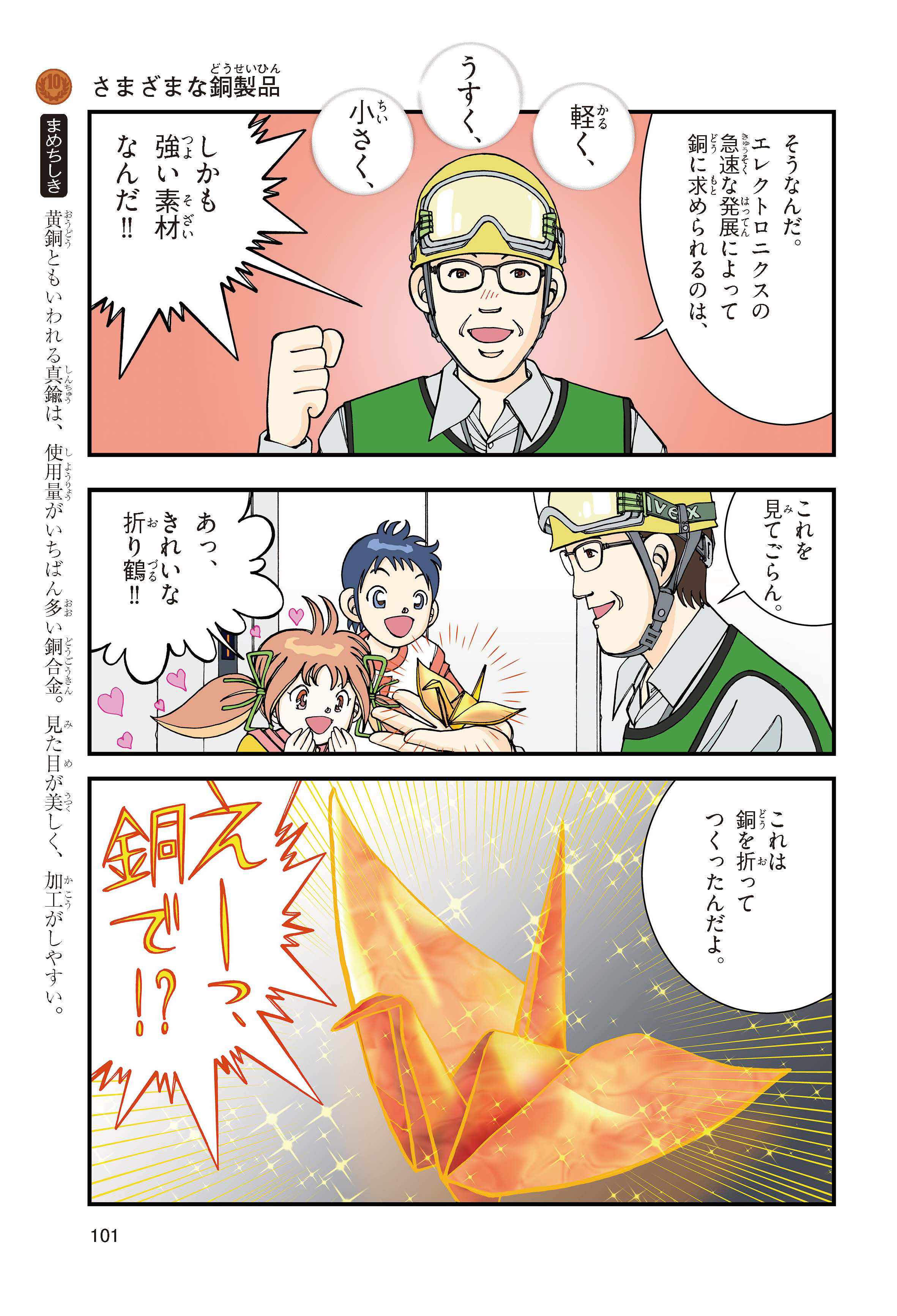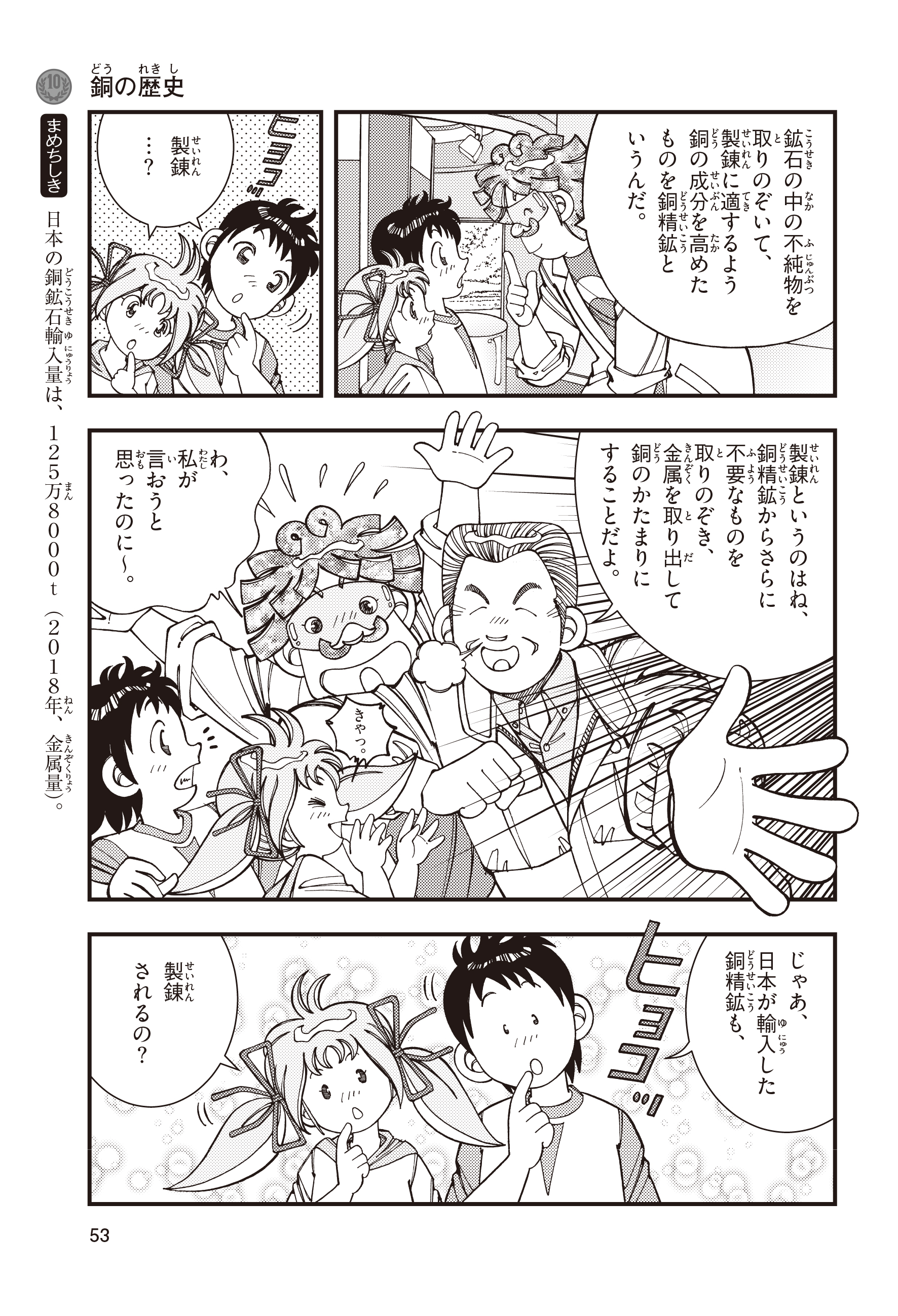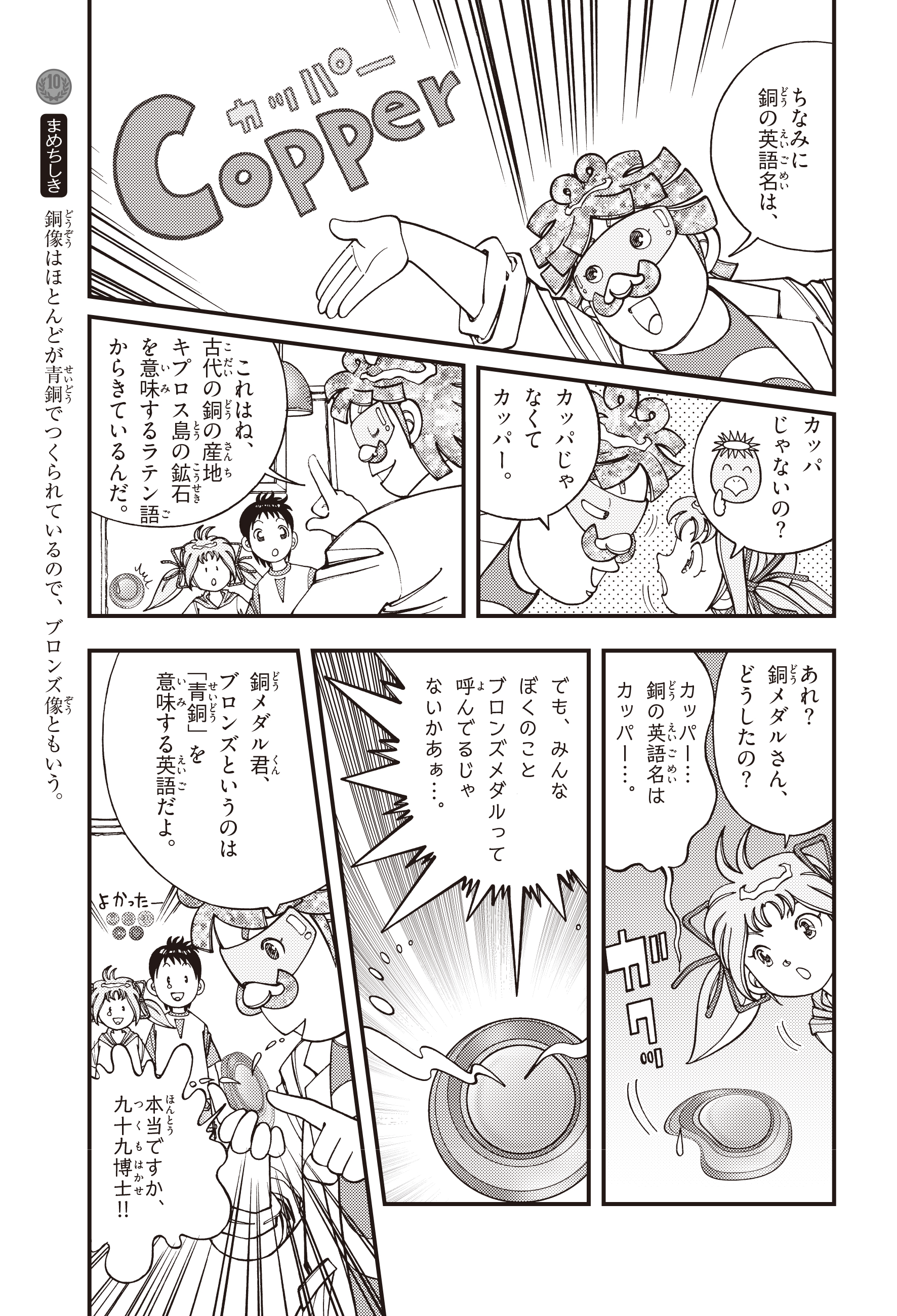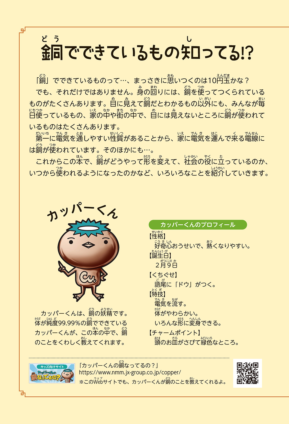 父の日のプレゼントに「銅のカップ」をプレゼントしたこういちとネネの兄妹。「冷たいビールがもっとおいしく飲めるカップ」っていうけど、どうしてなんだろう? 銅のことが知りたくなったふたりは調査にいくよ。 銅は電気を使うものにたくさん使われていて、いろいろな性質があるんだって。ずーっと昔から使われていて、そして今、進化している銅。ふたりといっしょに、銅のひみつを探りにいこう!