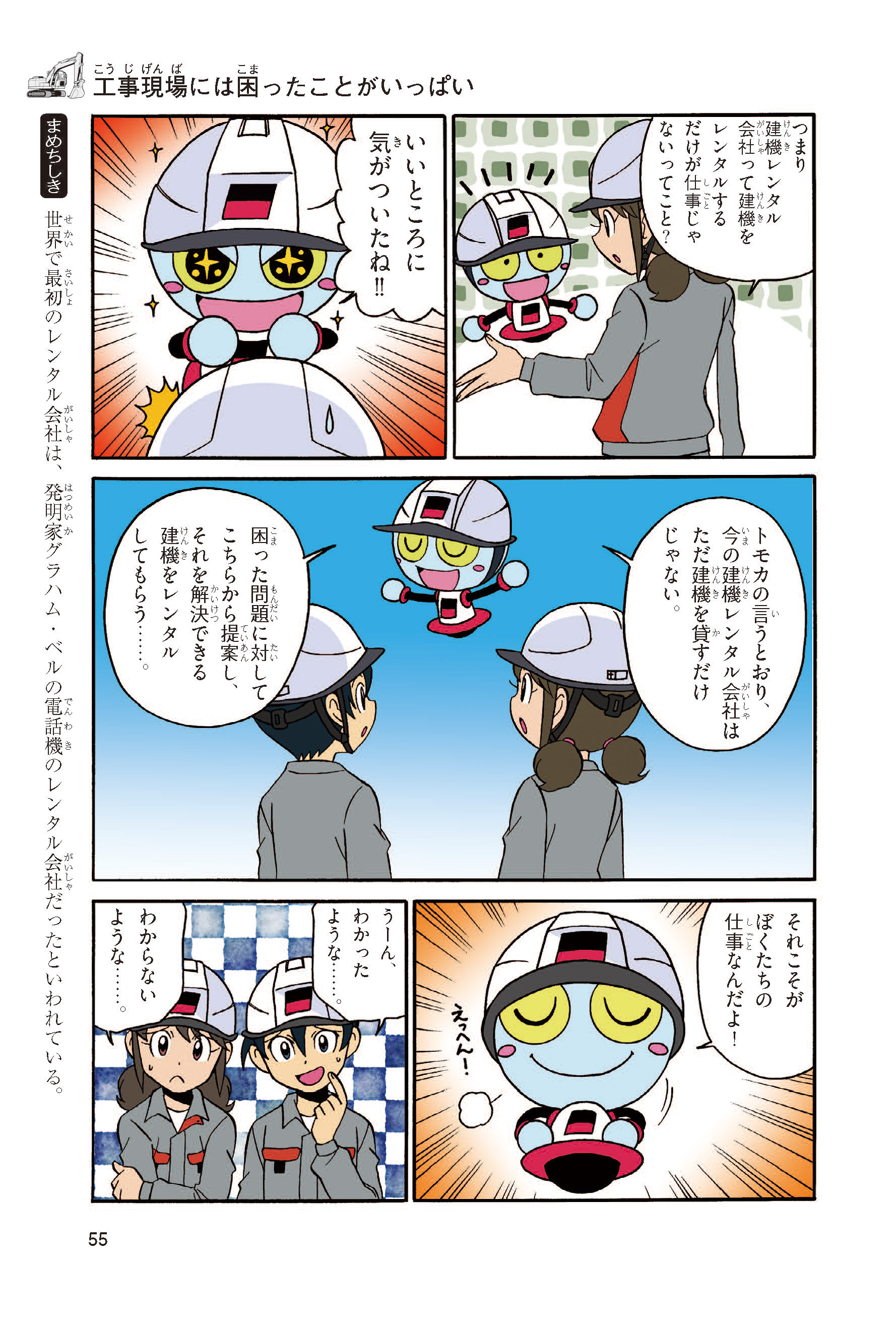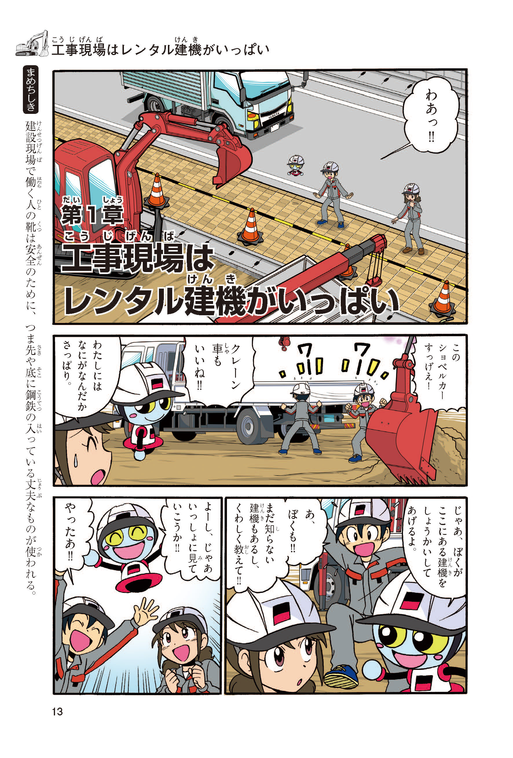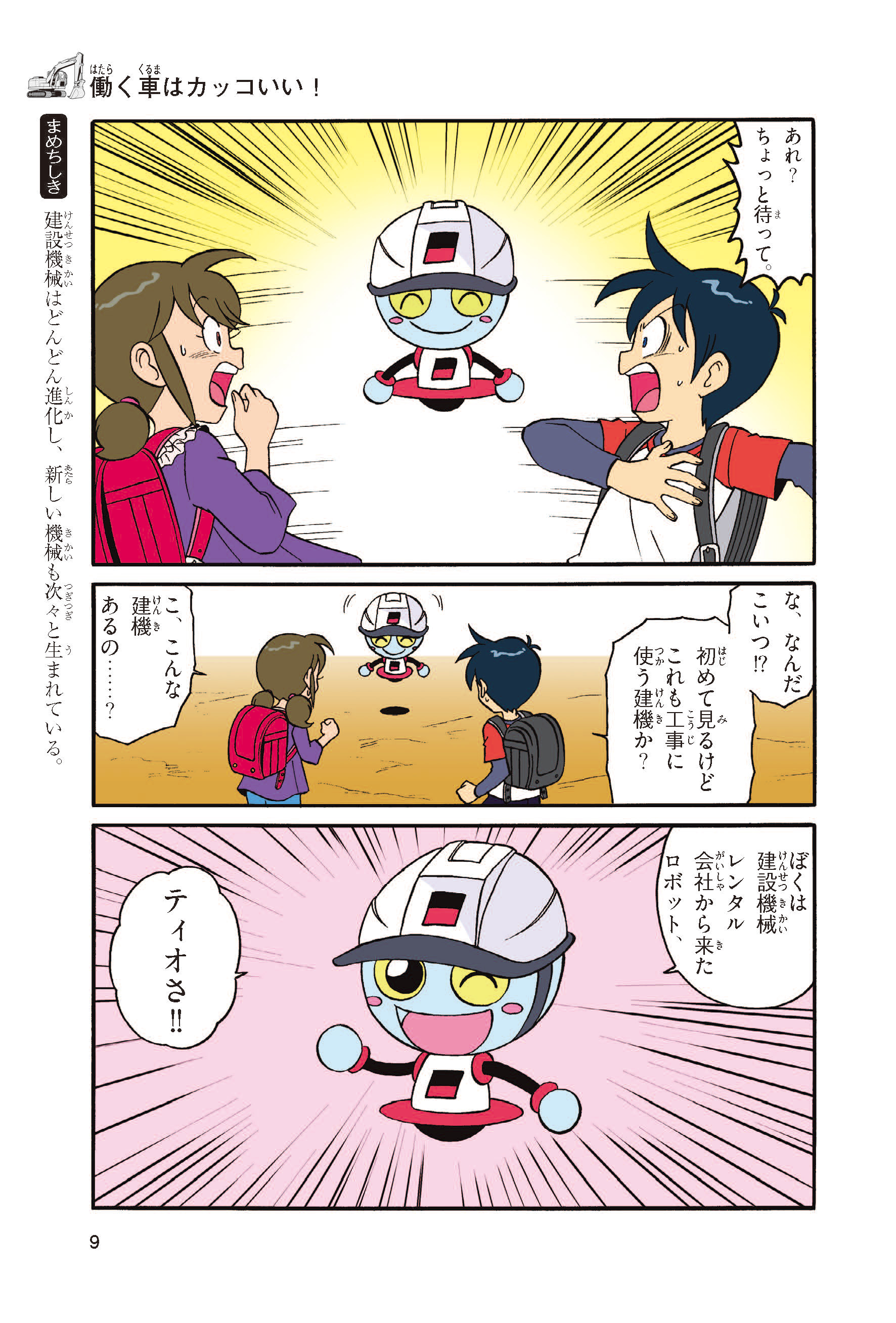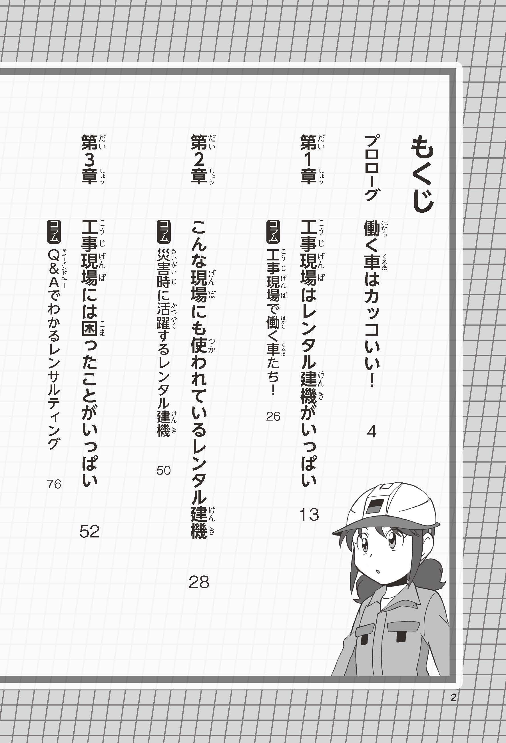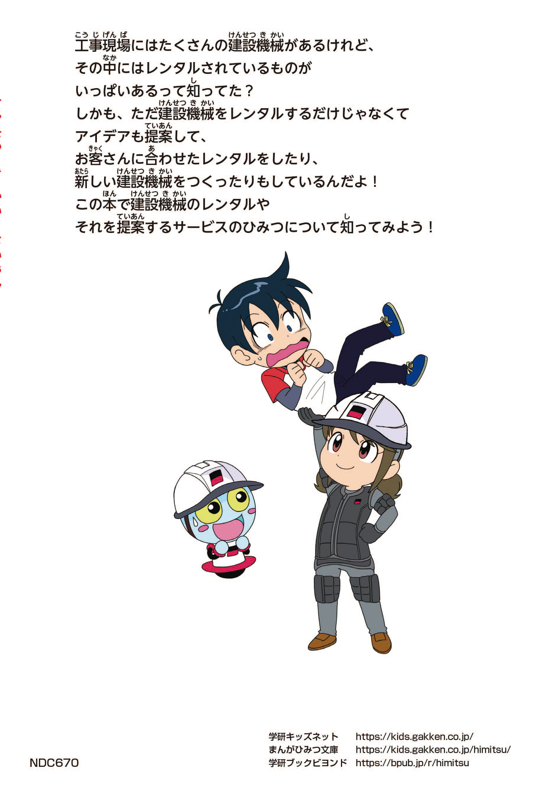 働く車が大好きな小学生のアキオ。体育館の建て替え工事がはじまって、たくさんの働く車にわくわくしていると、未来のロボット・ティオがあらわれて、実はそこにある働く車=建機(けんき)たちが貸し出されているもの(レンタル)だと教えてくれるよ。しかも、ただ貸し出しするだけじゃなくて、お客さんに合わせたレンタルをしたり、新しい建設機械をつくったりもしているんだって! この本でひみつについて知ってみよう!