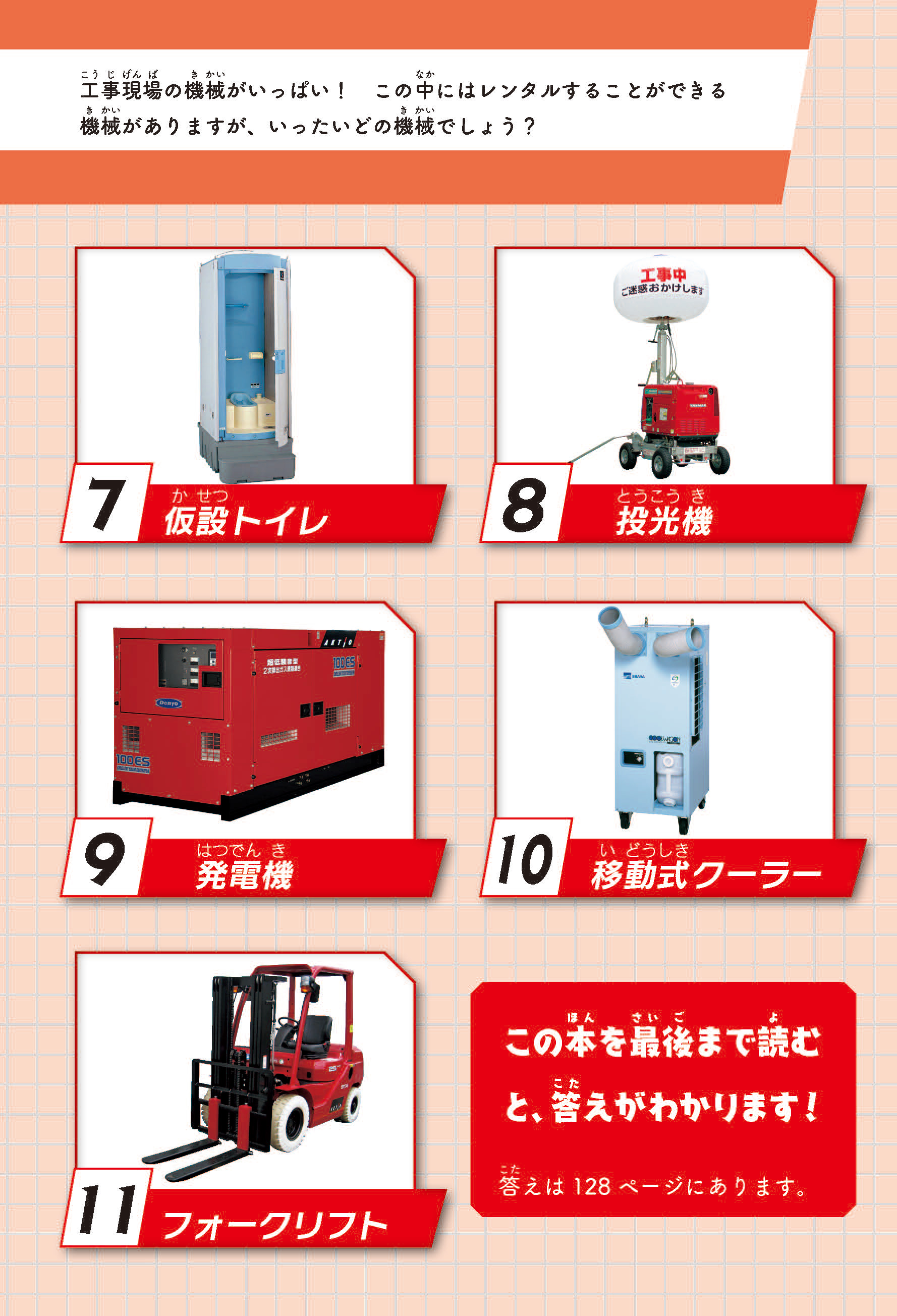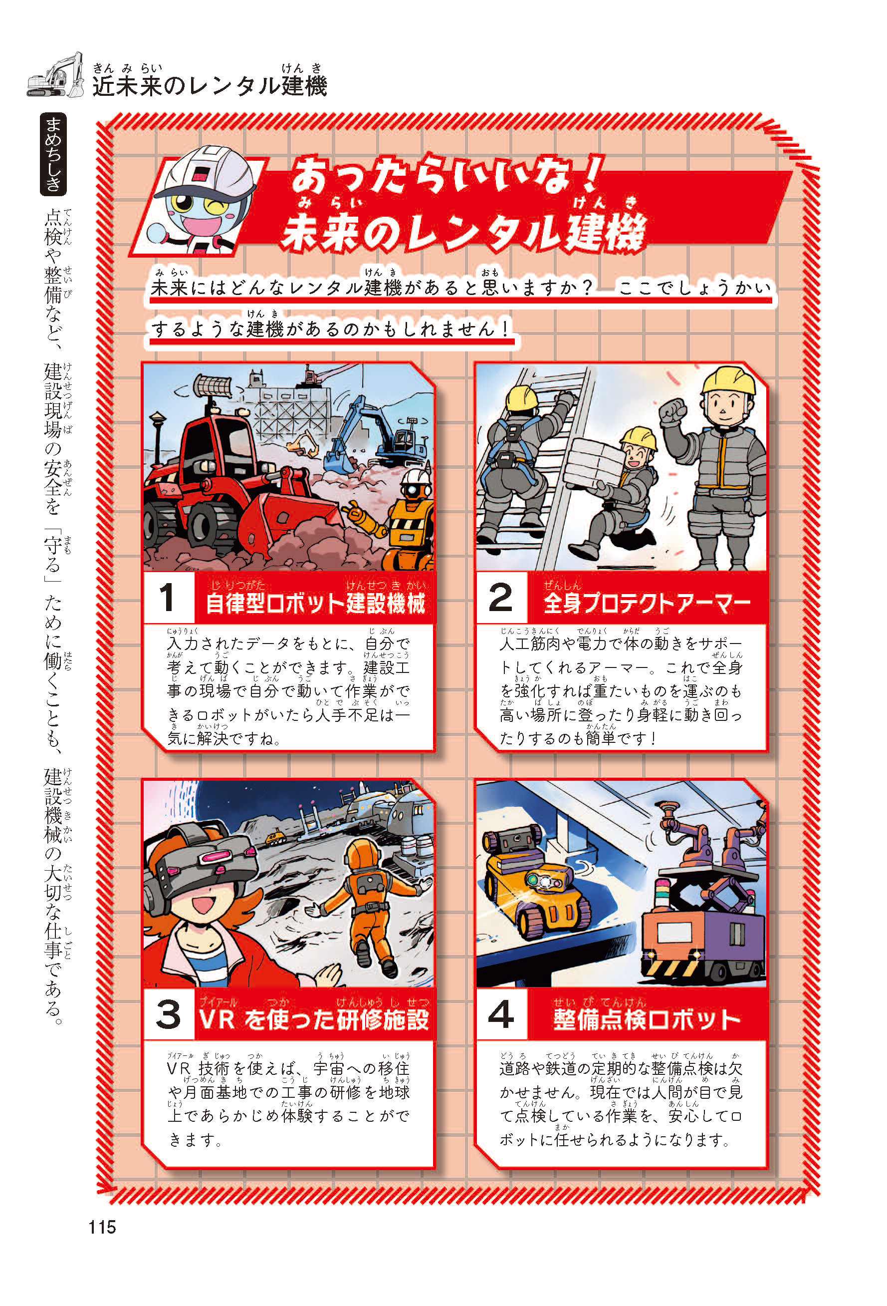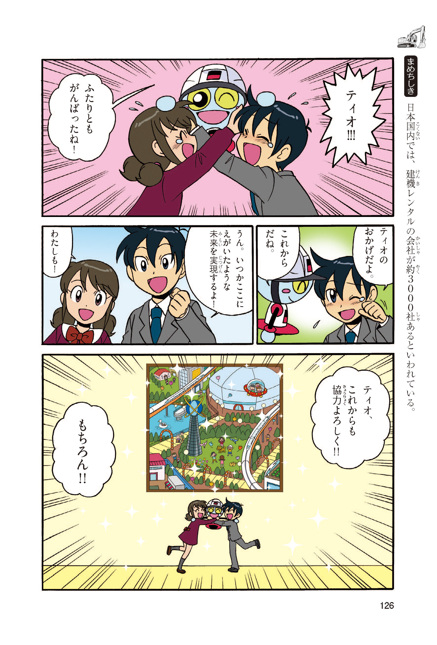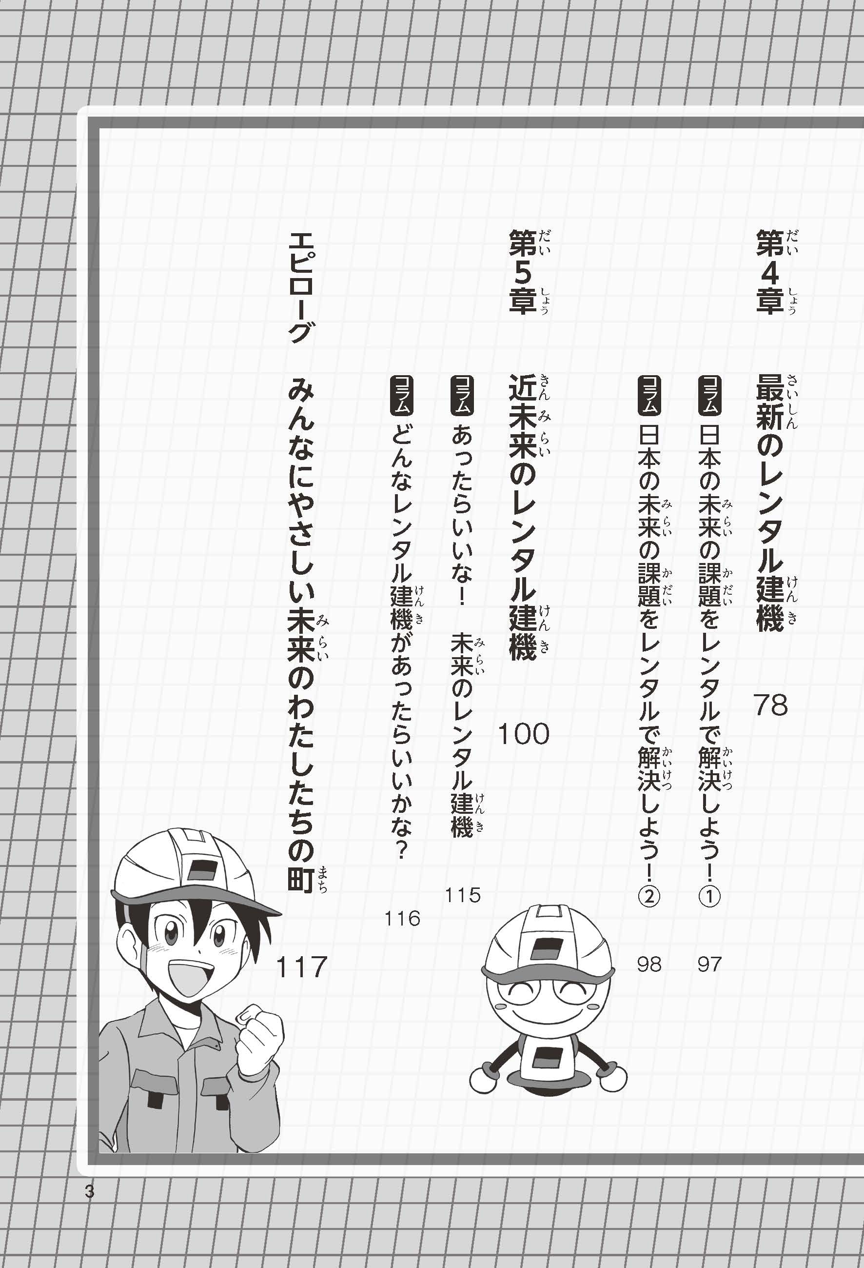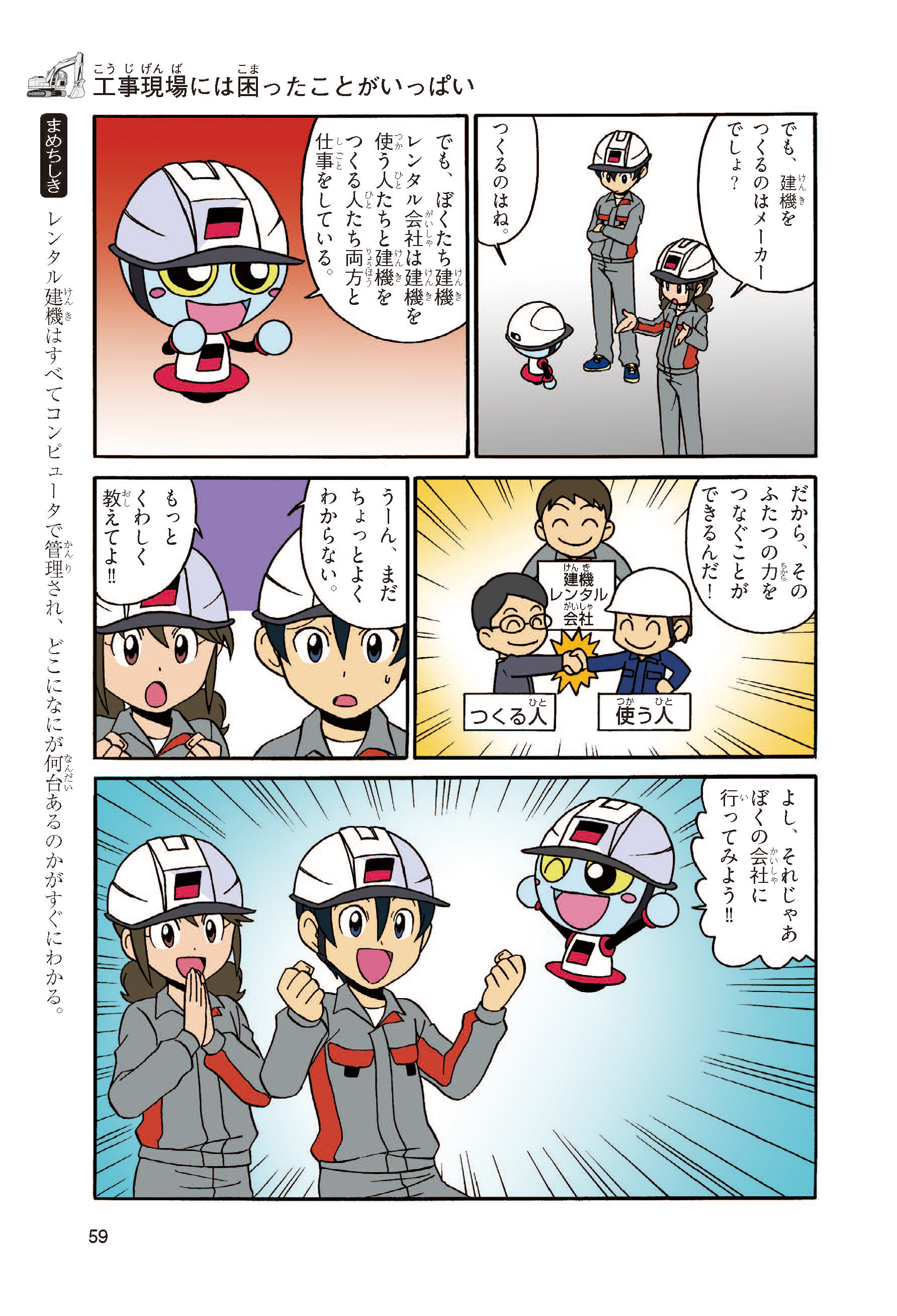 働く車が大好きな小学生のアキオ。体育館の建て替え工事がはじまって、たくさんの働く車にわくわくしていると、未来のロボット・ティオがあらわれて、実はそこにある働く車=建機(けんき)たちが貸し出されているもの(レンタル)だと教えてくれるよ。しかも、ただ貸し出しするだけじゃなくて、お客さんに合わせたレンタルをしたり、新しい建設機械をつくったりもしているんだって! この本でひみつについて知ってみよう!