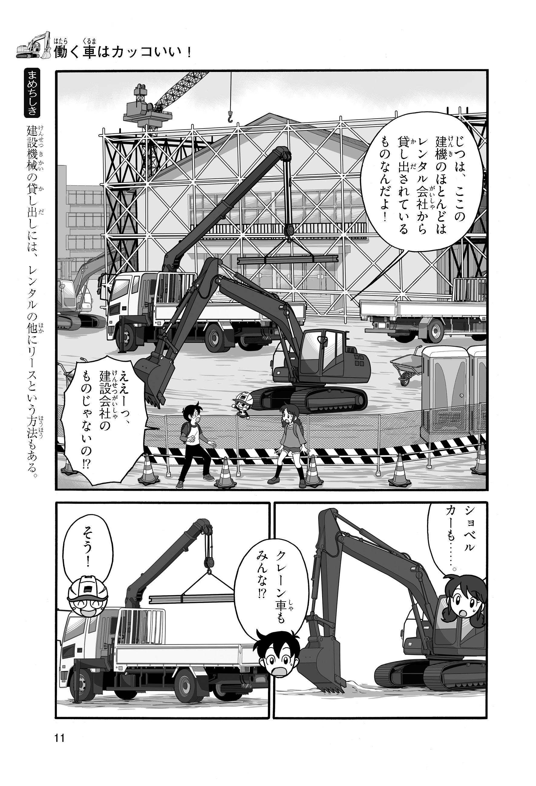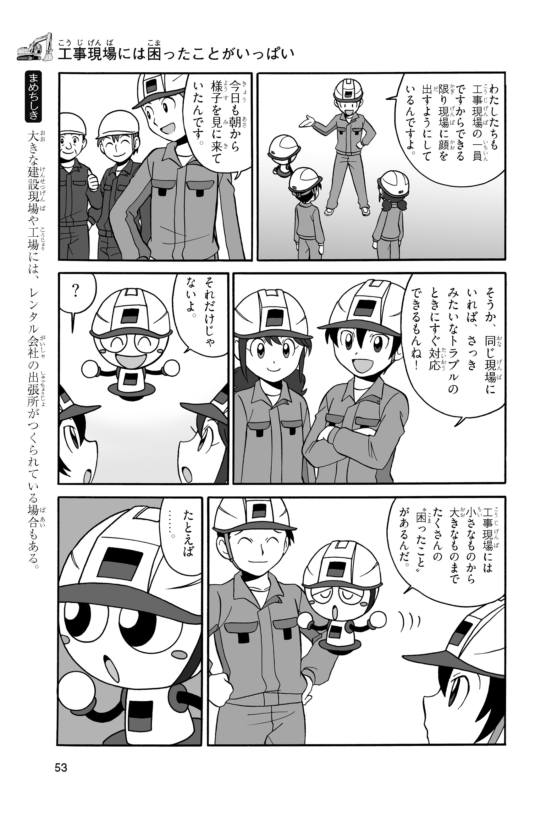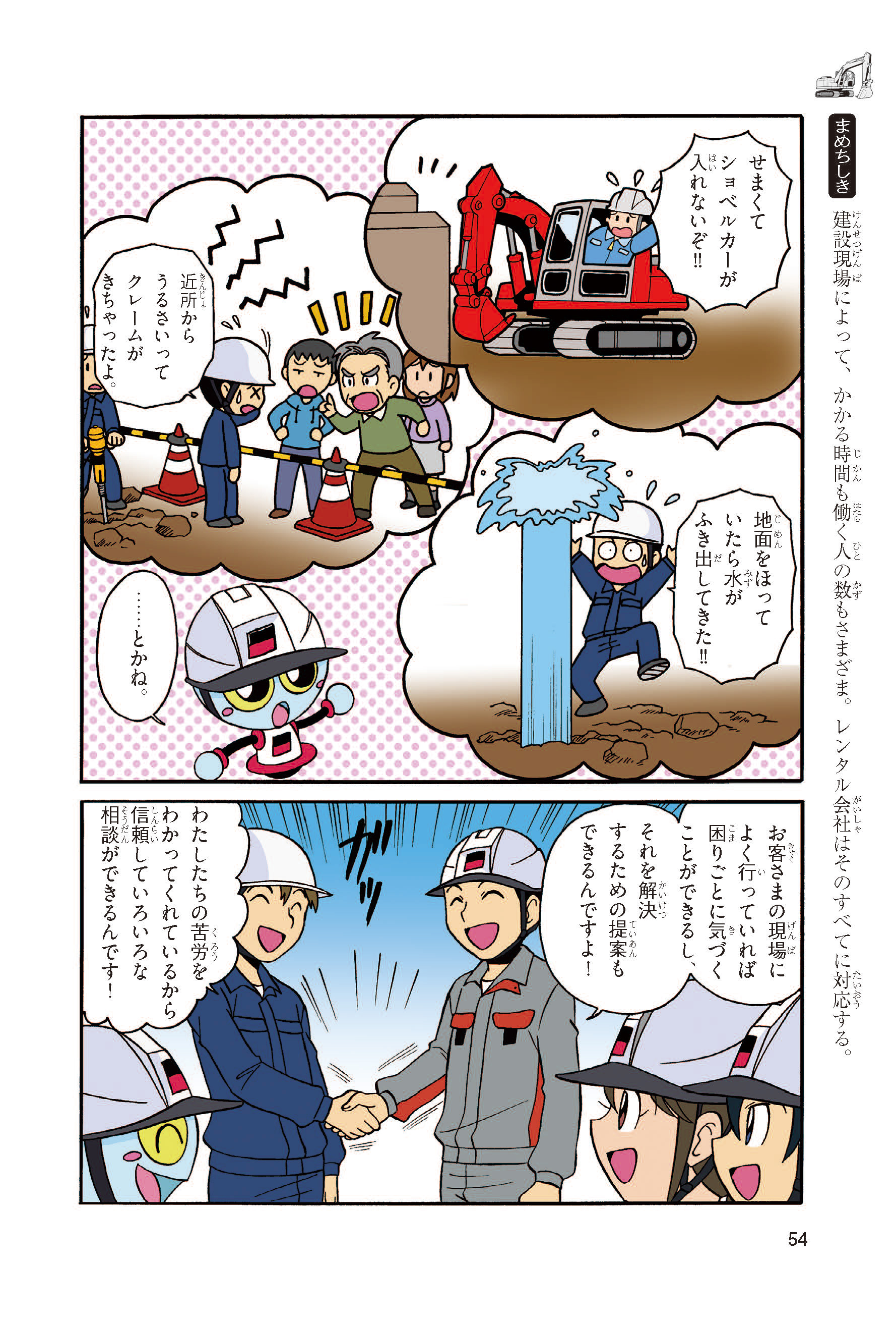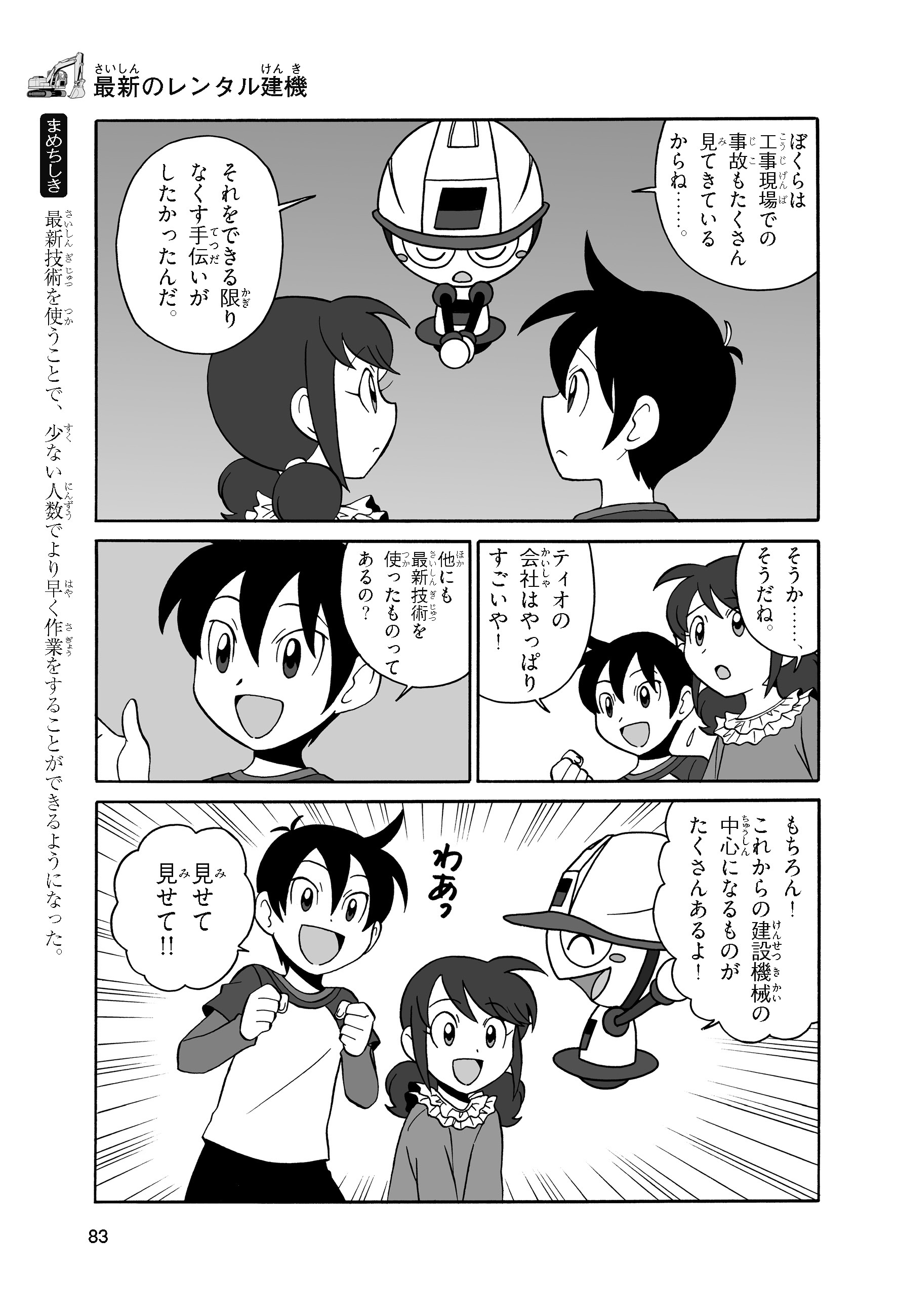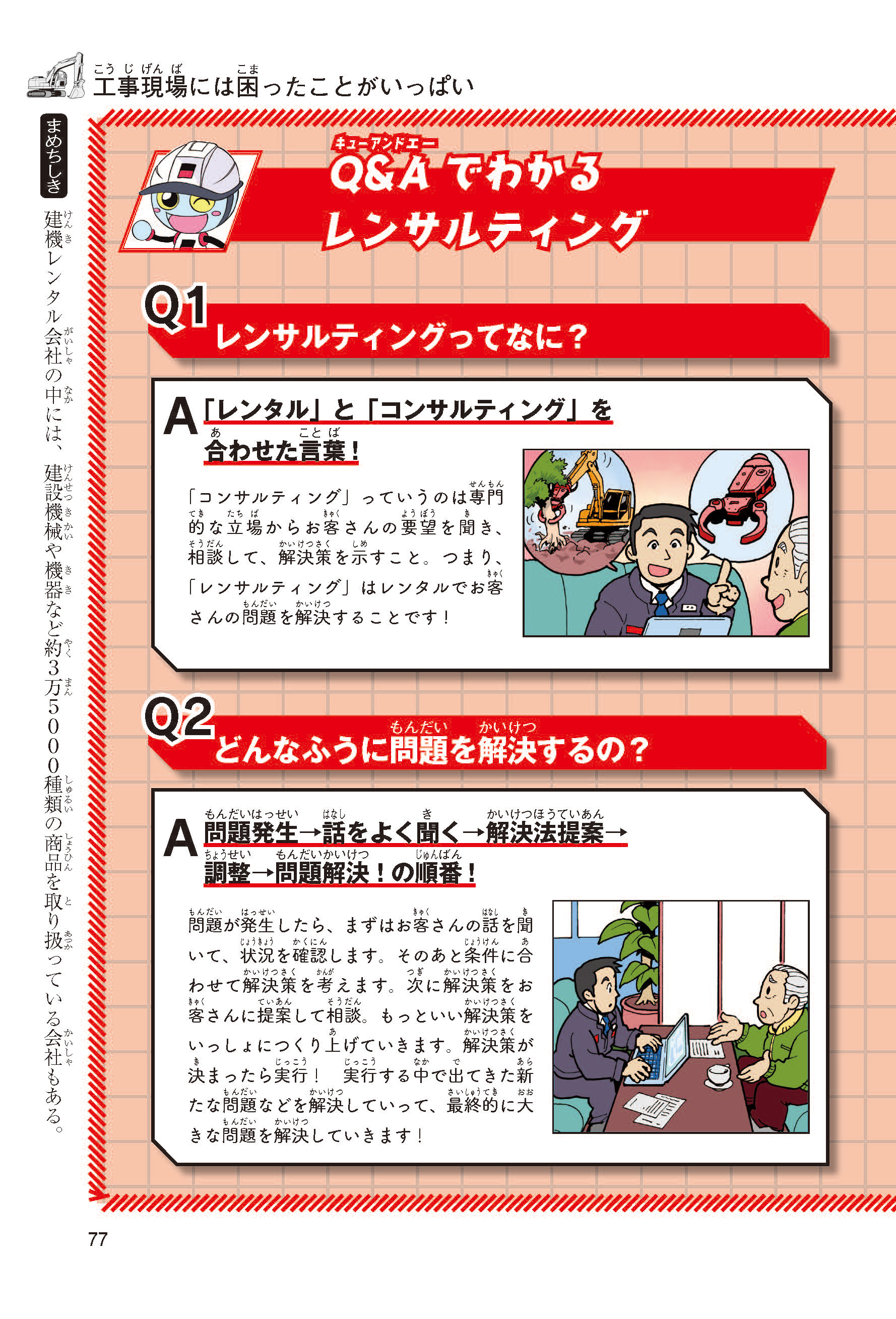 働く車が大好きな小学生のアキオ。体育館の建て替え工事がはじまって、たくさんの働く車にわくわくしていると、未来のロボット・ティオがあらわれて、実はそこにある働く車=建機(けんき)たちが貸し出されているもの(レンタル)だと教えてくれるよ。しかも、ただ貸し出しするだけじゃなくて、お客さんに合わせたレンタルをしたり、新しい建設機械をつくったりもしているんだって! この本でひみつについて知ってみよう!