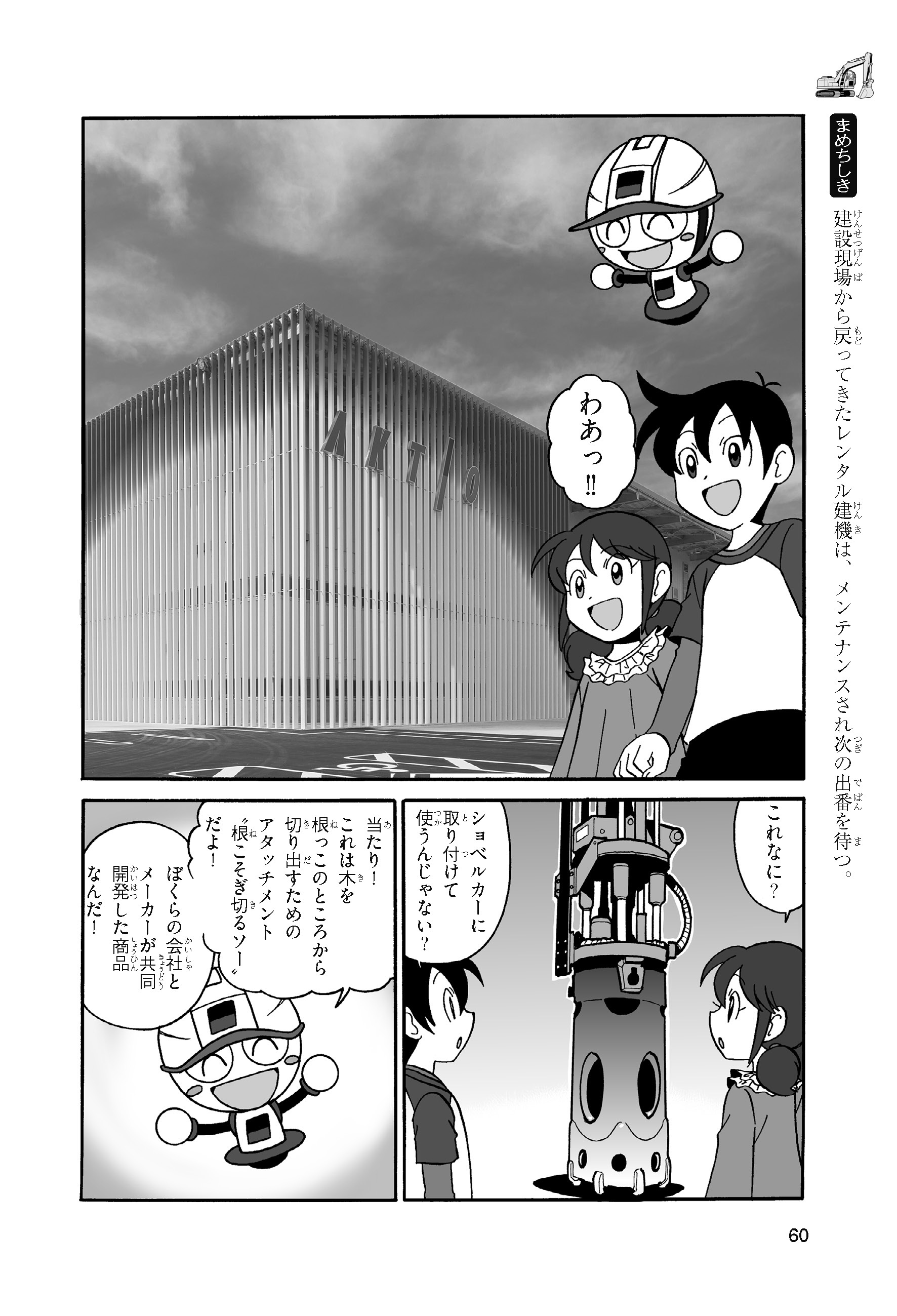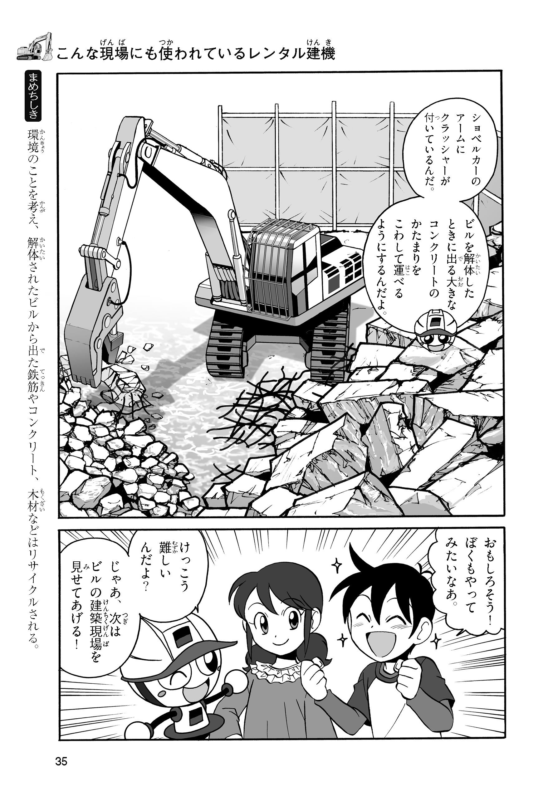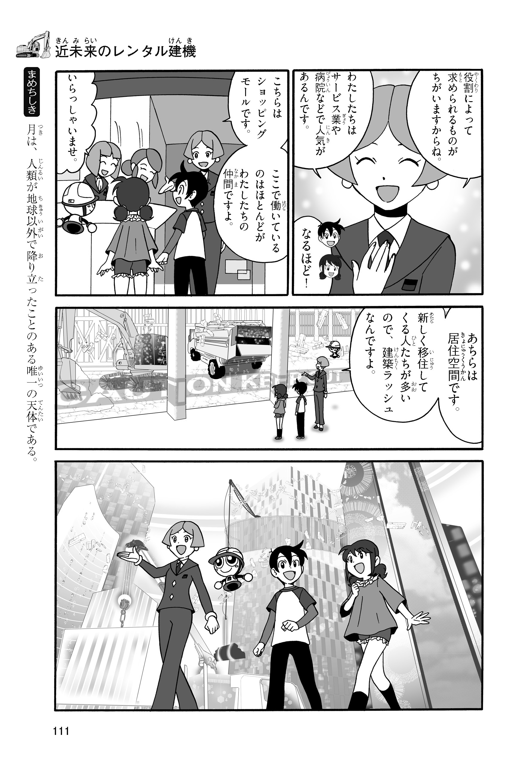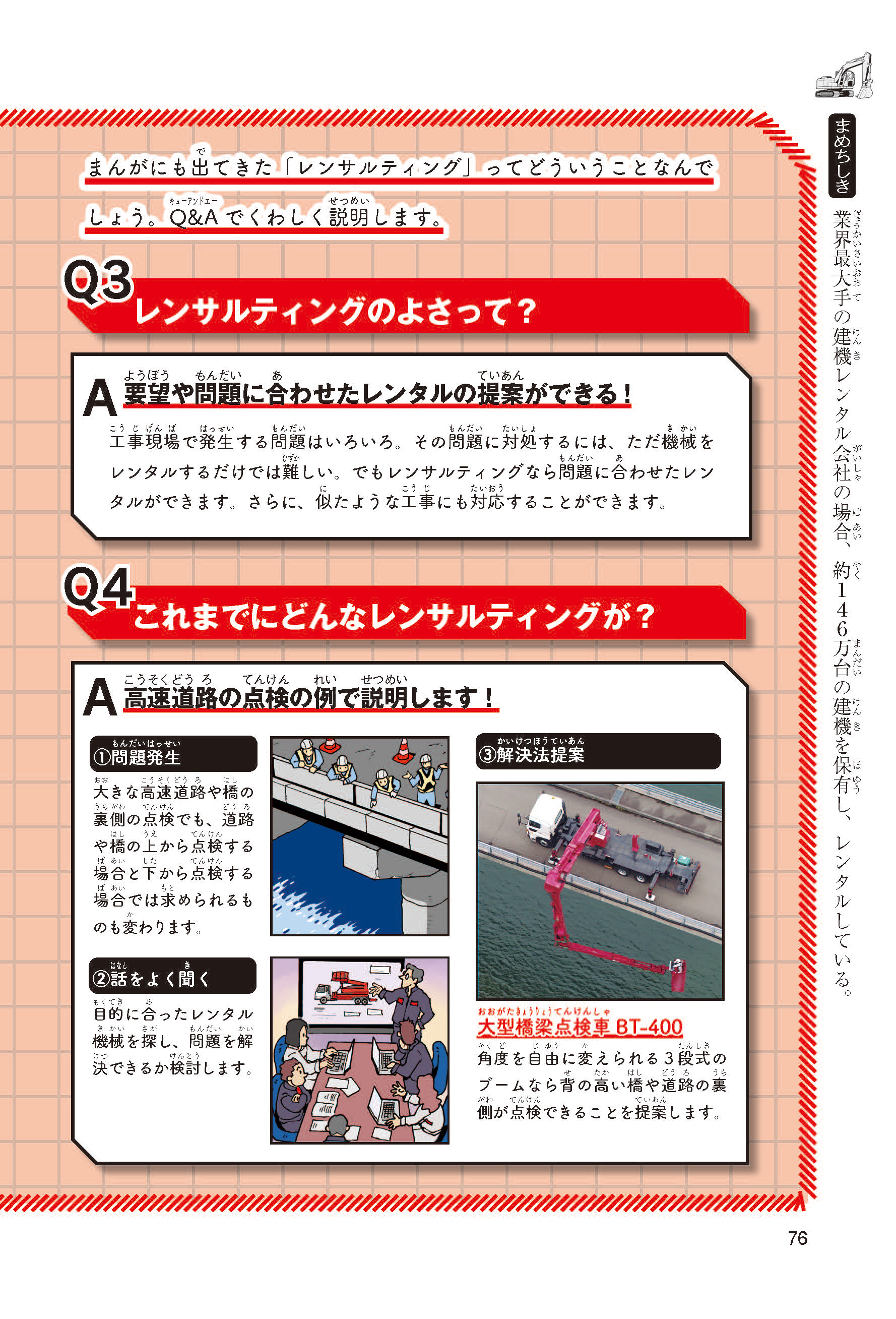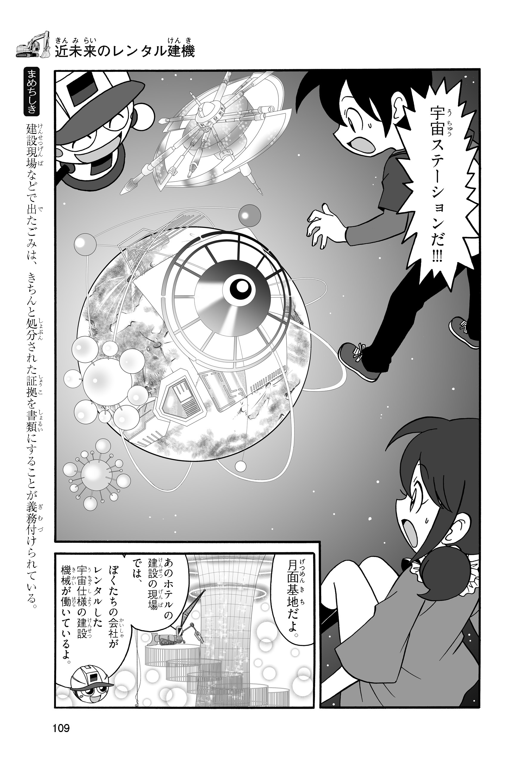 働く車が大好きな小学生のアキオ。体育館の建て替え工事がはじまって、たくさんの働く車にわくわくしていると、未来のロボット・ティオがあらわれて、実はそこにある働く車=建機(けんき)たちが貸し出されているもの(レンタル)だと教えてくれるよ。しかも、ただ貸し出しするだけじゃなくて、お客さんに合わせたレンタルをしたり、新しい建設機械をつくったりもしているんだって! この本でひみつについて知ってみよう!