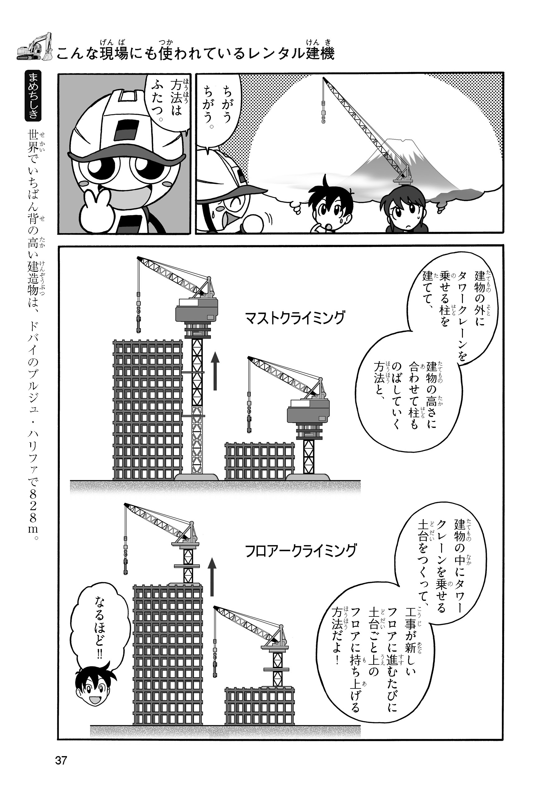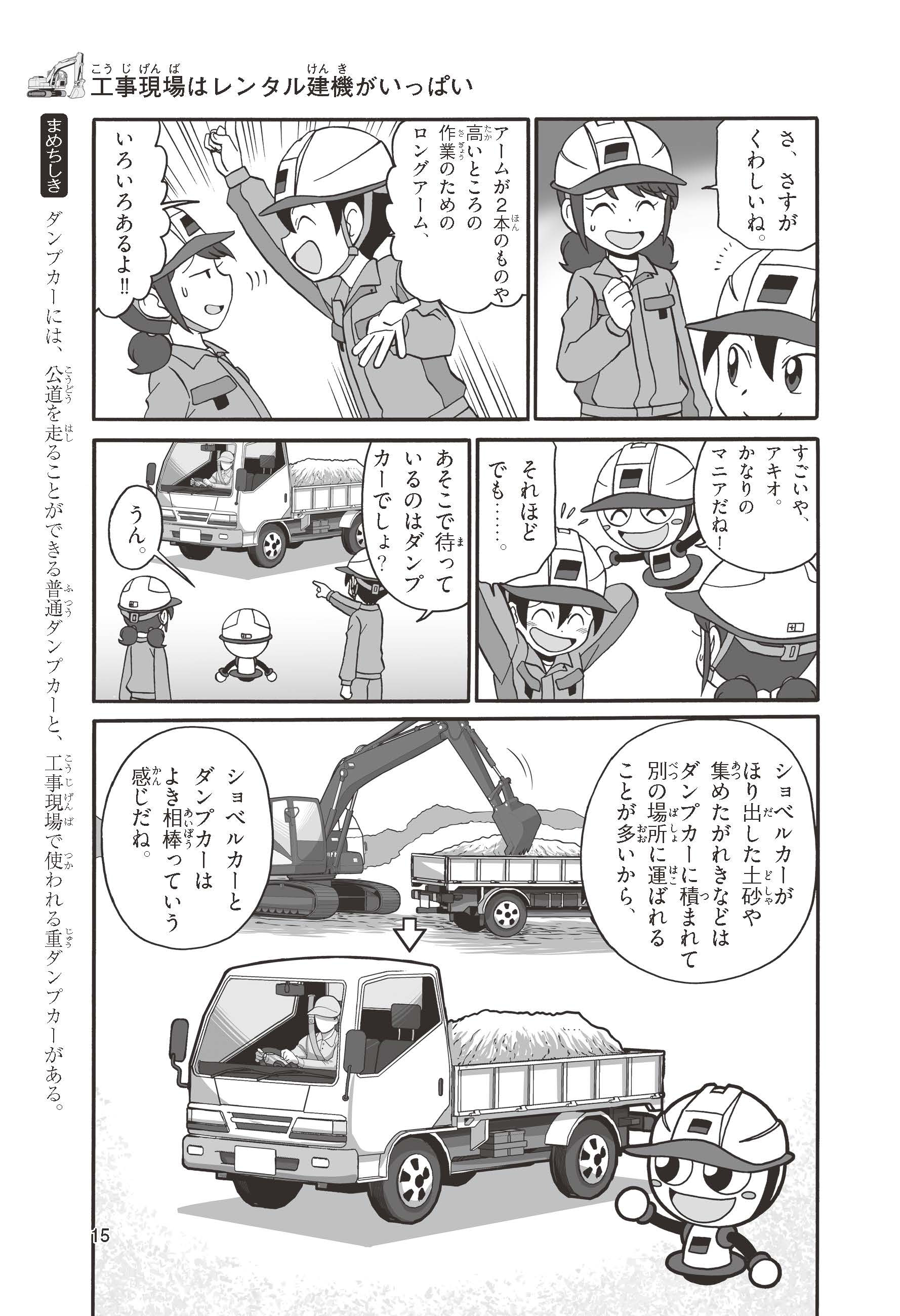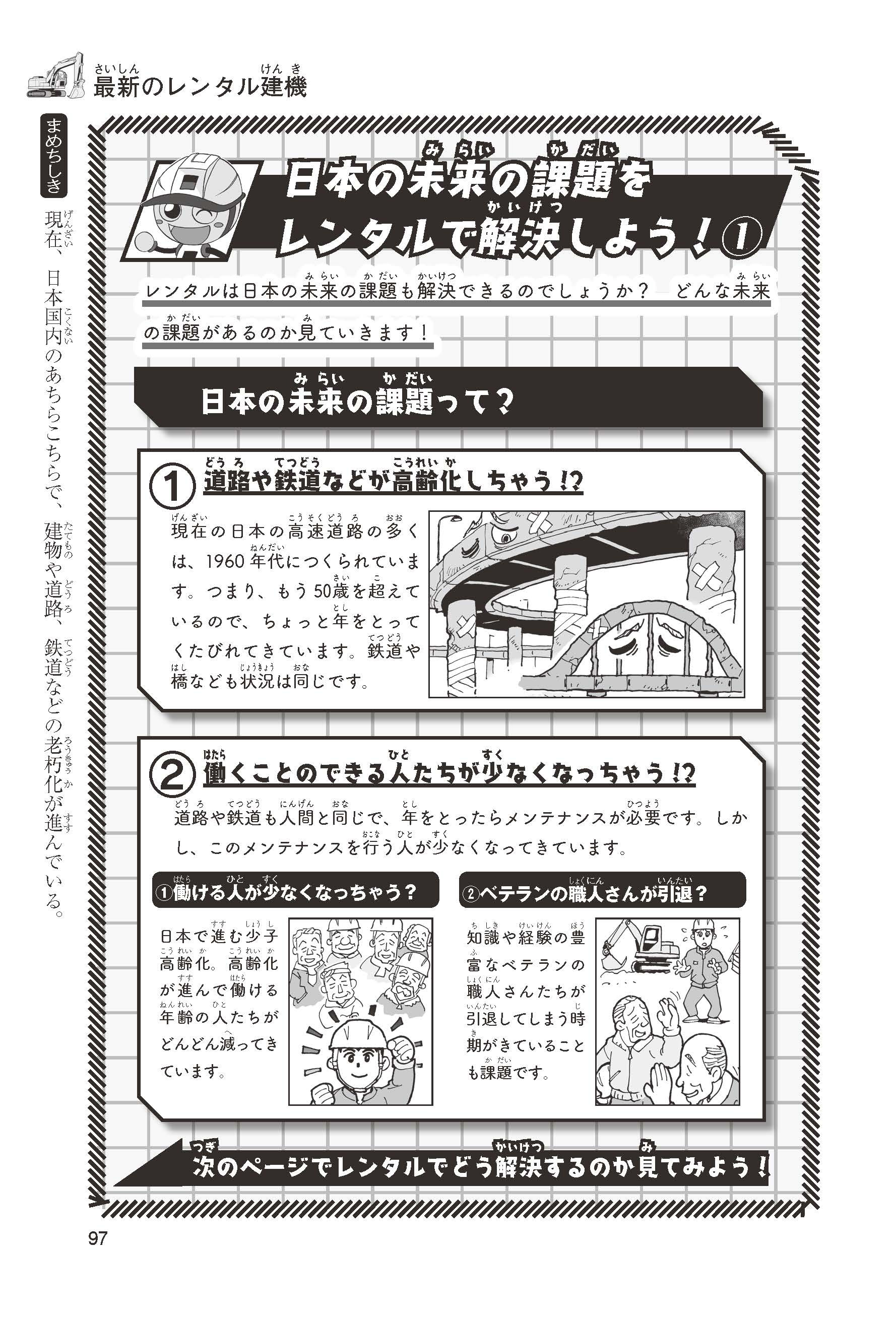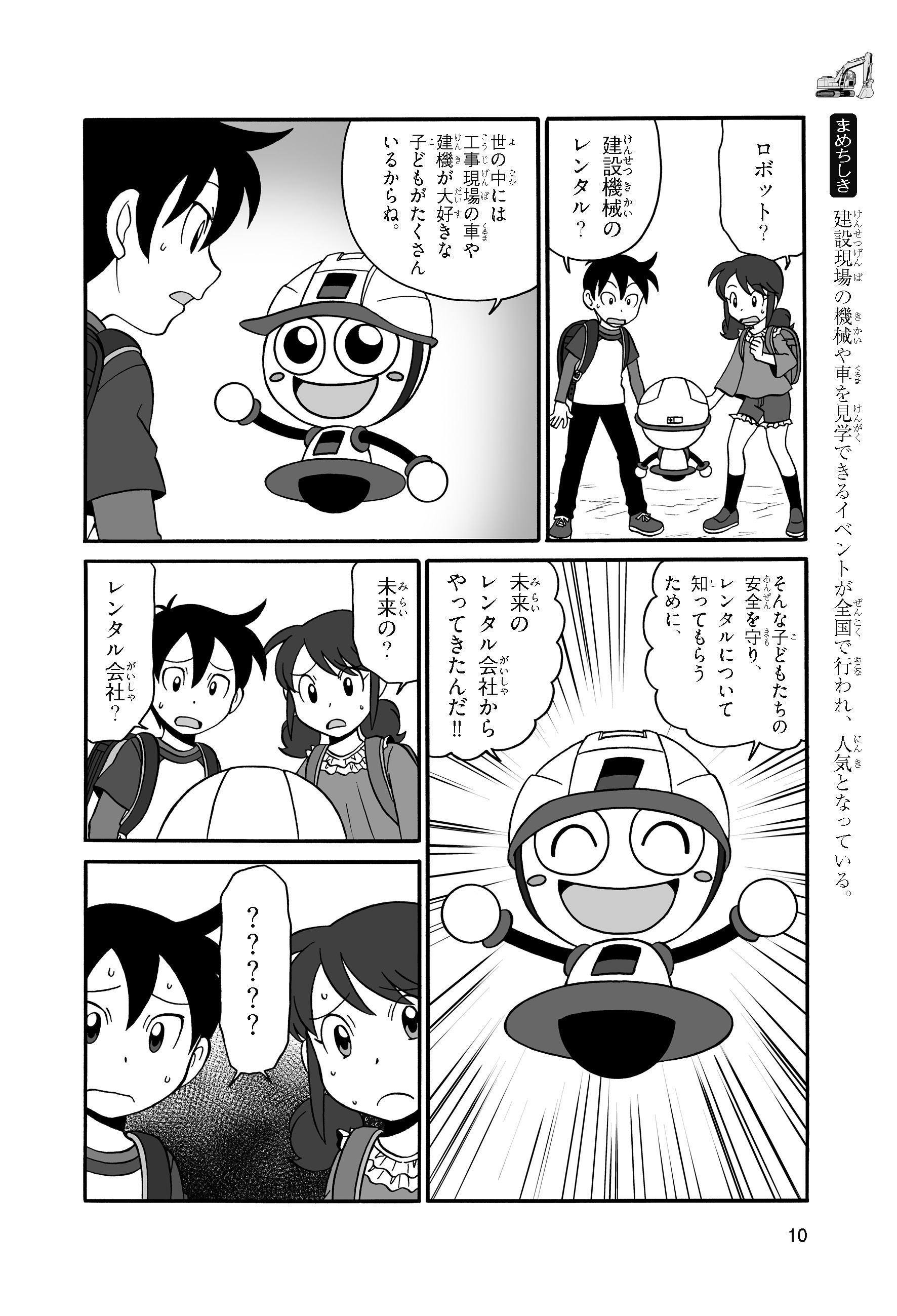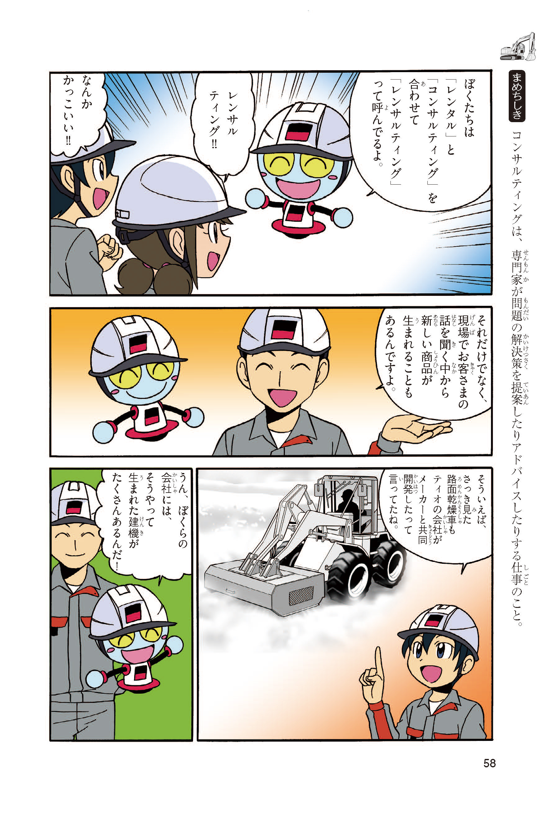 働く車が大好きな小学生のアキオ。体育館の建て替え工事がはじまって、たくさんの働く車にわくわくしていると、未来のロボット・ティオがあらわれて、実はそこにある働く車=建機(けんき)たちが貸し出されているもの(レンタル)だと教えてくれるよ。しかも、ただ貸し出しするだけじゃなくて、お客さんに合わせたレンタルをしたり、新しい建設機械をつくったりもしているんだって! この本でひみつについて知ってみよう!
