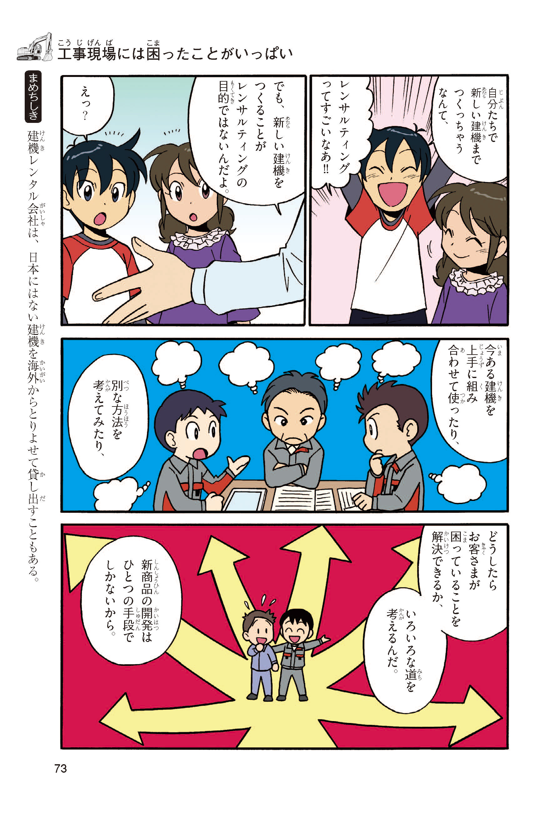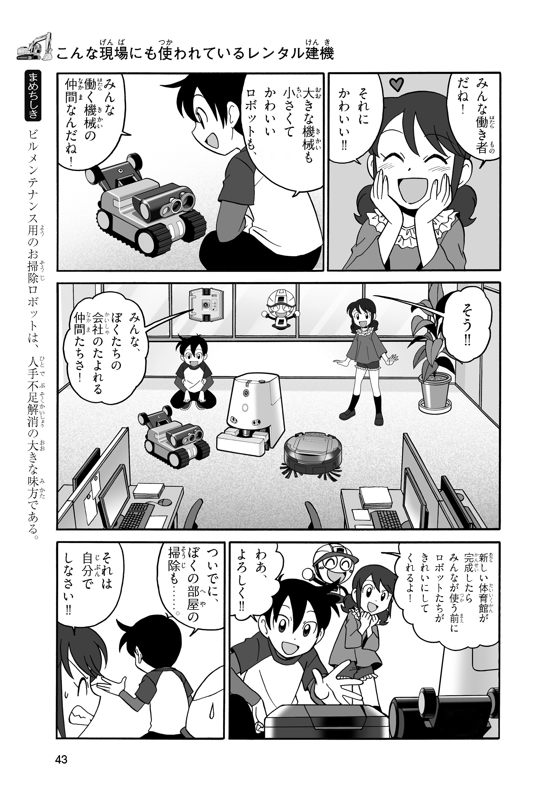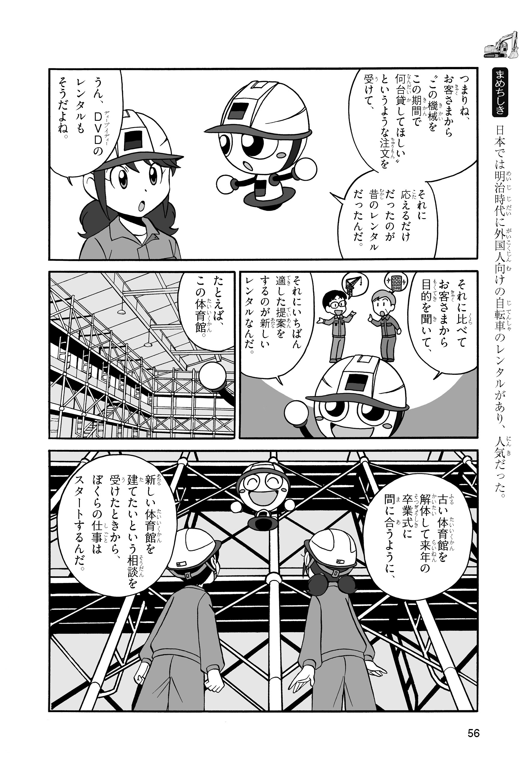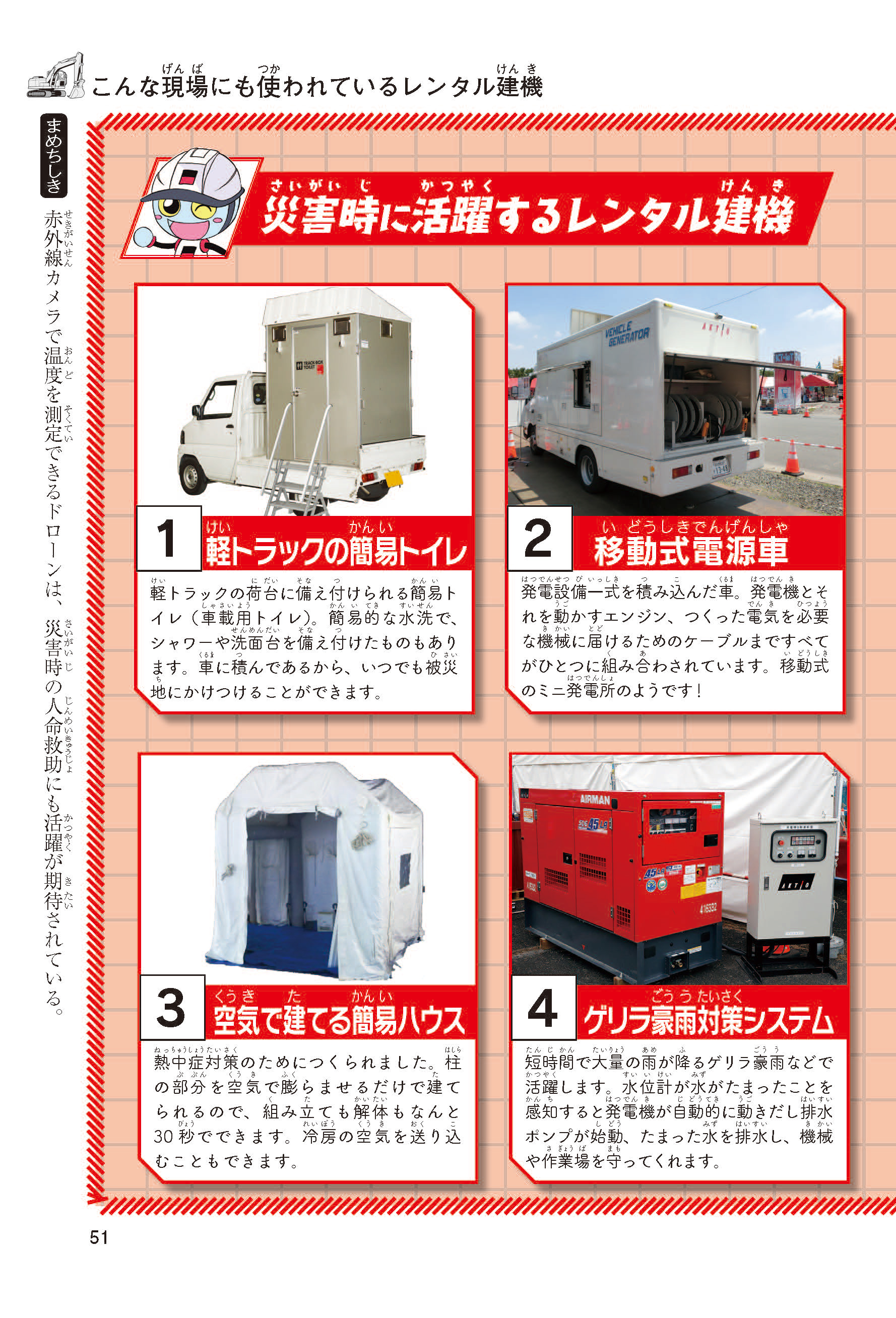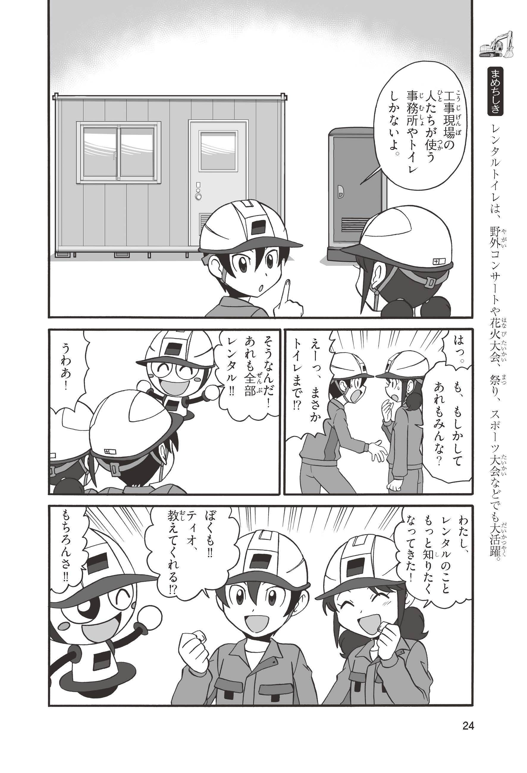 働く車が大好きな小学生のアキオ。体育館の建て替え工事がはじまって、たくさんの働く車にわくわくしていると、未来のロボット・ティオがあらわれて、実はそこにある働く車=建機(けんき)たちが貸し出されているもの(レンタル)だと教えてくれるよ。しかも、ただ貸し出しするだけじゃなくて、お客さんに合わせたレンタルをしたり、新しい建設機械をつくったりもしているんだって! この本でひみつについて知ってみよう!