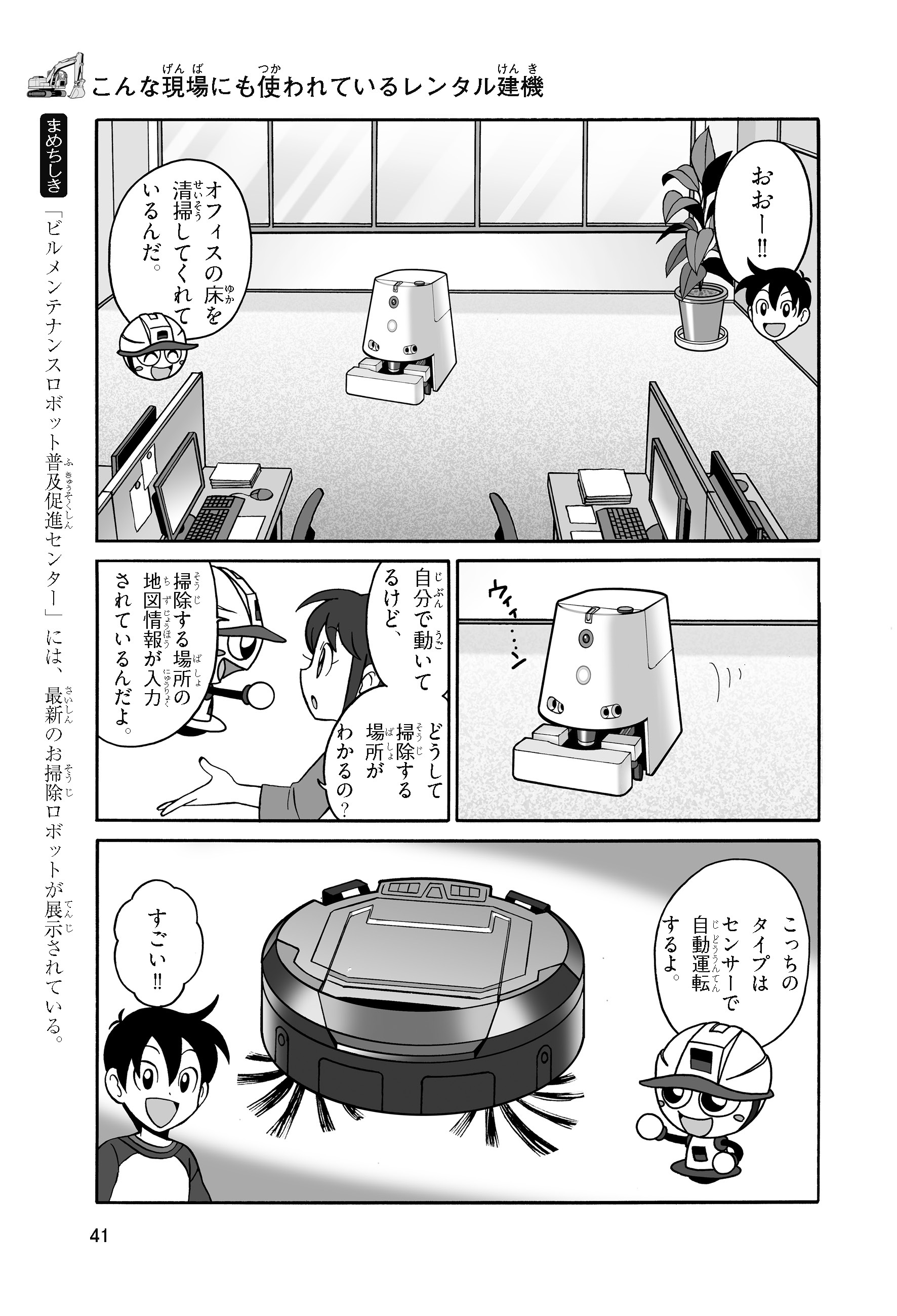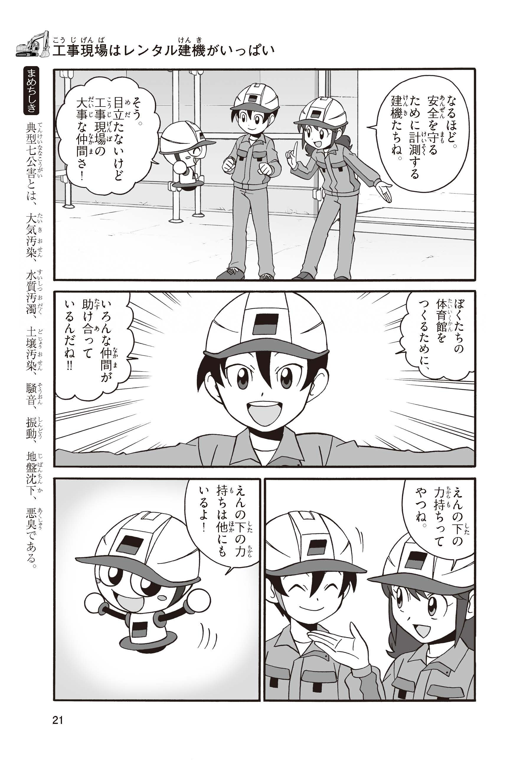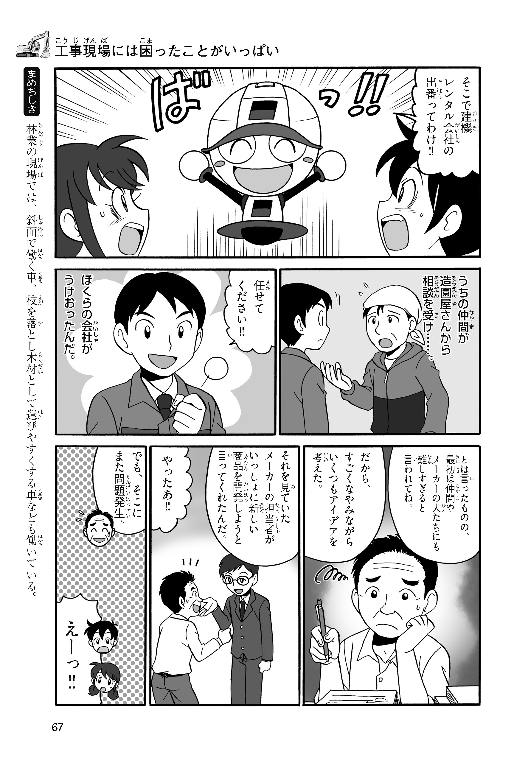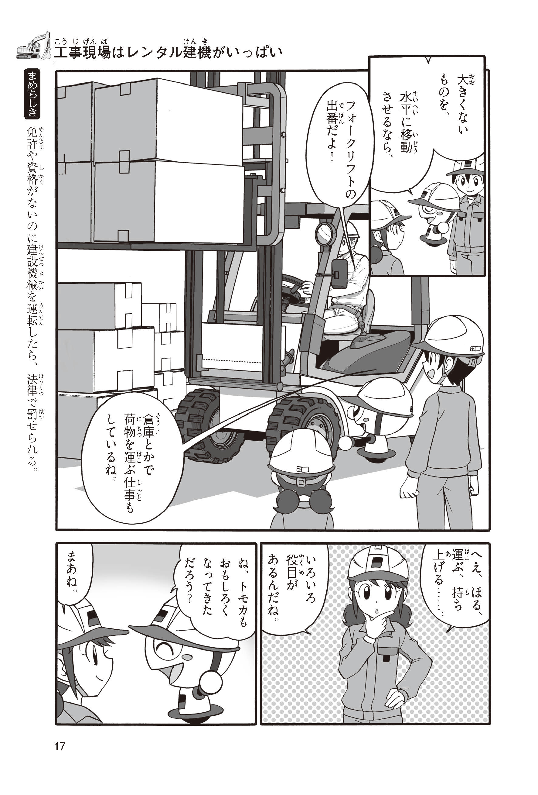 働く車が大好きな小学生のアキオ。体育館の建て替え工事がはじまって、たくさんの働く車にわくわくしていると、未来のロボット・ティオがあらわれて、実はそこにある働く車=建機(けんき)たちが貸し出されているもの(レンタル)だと教えてくれるよ。しかも、ただ貸し出しするだけじゃなくて、お客さんに合わせたレンタルをしたり、新しい建設機械をつくったりもしているんだって! この本でひみつについて知ってみよう!