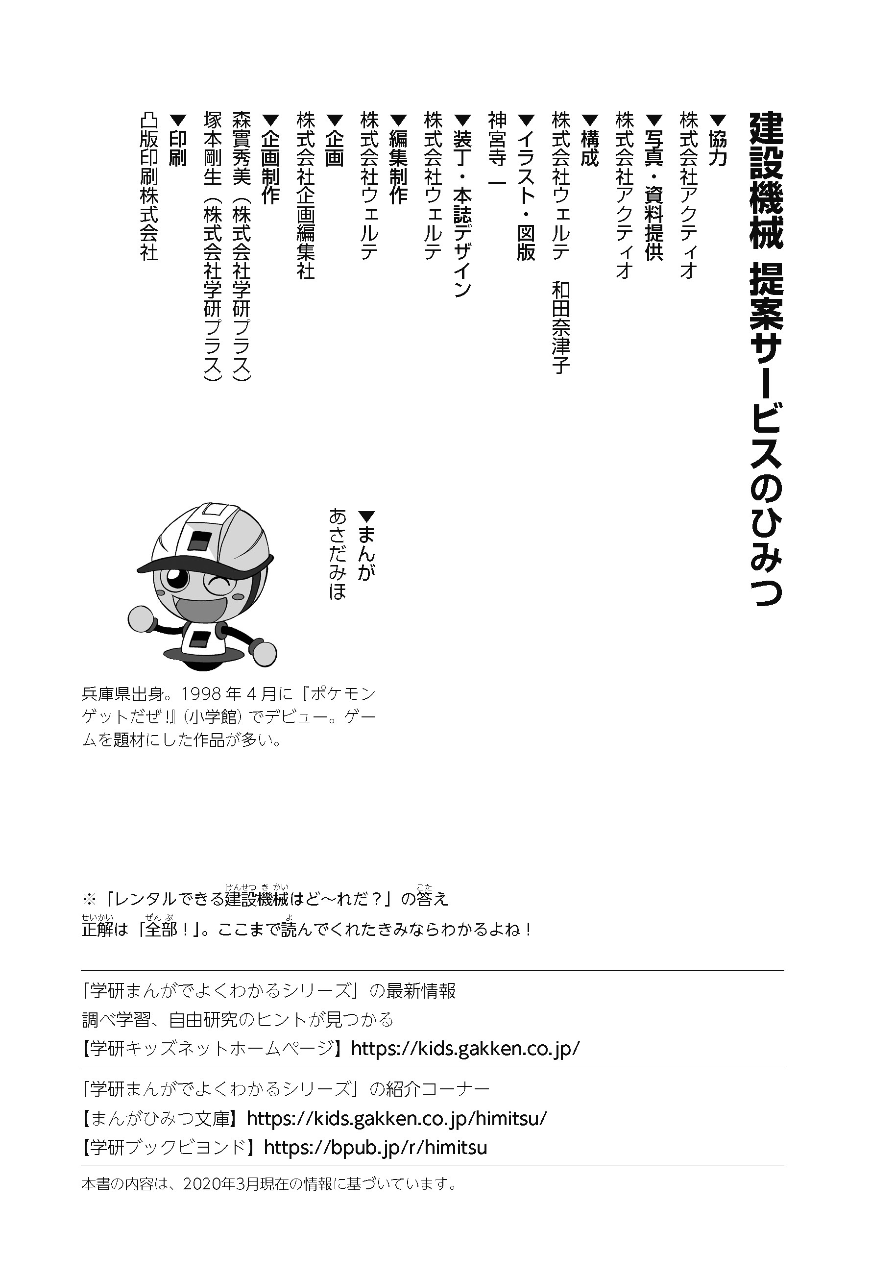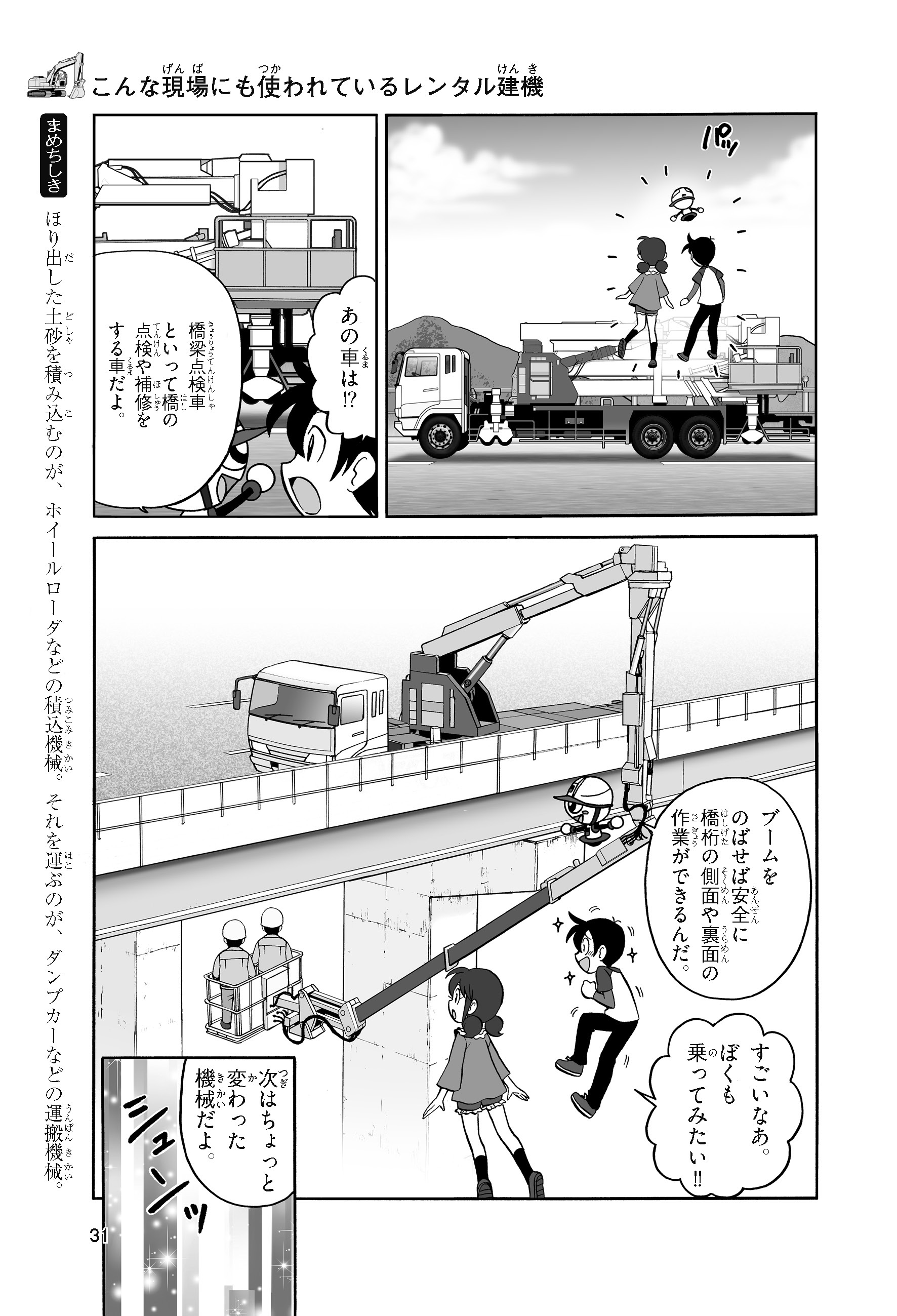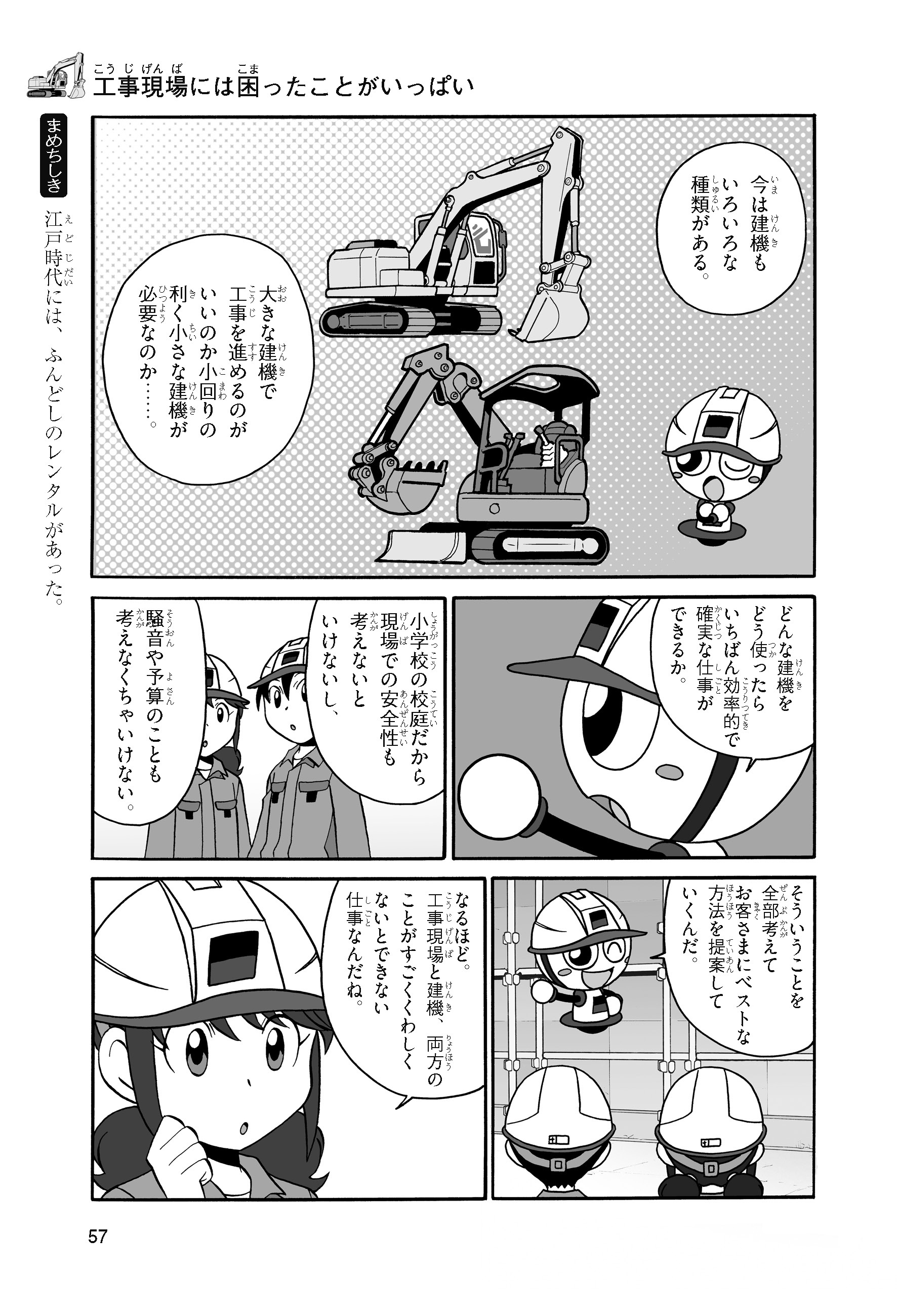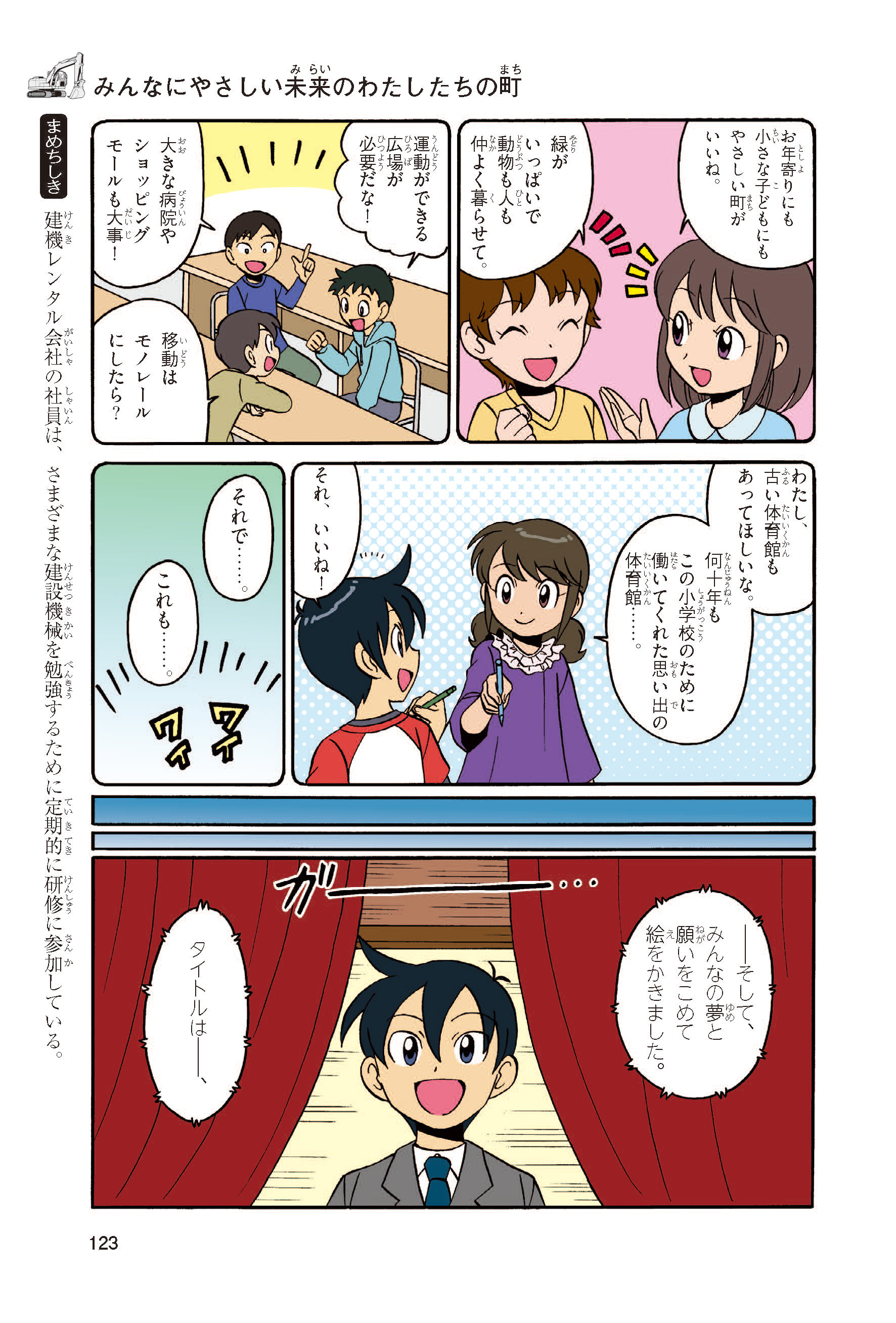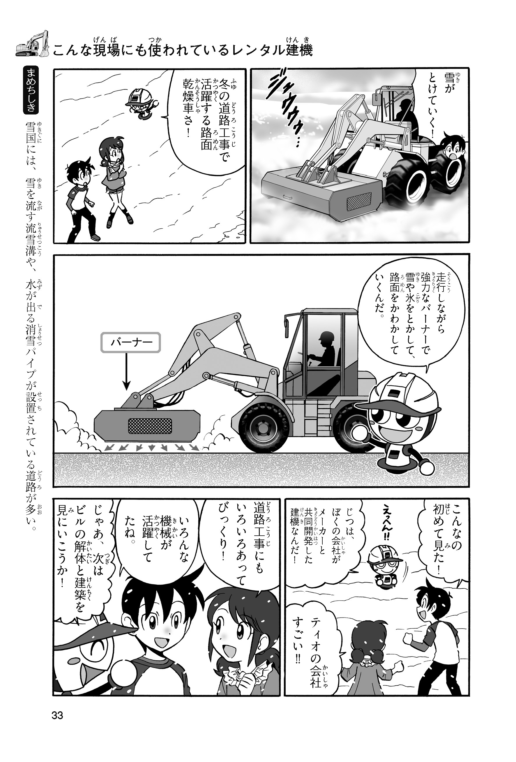 働く車が大好きな小学生のアキオ。体育館の建て替え工事がはじまって、たくさんの働く車にわくわくしていると、未来のロボット・ティオがあらわれて、実はそこにある働く車=建機(けんき)たちが貸し出されているもの(レンタル)だと教えてくれるよ。しかも、ただ貸し出しするだけじゃなくて、お客さんに合わせたレンタルをしたり、新しい建設機械をつくったりもしているんだって! この本でひみつについて知ってみよう!