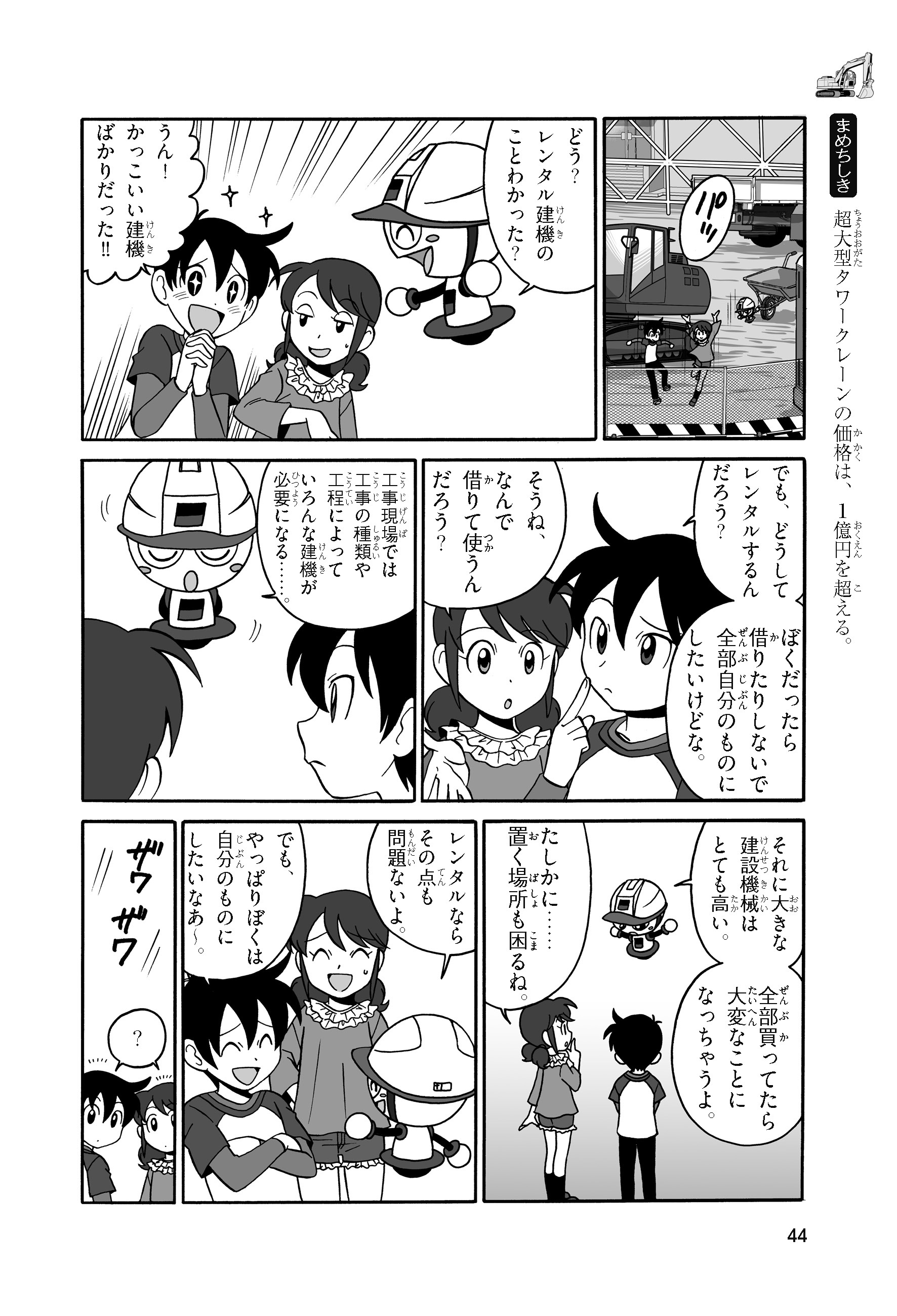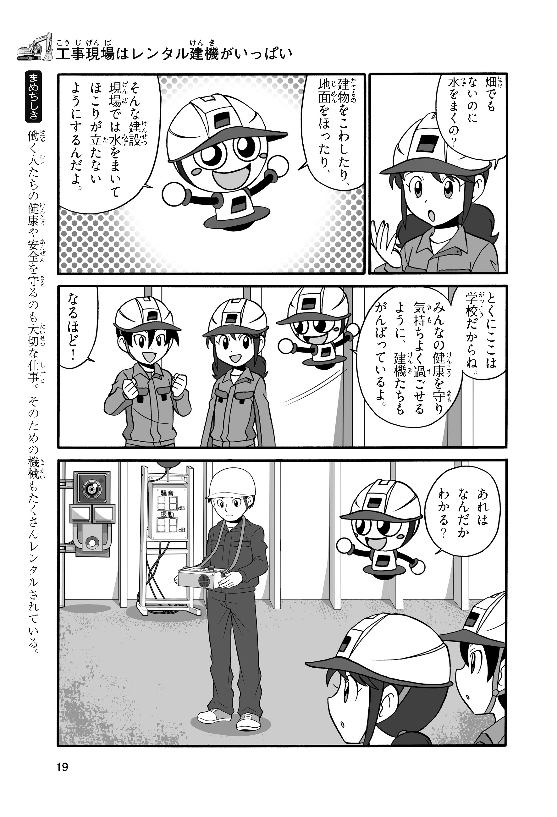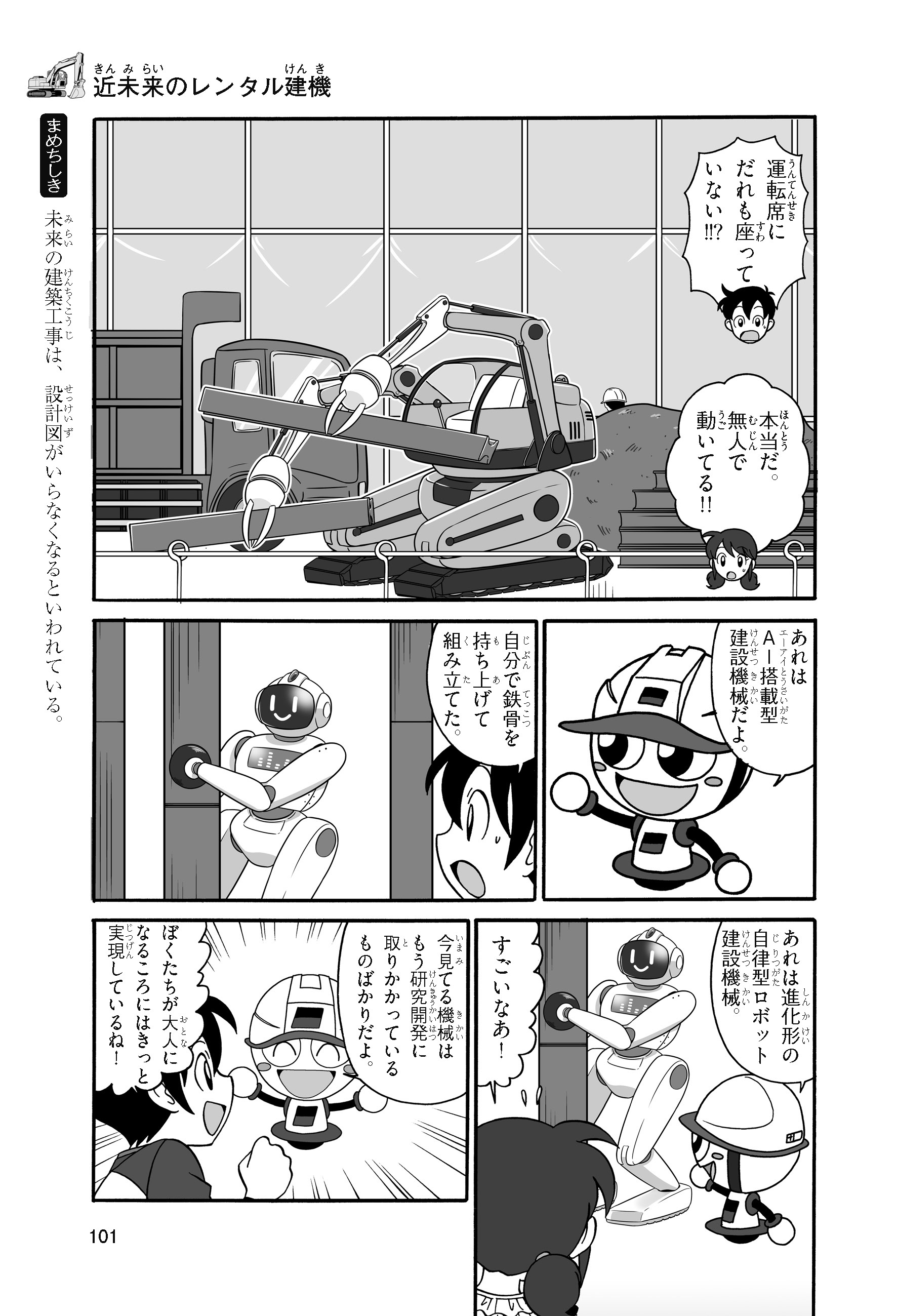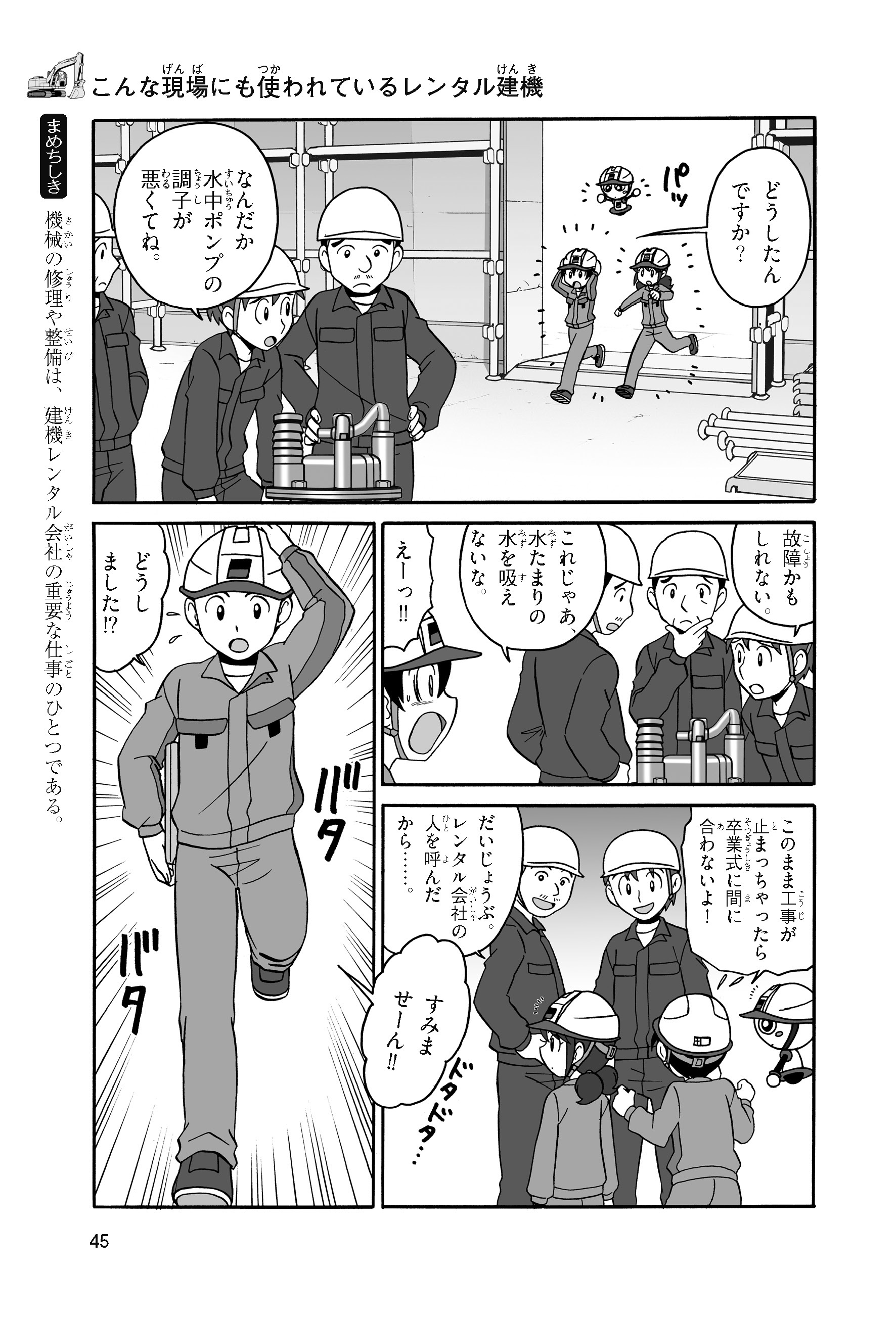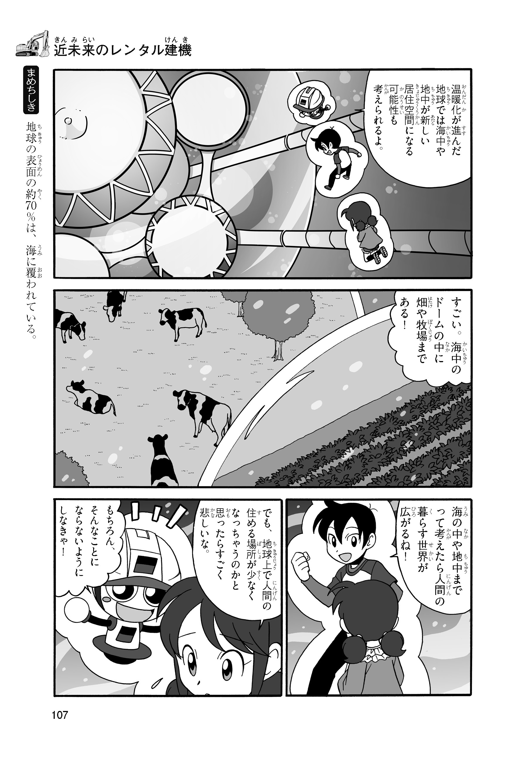 働く車が大好きな小学生のアキオ。体育館の建て替え工事がはじまって、たくさんの働く車にわくわくしていると、未来のロボット・ティオがあらわれて、実はそこにある働く車=建機(けんき)たちが貸し出されているもの(レンタル)だと教えてくれるよ。しかも、ただ貸し出しするだけじゃなくて、お客さんに合わせたレンタルをしたり、新しい建設機械をつくったりもしているんだって! この本でひみつについて知ってみよう!