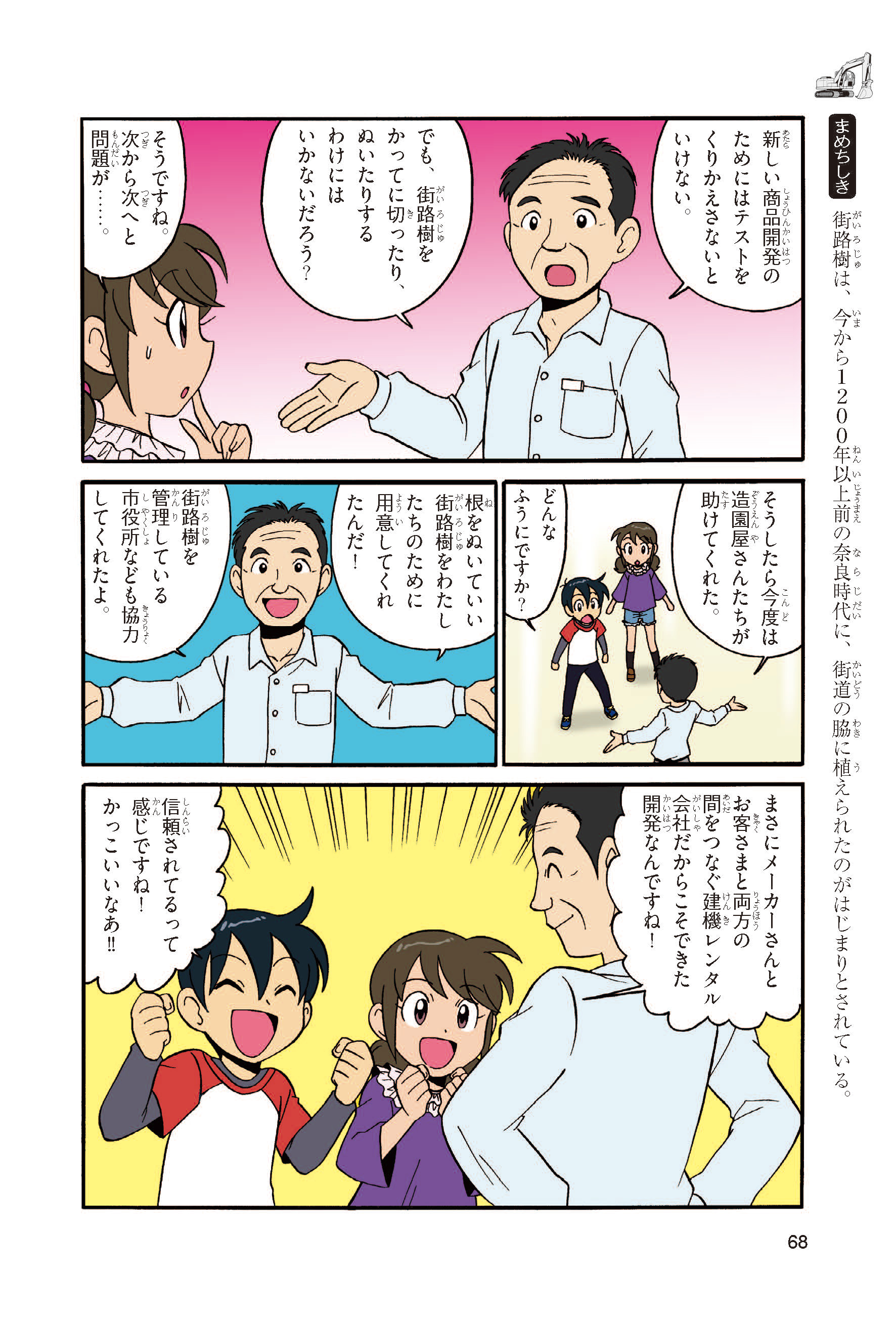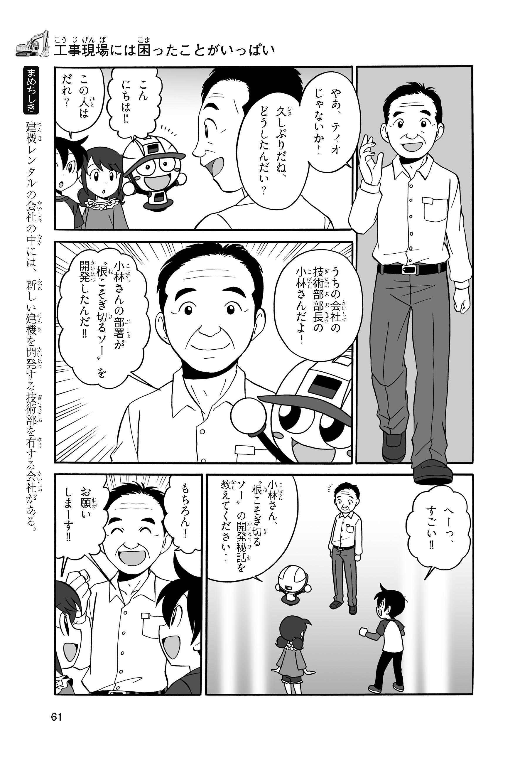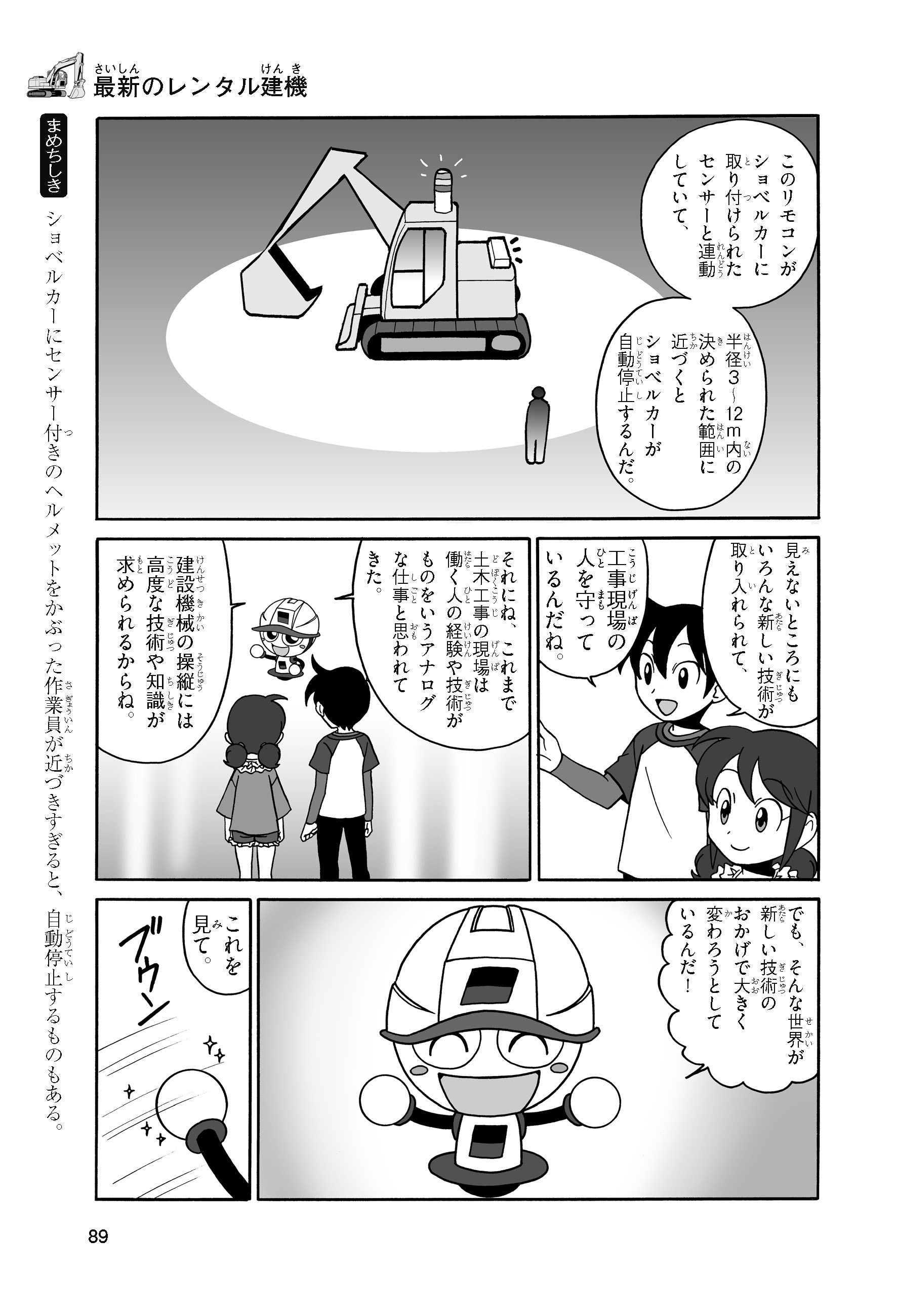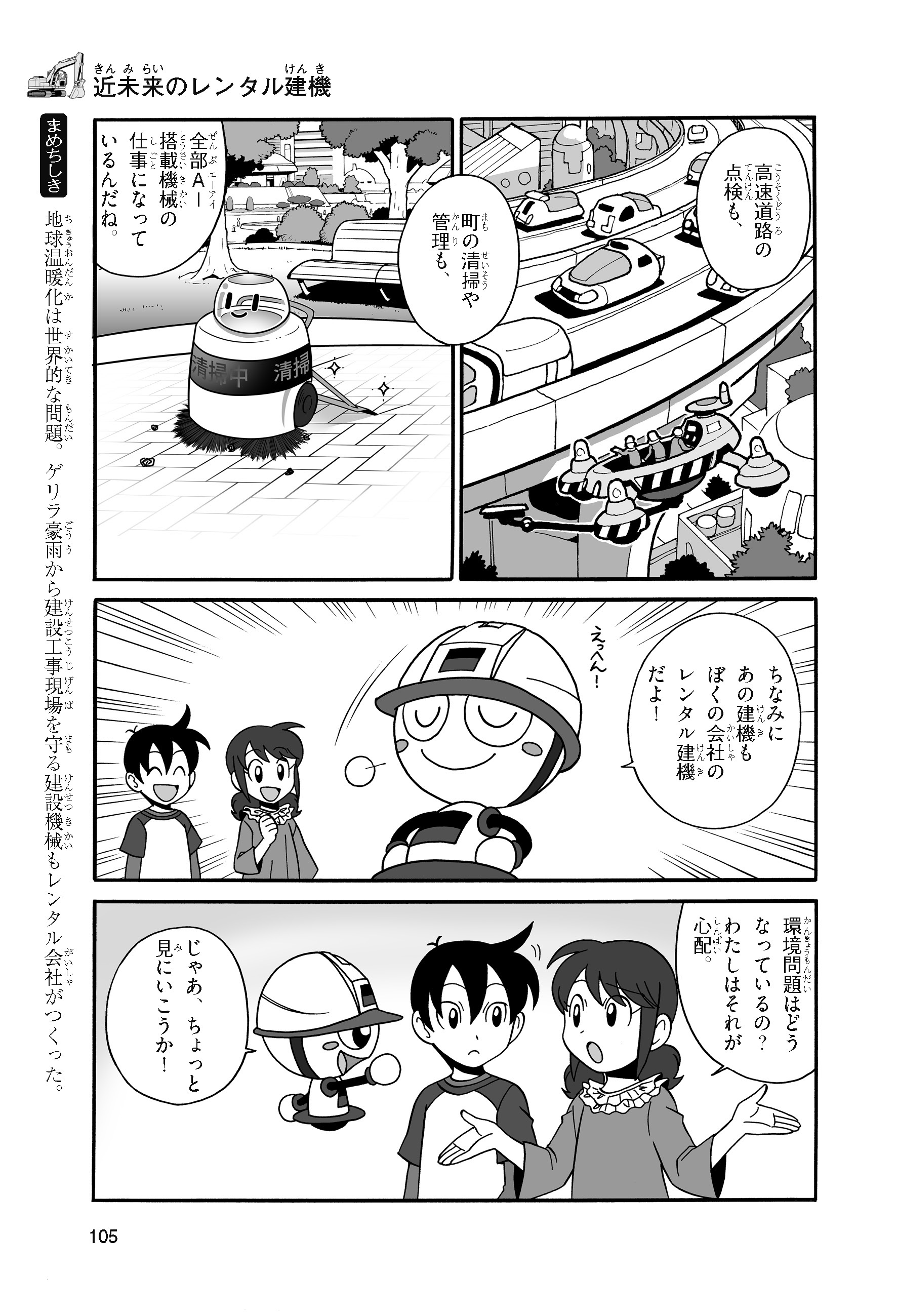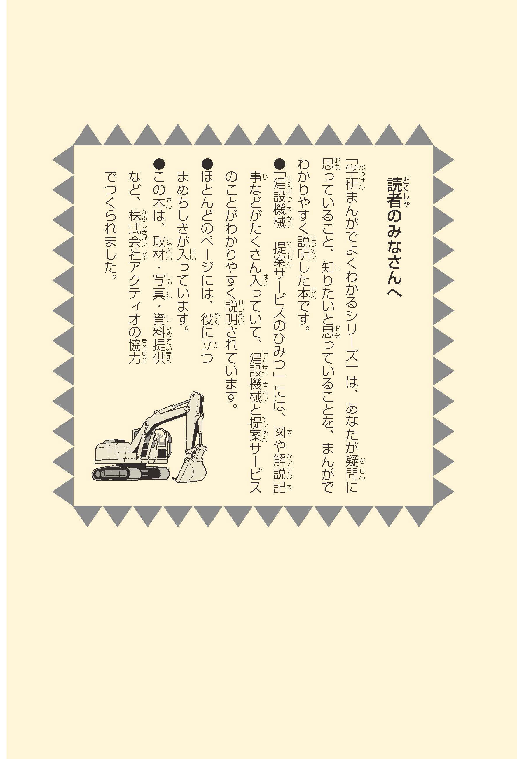 働く車が大好きな小学生のアキオ。体育館の建て替え工事がはじまって、たくさんの働く車にわくわくしていると、未来のロボット・ティオがあらわれて、実はそこにある働く車=建機(けんき)たちが貸し出されているもの(レンタル)だと教えてくれるよ。しかも、ただ貸し出しするだけじゃなくて、お客さんに合わせたレンタルをしたり、新しい建設機械をつくったりもしているんだって! この本でひみつについて知ってみよう!