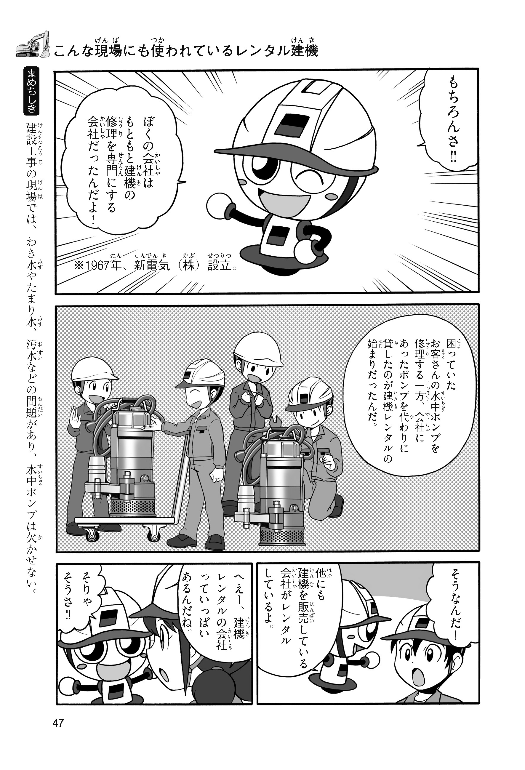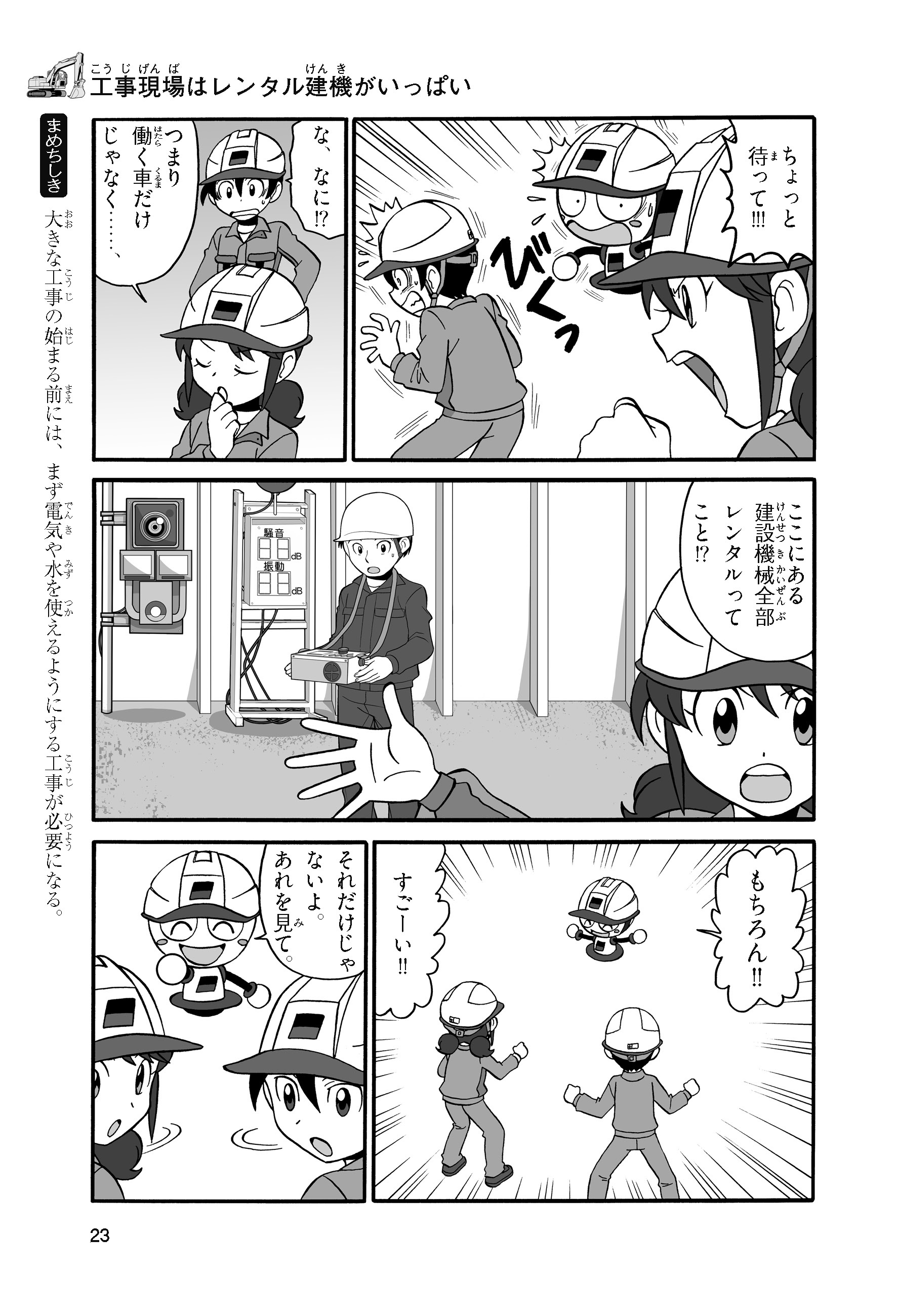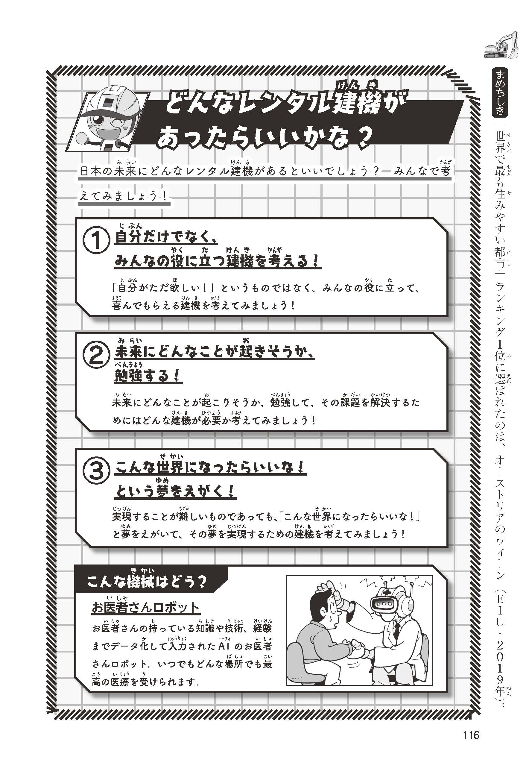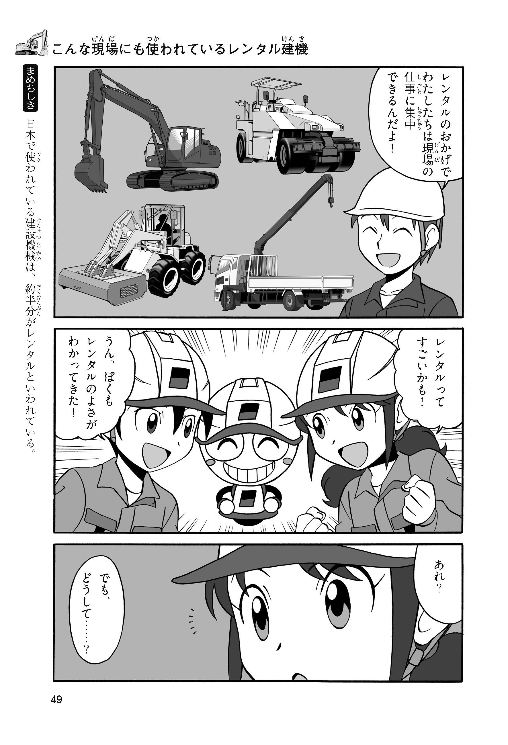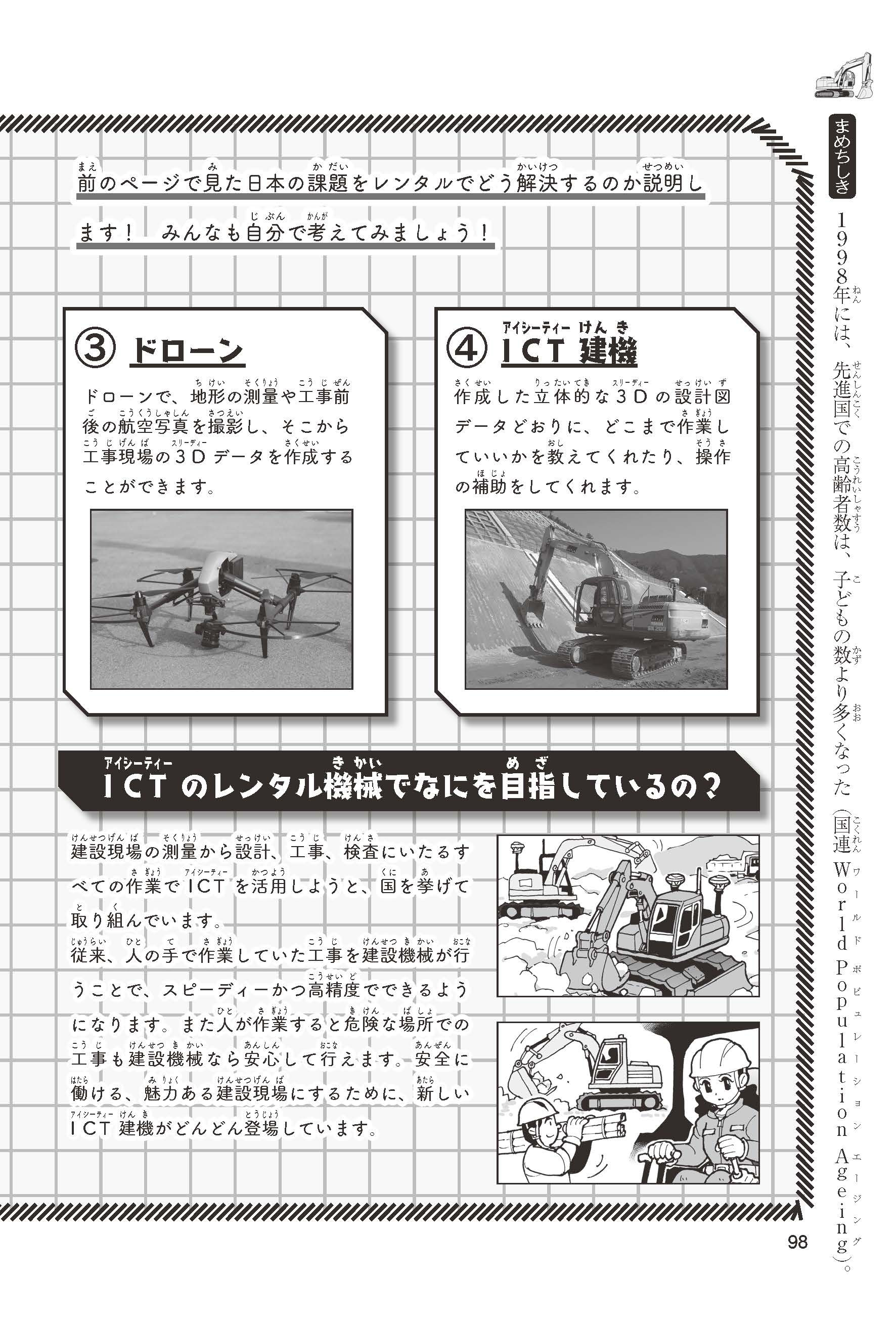 働く車が大好きな小学生のアキオ。体育館の建て替え工事がはじまって、たくさんの働く車にわくわくしていると、未来のロボット・ティオがあらわれて、実はそこにある働く車=建機(けんき)たちが貸し出されているもの(レンタル)だと教えてくれるよ。しかも、ただ貸し出しするだけじゃなくて、お客さんに合わせたレンタルをしたり、新しい建設機械をつくったりもしているんだって! この本でひみつについて知ってみよう!