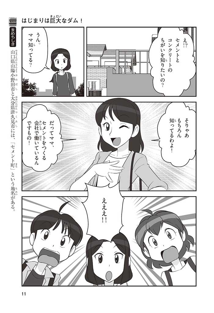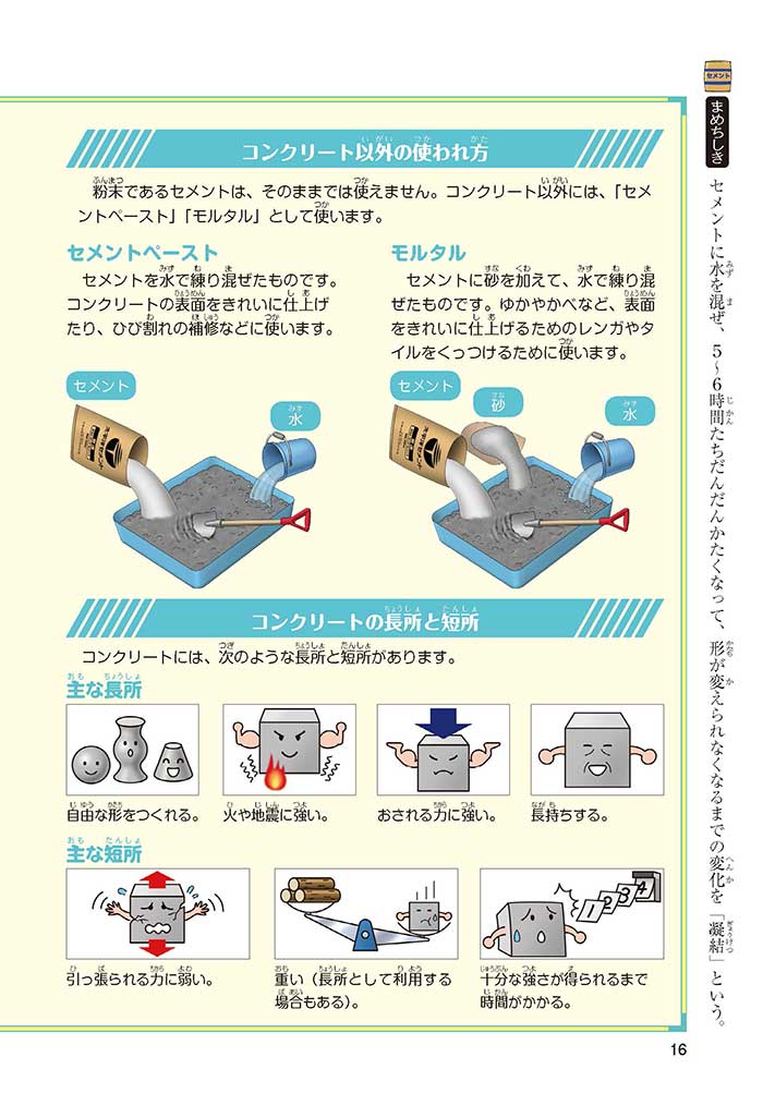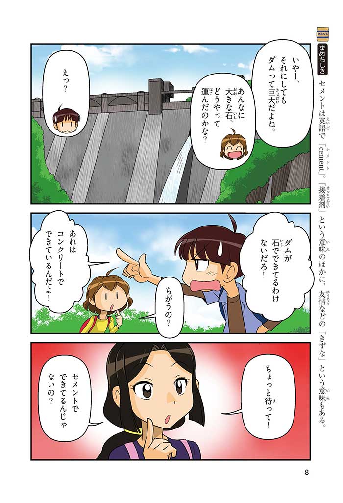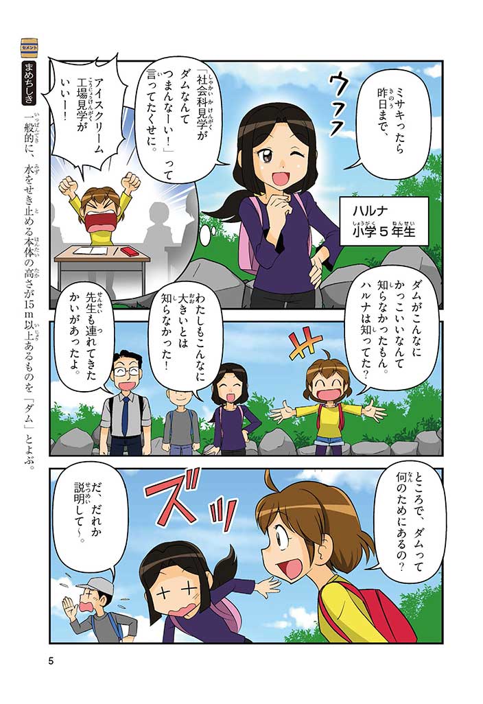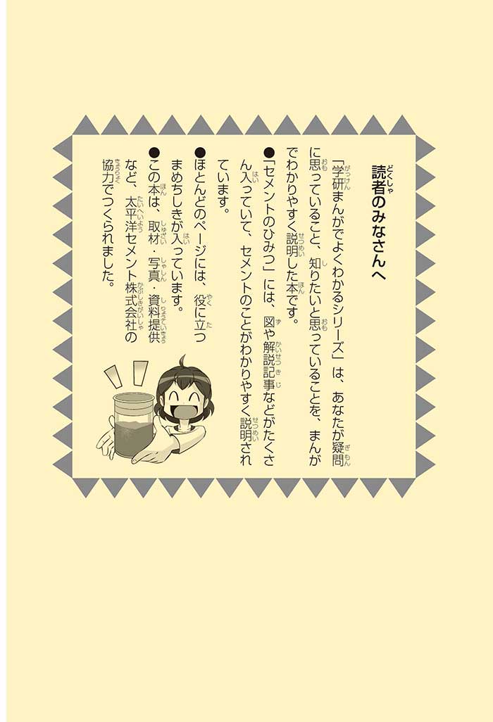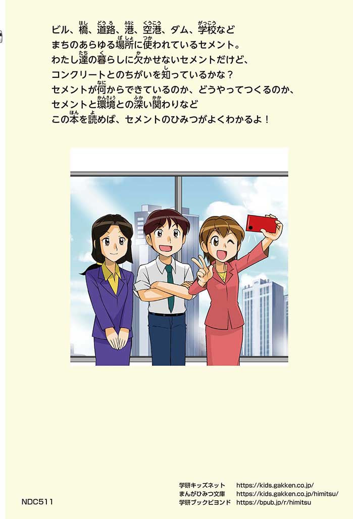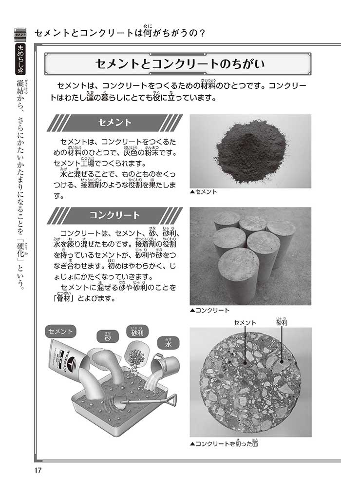 みんなは「セメント」って、どんなものかすぐにわかるかな? ダム見学の授業で、セメントに興味を持った小学5年生のミサキ、カケル、ハルナ。ダムをはじめ、ビル、橋、道路、港、空港、学校など、まちのあらゆる場所に使われていて、環境にも関係しているんだって! でも、セメントとコンクリートのちがいってなに? セメントって何からできているの? 未来をつくるセメントについて、いっしょに学ぼう!