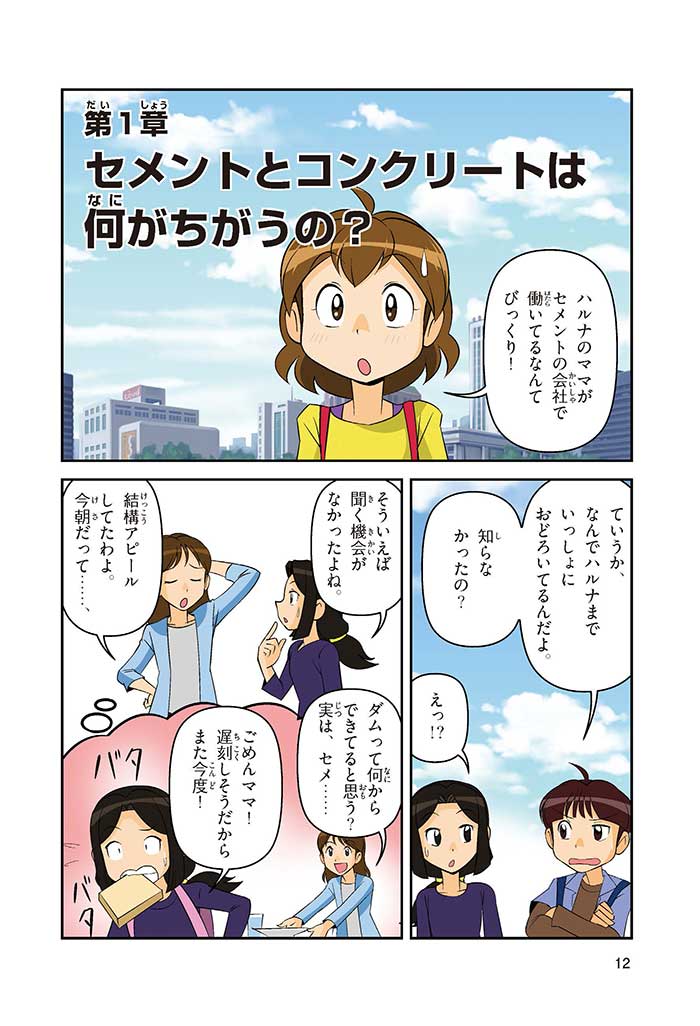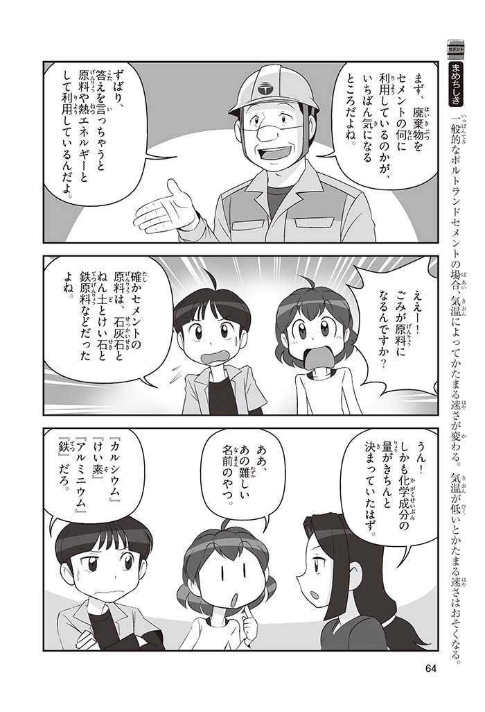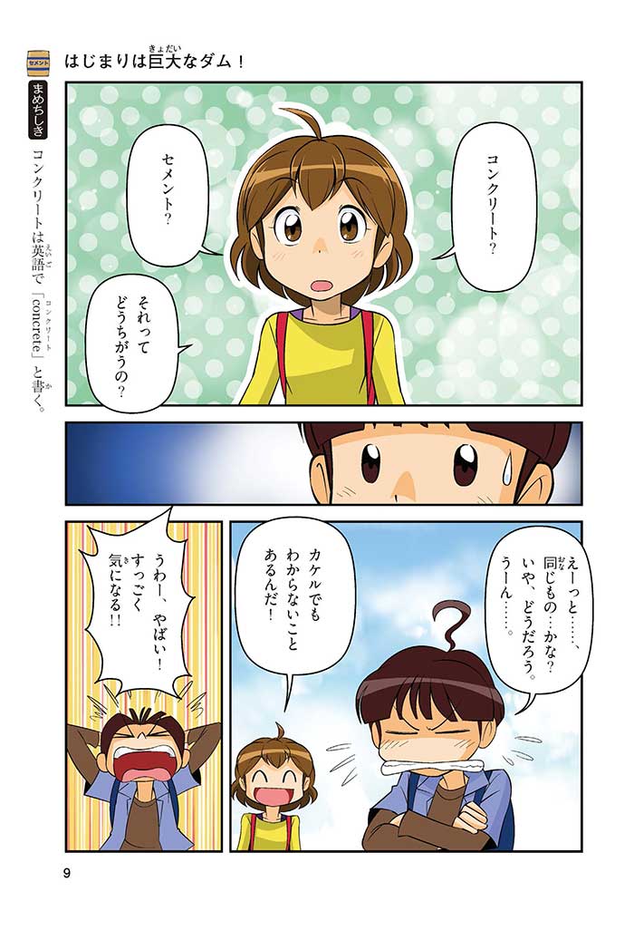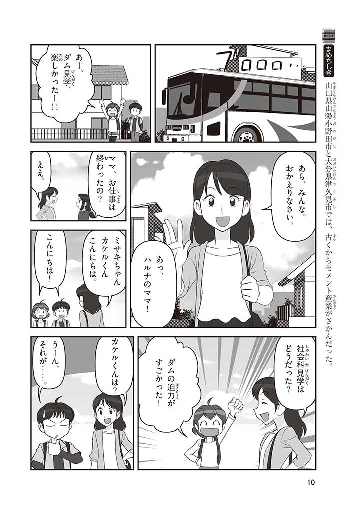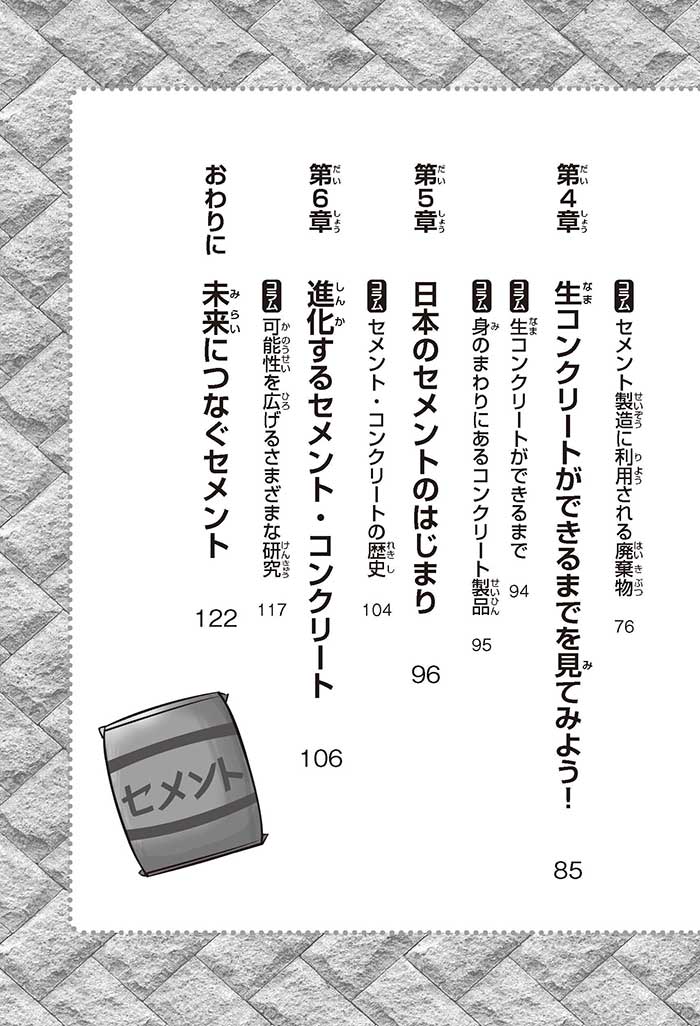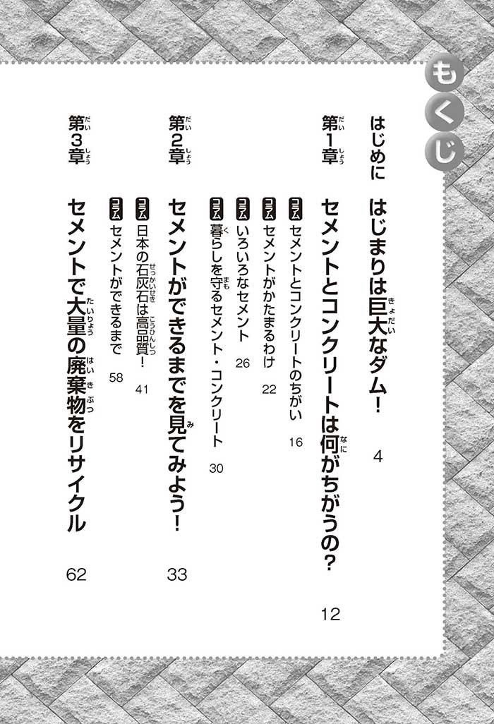 みんなは「セメント」って、どんなものかすぐにわかるかな? ダム見学の授業で、セメントに興味を持った小学5年生のミサキ、カケル、ハルナ。ダムをはじめ、ビル、橋、道路、港、空港、学校など、まちのあらゆる場所に使われていて、環境にも関係しているんだって! でも、セメントとコンクリートのちがいってなに? セメントって何からできているの? 未来をつくるセメントについて、いっしょに学ぼう!