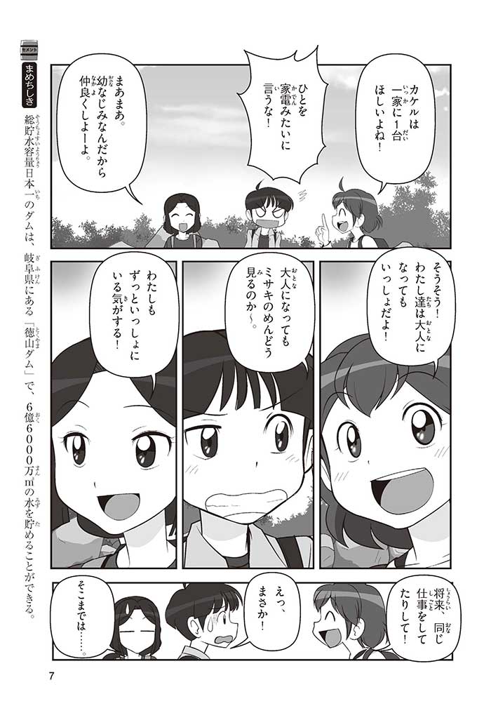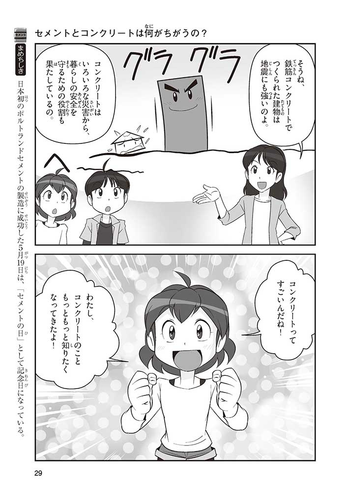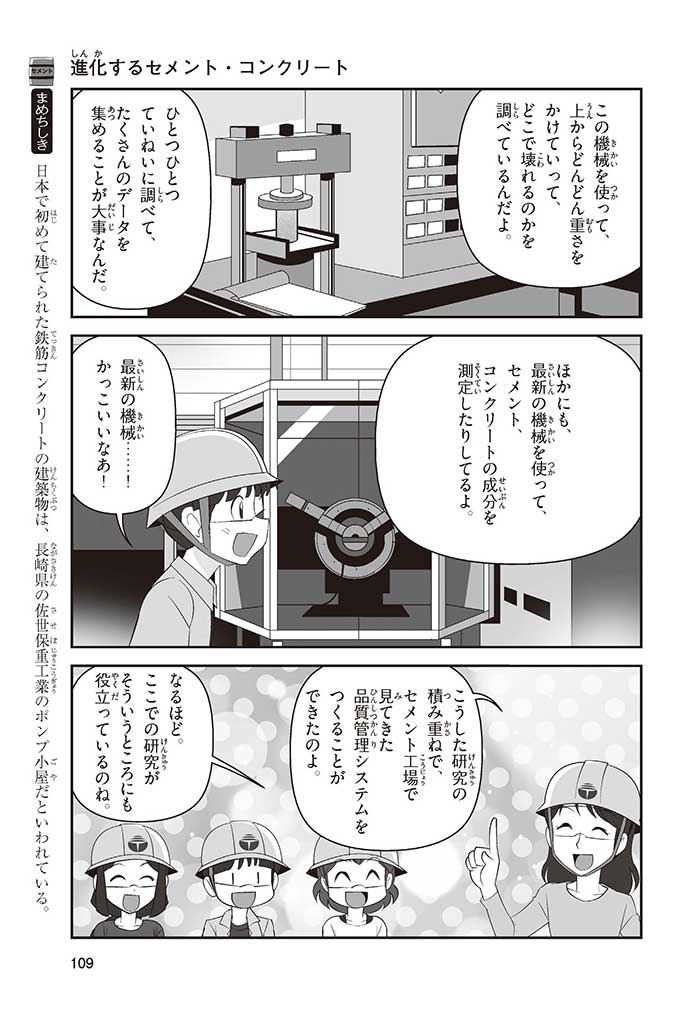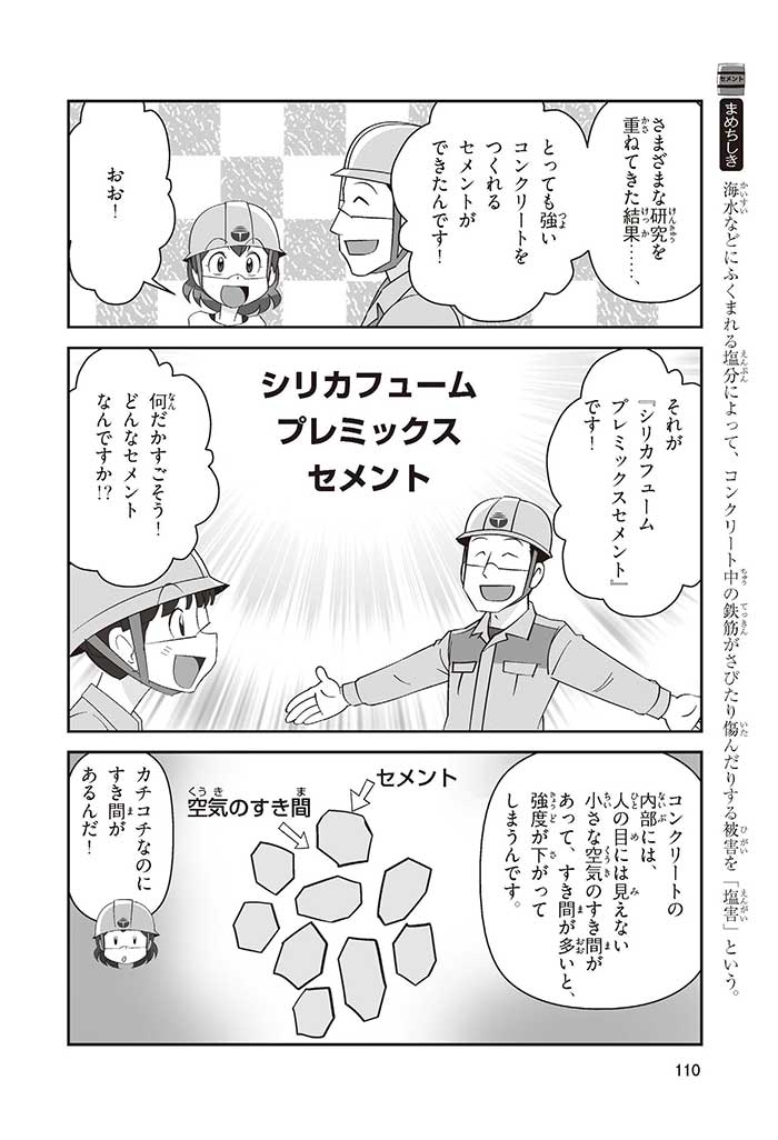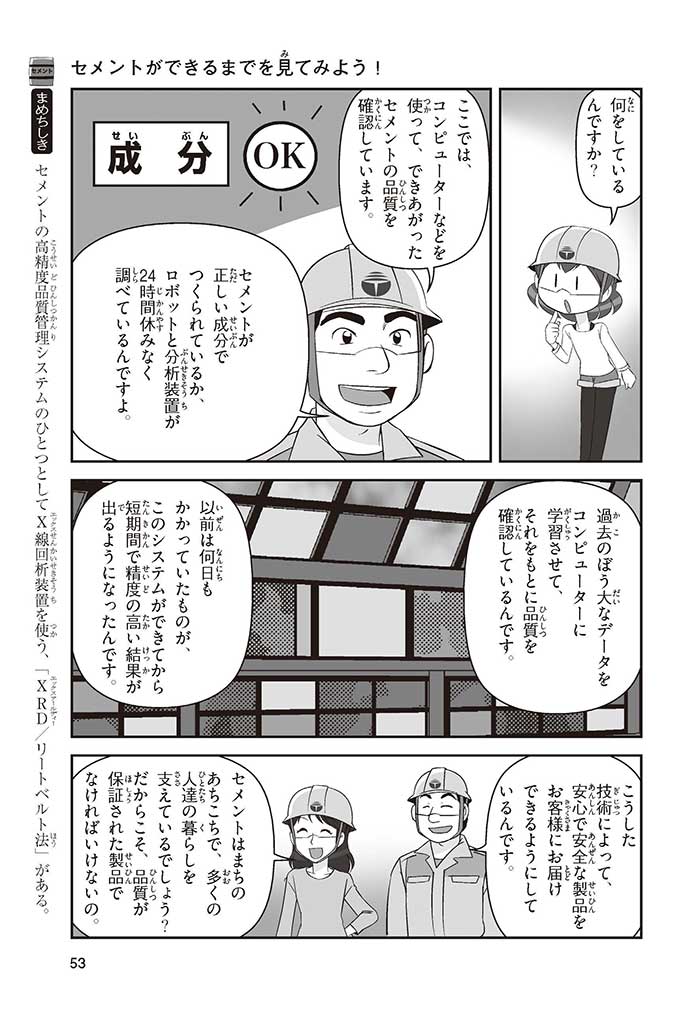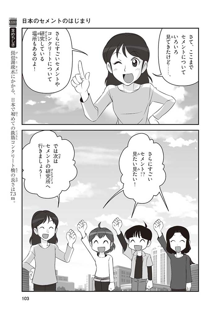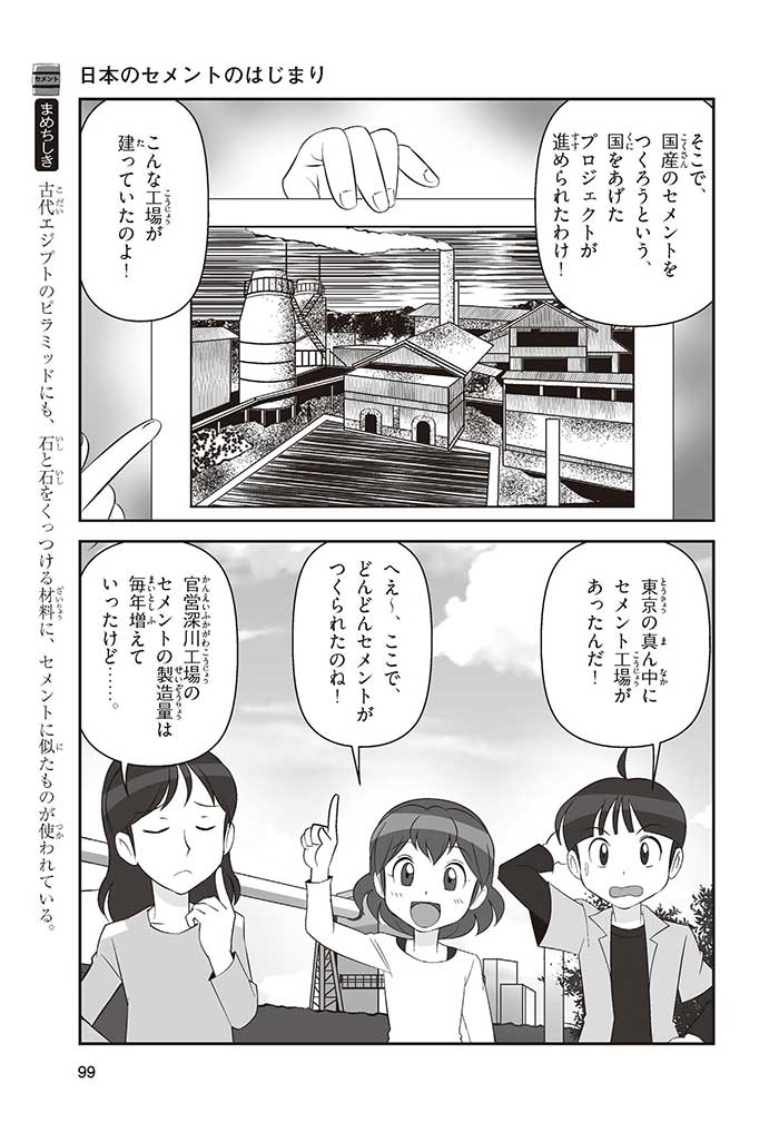 みんなは「セメント」って、どんなものかすぐにわかるかな? ダム見学の授業で、セメントに興味を持った小学5年生のミサキ、カケル、ハルナ。ダムをはじめ、ビル、橋、道路、港、空港、学校など、まちのあらゆる場所に使われていて、環境にも関係しているんだって! でも、セメントとコンクリートのちがいってなに? セメントって何からできているの? 未来をつくるセメントについて、いっしょに学ぼう!