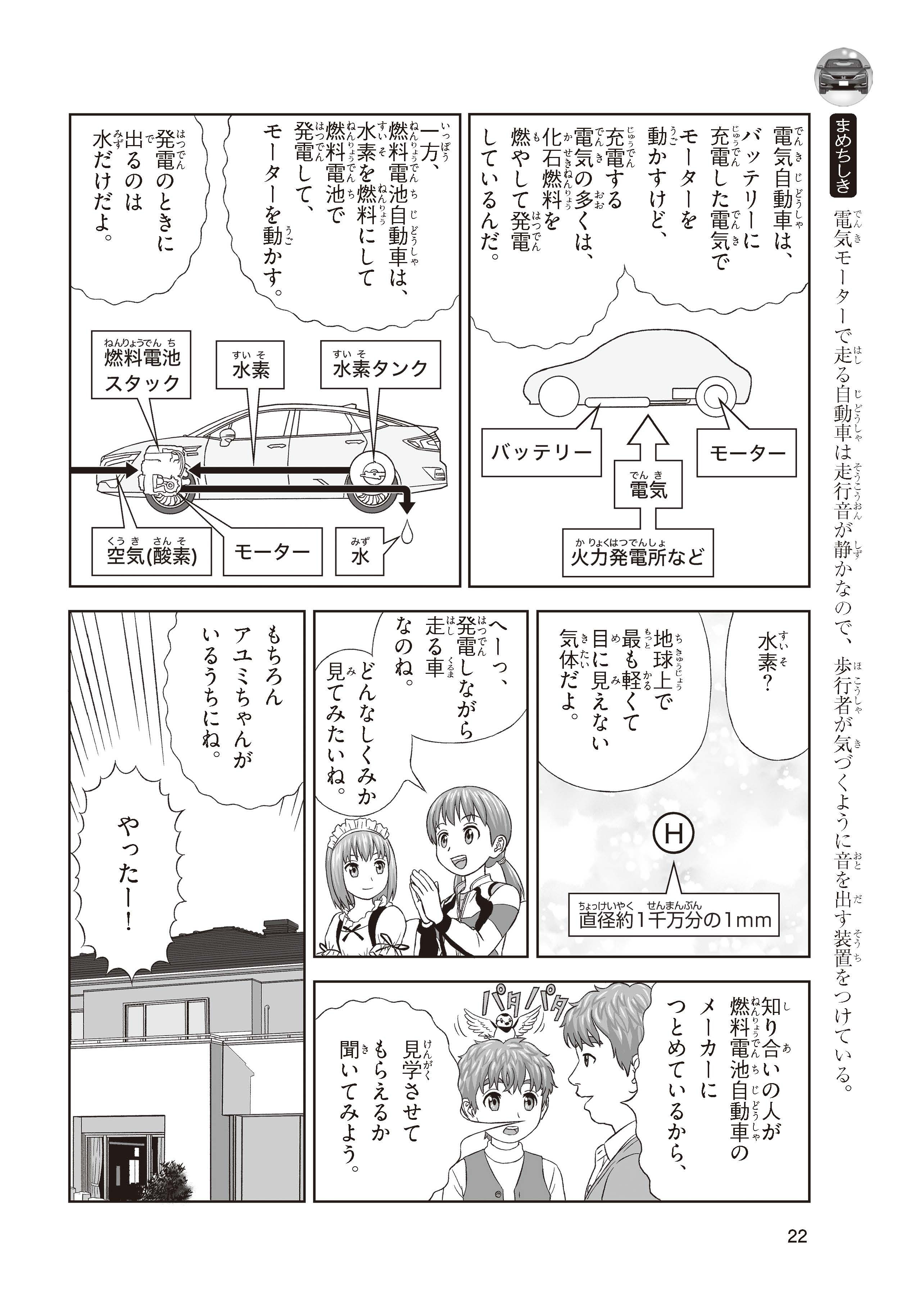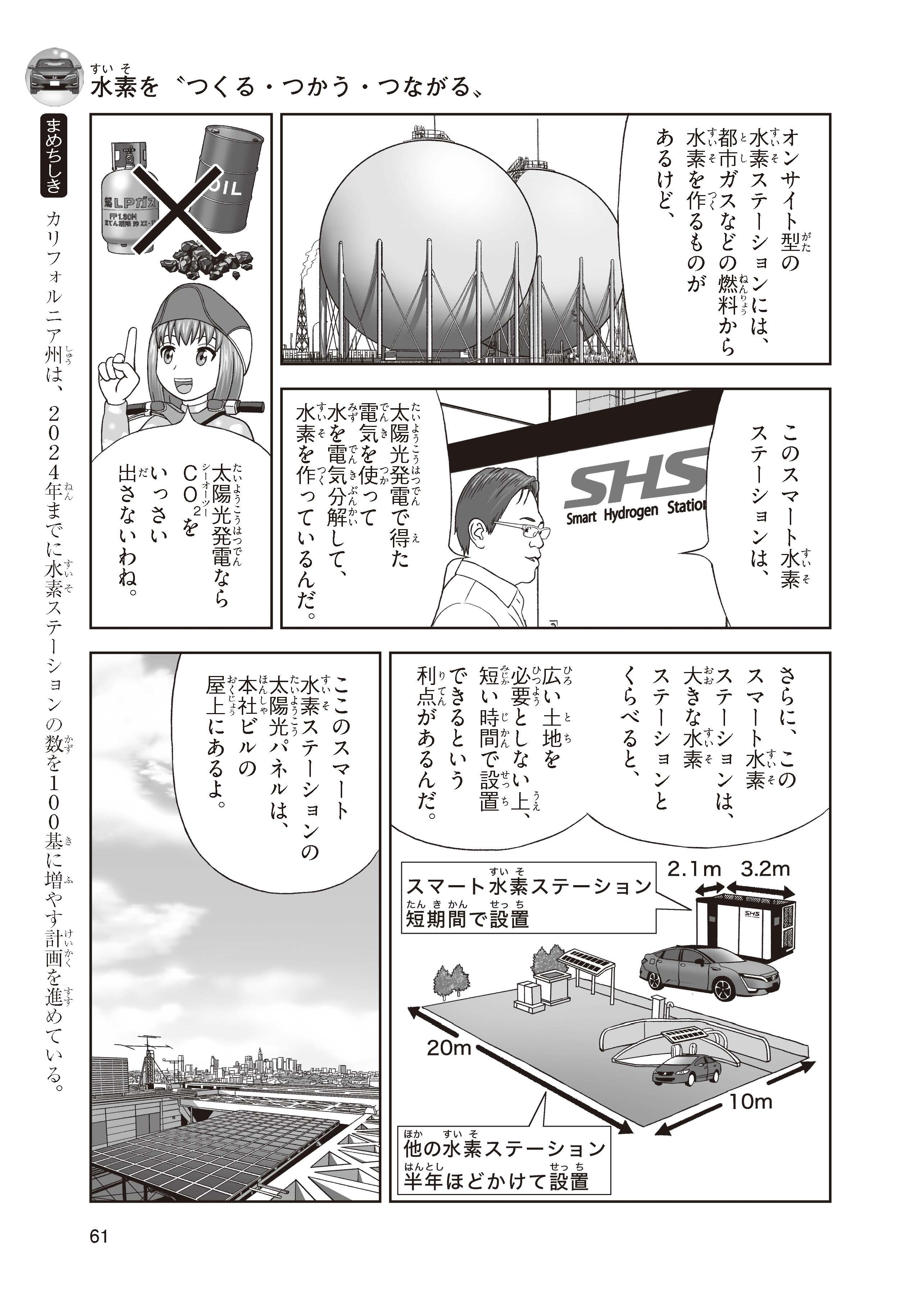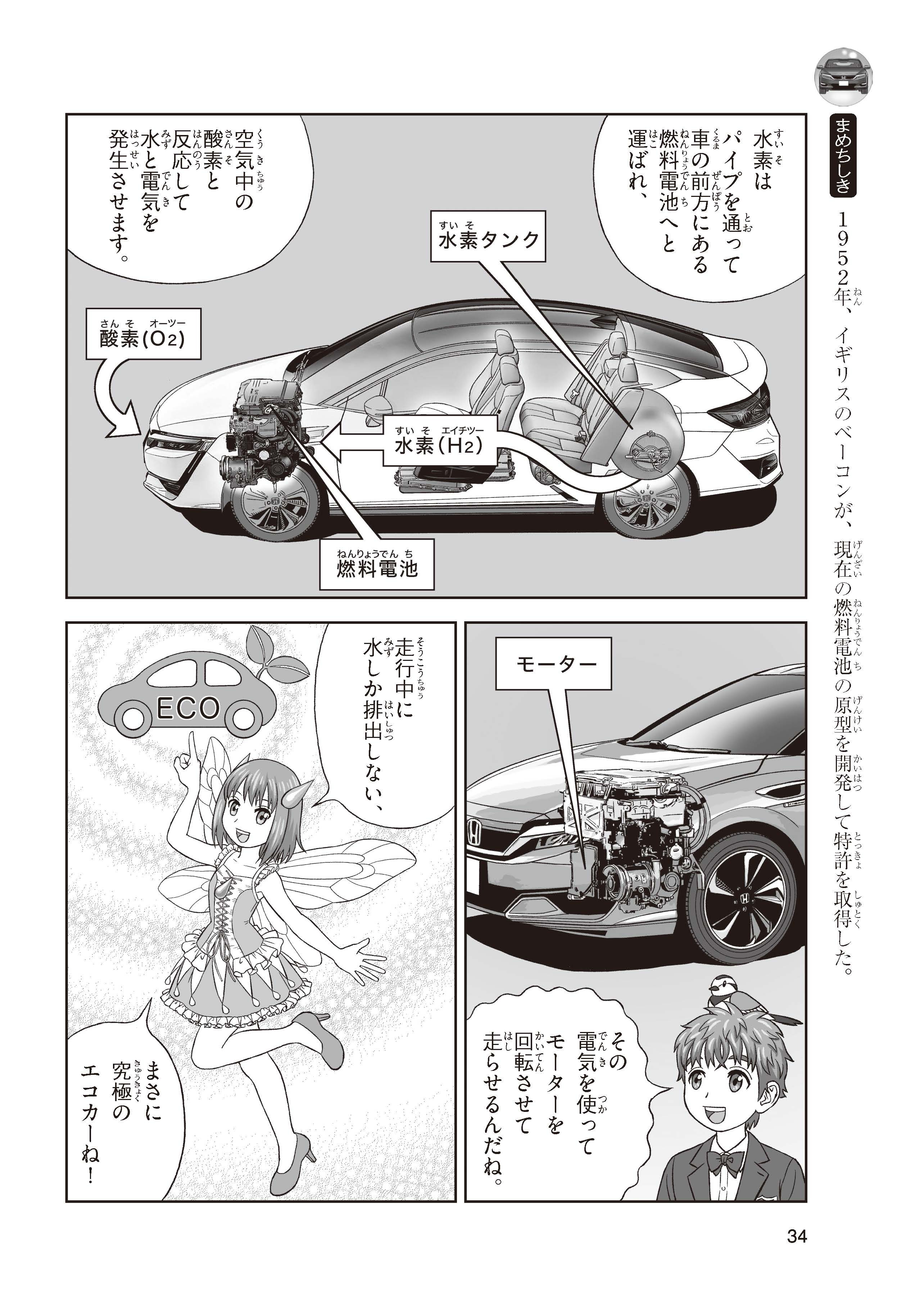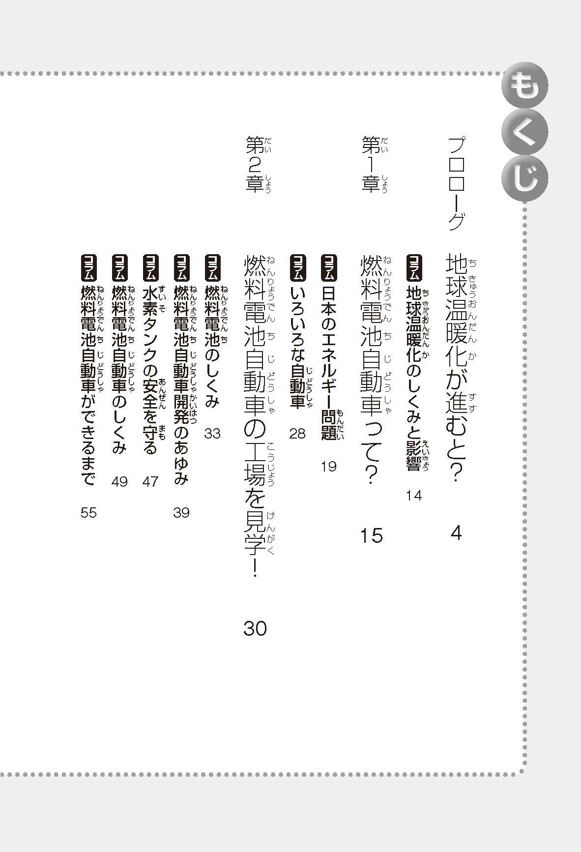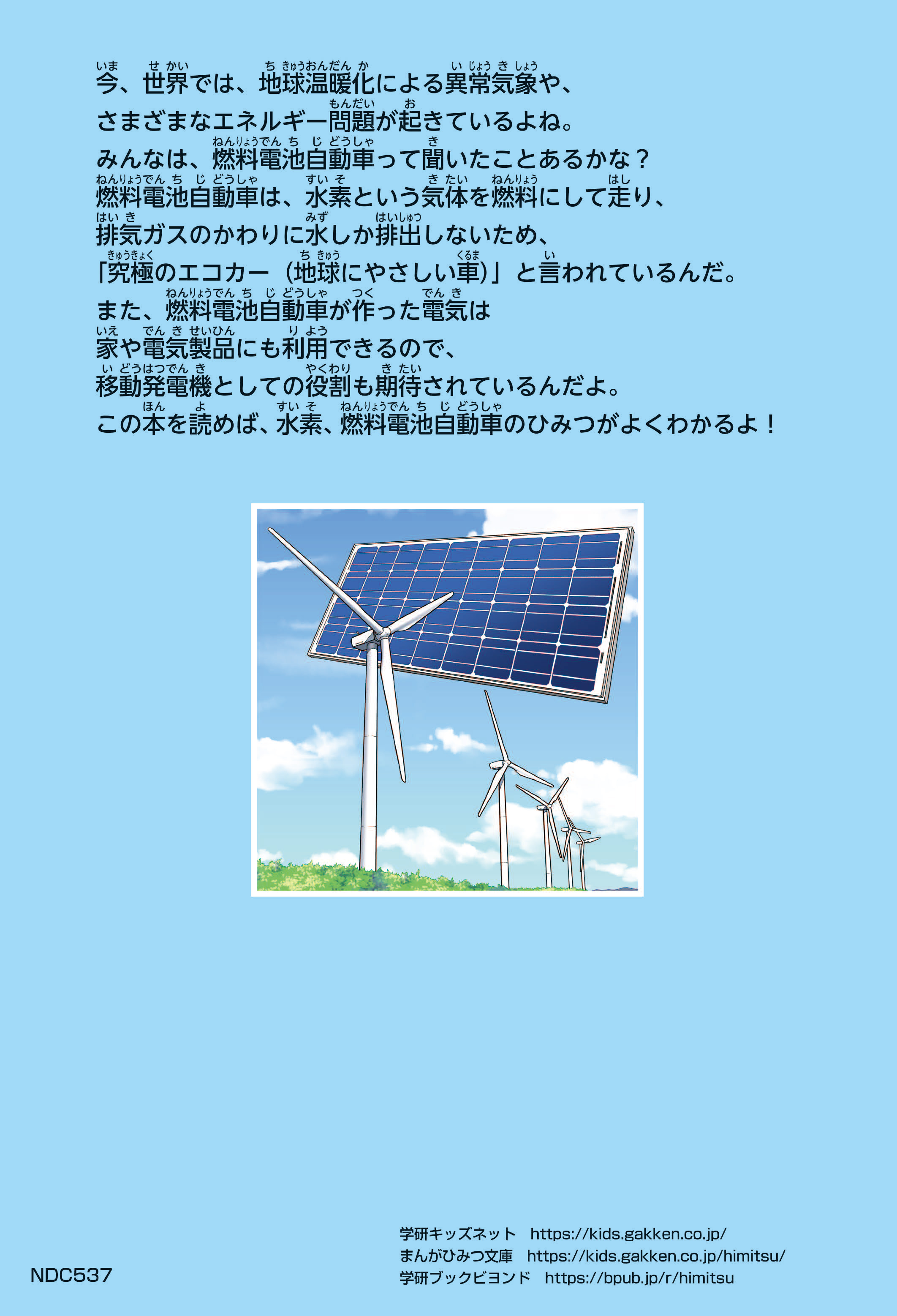 春休み、小学5年生のコウタのいとこ・アユミが遊びにくることに。同級生のミキといっしょに東京案内中、異常気象(いじょうきしょう)で停電が起こって、電気の大切さを改めて知るよ。そこで聞いたのが「燃料電池自動車」。水素という気体が燃料で、「究極のエコカー(地球にやさしい車)」と言われているんだって。電気をつくることもできて、移動発電機としての役割も期待されているんだよ。この本でひみつを探ろう!