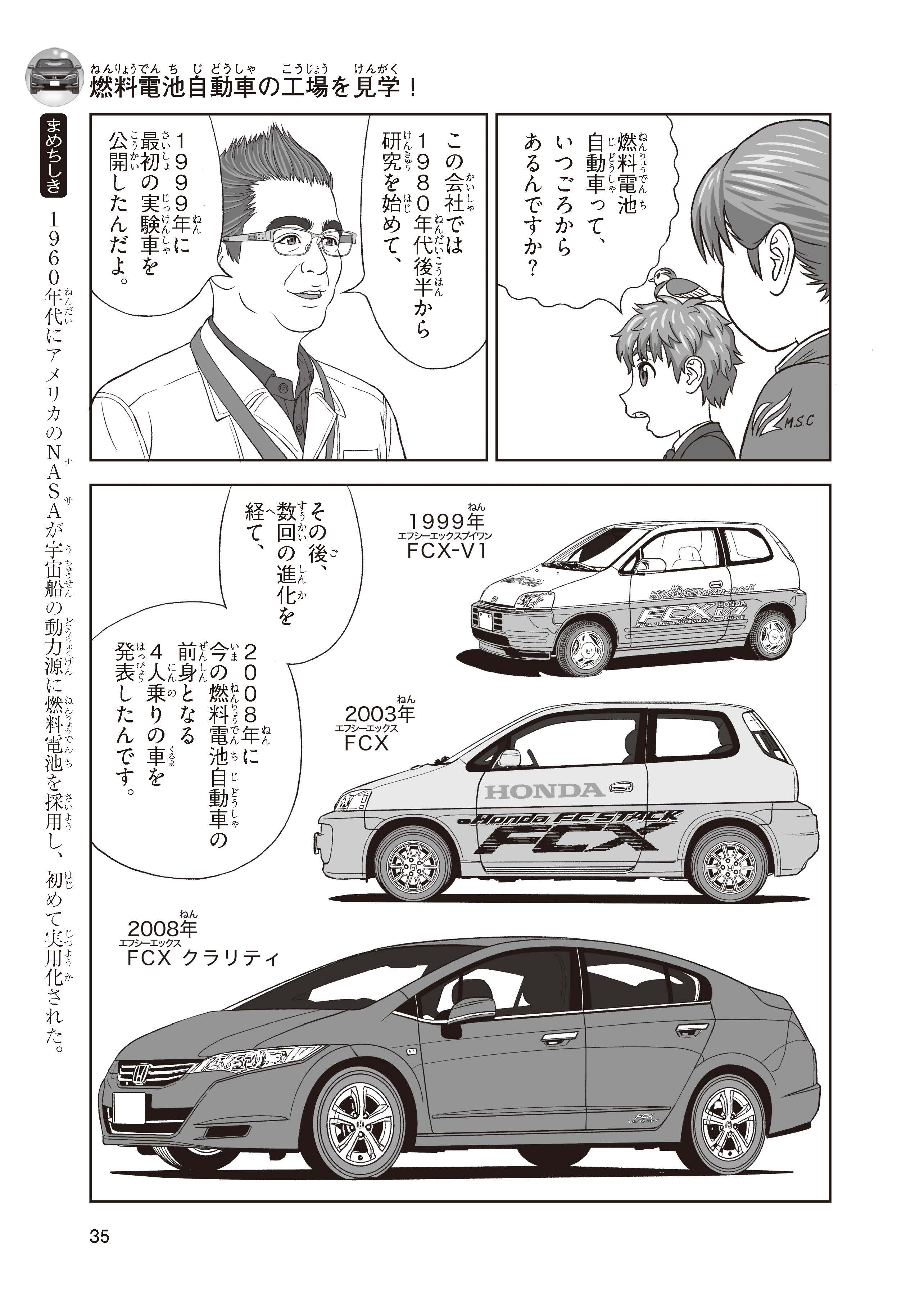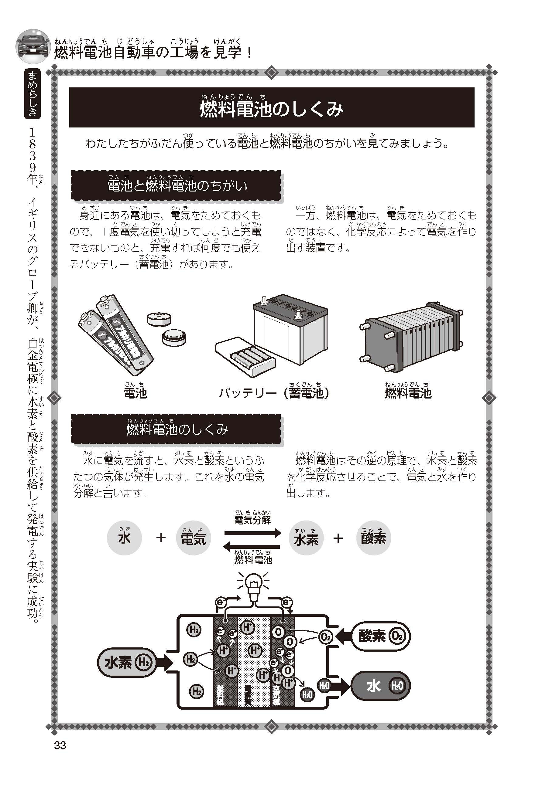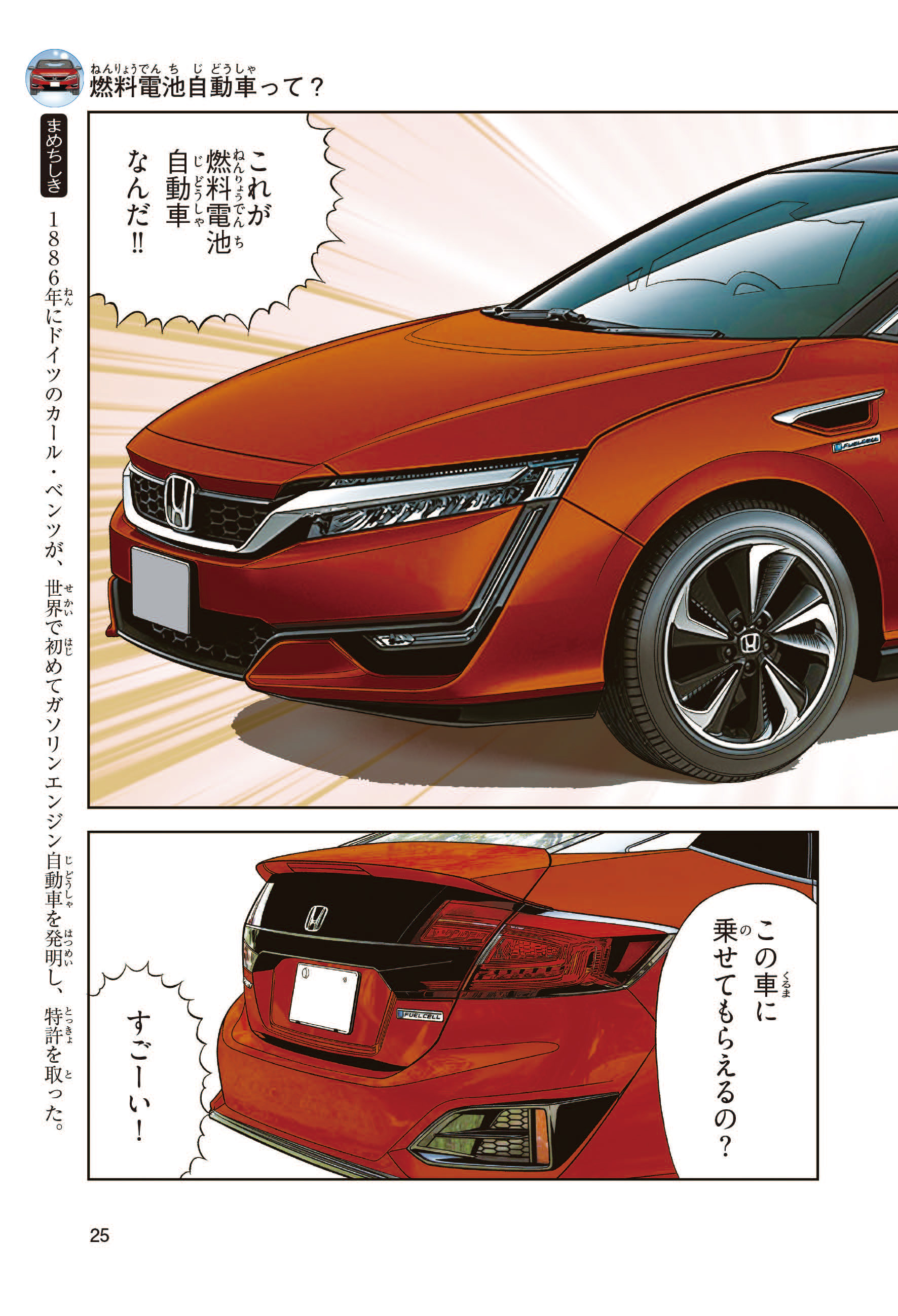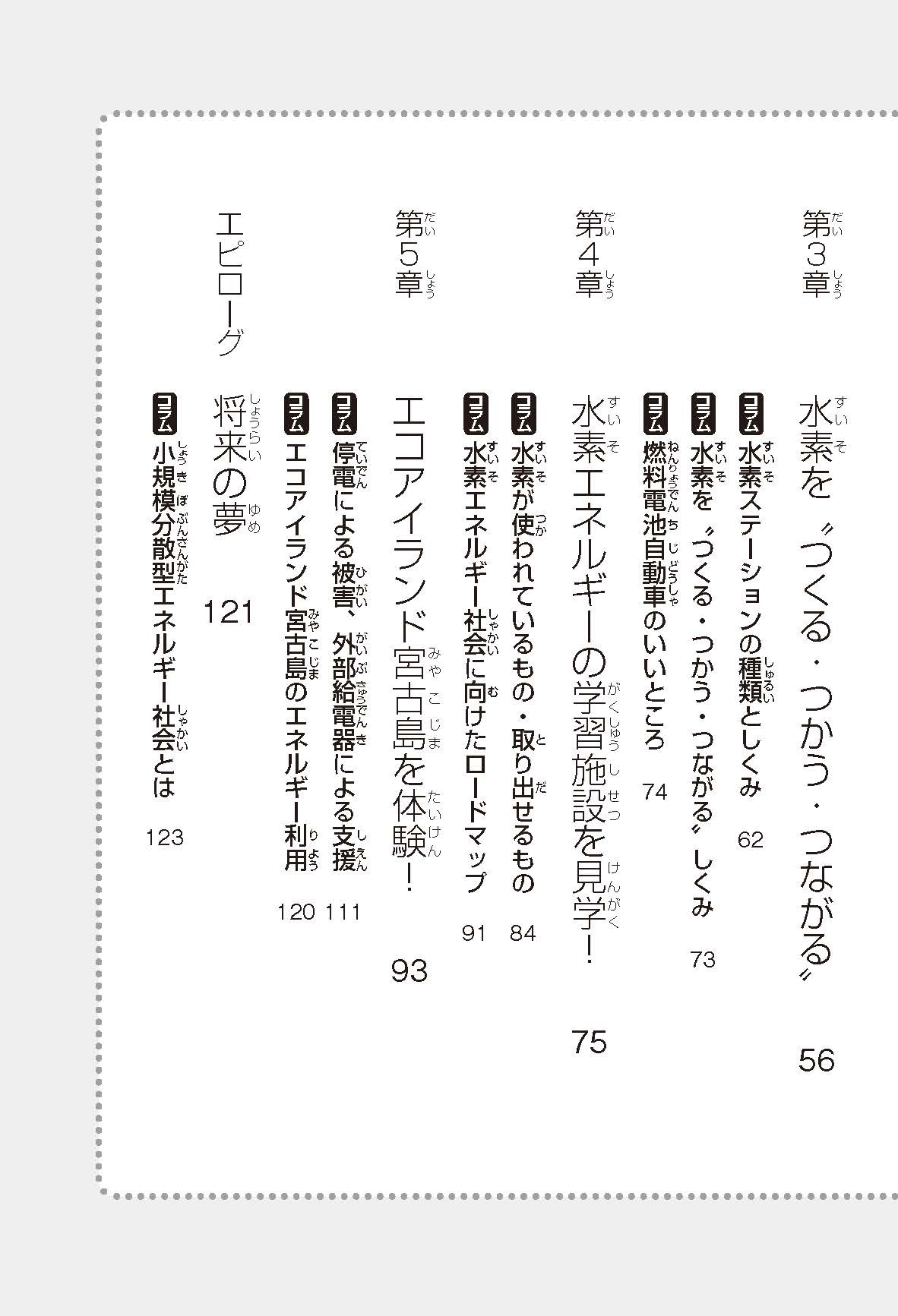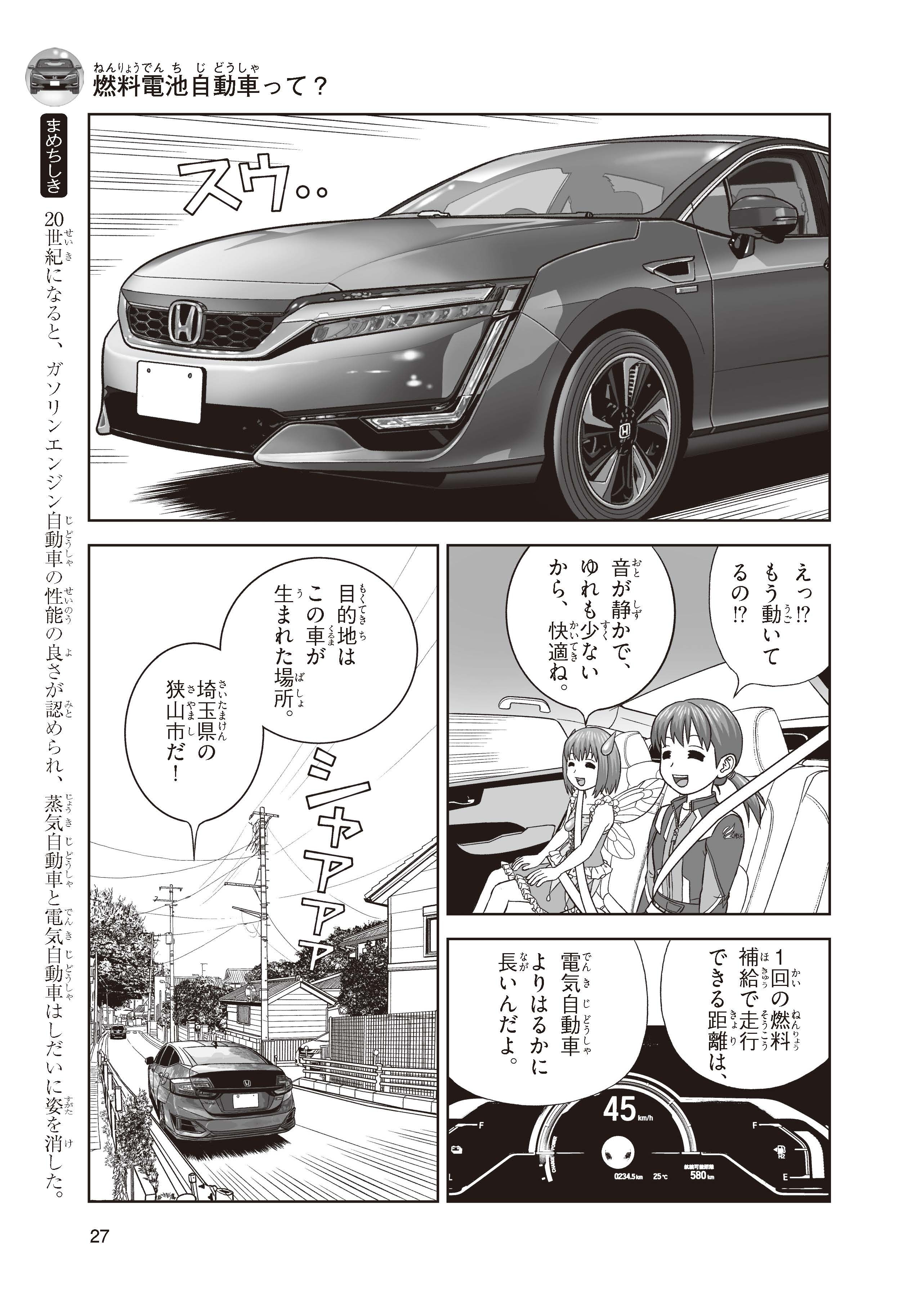 春休み、小学5年生のコウタのいとこ・アユミが遊びにくることに。同級生のミキといっしょに東京案内中、異常気象(いじょうきしょう)で停電が起こって、電気の大切さを改めて知るよ。そこで聞いたのが「燃料電池自動車」。水素という気体が燃料で、「究極のエコカー(地球にやさしい車)」と言われているんだって。電気をつくることもできて、移動発電機としての役割も期待されているんだよ。この本でひみつを探ろう!