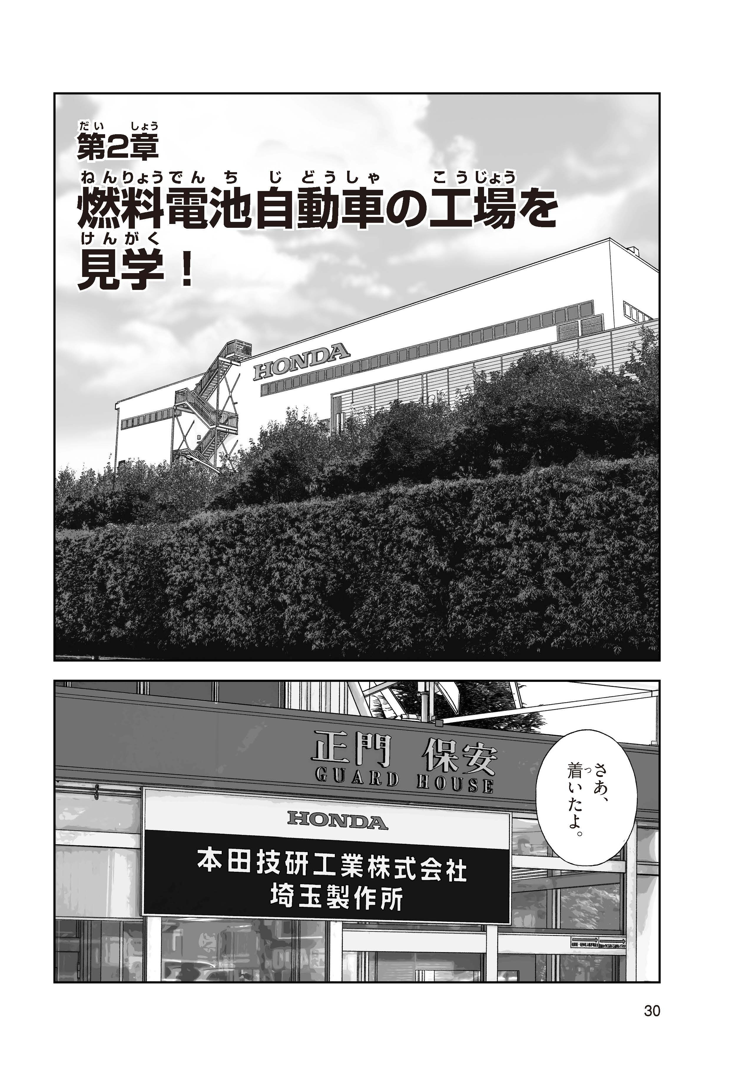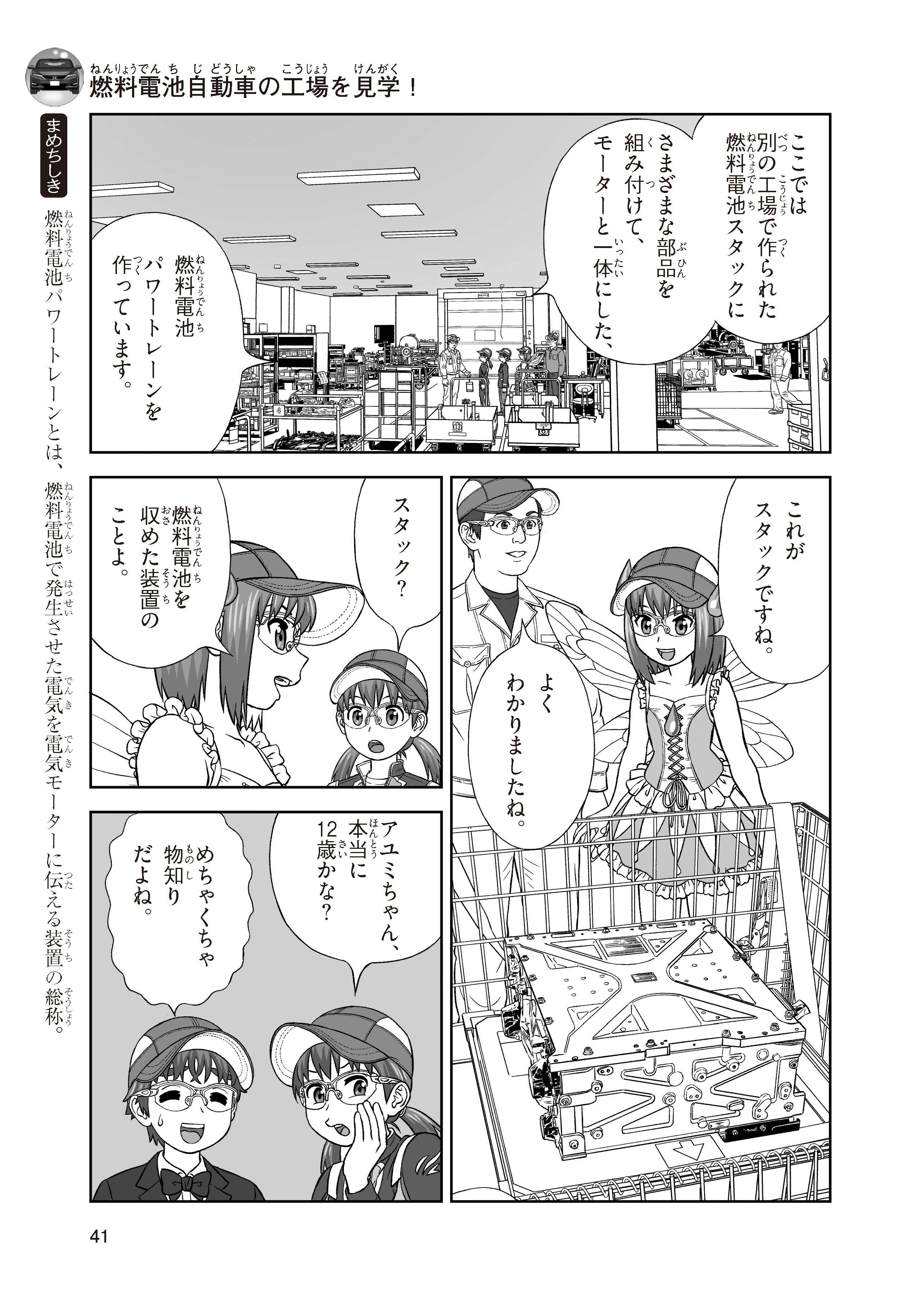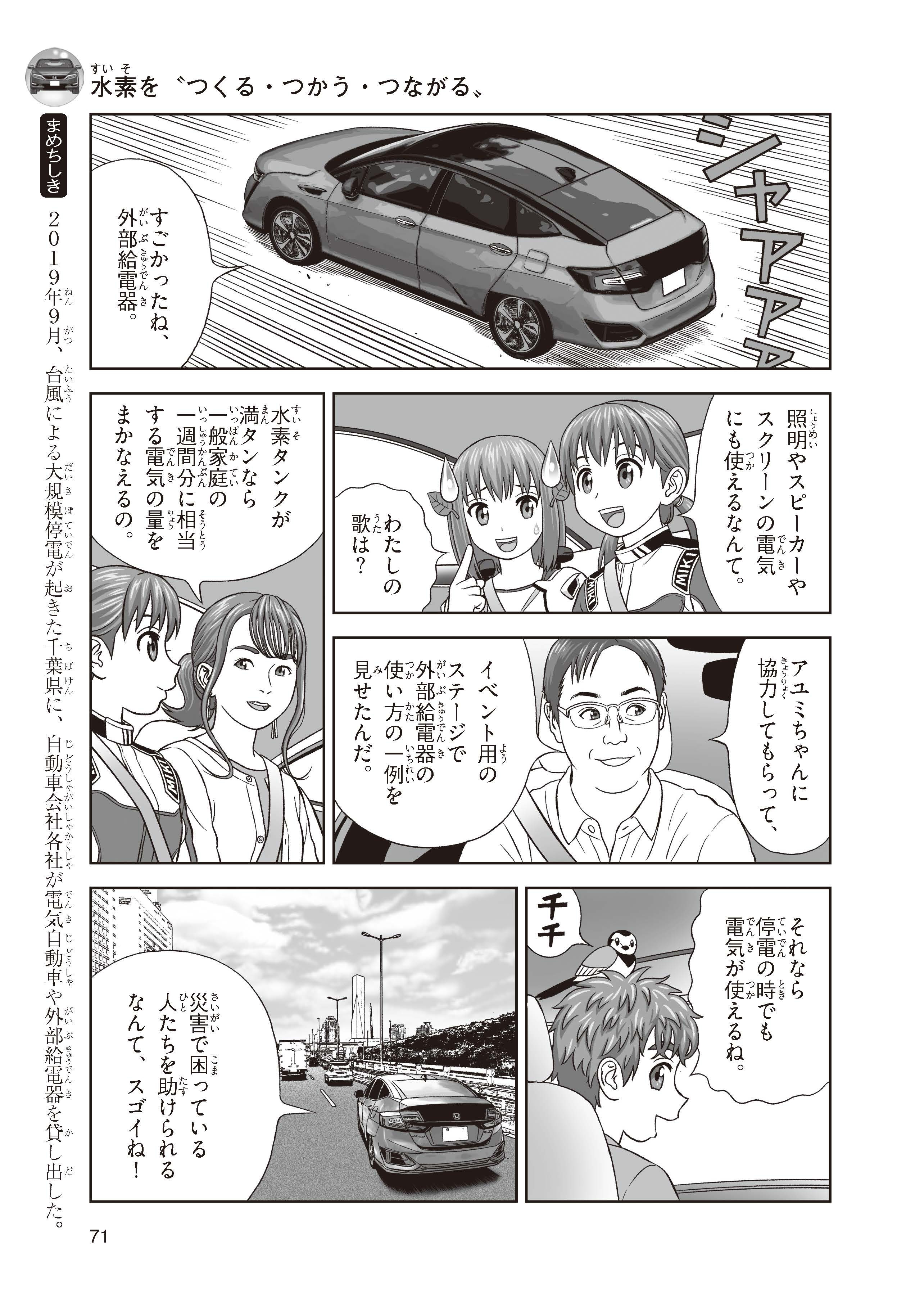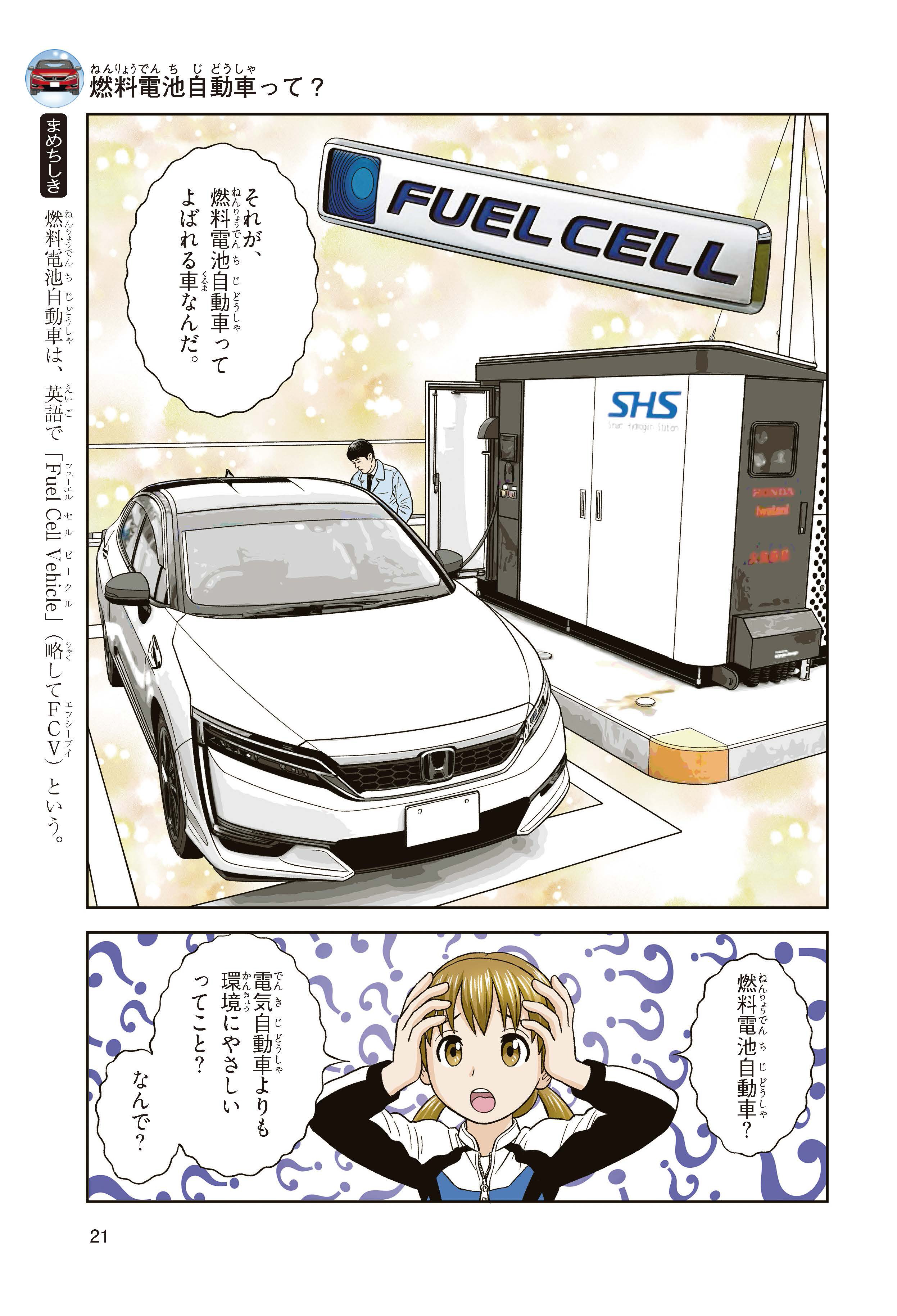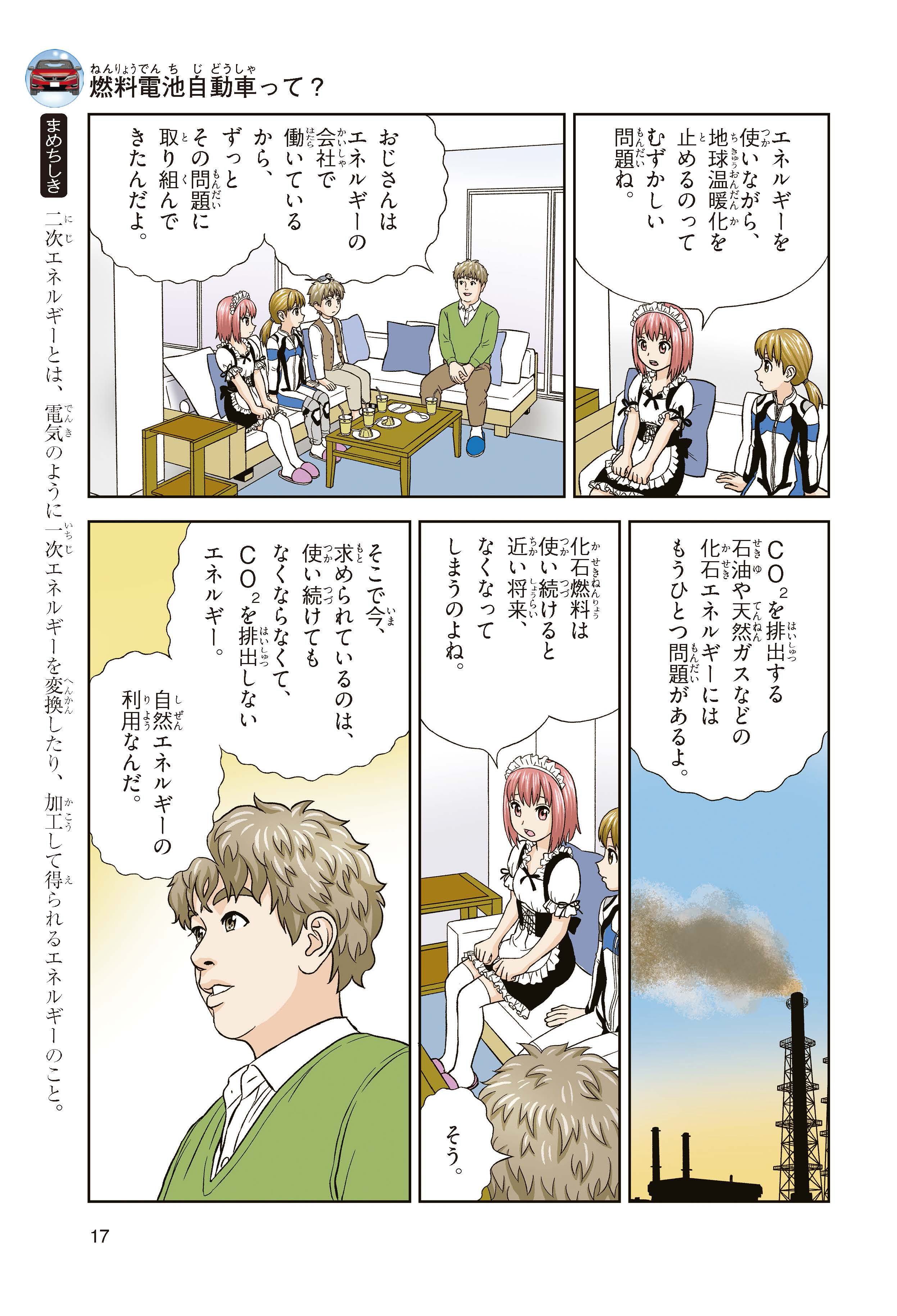 春休み、小学5年生のコウタのいとこ・アユミが遊びにくることに。同級生のミキといっしょに東京案内中、異常気象(いじょうきしょう)で停電が起こって、電気の大切さを改めて知るよ。そこで聞いたのが「燃料電池自動車」。水素という気体が燃料で、「究極のエコカー(地球にやさしい車)」と言われているんだって。電気をつくることもできて、移動発電機としての役割も期待されているんだよ。この本でひみつを探ろう!