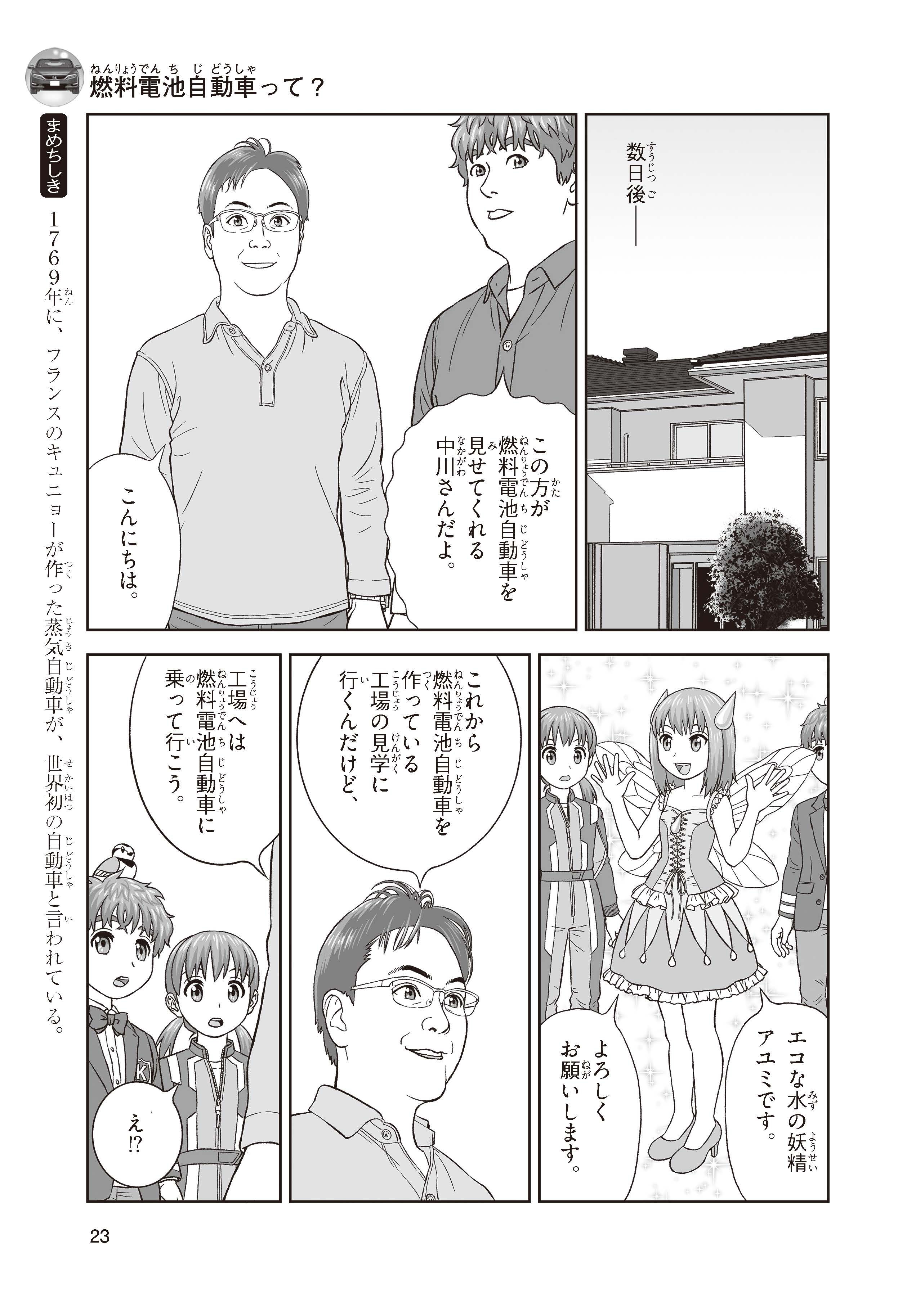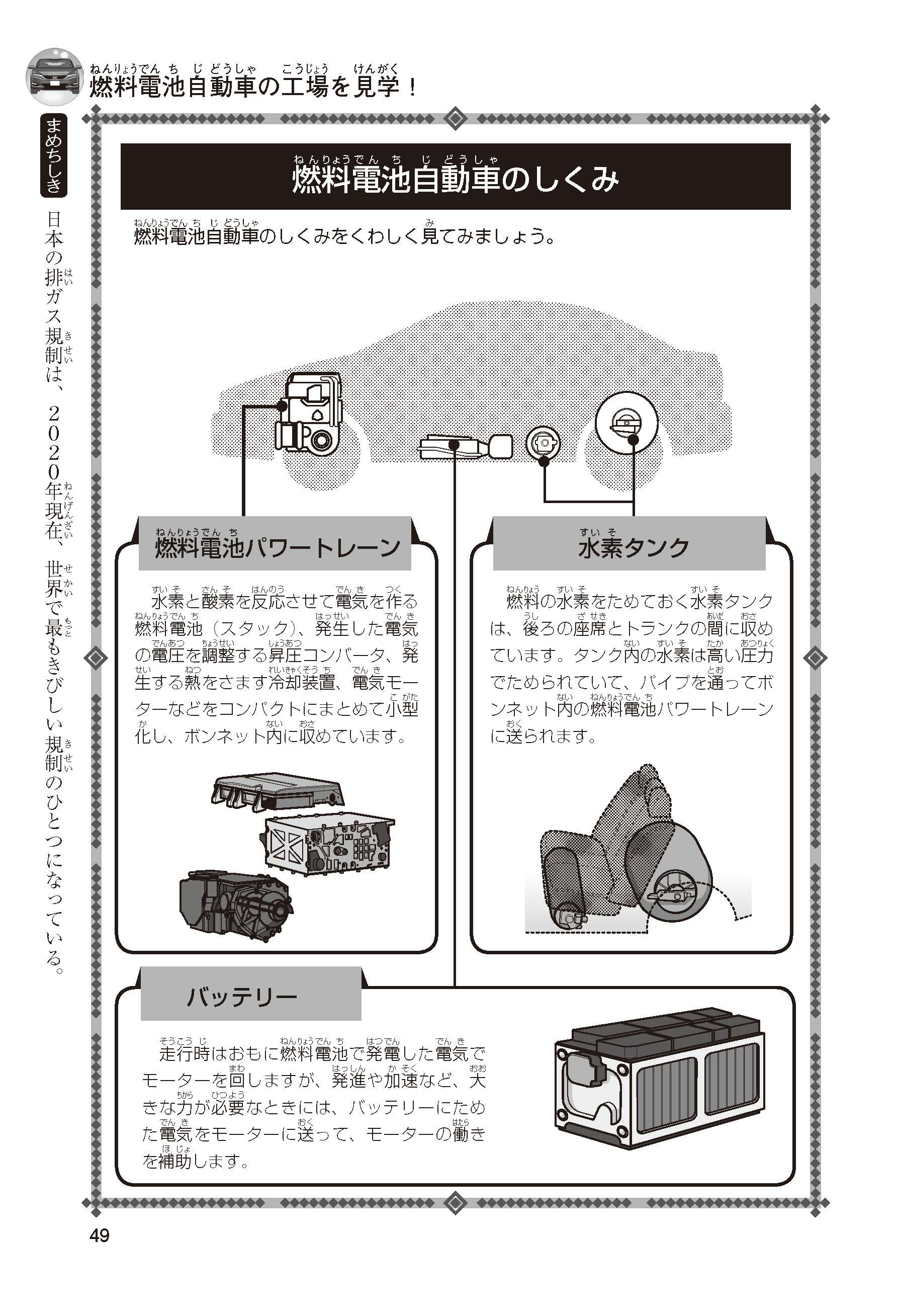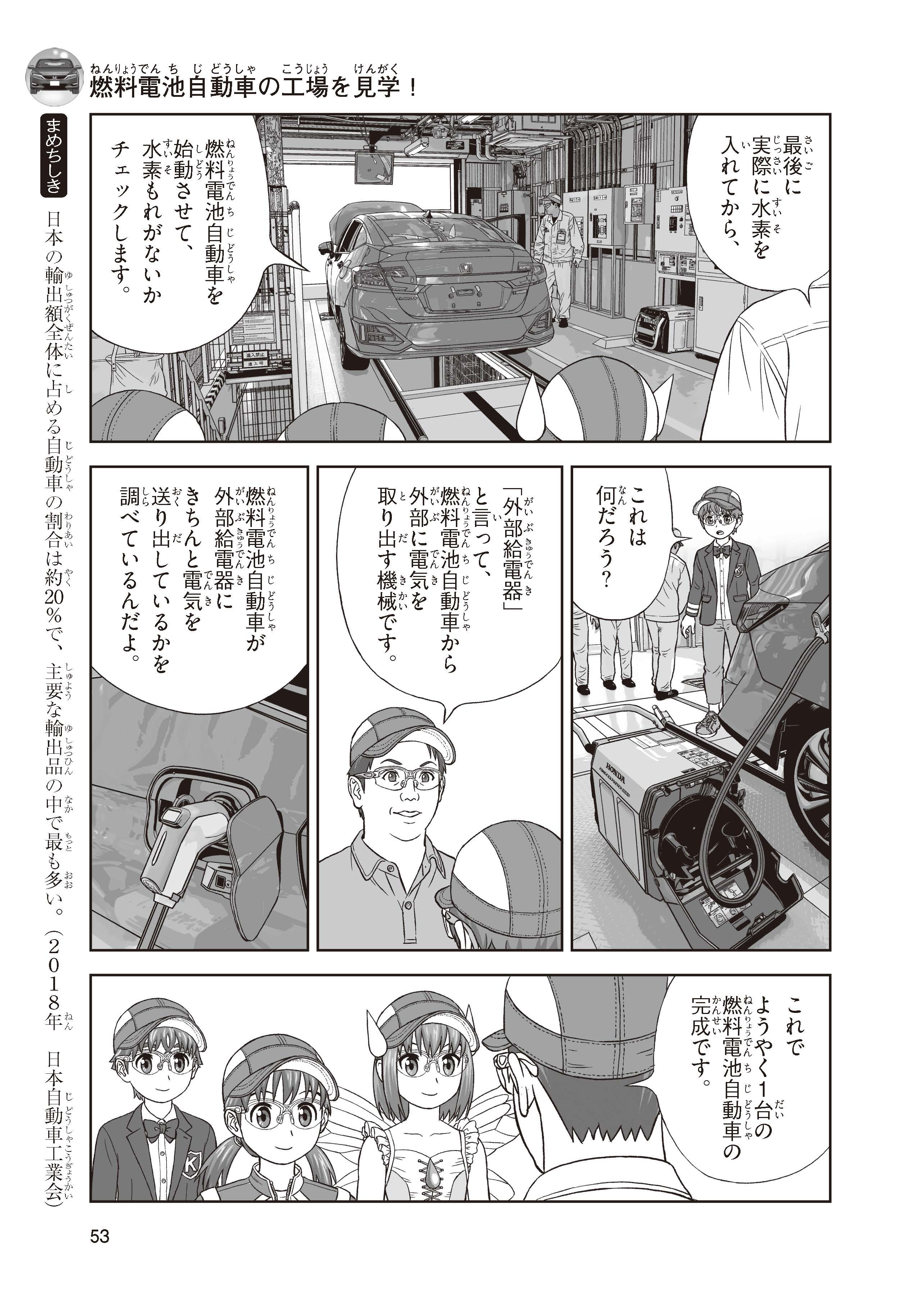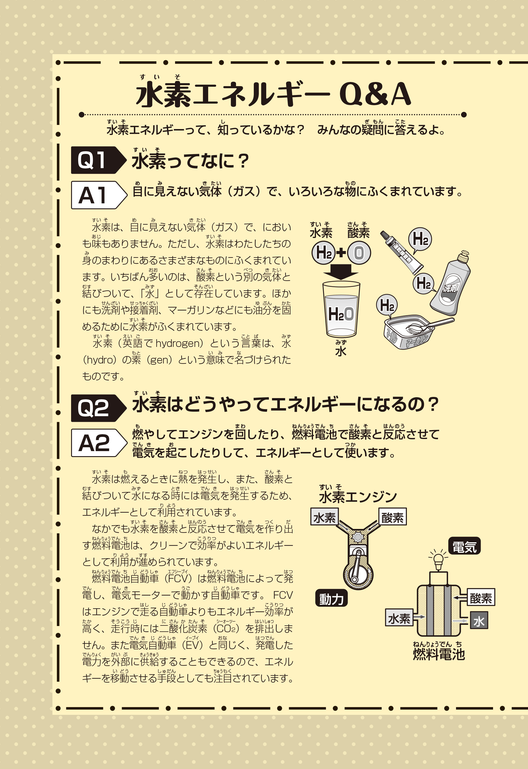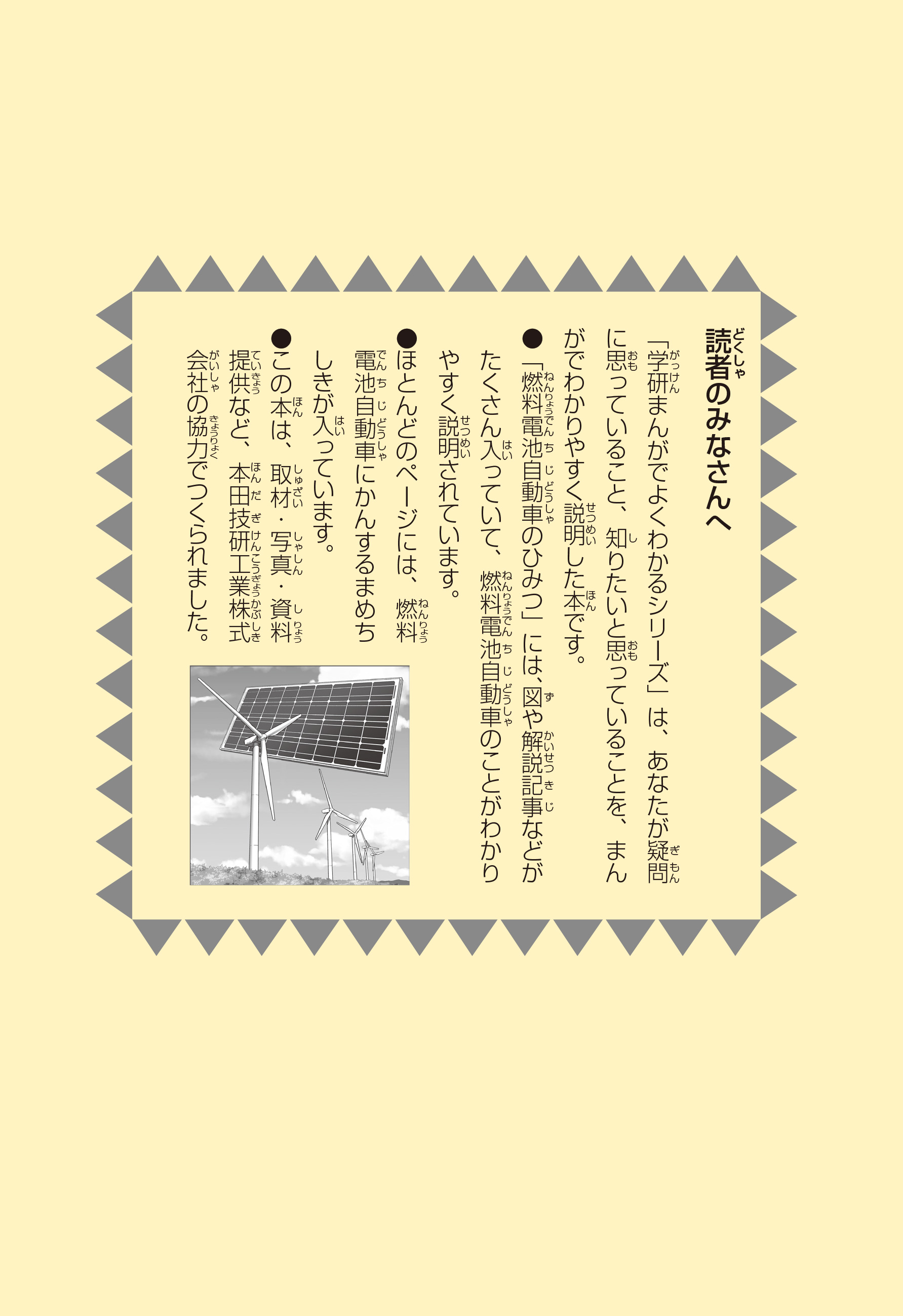 春休み、小学5年生のコウタのいとこ・アユミが遊びにくることに。同級生のミキといっしょに東京案内中、異常気象(いじょうきしょう)で停電が起こって、電気の大切さを改めて知るよ。そこで聞いたのが「燃料電池自動車」。水素という気体が燃料で、「究極のエコカー(地球にやさしい車)」と言われているんだって。電気をつくることもできて、移動発電機としての役割も期待されているんだよ。この本でひみつを探ろう!