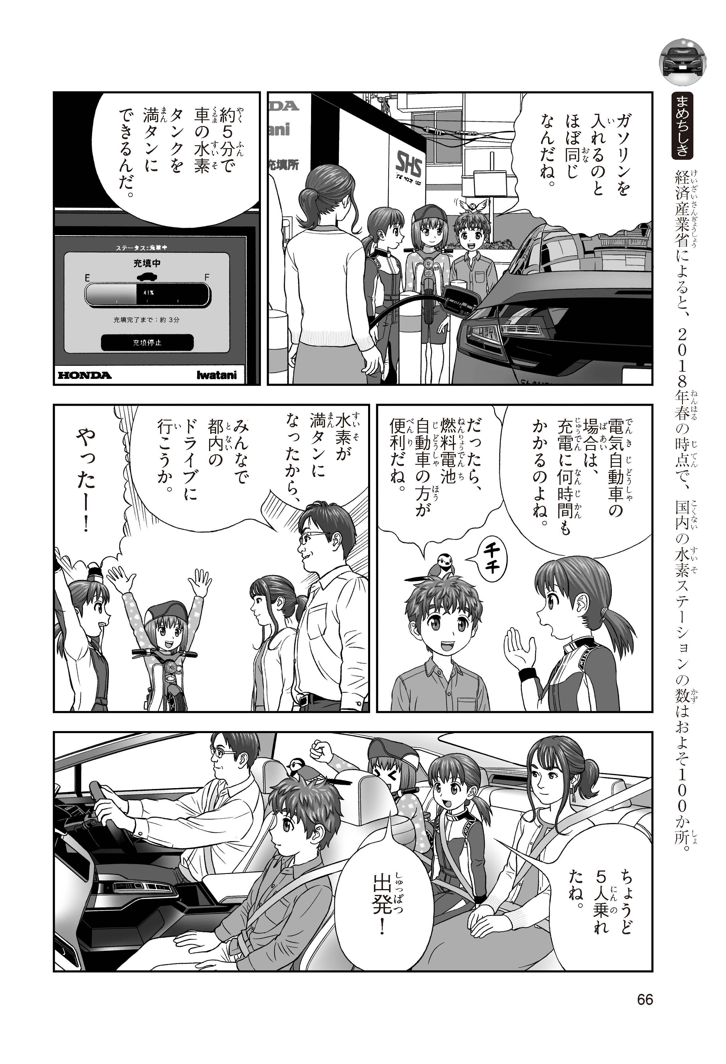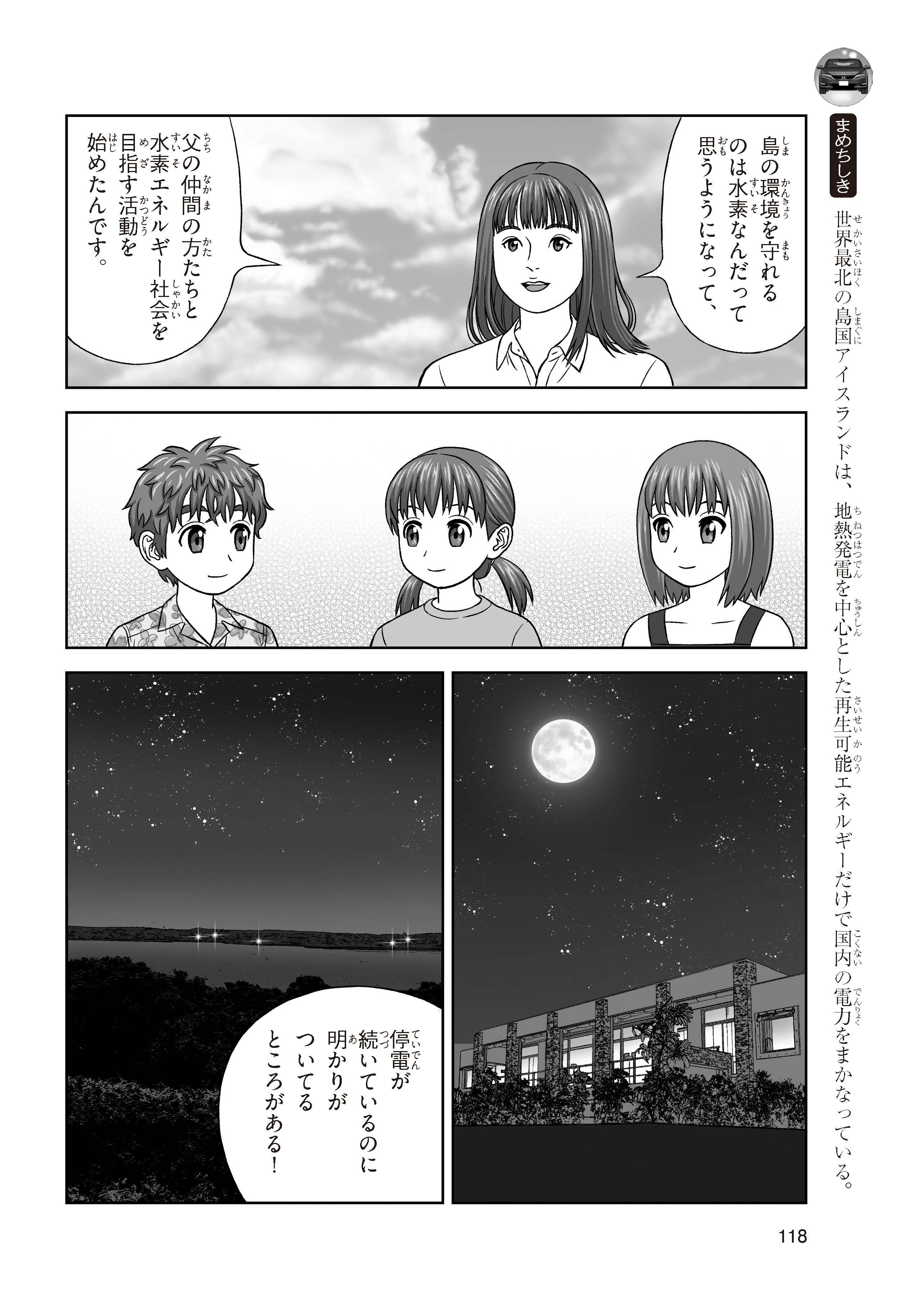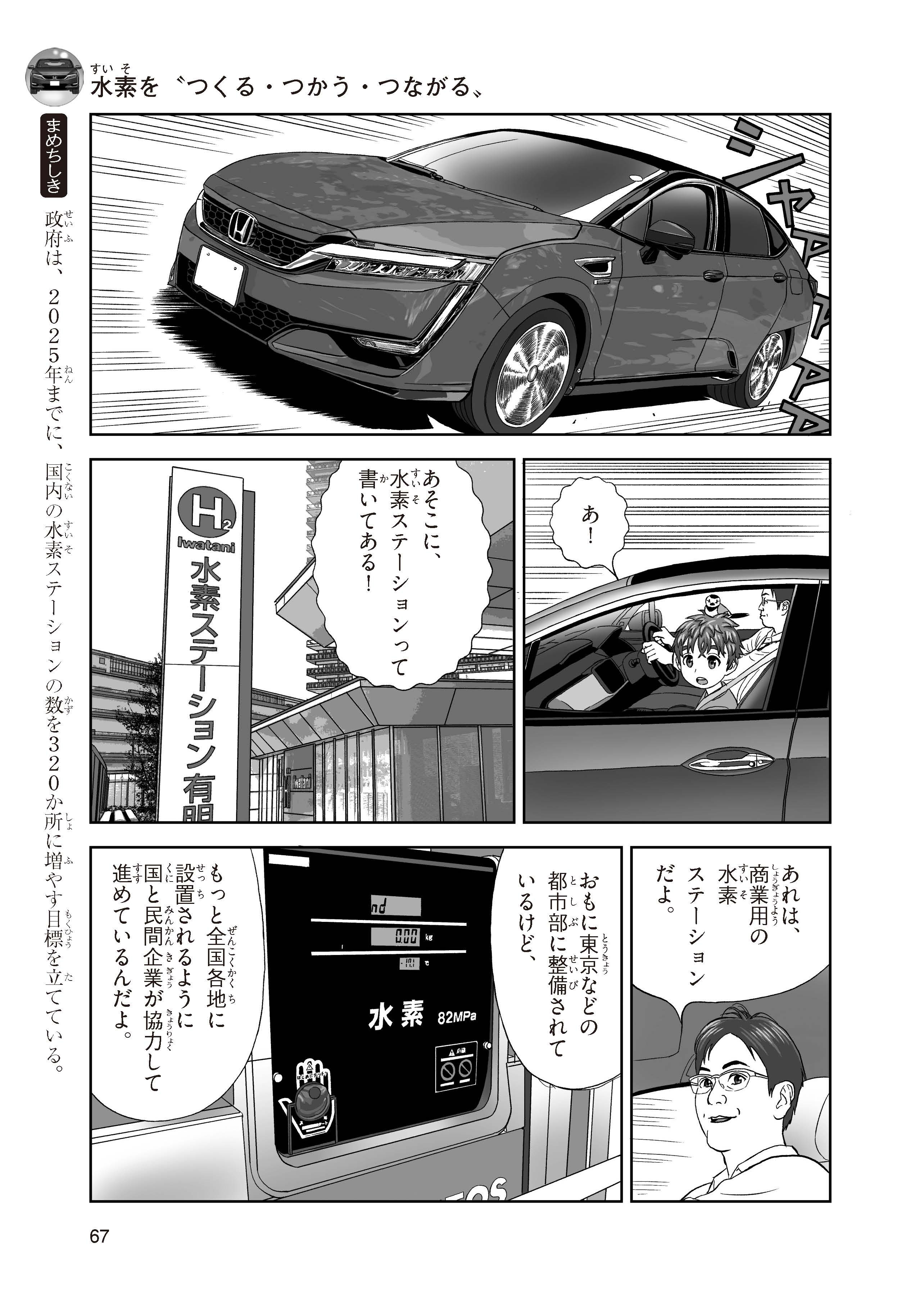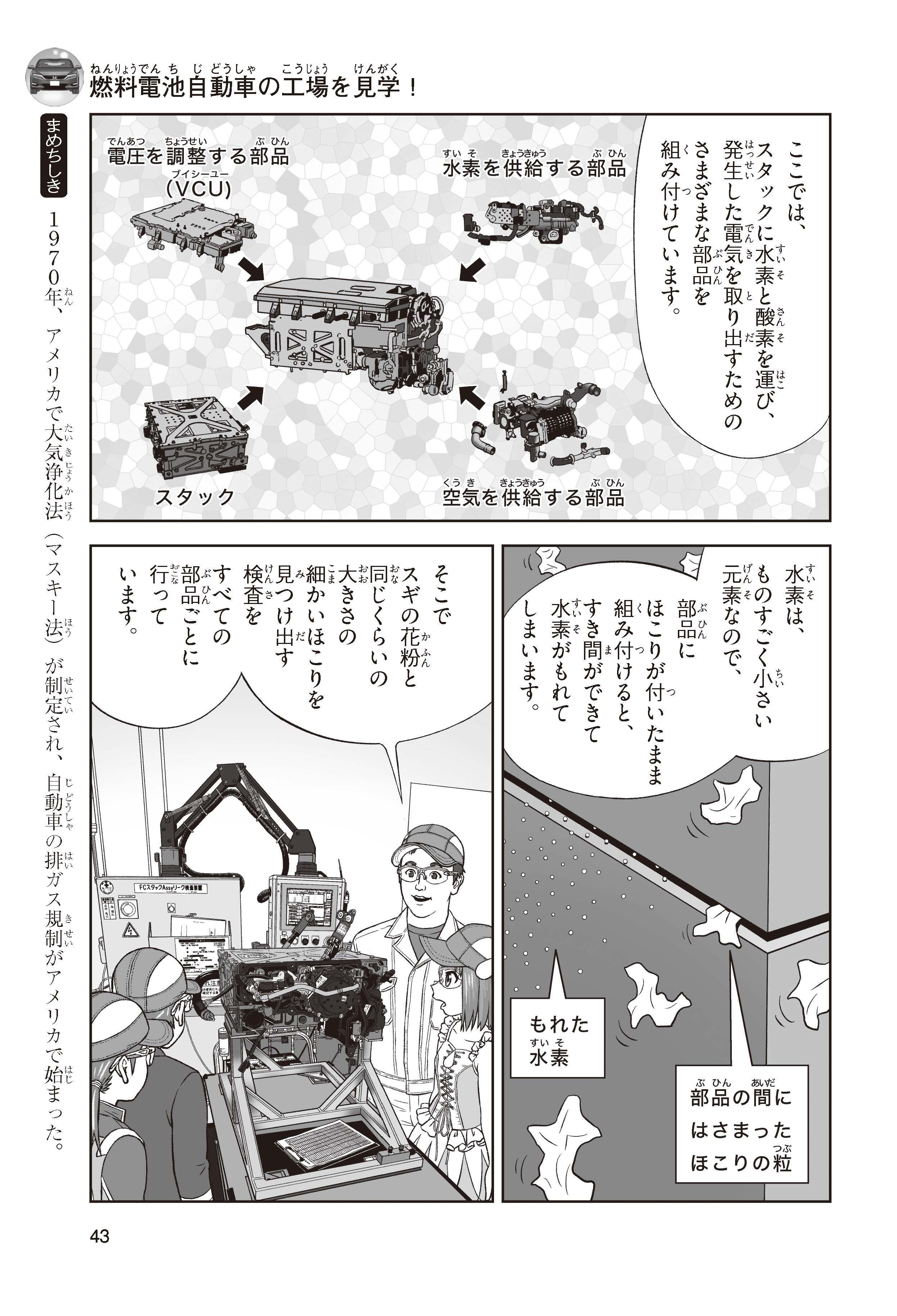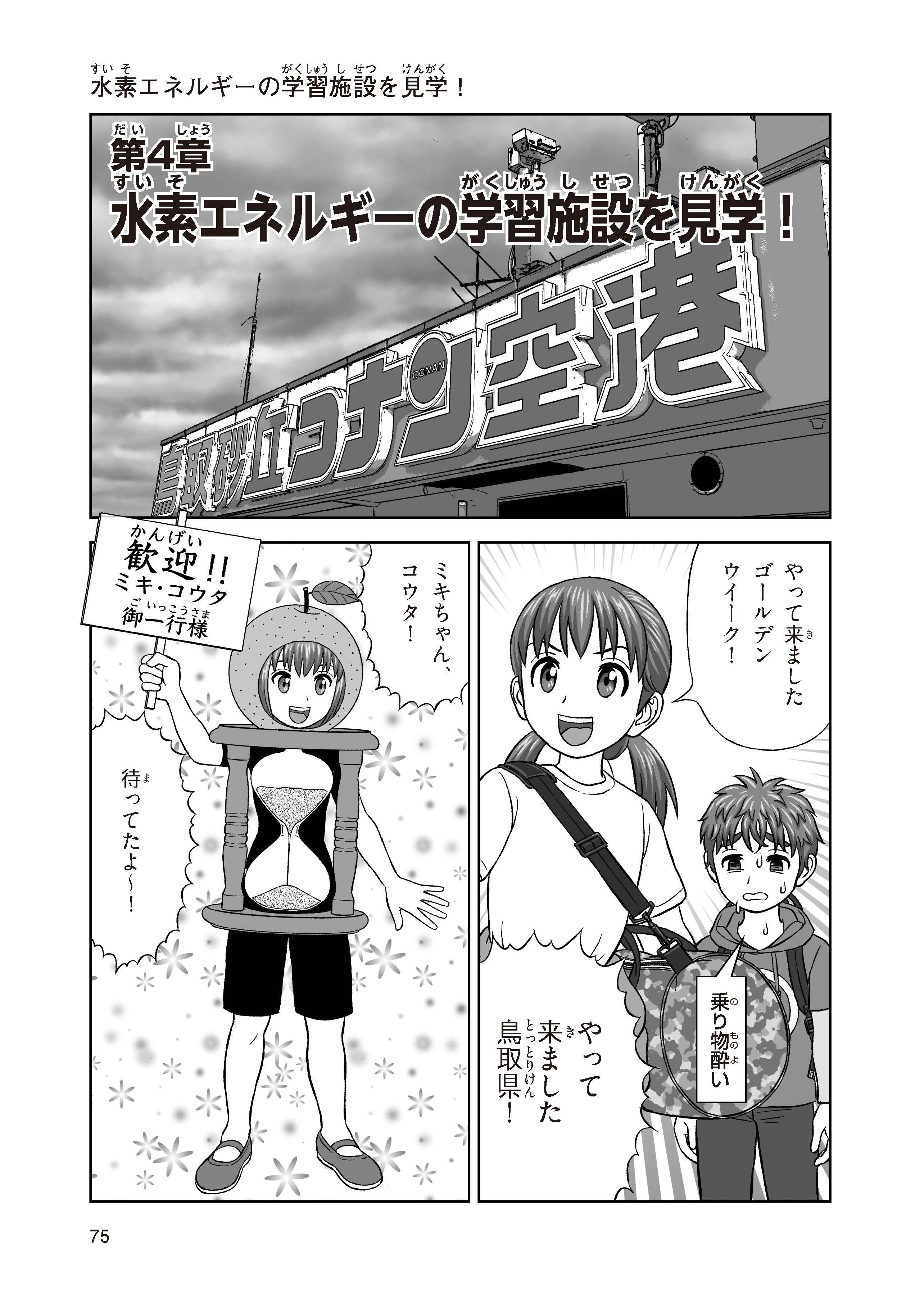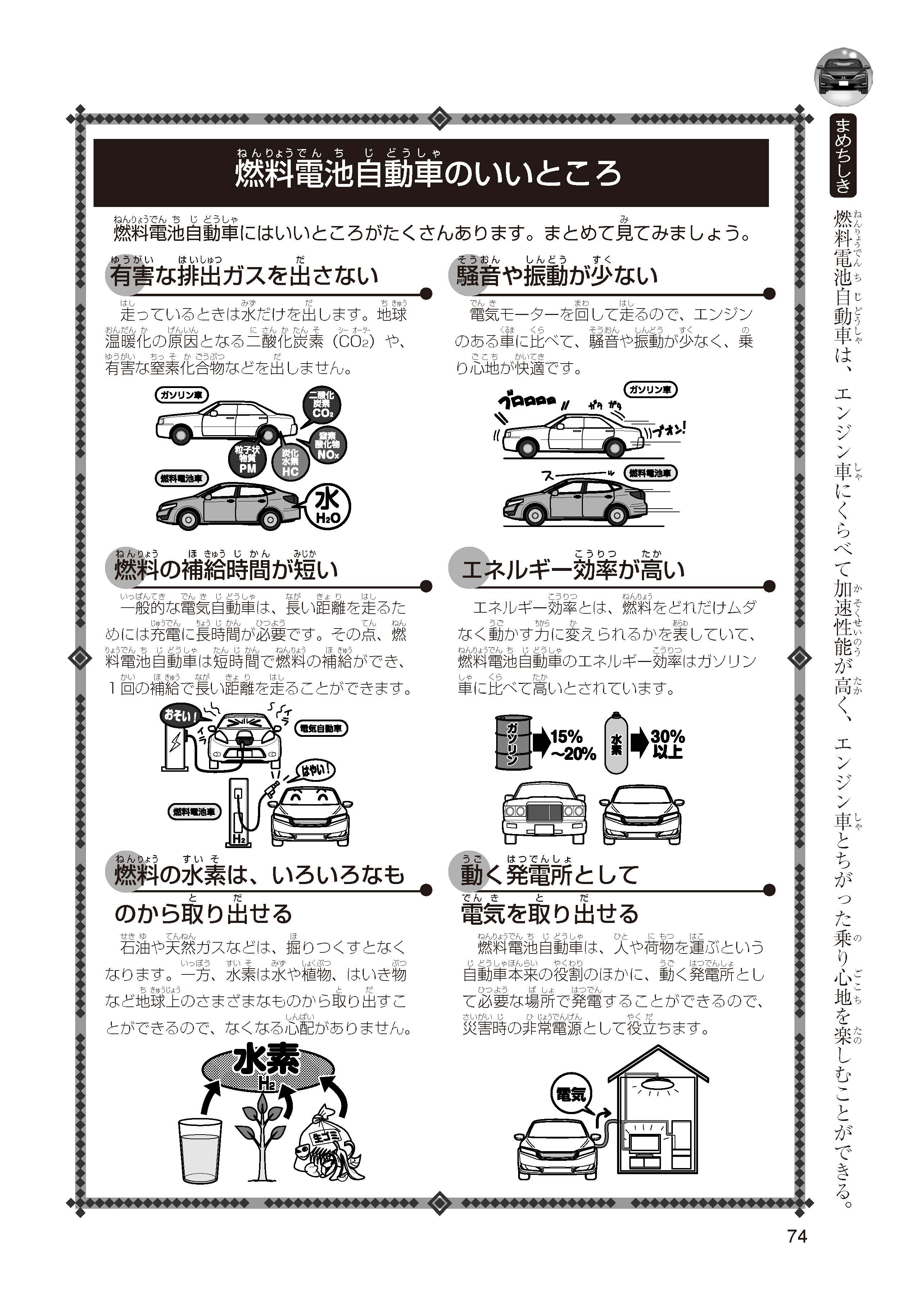 春休み、小学5年生のコウタのいとこ・アユミが遊びにくることに。同級生のミキといっしょに東京案内中、異常気象(いじょうきしょう)で停電が起こって、電気の大切さを改めて知るよ。そこで聞いたのが「燃料電池自動車」。水素という気体が燃料で、「究極のエコカー(地球にやさしい車)」と言われているんだって。電気をつくることもできて、移動発電機としての役割も期待されているんだよ。この本でひみつを探ろう!