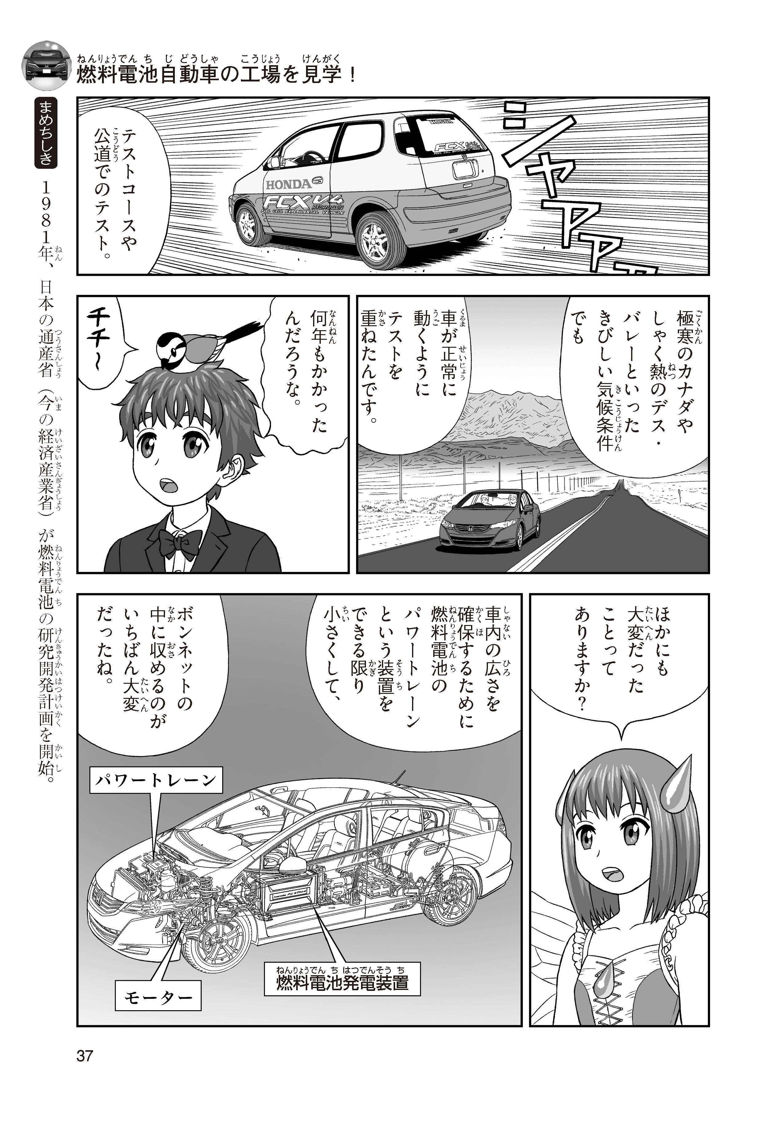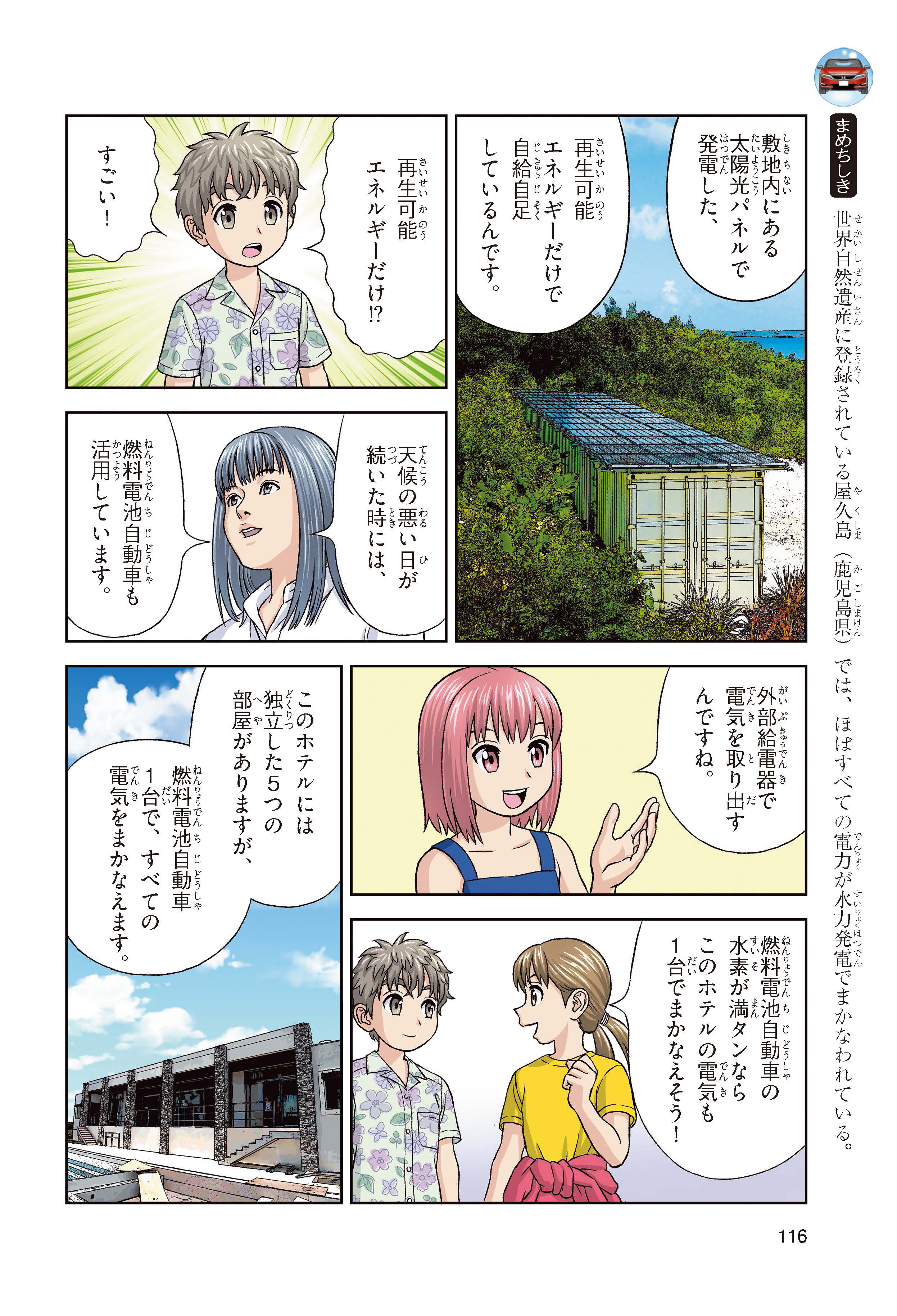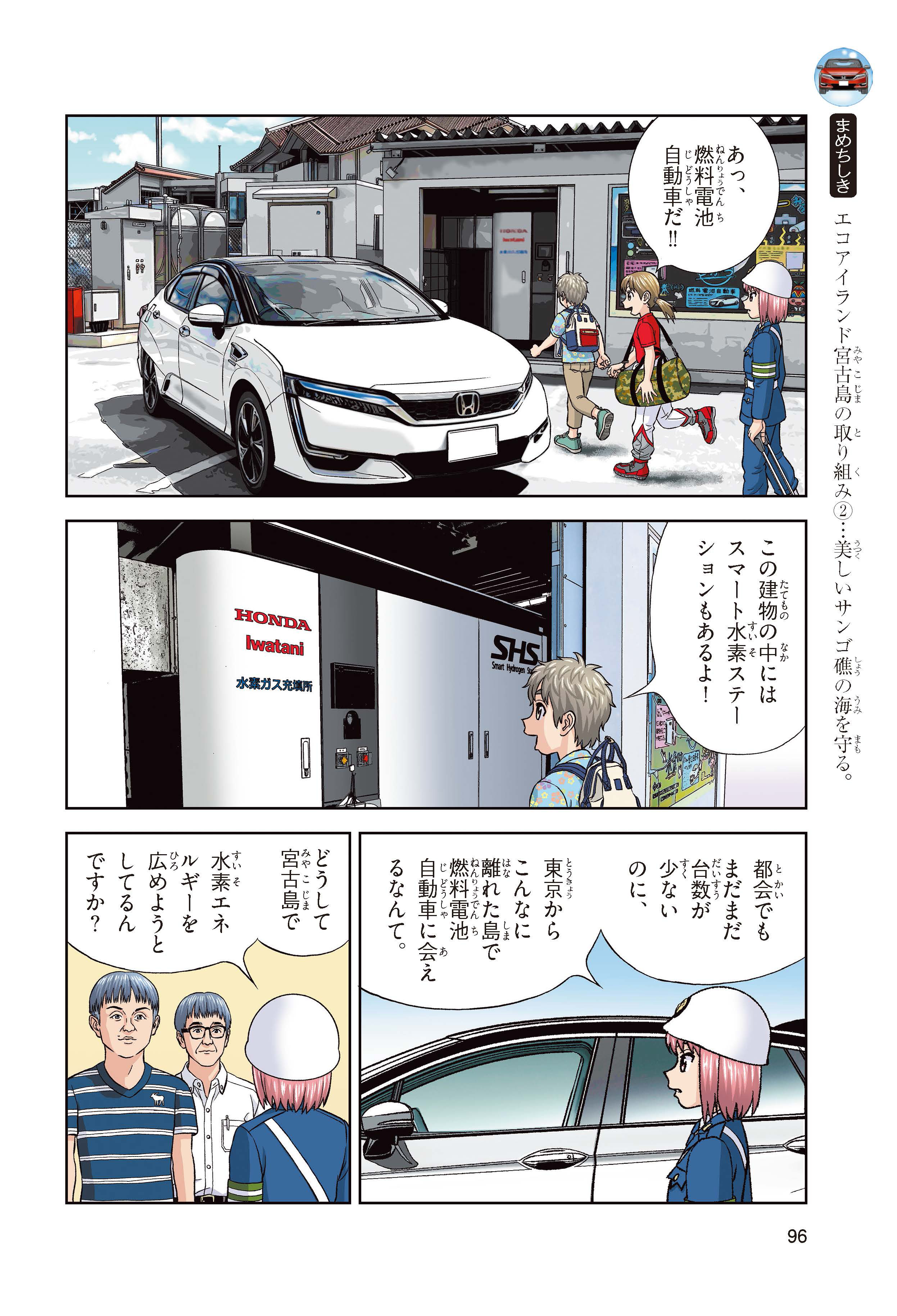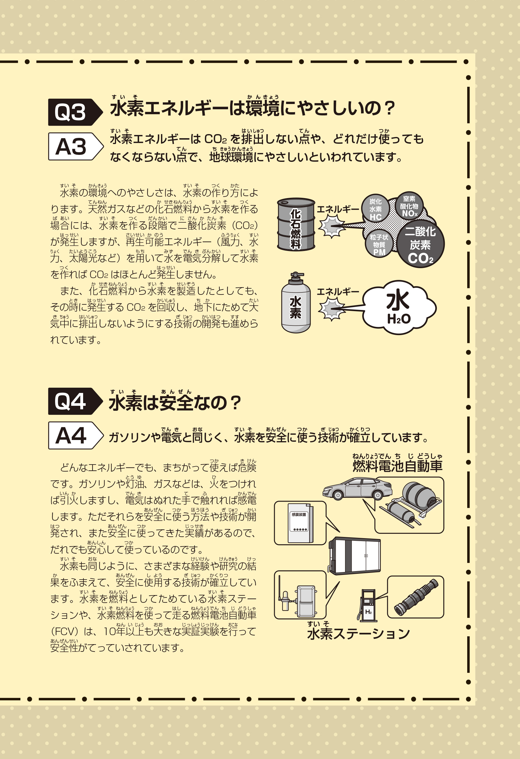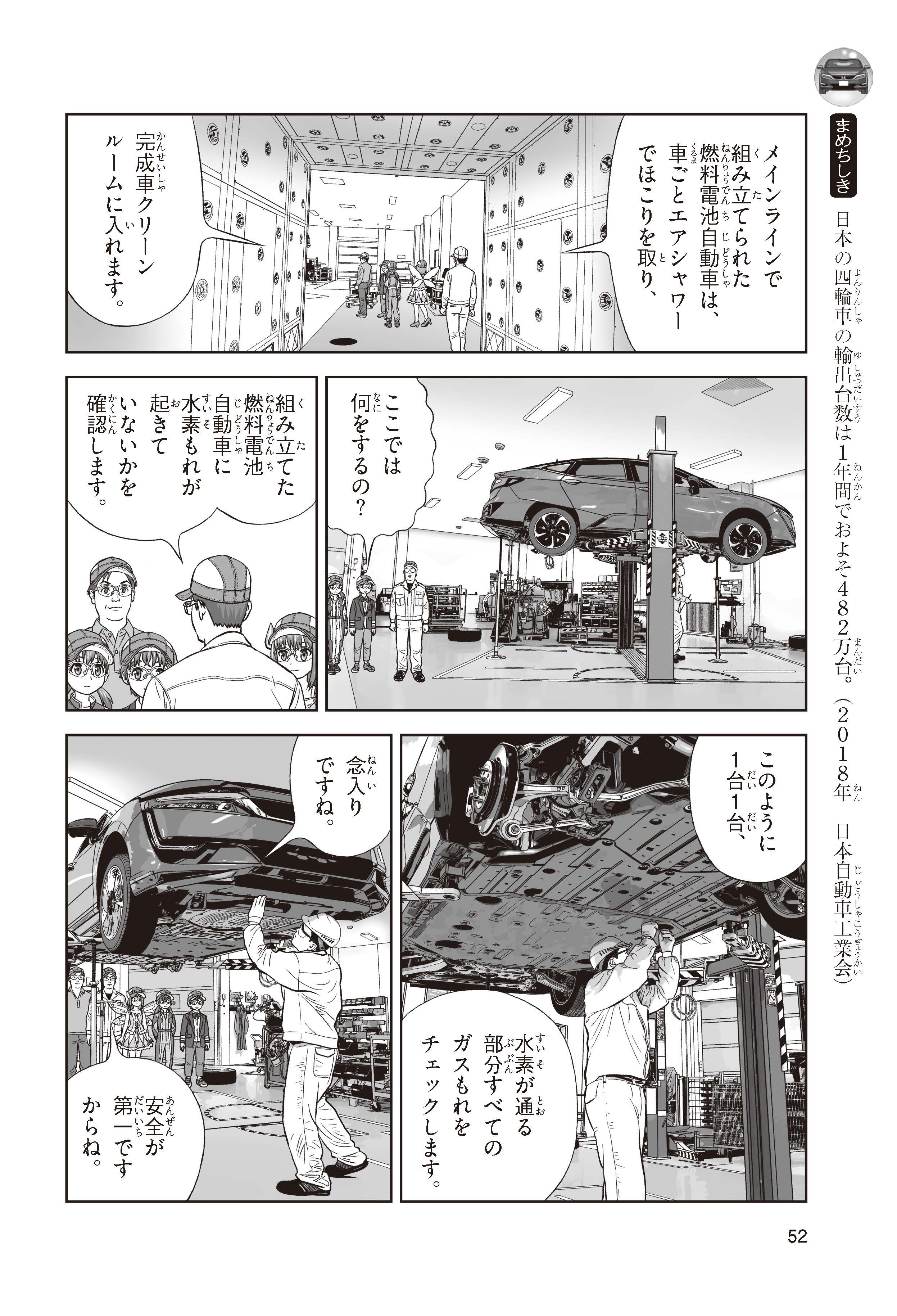春休み、小学5年生のコウタのいとこ・アユミが遊びにくることに。同級生のミキといっしょに東京案内中、異常気象(いじょうきしょう)で停電が起こって、電気の大切さを改めて知るよ。そこで聞いたのが「燃料電池自動車」。水素という気体が燃料で、「究極のエコカー(地球にやさしい車)」と言われているんだって。電気をつくることもできて、移動発電機としての役割も期待されているんだよ。この本でひみつを探ろう!