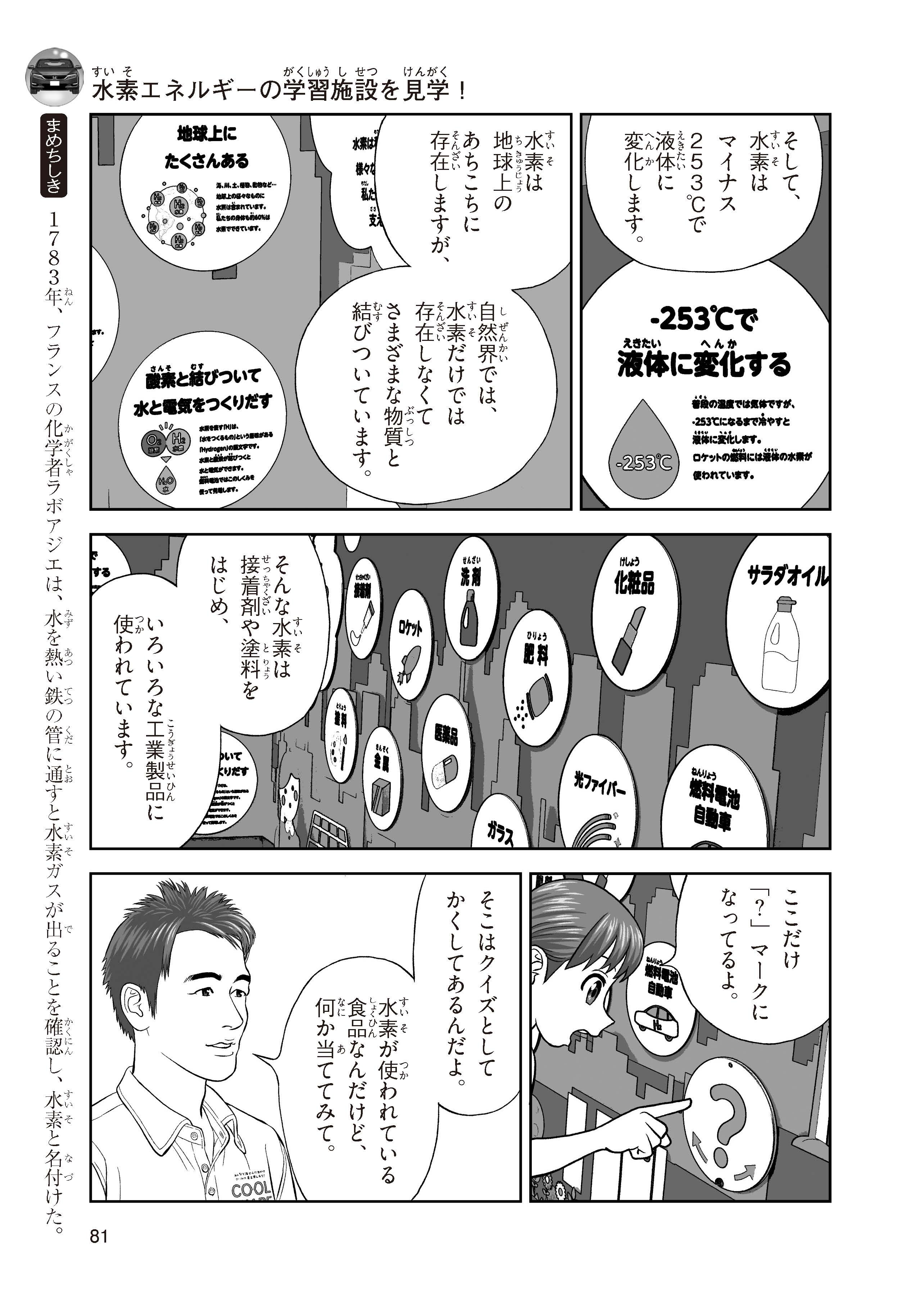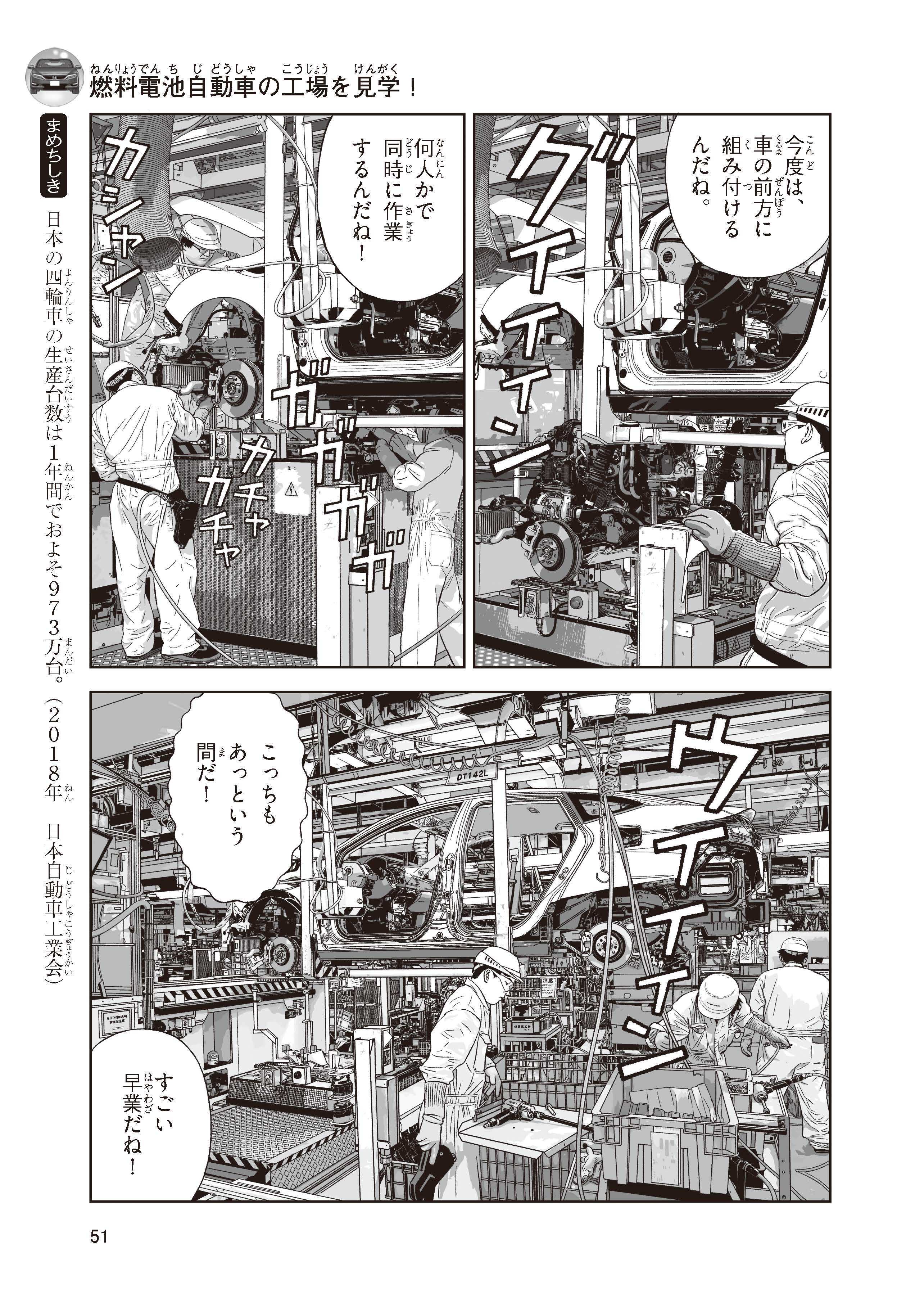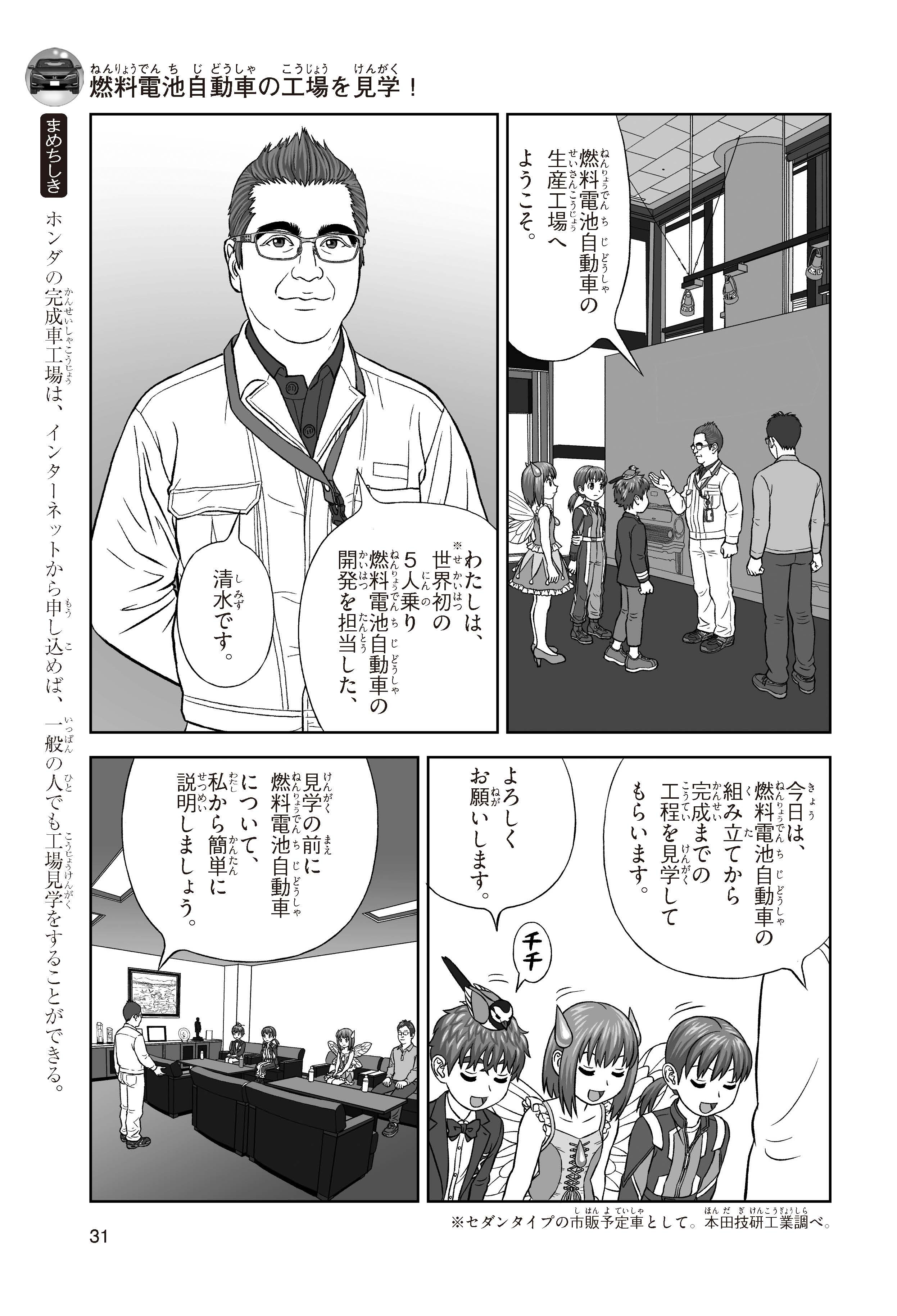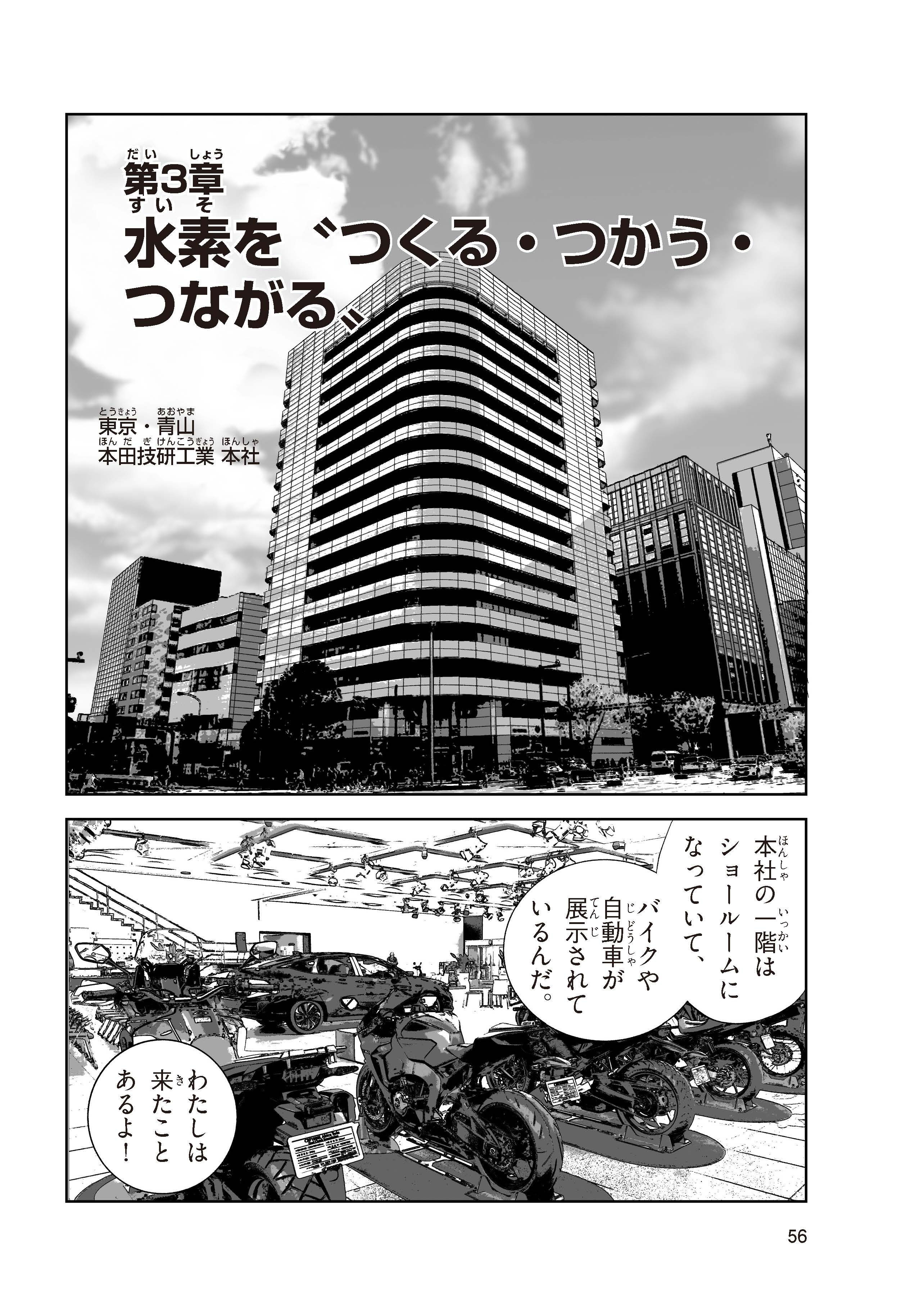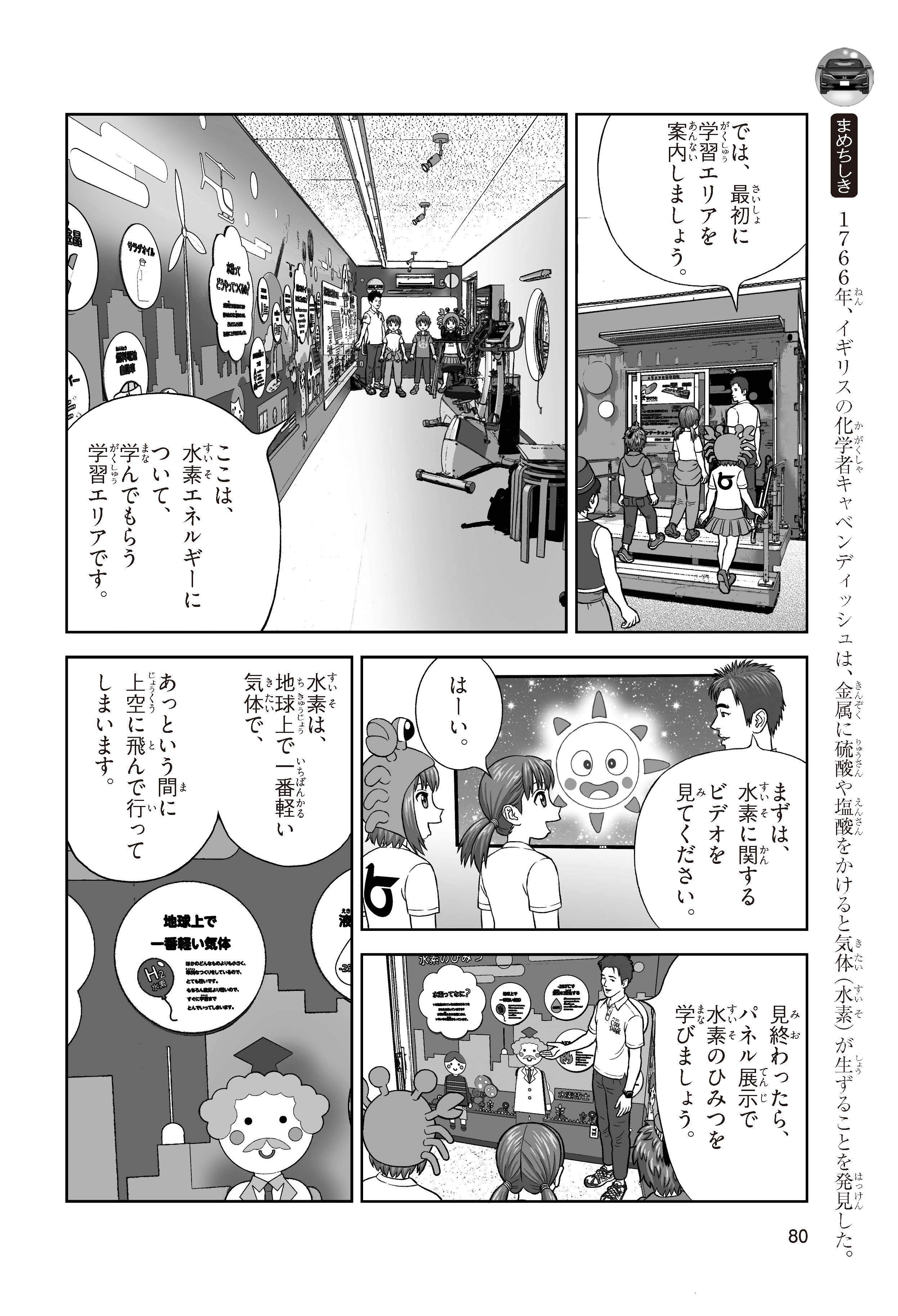 春休み、小学5年生のコウタのいとこ・アユミが遊びにくることに。同級生のミキといっしょに東京案内中、異常気象(いじょうきしょう)で停電が起こって、電気の大切さを改めて知るよ。そこで聞いたのが「燃料電池自動車」。水素という気体が燃料で、「究極のエコカー(地球にやさしい車)」と言われているんだって。電気をつくることもできて、移動発電機としての役割も期待されているんだよ。この本でひみつを探ろう!