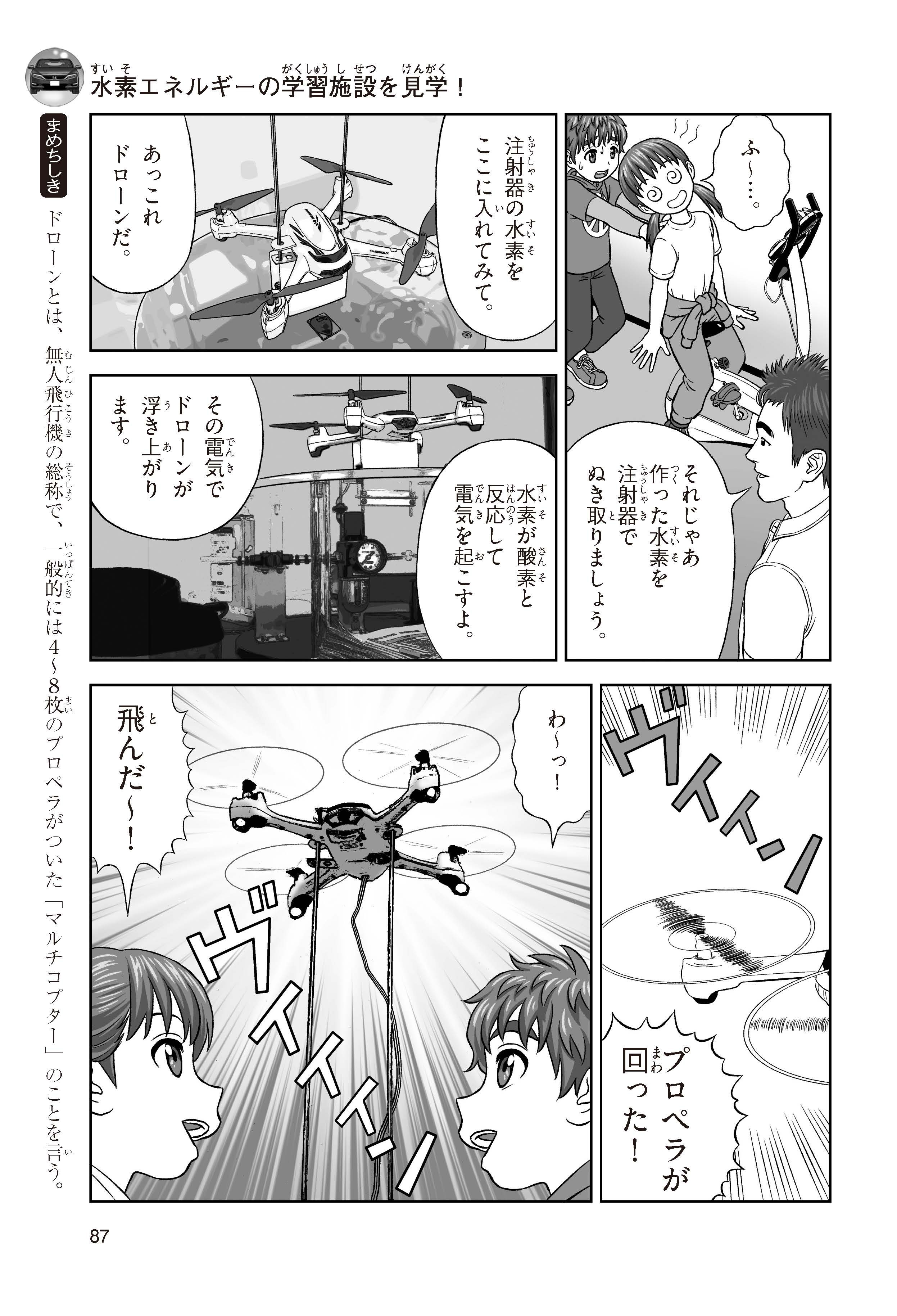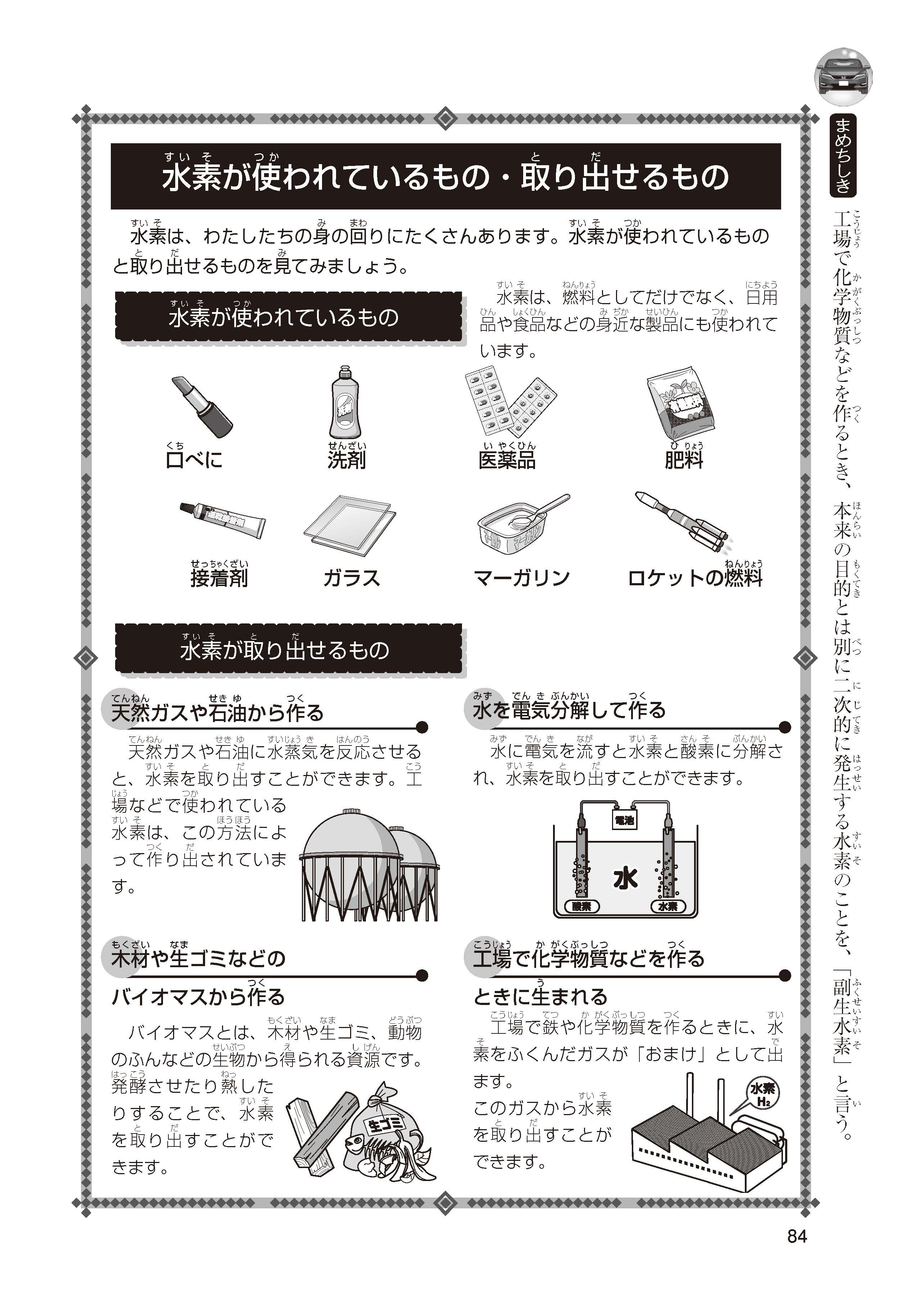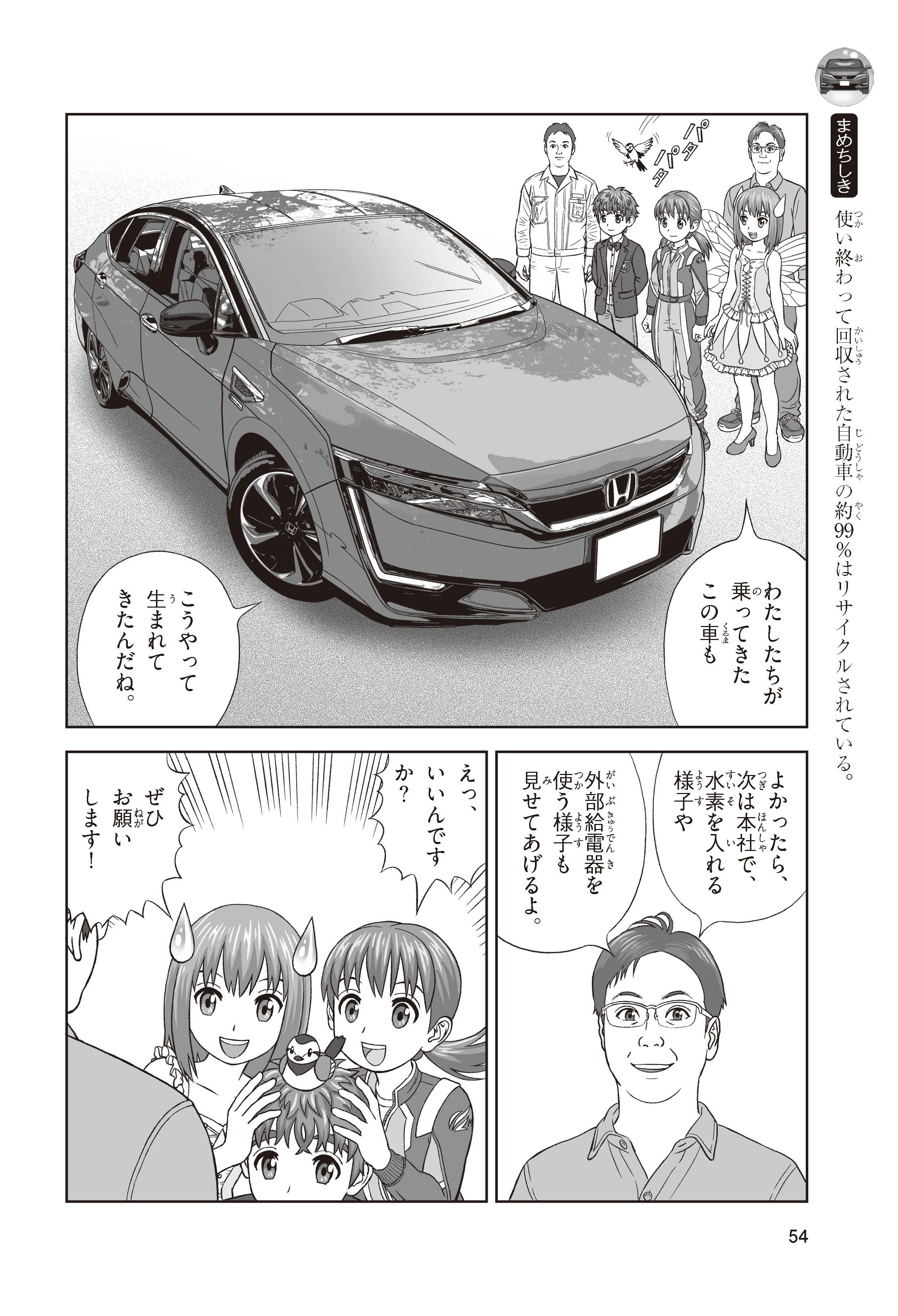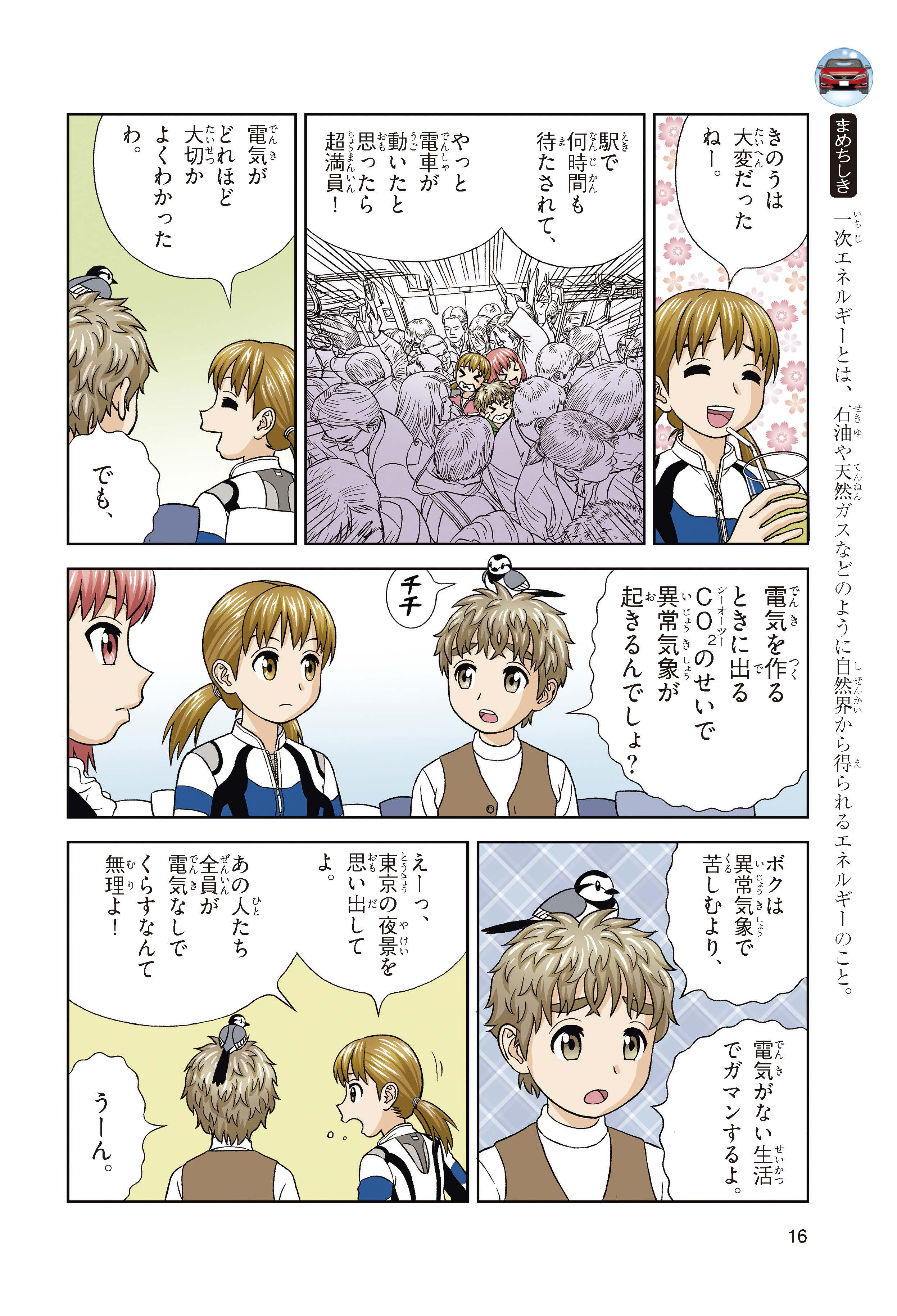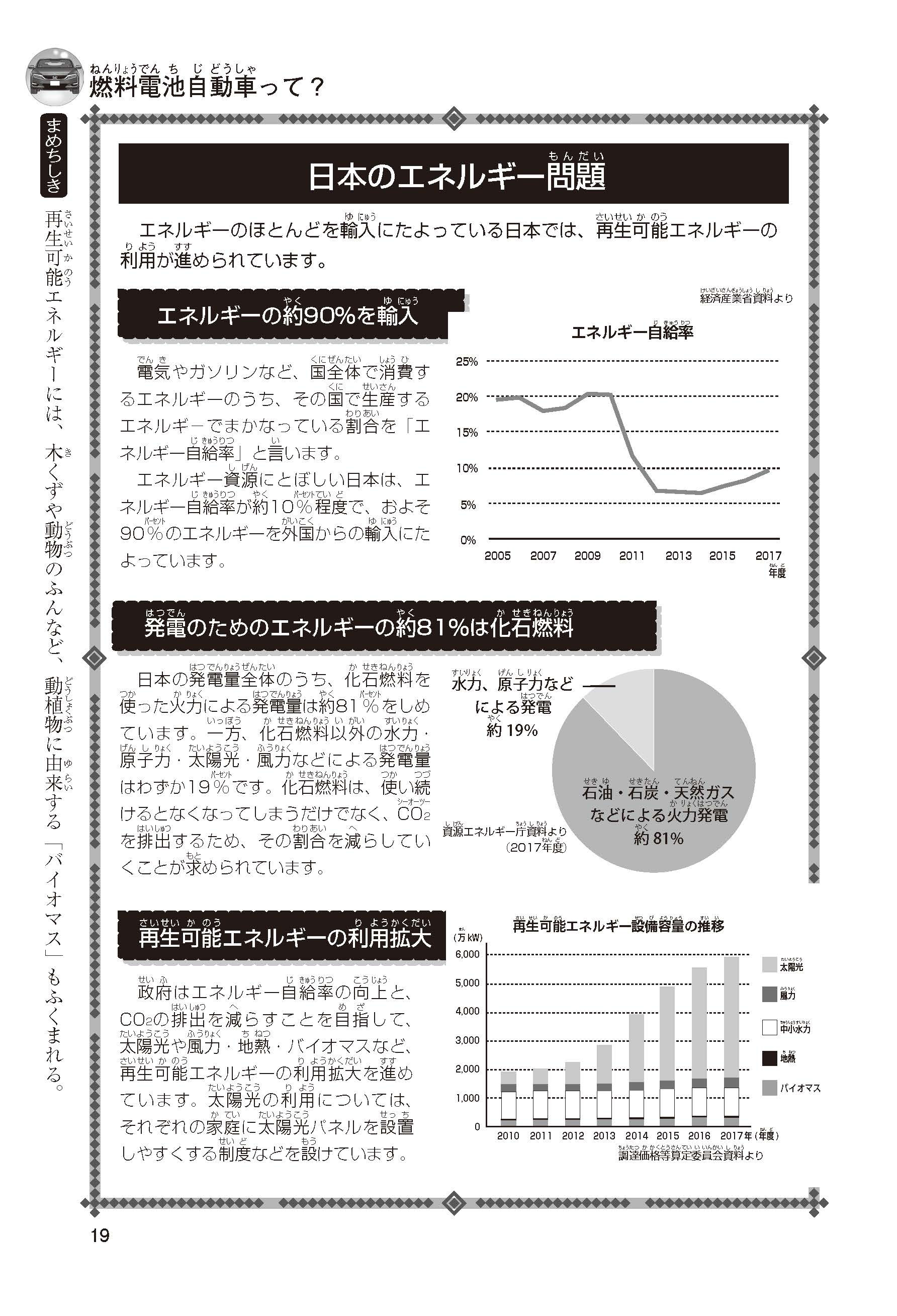 春休み、小学5年生のコウタのいとこ・アユミが遊びにくることに。同級生のミキといっしょに東京案内中、異常気象(いじょうきしょう)で停電が起こって、電気の大切さを改めて知るよ。そこで聞いたのが「燃料電池自動車」。水素という気体が燃料で、「究極のエコカー(地球にやさしい車)」と言われているんだって。電気をつくることもできて、移動発電機としての役割も期待されているんだよ。この本でひみつを探ろう!