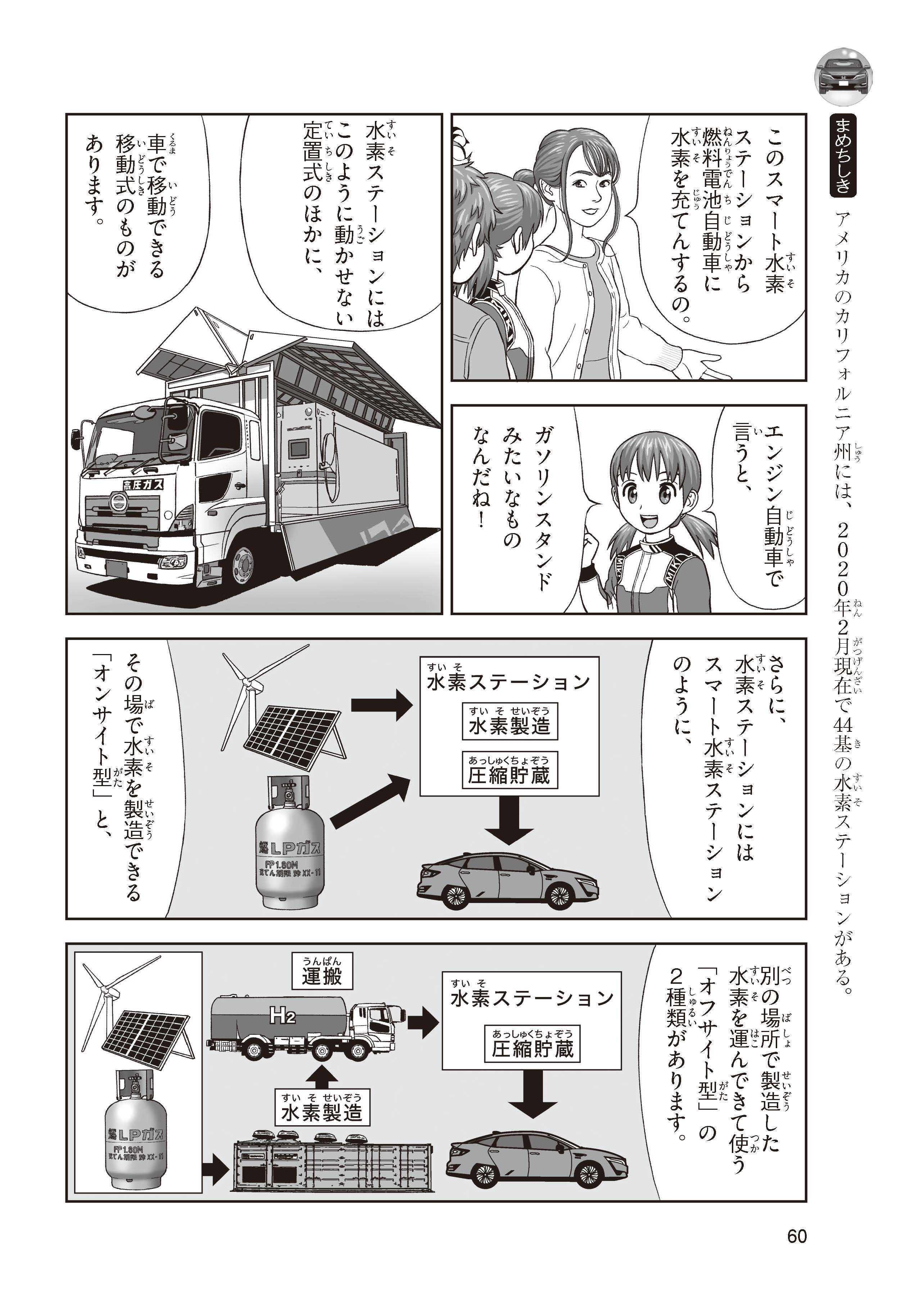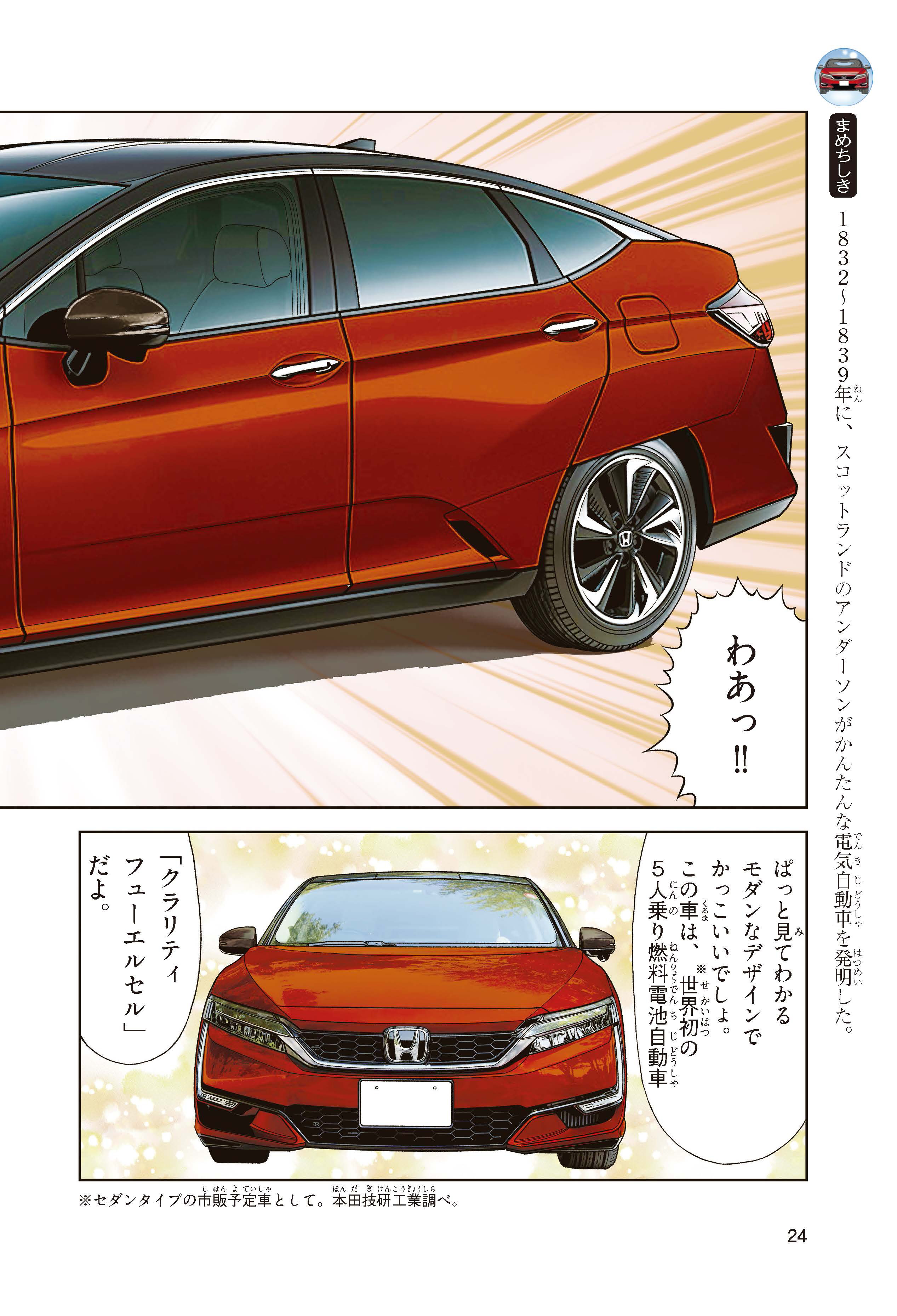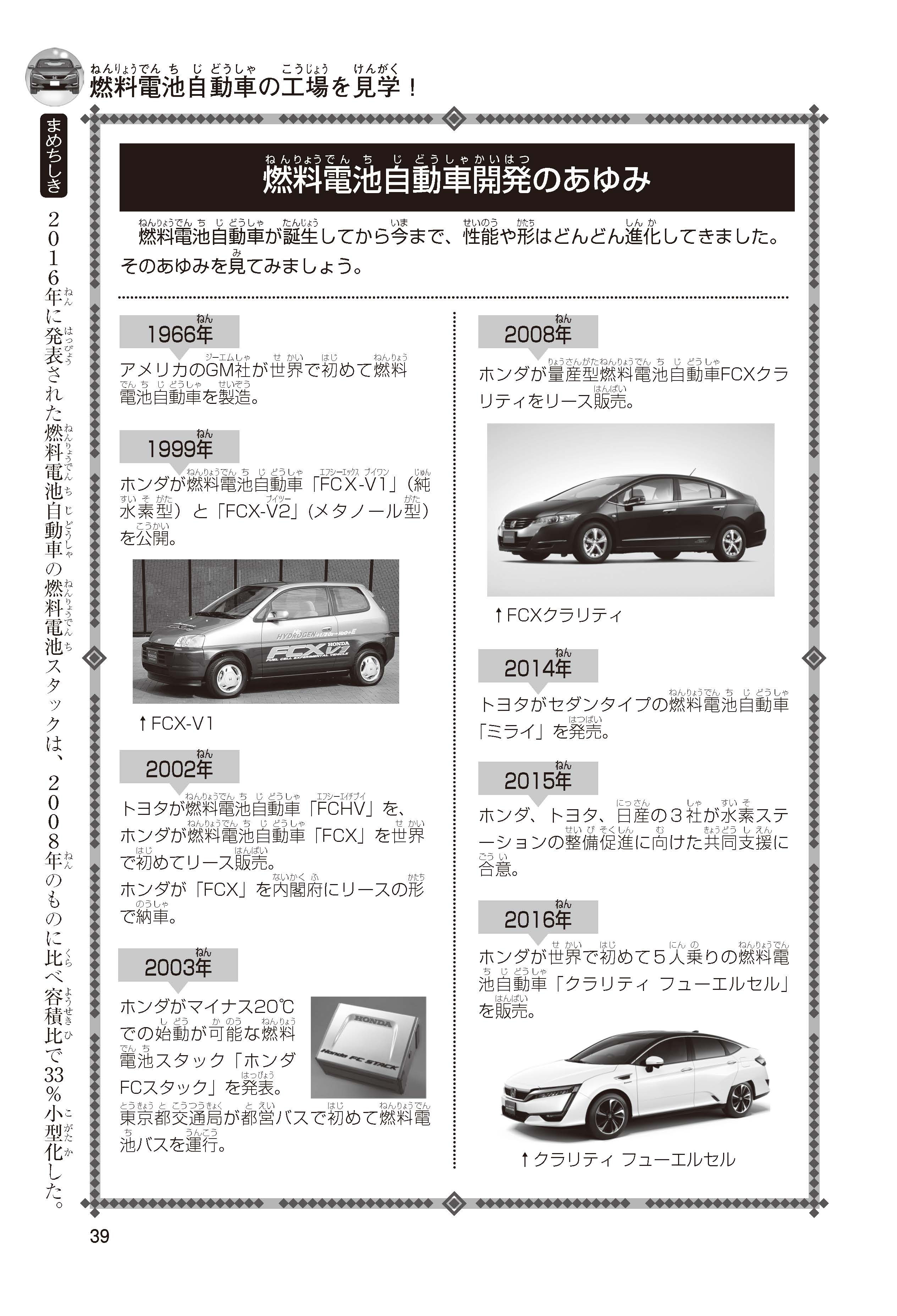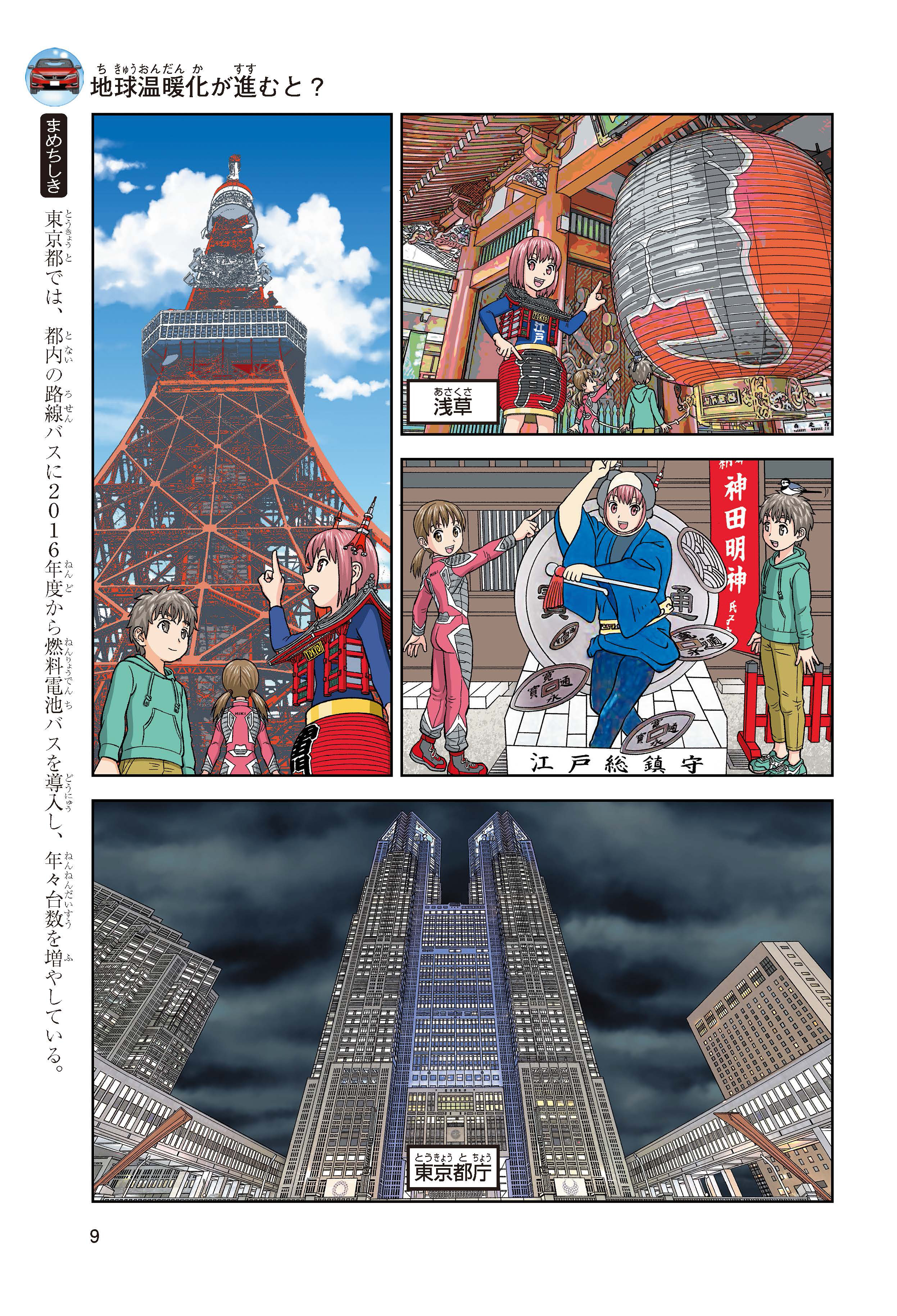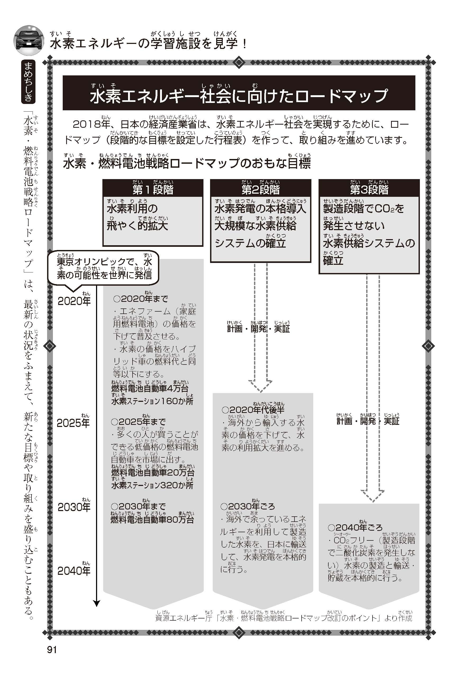 春休み、小学5年生のコウタのいとこ・アユミが遊びにくることに。同級生のミキといっしょに東京案内中、異常気象(いじょうきしょう)で停電が起こって、電気の大切さを改めて知るよ。そこで聞いたのが「燃料電池自動車」。水素という気体が燃料で、「究極のエコカー(地球にやさしい車)」と言われているんだって。電気をつくることもできて、移動発電機としての役割も期待されているんだよ。この本でひみつを探ろう!