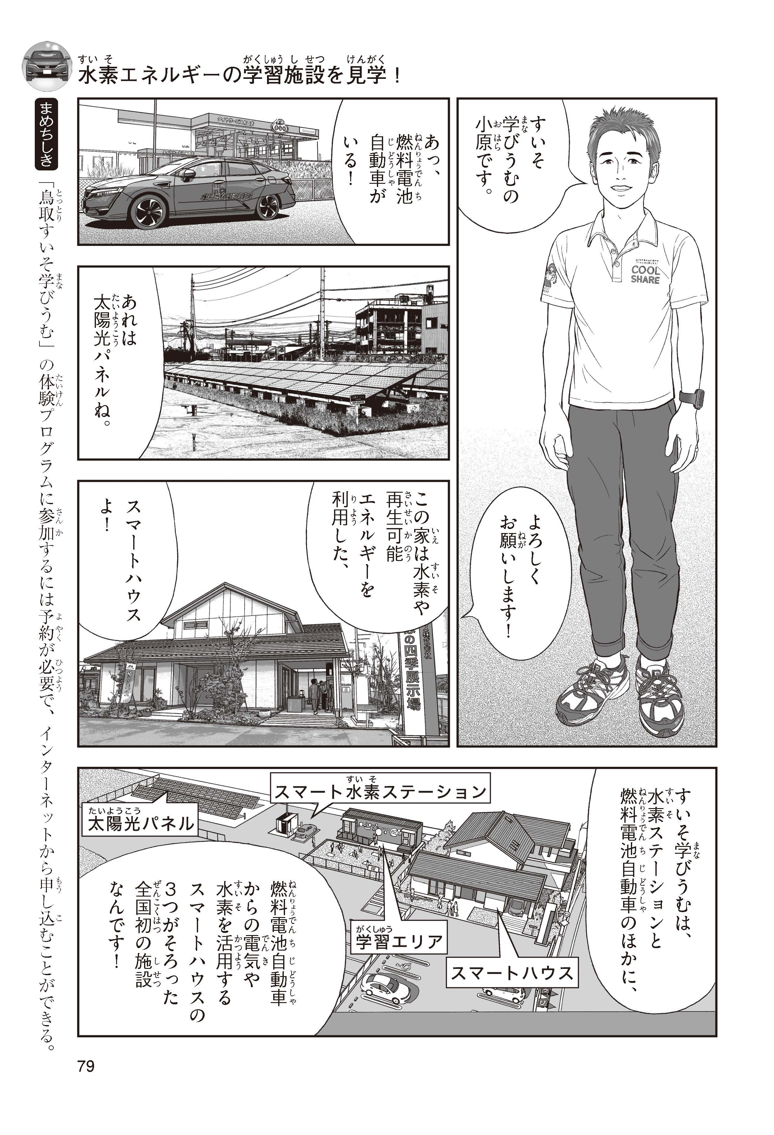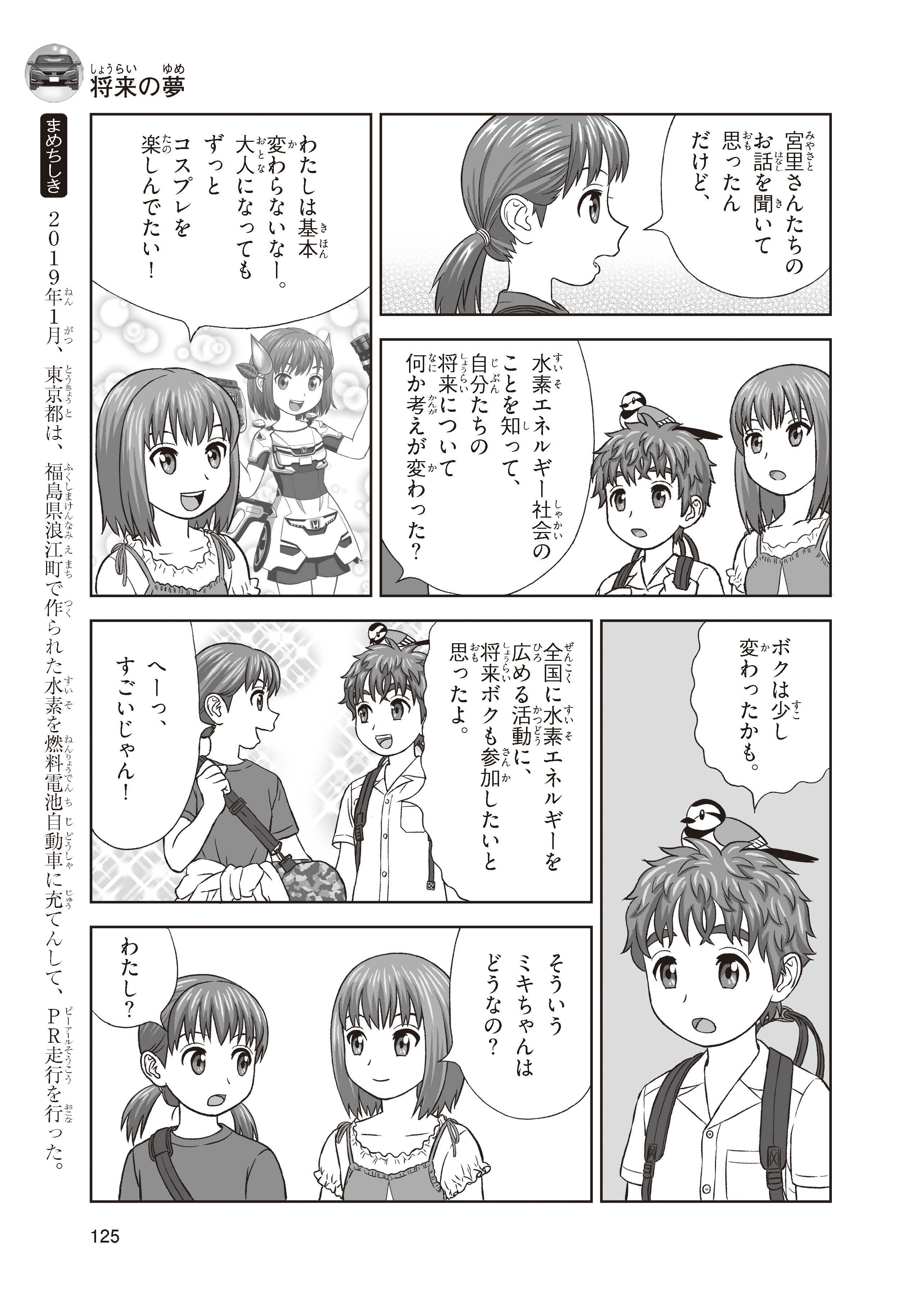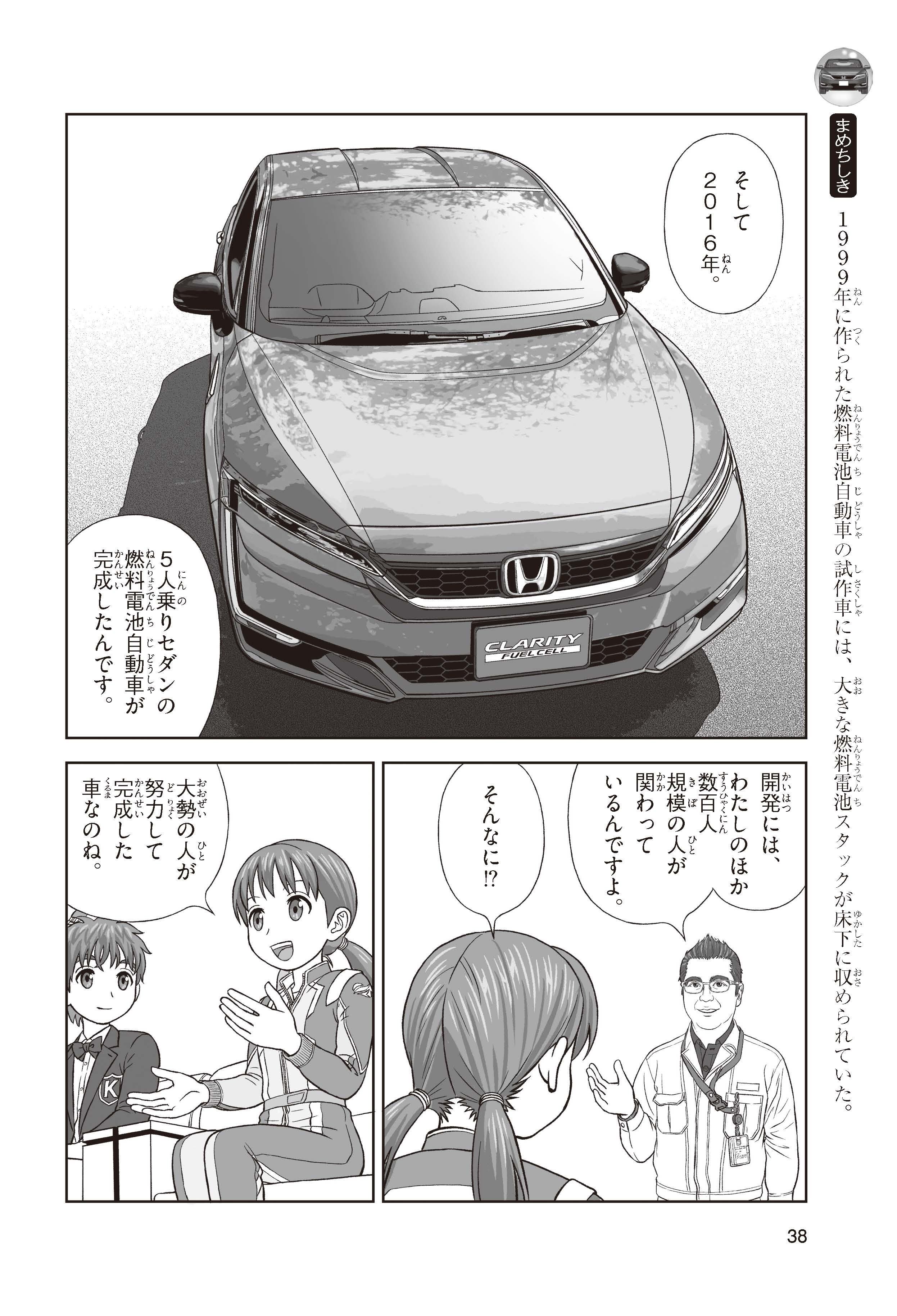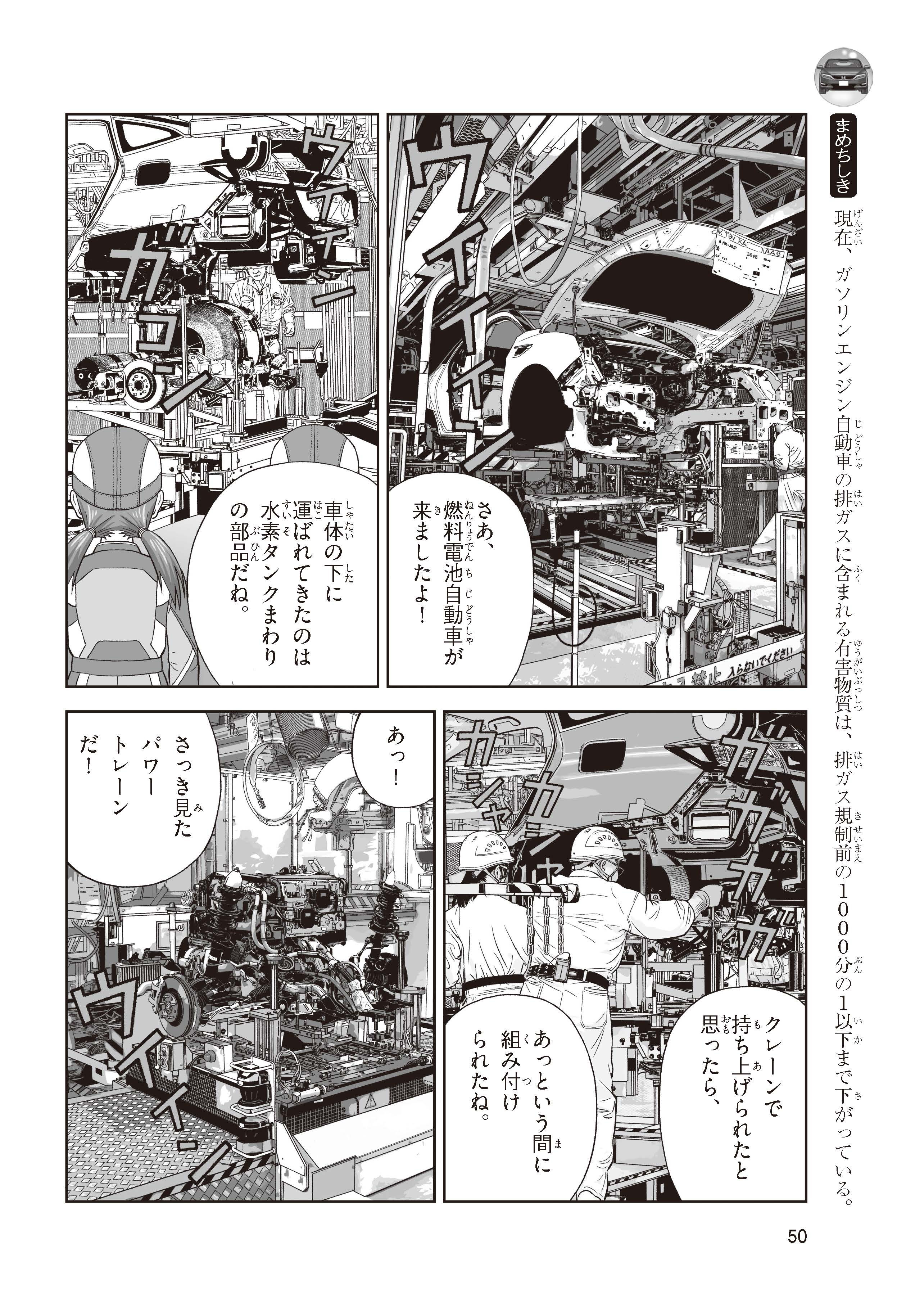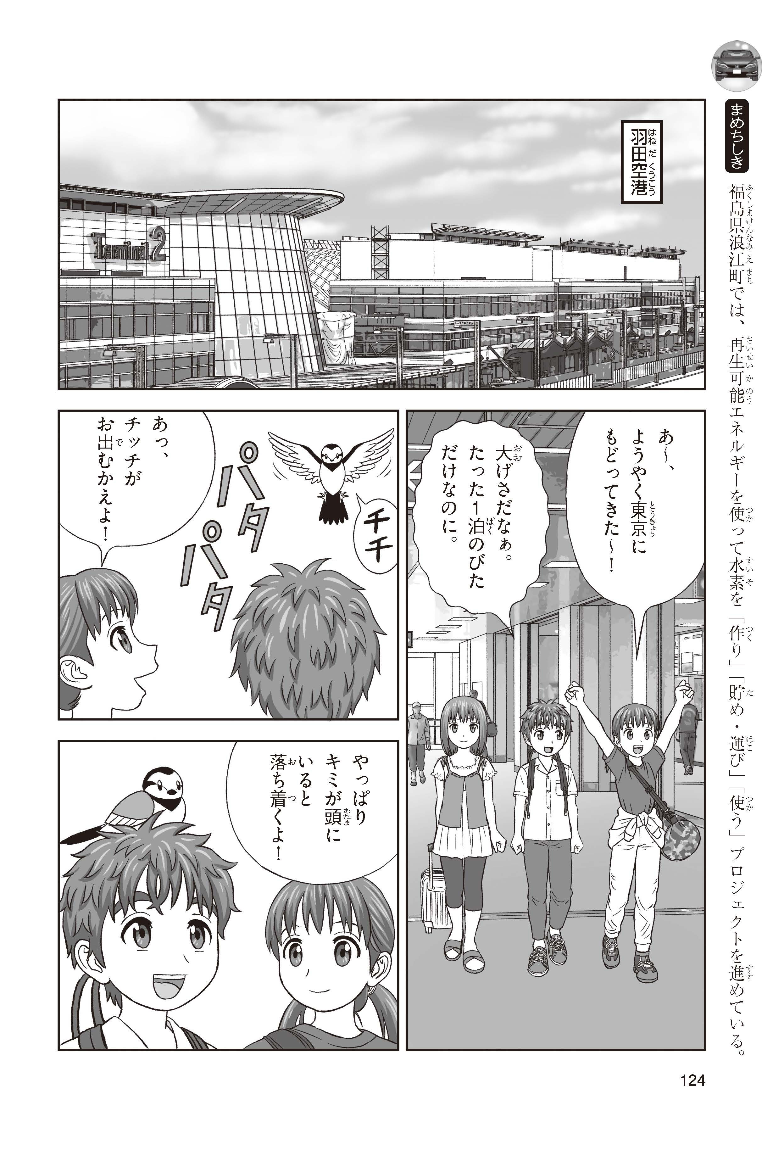 春休み、小学5年生のコウタのいとこ・アユミが遊びにくることに。同級生のミキといっしょに東京案内中、異常気象(いじょうきしょう)で停電が起こって、電気の大切さを改めて知るよ。そこで聞いたのが「燃料電池自動車」。水素という気体が燃料で、「究極のエコカー(地球にやさしい車)」と言われているんだって。電気をつくることもできて、移動発電機としての役割も期待されているんだよ。この本でひみつを探ろう!