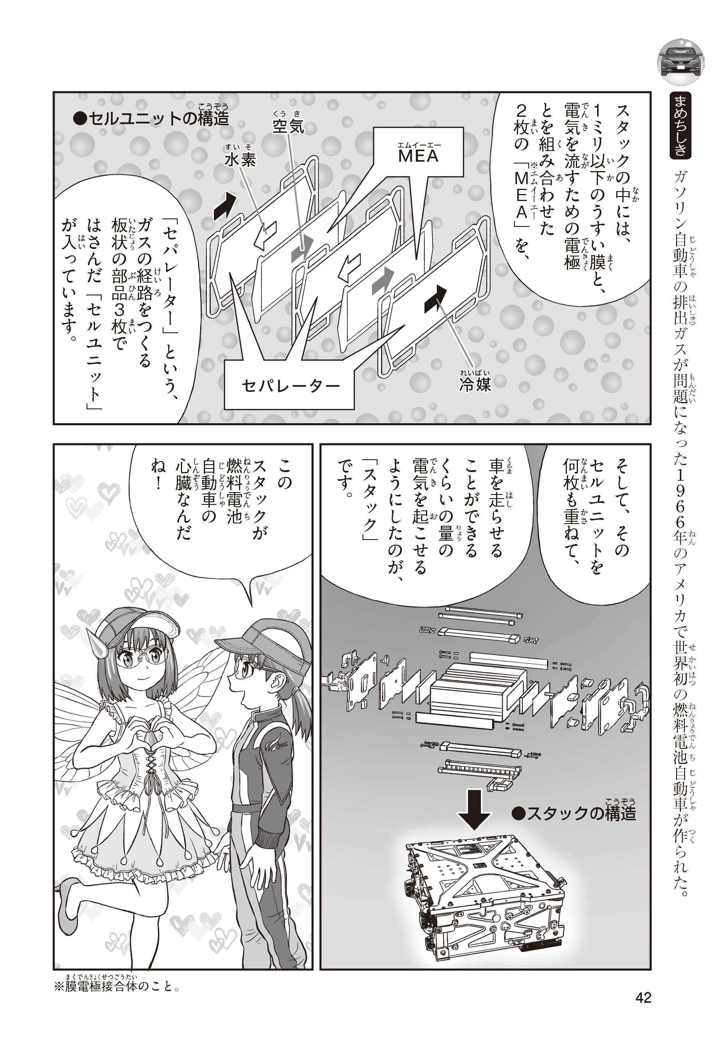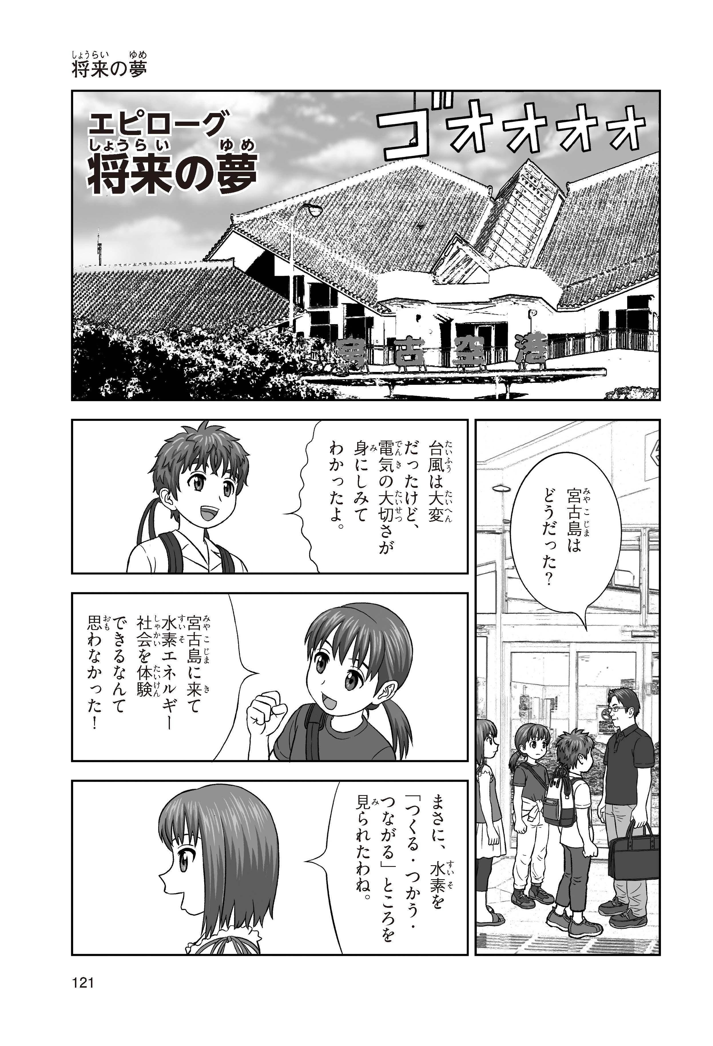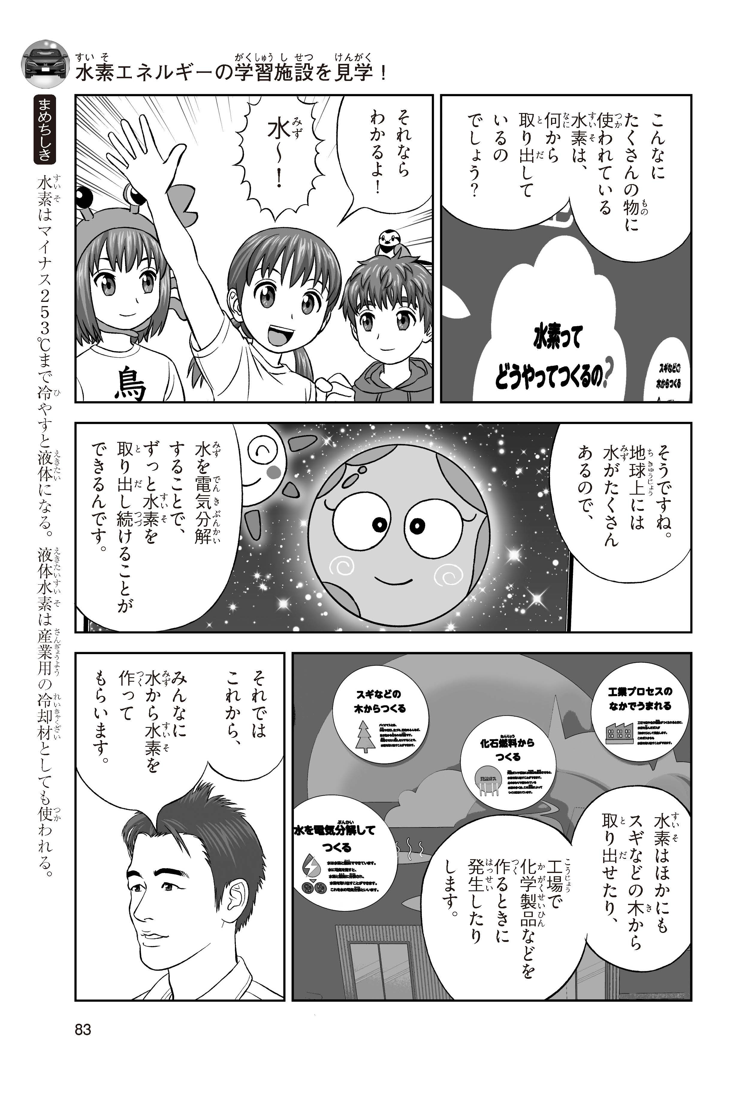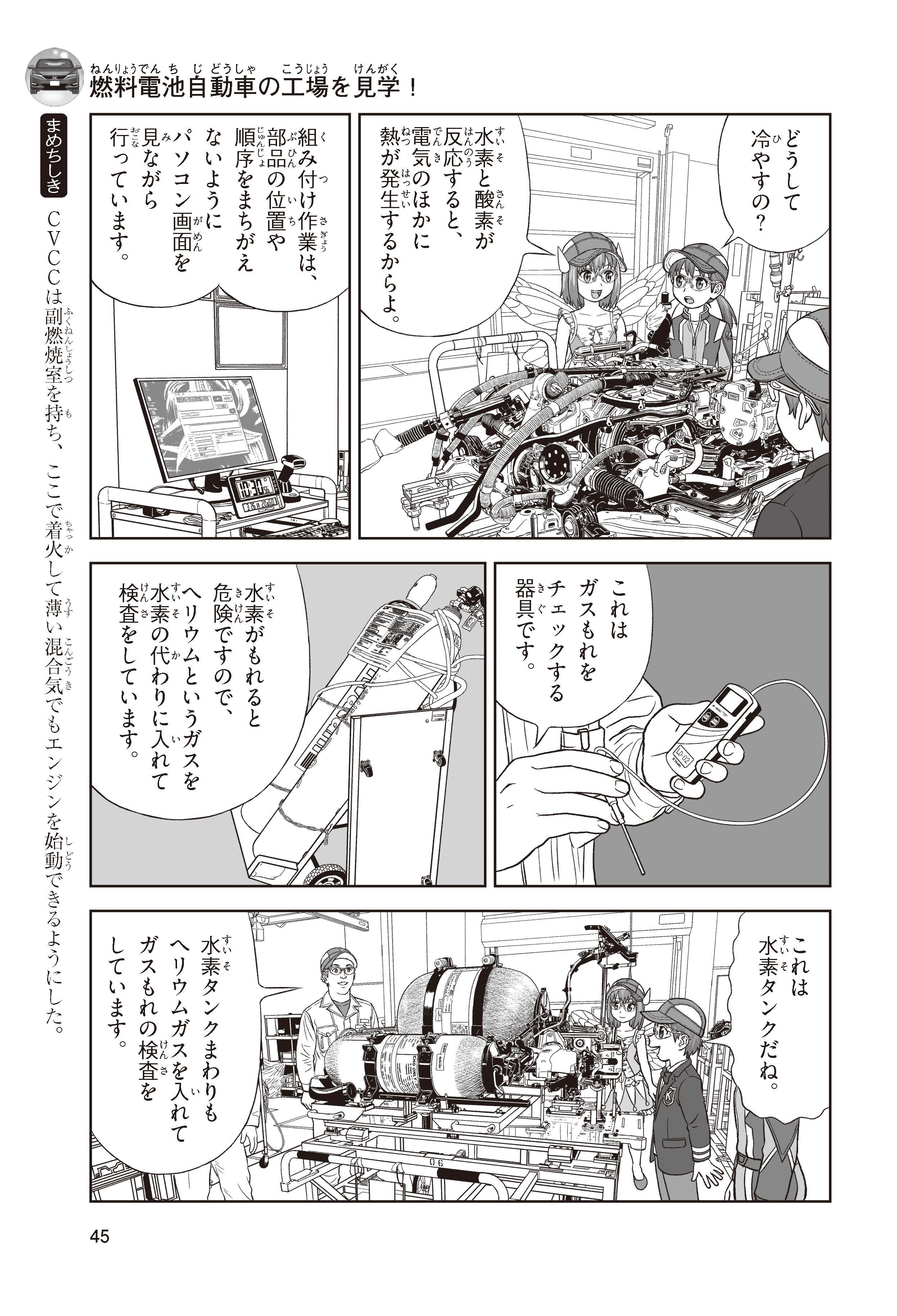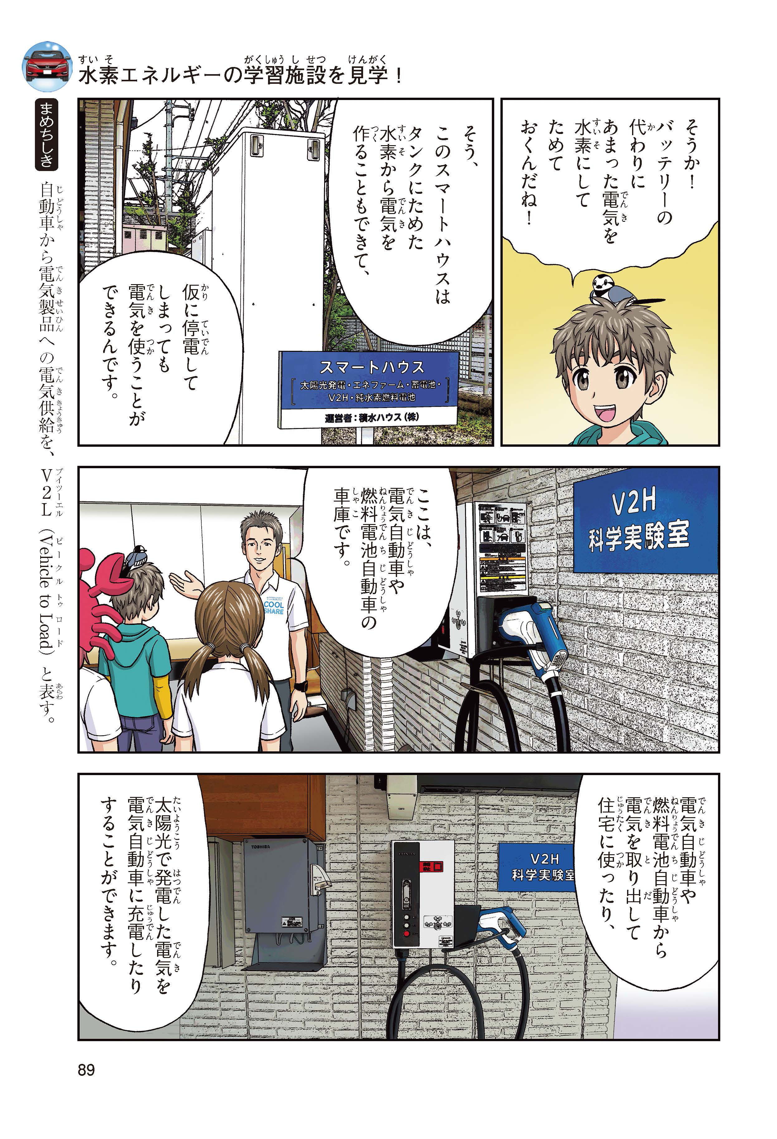 春休み、小学5年生のコウタのいとこ・アユミが遊びにくることに。同級生のミキといっしょに東京案内中、異常気象(いじょうきしょう)で停電が起こって、電気の大切さを改めて知るよ。そこで聞いたのが「燃料電池自動車」。水素という気体が燃料で、「究極のエコカー(地球にやさしい車)」と言われているんだって。電気をつくることもできて、移動発電機としての役割も期待されているんだよ。この本でひみつを探ろう!