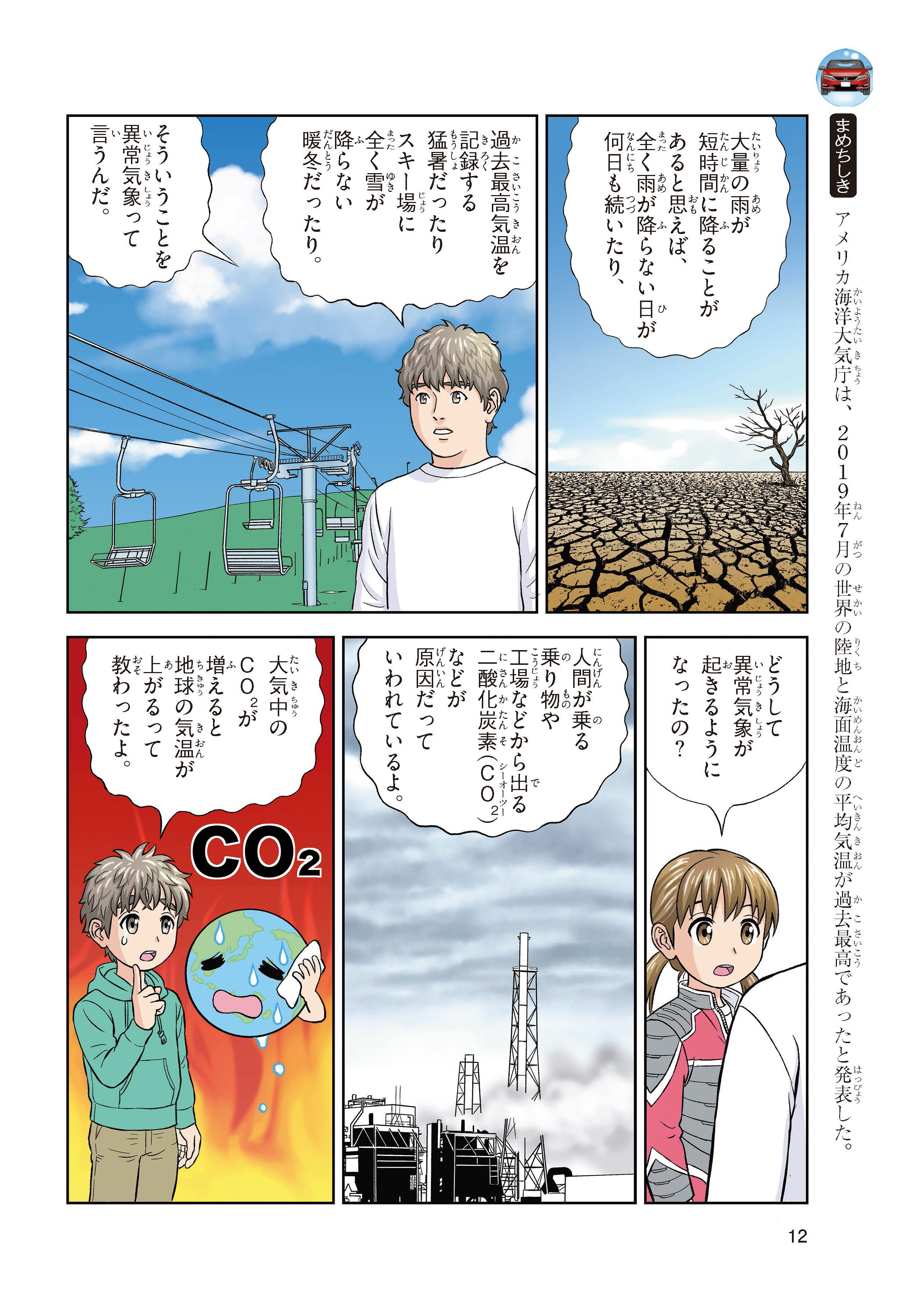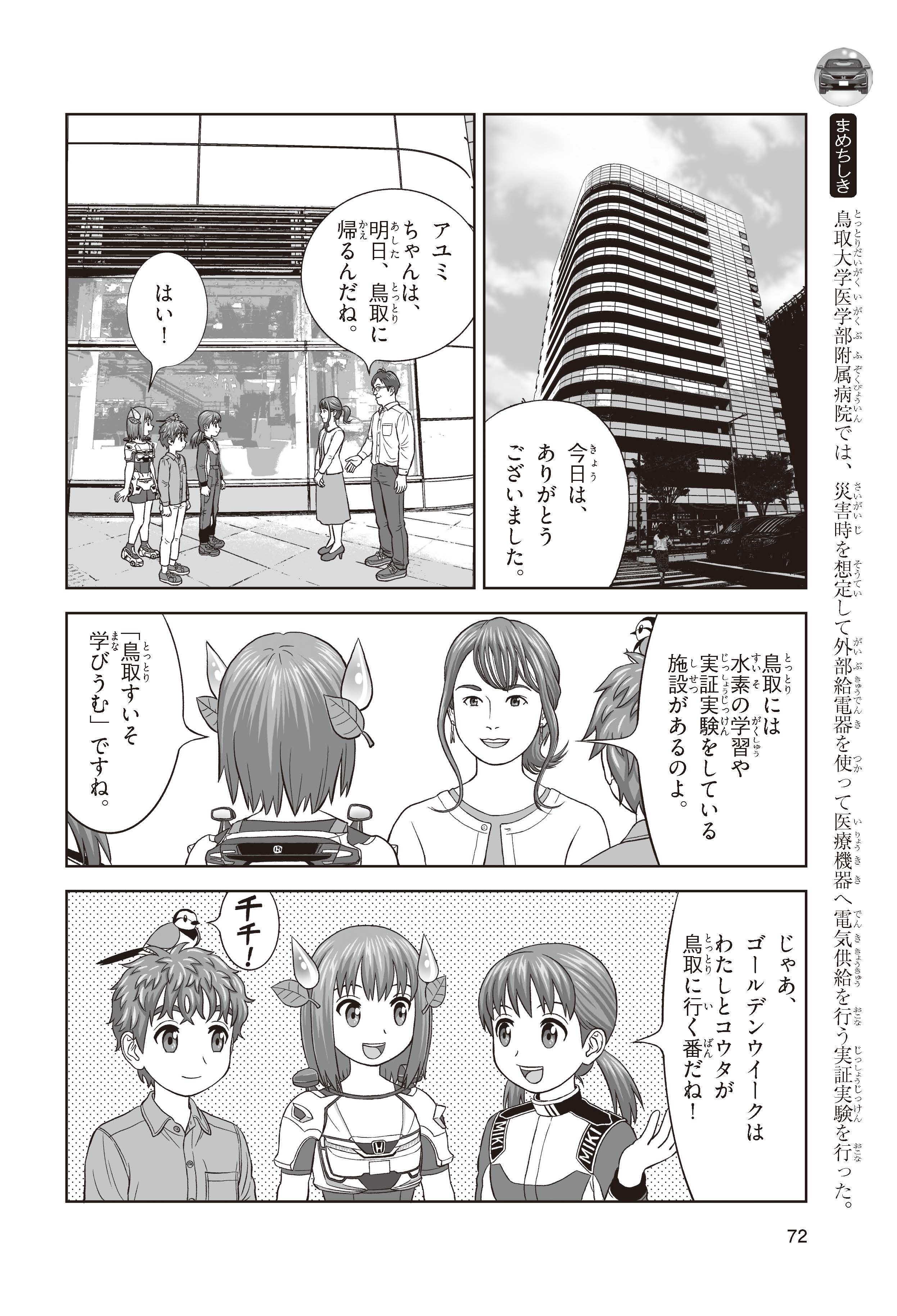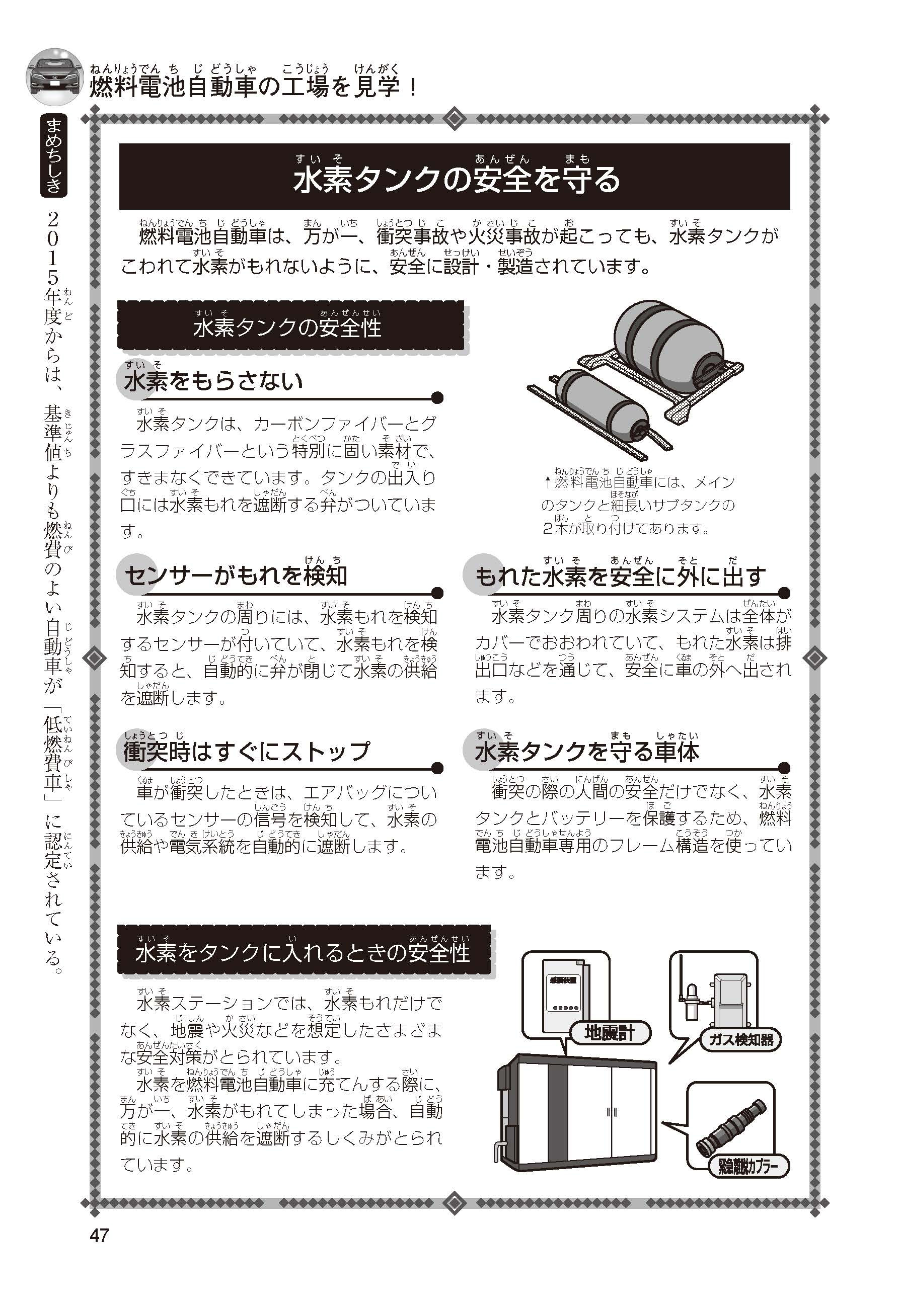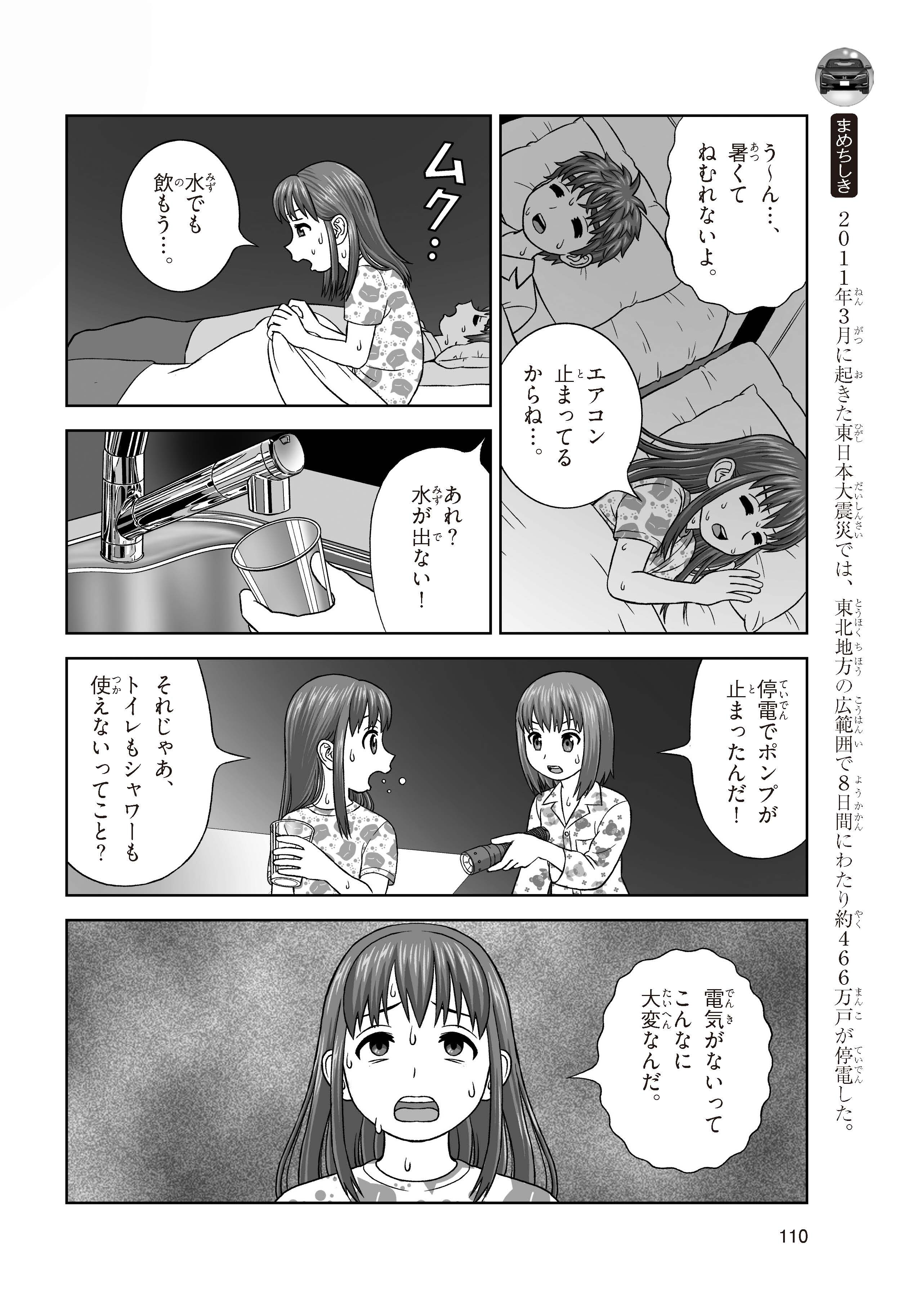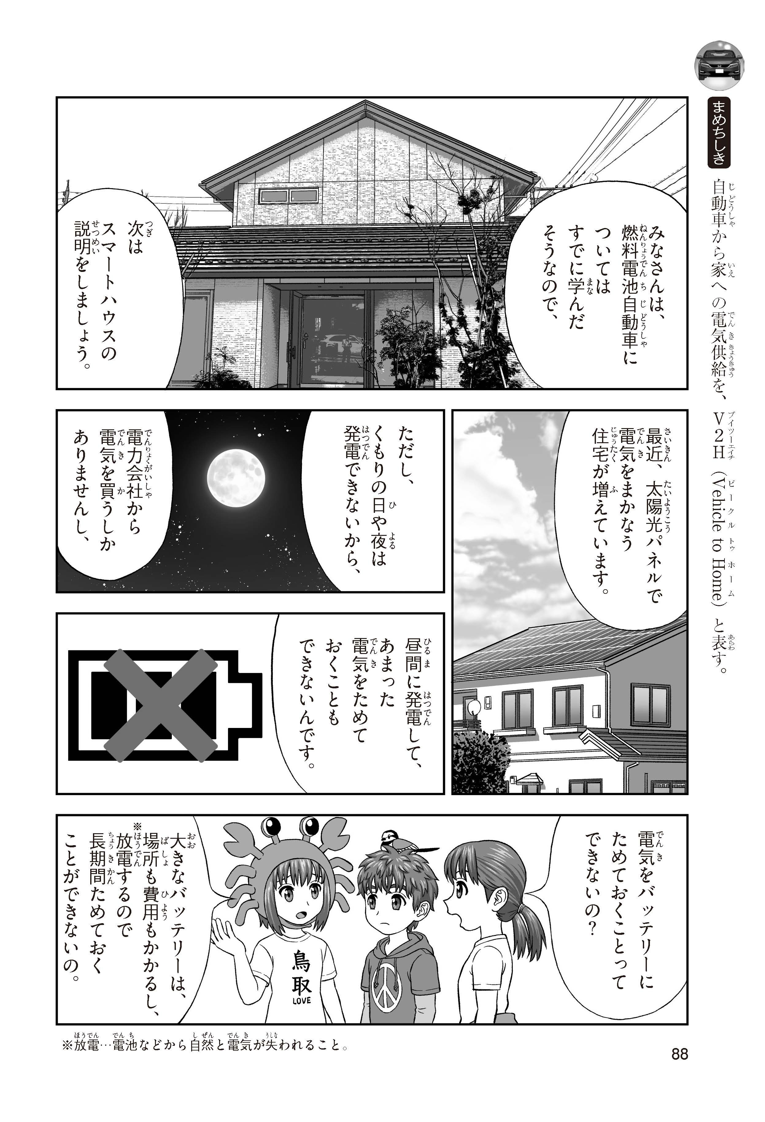 春休み、小学5年生のコウタのいとこ・アユミが遊びにくることに。同級生のミキといっしょに東京案内中、異常気象(いじょうきしょう)で停電が起こって、電気の大切さを改めて知るよ。そこで聞いたのが「燃料電池自動車」。水素という気体が燃料で、「究極のエコカー(地球にやさしい車)」と言われているんだって。電気をつくることもできて、移動発電機としての役割も期待されているんだよ。この本でひみつを探ろう!
