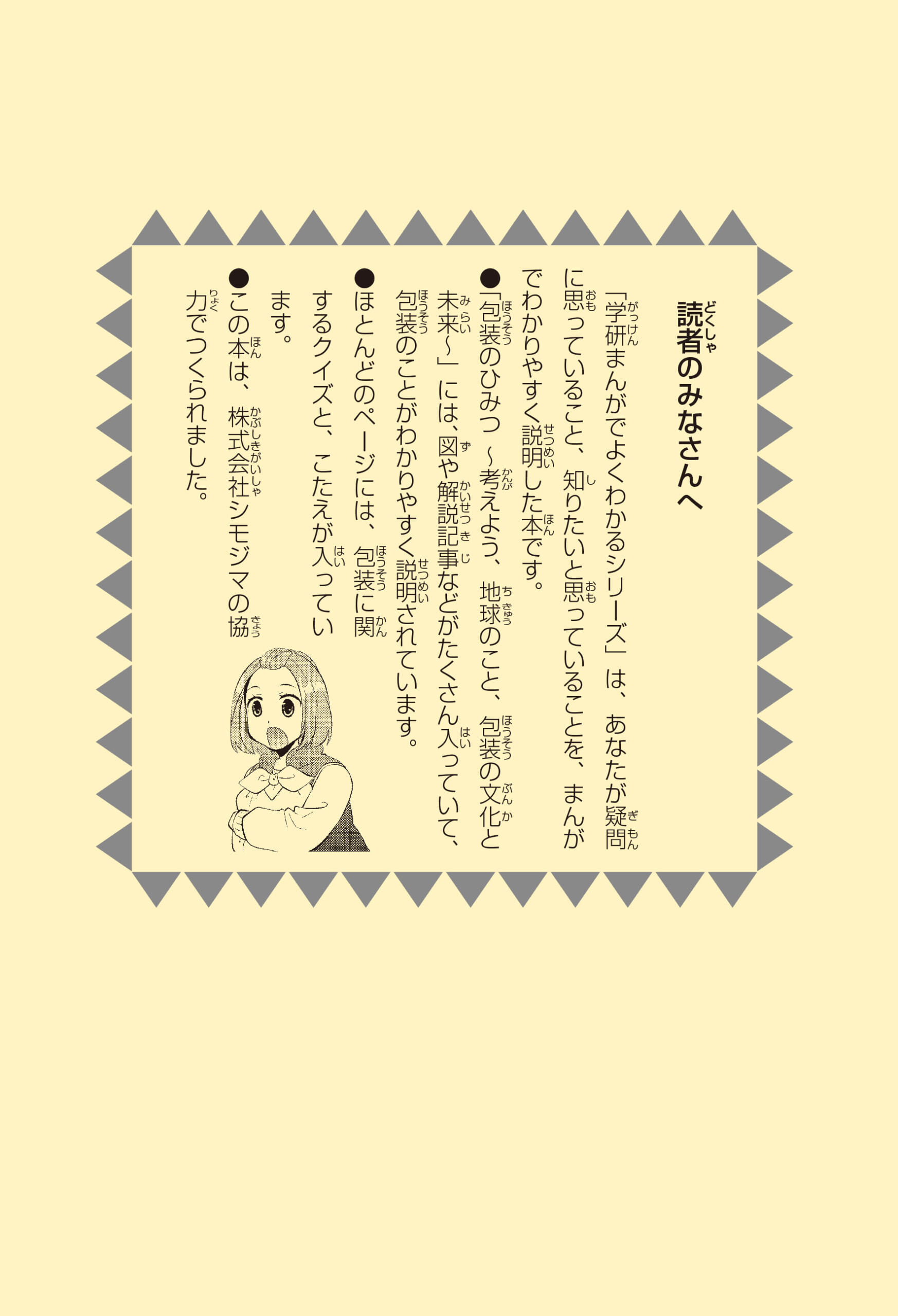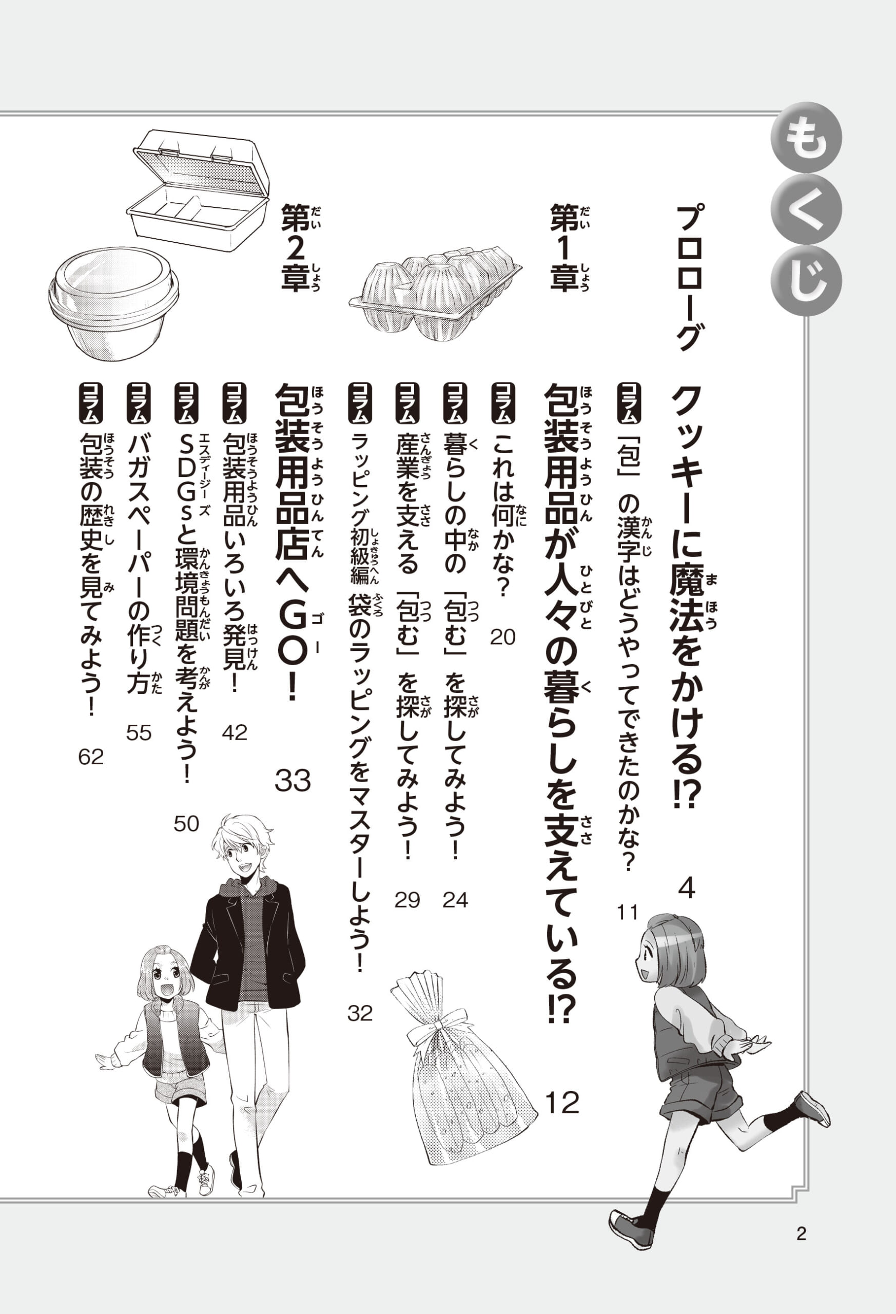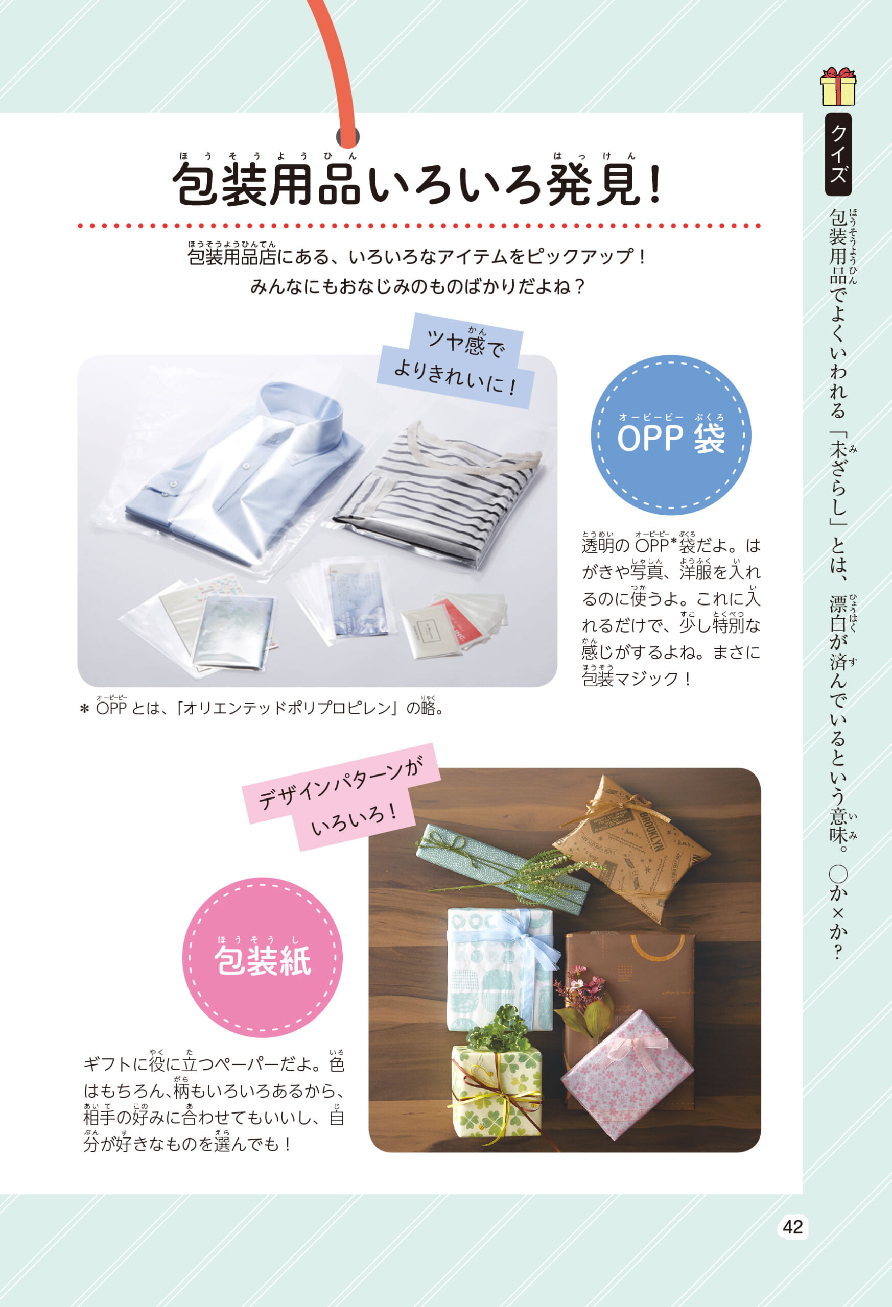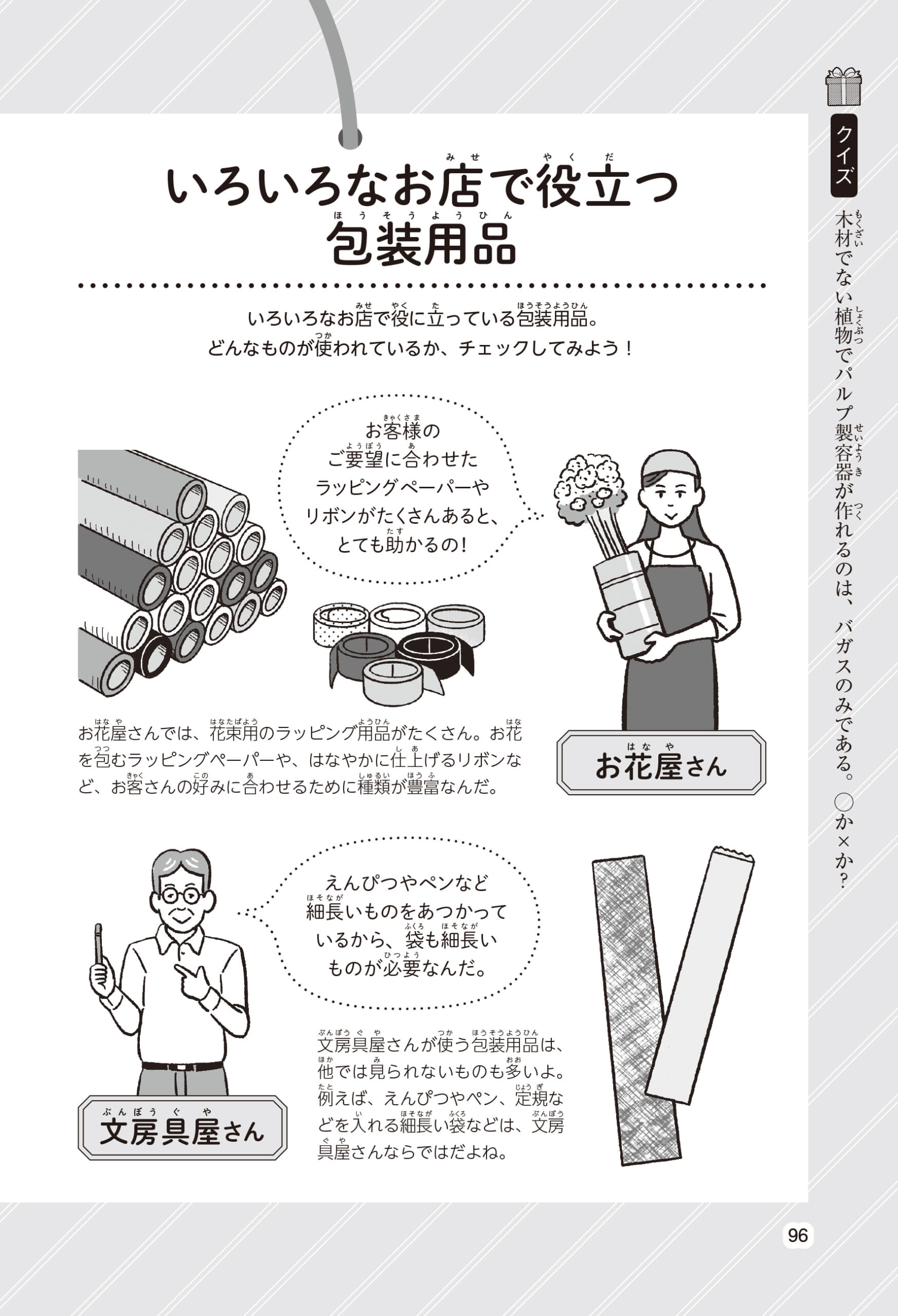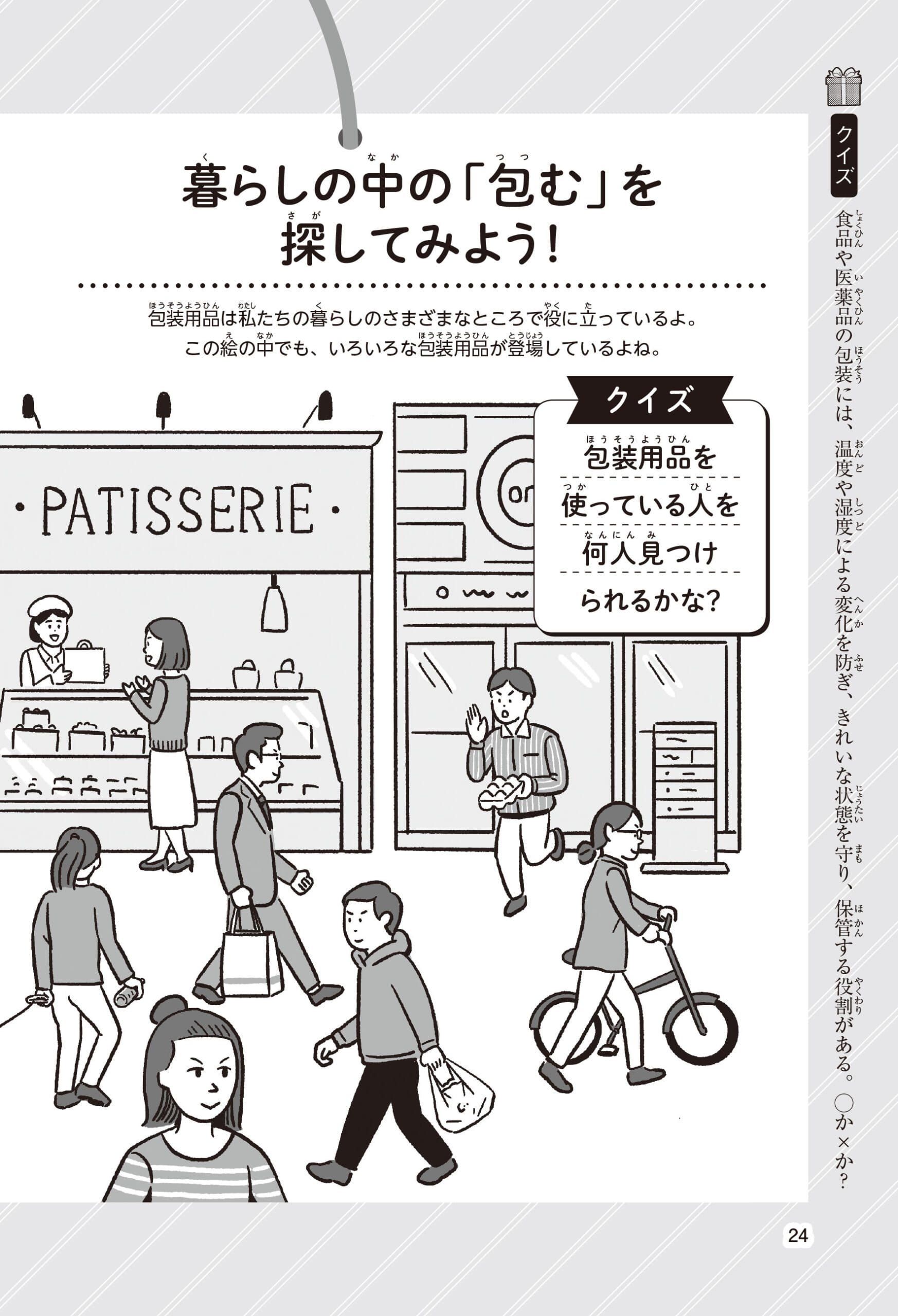 包装用品って、どんなものを想像する? プレゼントに使う、ラッピングペーパーやリボンはもちろん、おかずやお菓子を入れるバックや箱、書類などを入れるふうとう、ものを持ち運ぶ手提げ袋なども全部、包装用品の仲間なんだ。人の気持ちを伝えるのにも、人の暮らしを支えるのにも包装は役立っているんだよ。そして今、地球に優しい包装用品もたくさんできているんだ。さあ、みんなも「包装のひみつ」をいっしょにさぐってみよう!