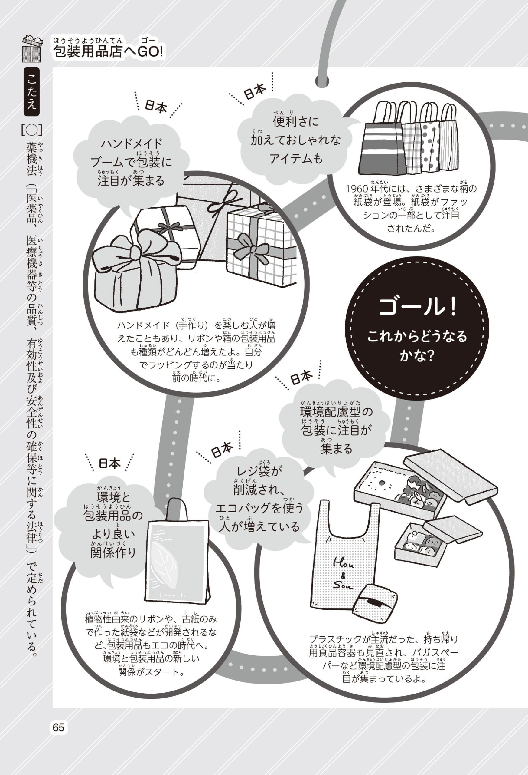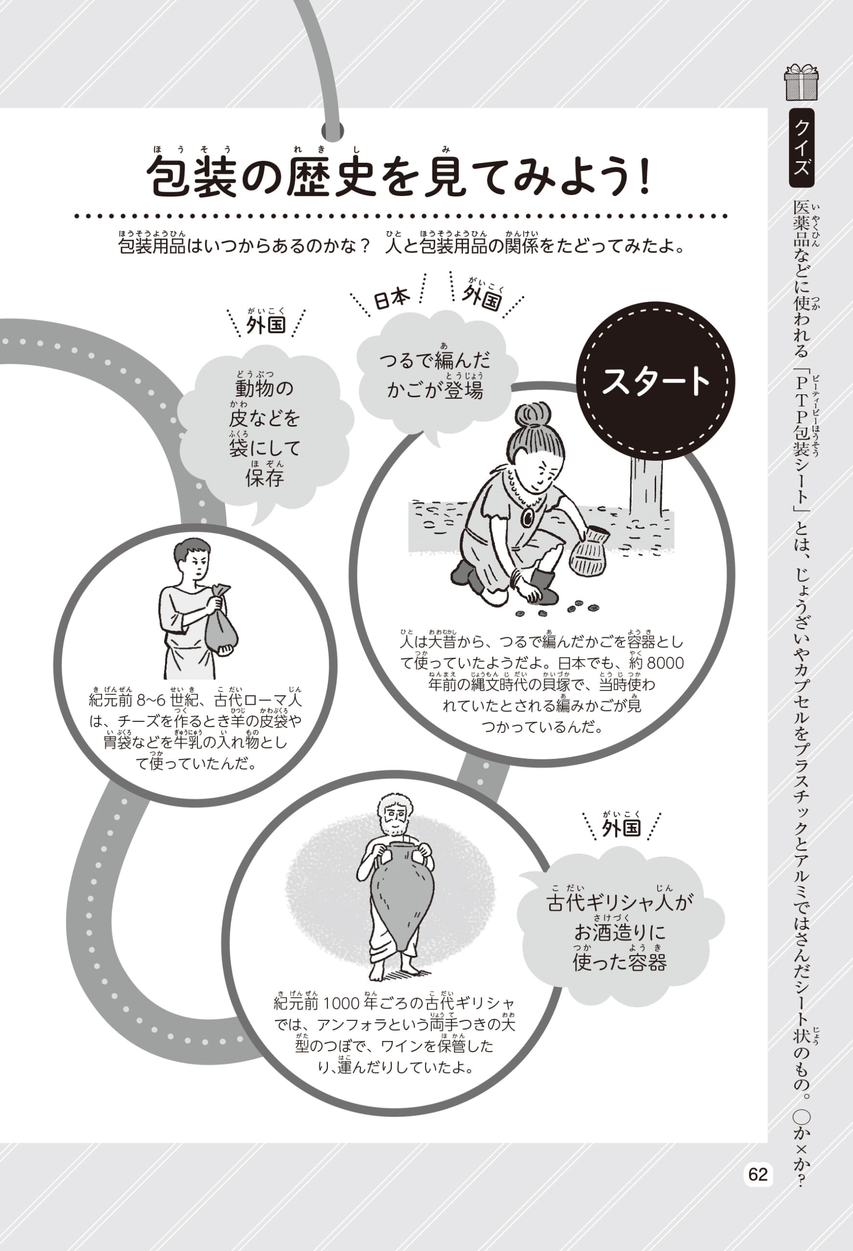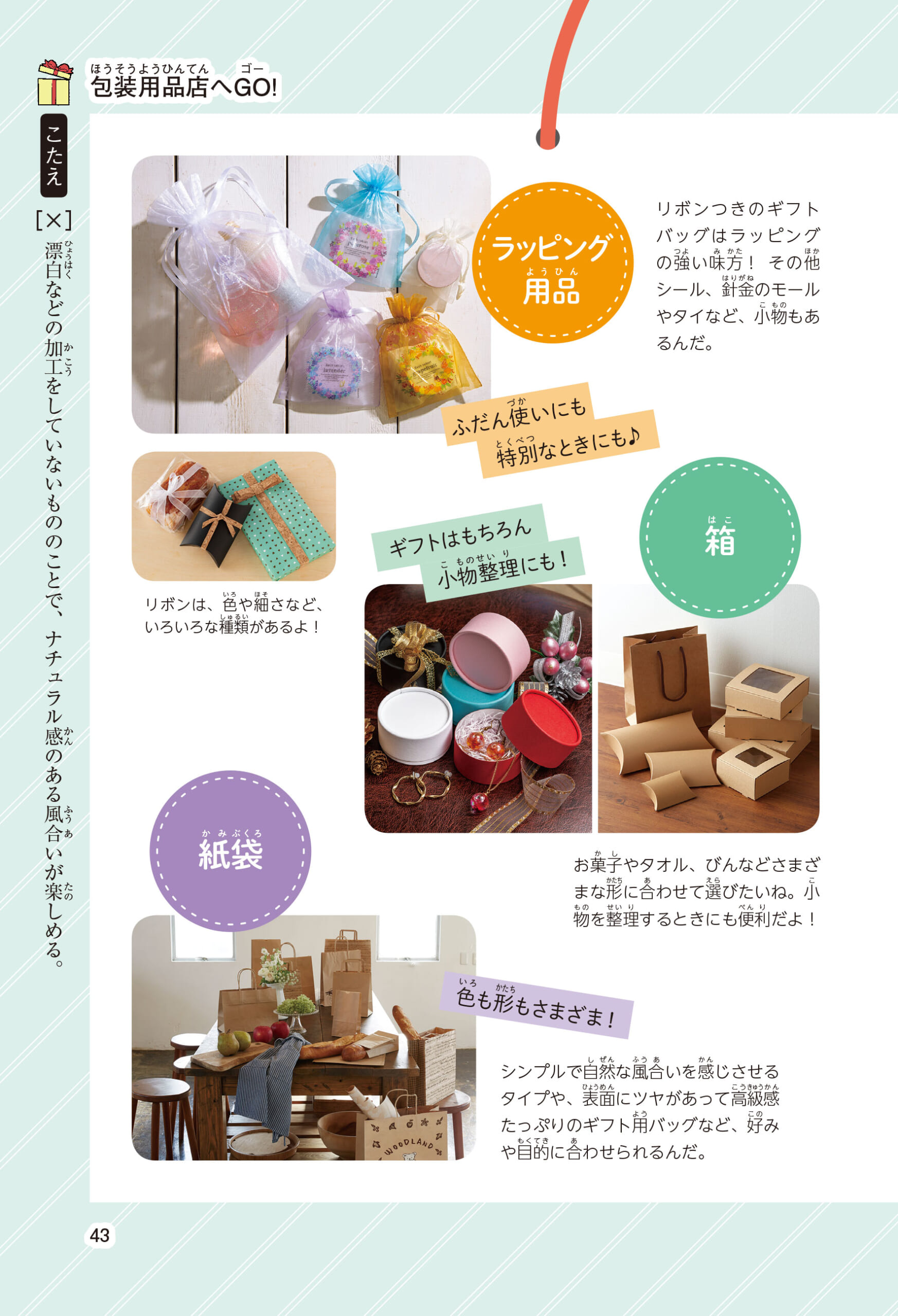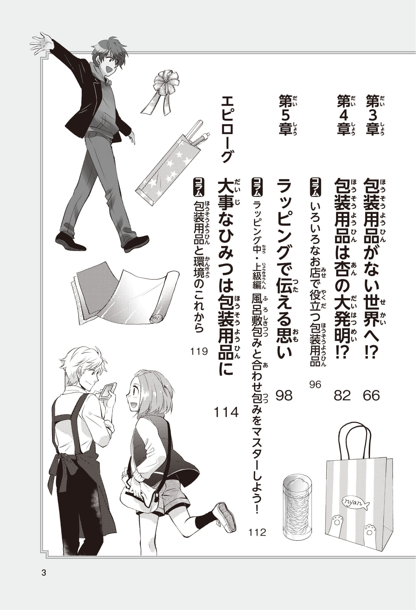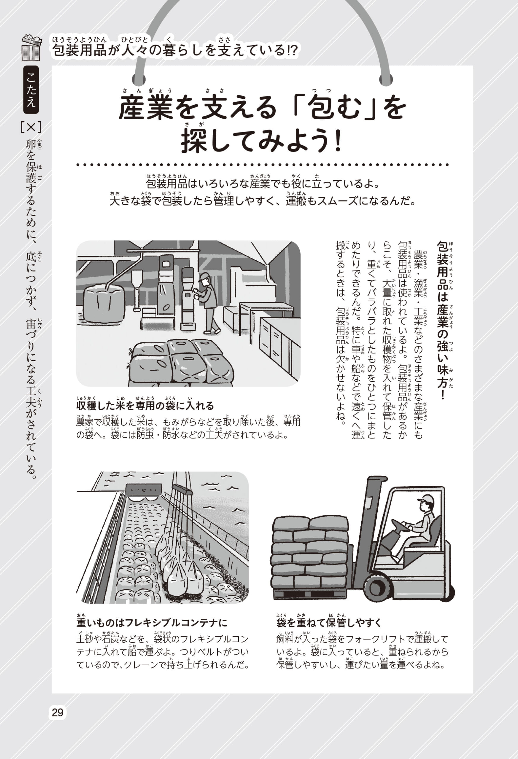 包装用品って、どんなものを想像する? プレゼントに使う、ラッピングペーパーやリボンはもちろん、おかずやお菓子を入れるバックや箱、書類などを入れるふうとう、ものを持ち運ぶ手提げ袋なども全部、包装用品の仲間なんだ。人の気持ちを伝えるのにも、人の暮らしを支えるのにも包装は役立っているんだよ。そして今、地球に優しい包装用品もたくさんできているんだ。さあ、みんなも「包装のひみつ」をいっしょにさぐってみよう!