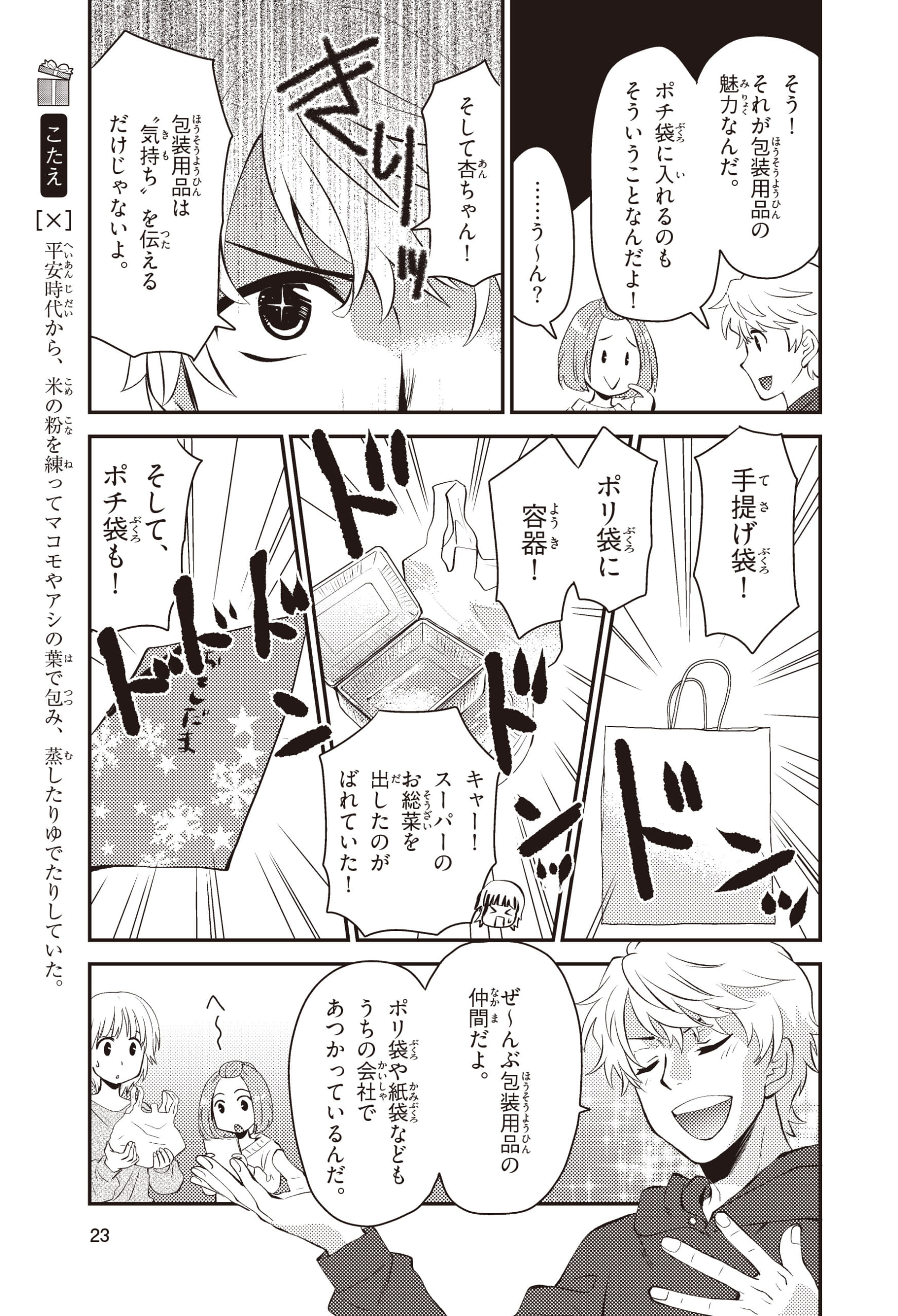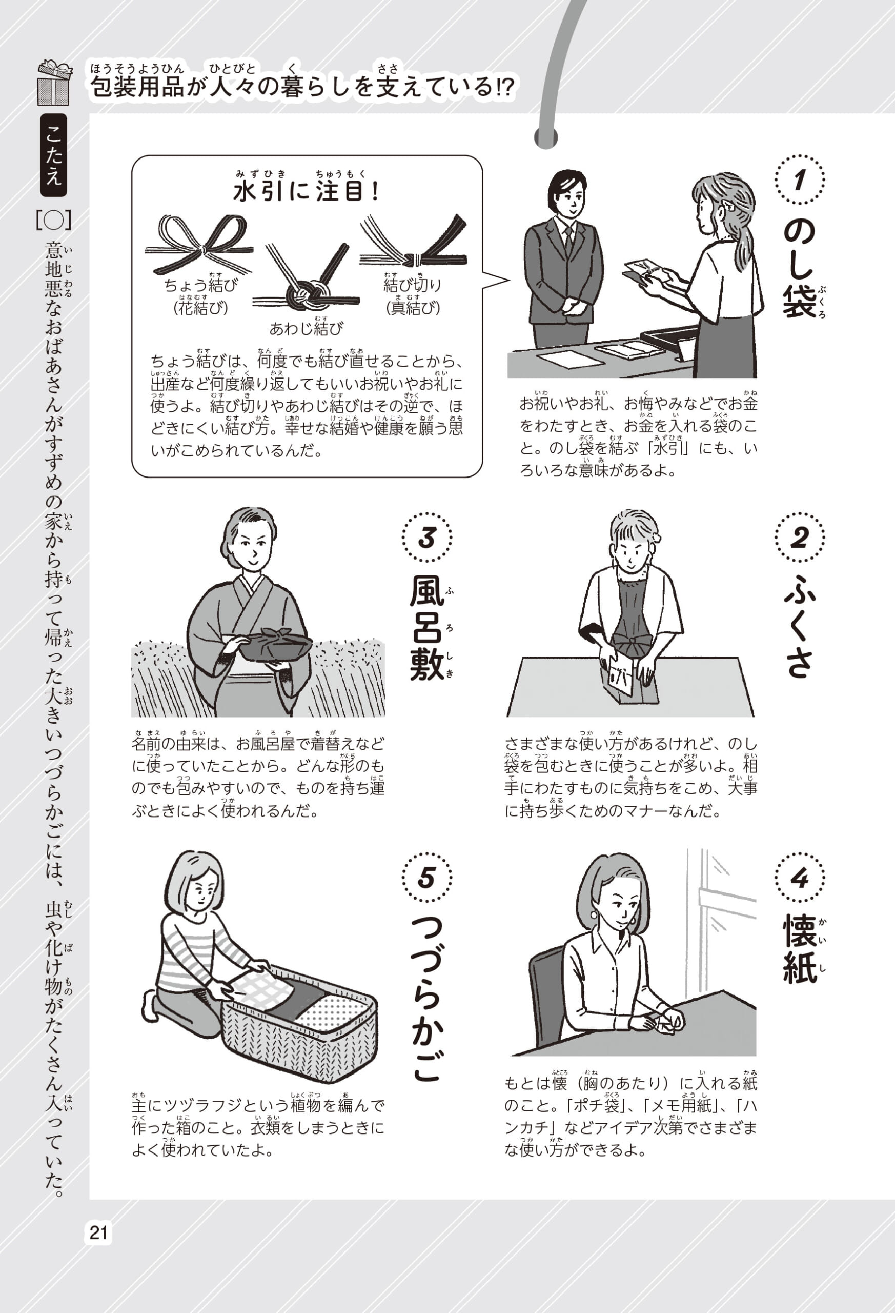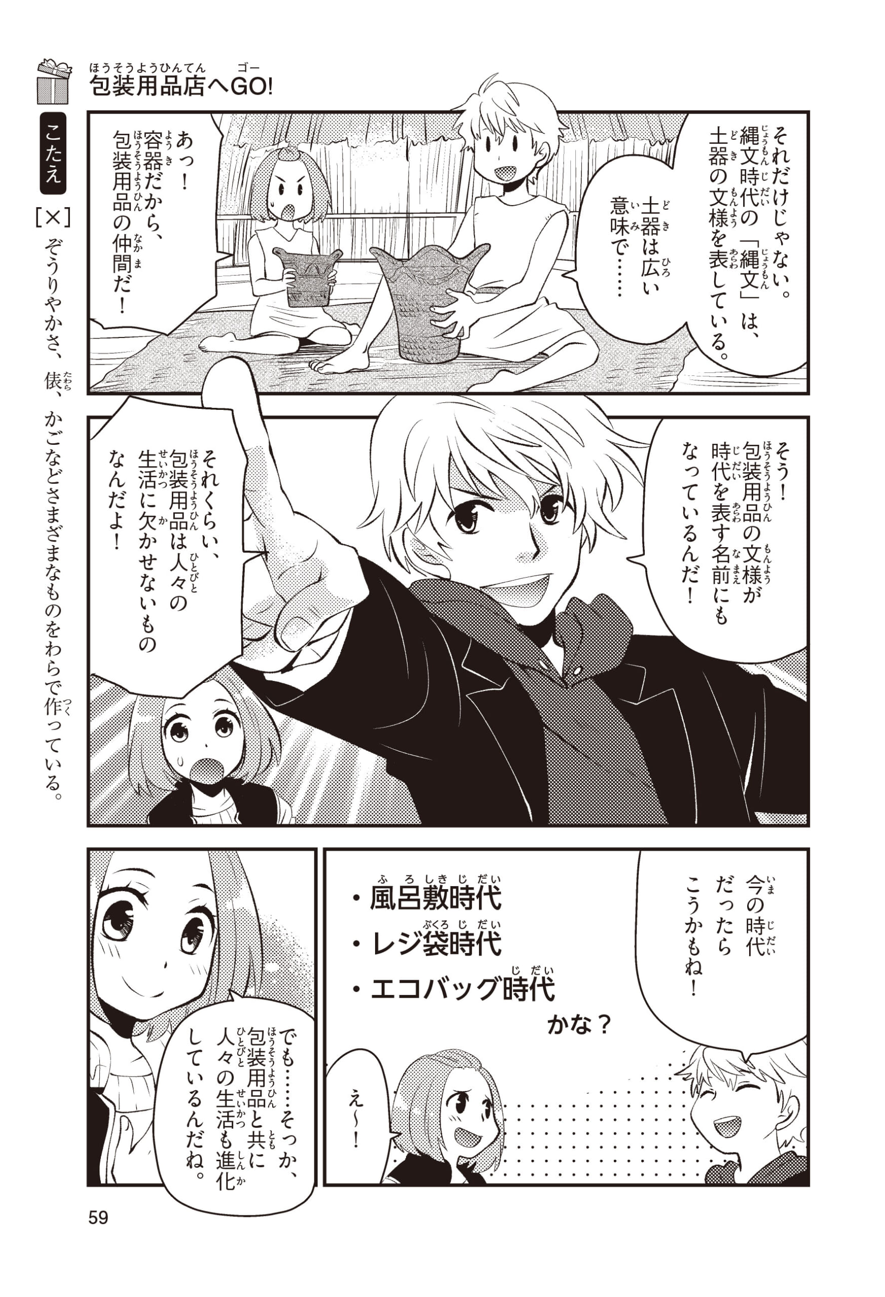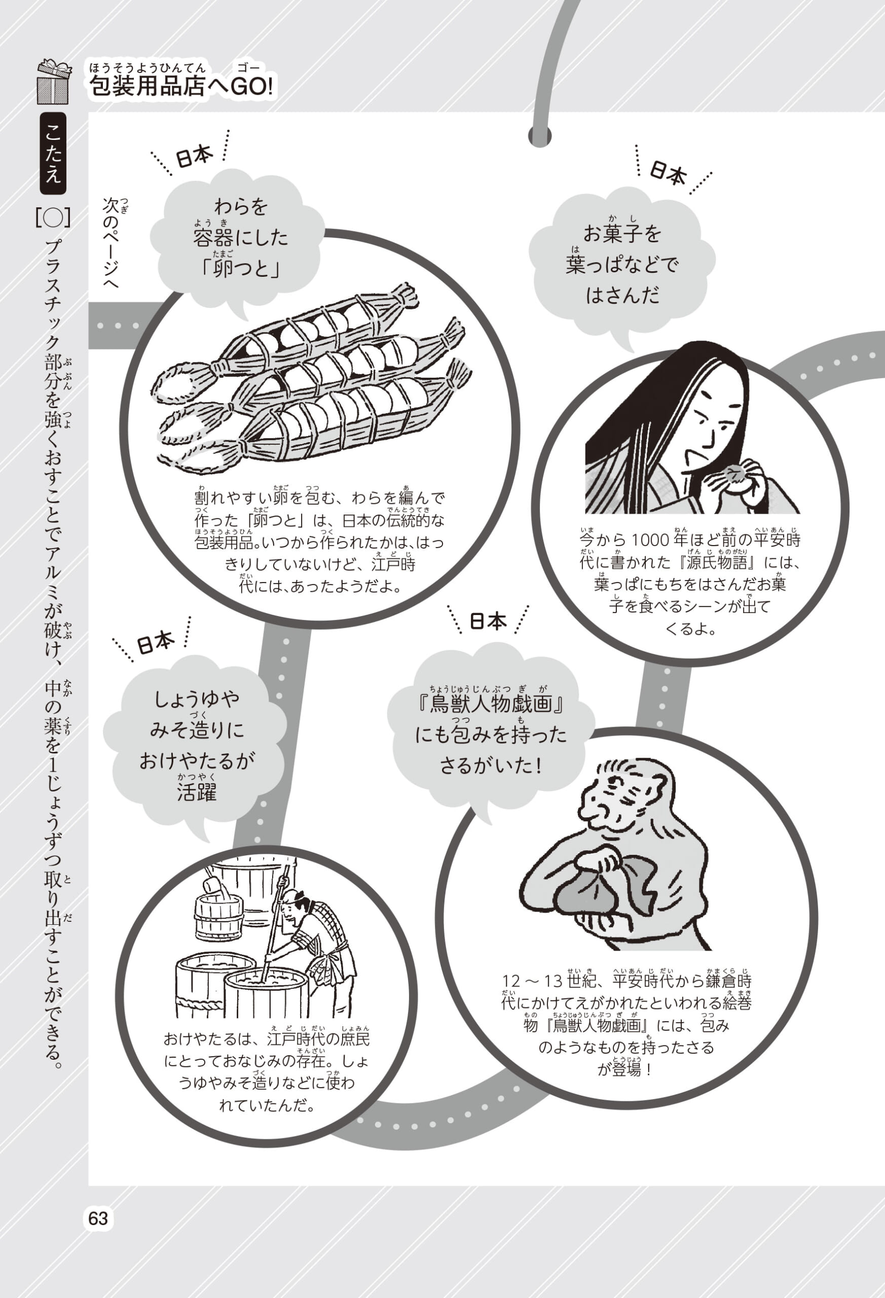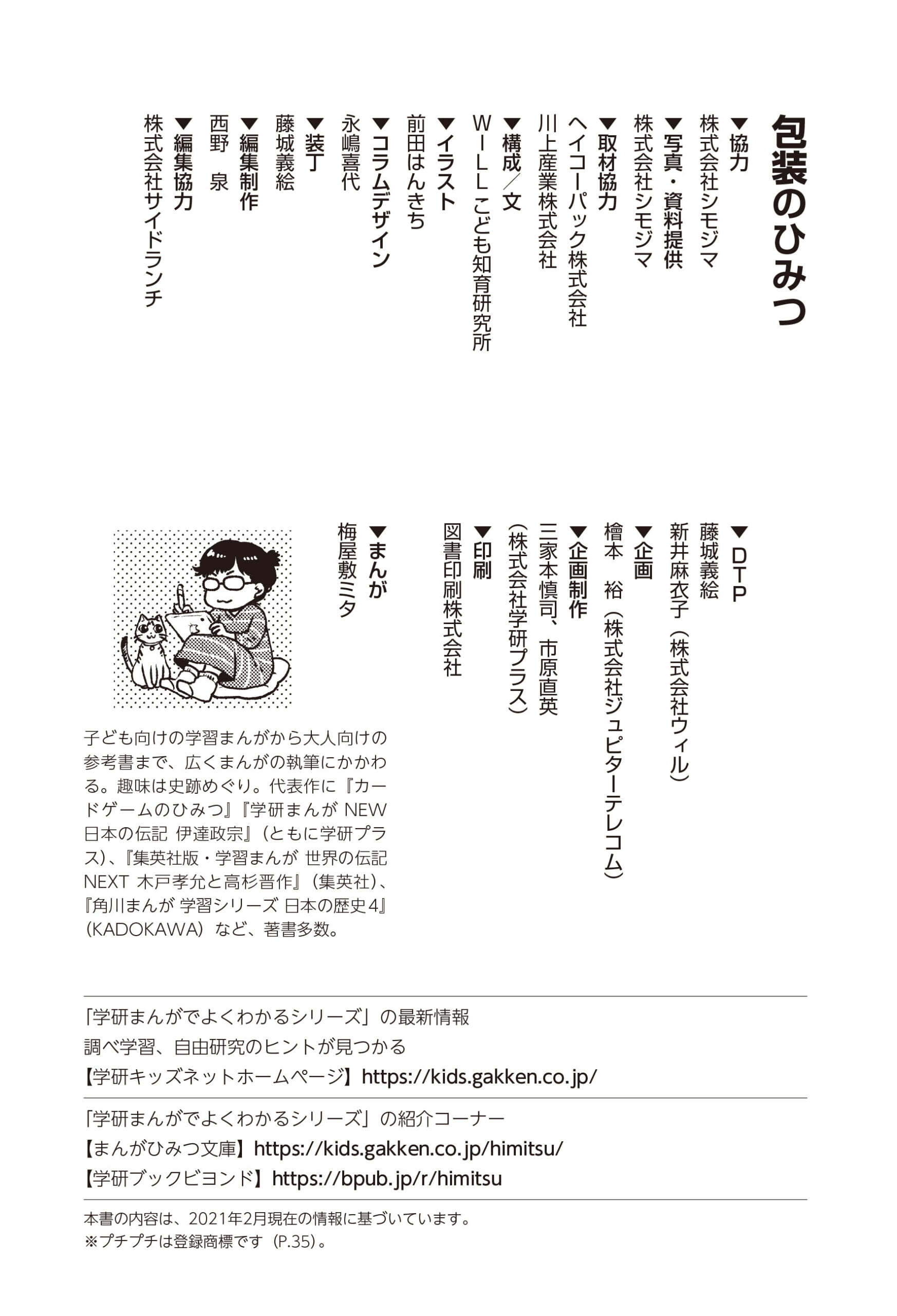 包装用品って、どんなものを想像する? プレゼントに使う、ラッピングペーパーやリボンはもちろん、おかずやお菓子を入れるバックや箱、書類などを入れるふうとう、ものを持ち運ぶ手提げ袋なども全部、包装用品の仲間なんだ。人の気持ちを伝えるのにも、人の暮らしを支えるのにも包装は役立っているんだよ。そして今、地球に優しい包装用品もたくさんできているんだ。さあ、みんなも「包装のひみつ」をいっしょにさぐってみよう!