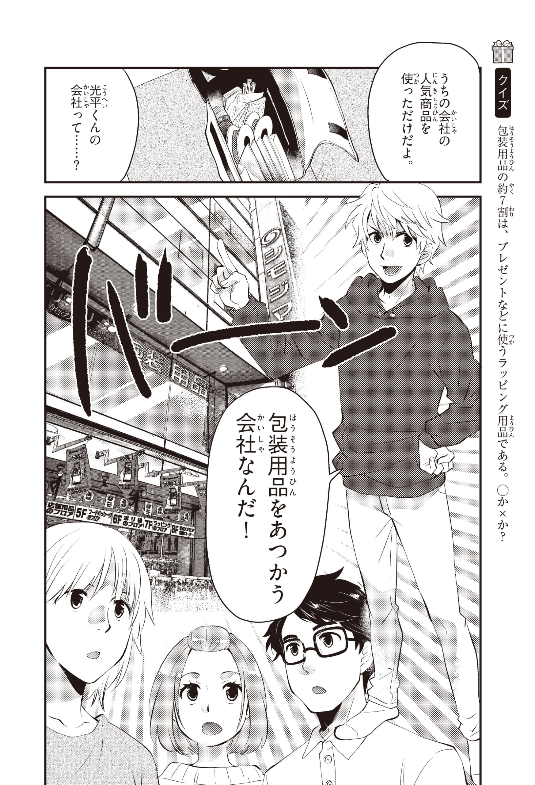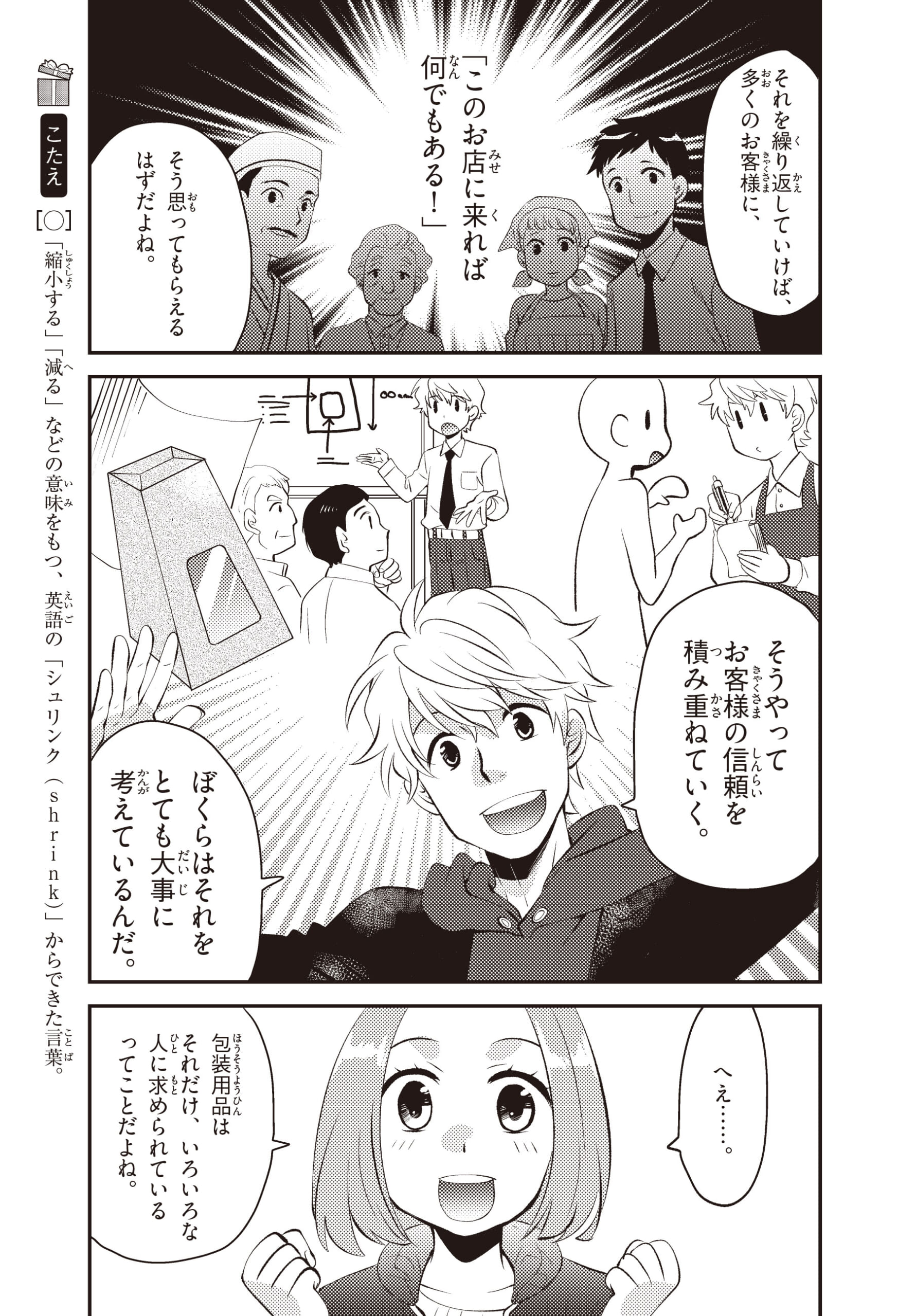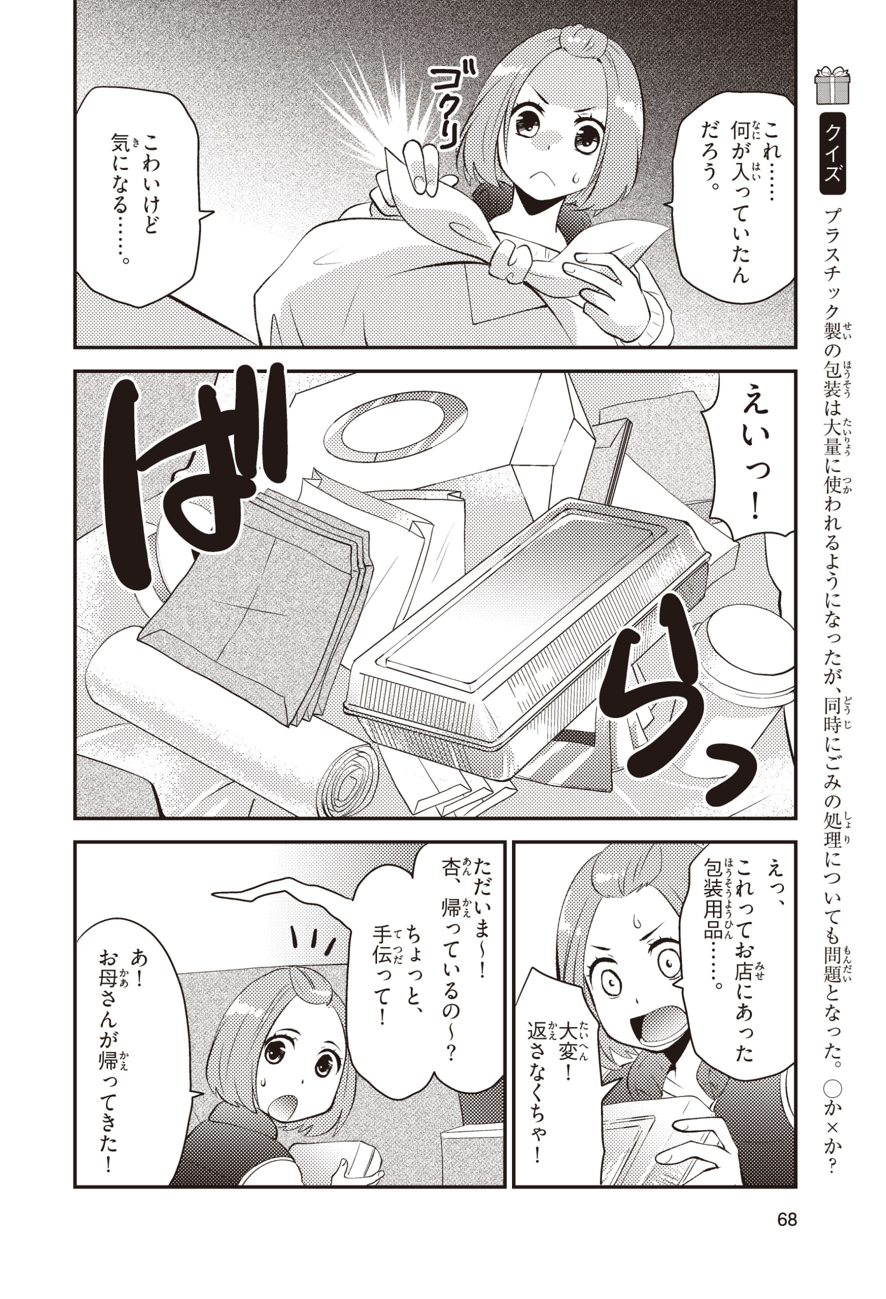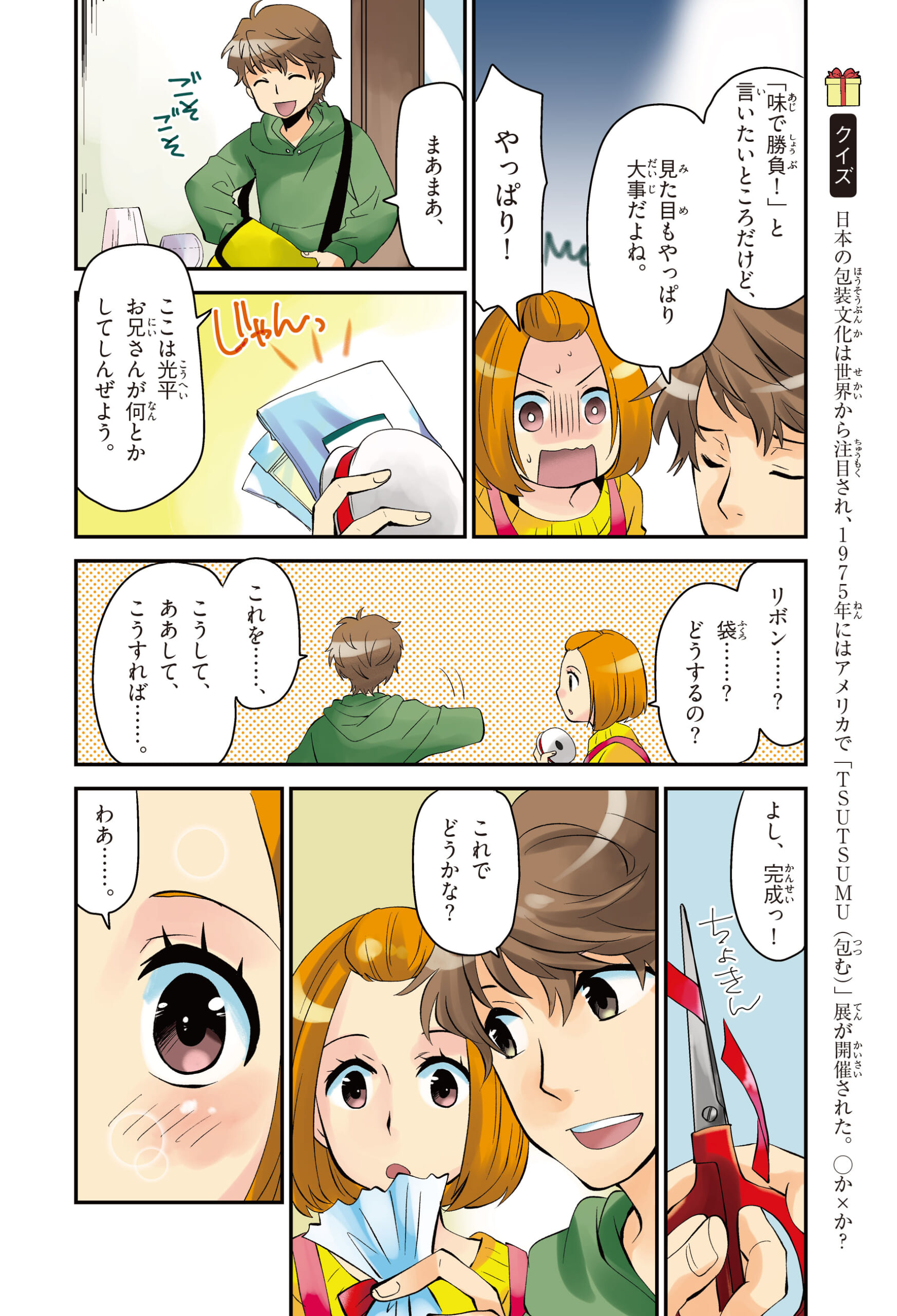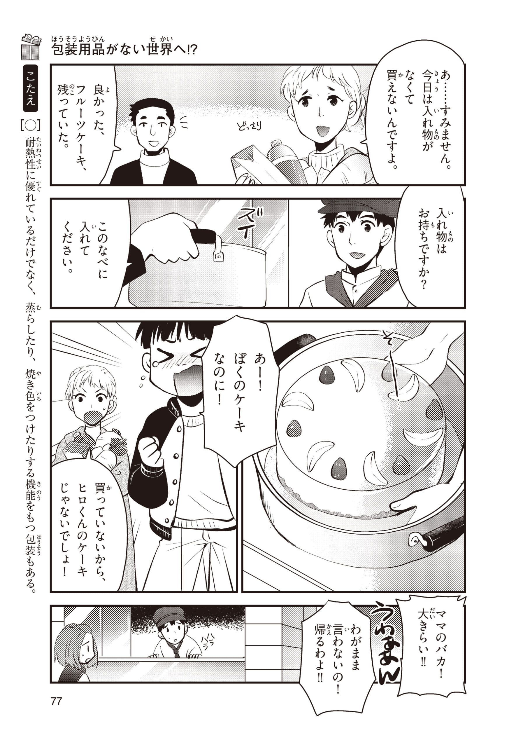 包装用品って、どんなものを想像する? プレゼントに使う、ラッピングペーパーやリボンはもちろん、おかずやお菓子を入れるバックや箱、書類などを入れるふうとう、ものを持ち運ぶ手提げ袋なども全部、包装用品の仲間なんだ。人の気持ちを伝えるのにも、人の暮らしを支えるのにも包装は役立っているんだよ。そして今、地球に優しい包装用品もたくさんできているんだ。さあ、みんなも「包装のひみつ」をいっしょにさぐってみよう!