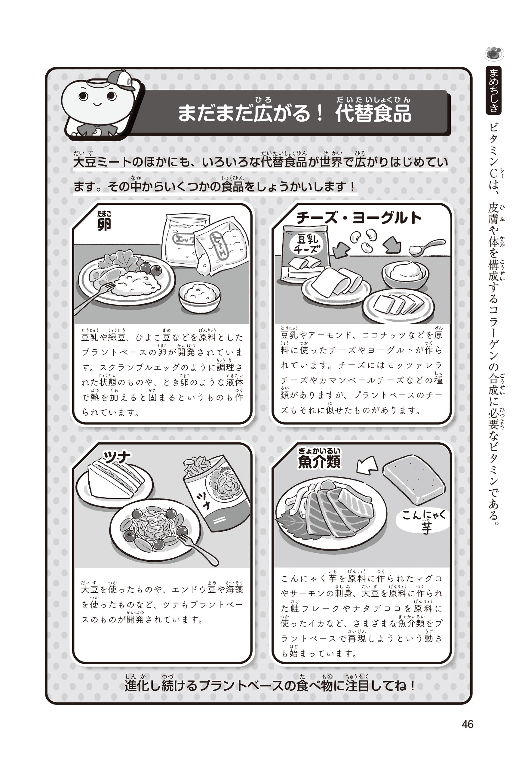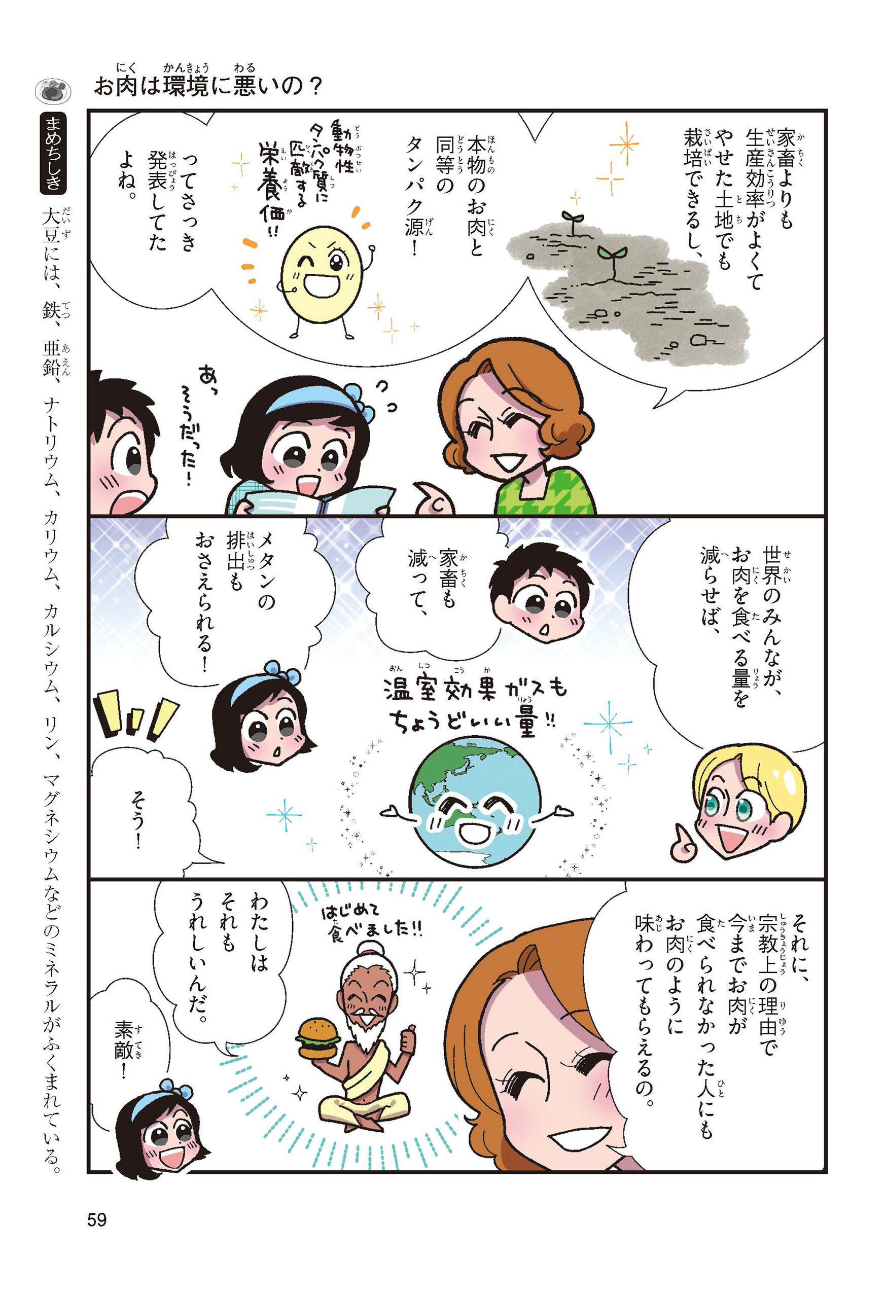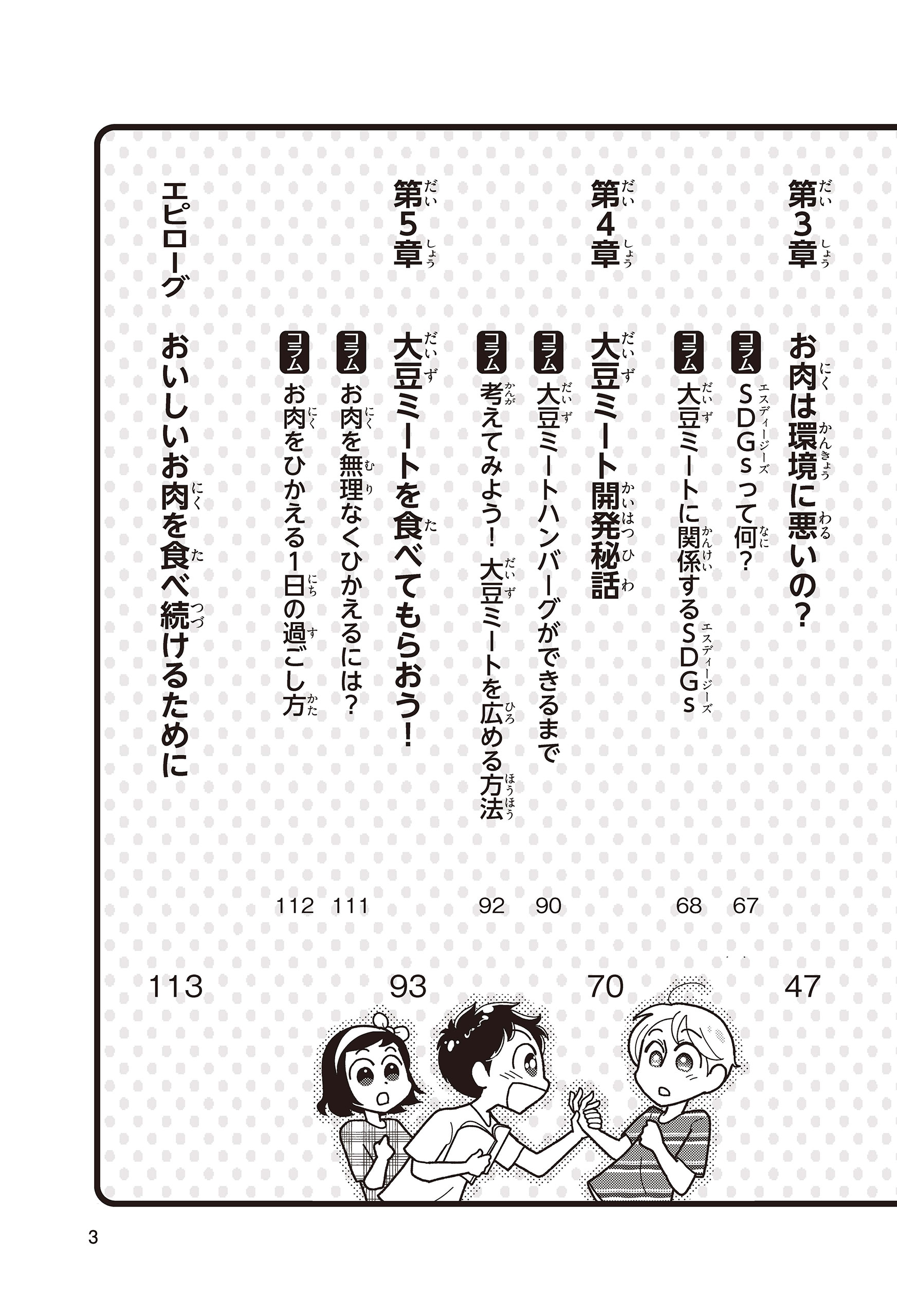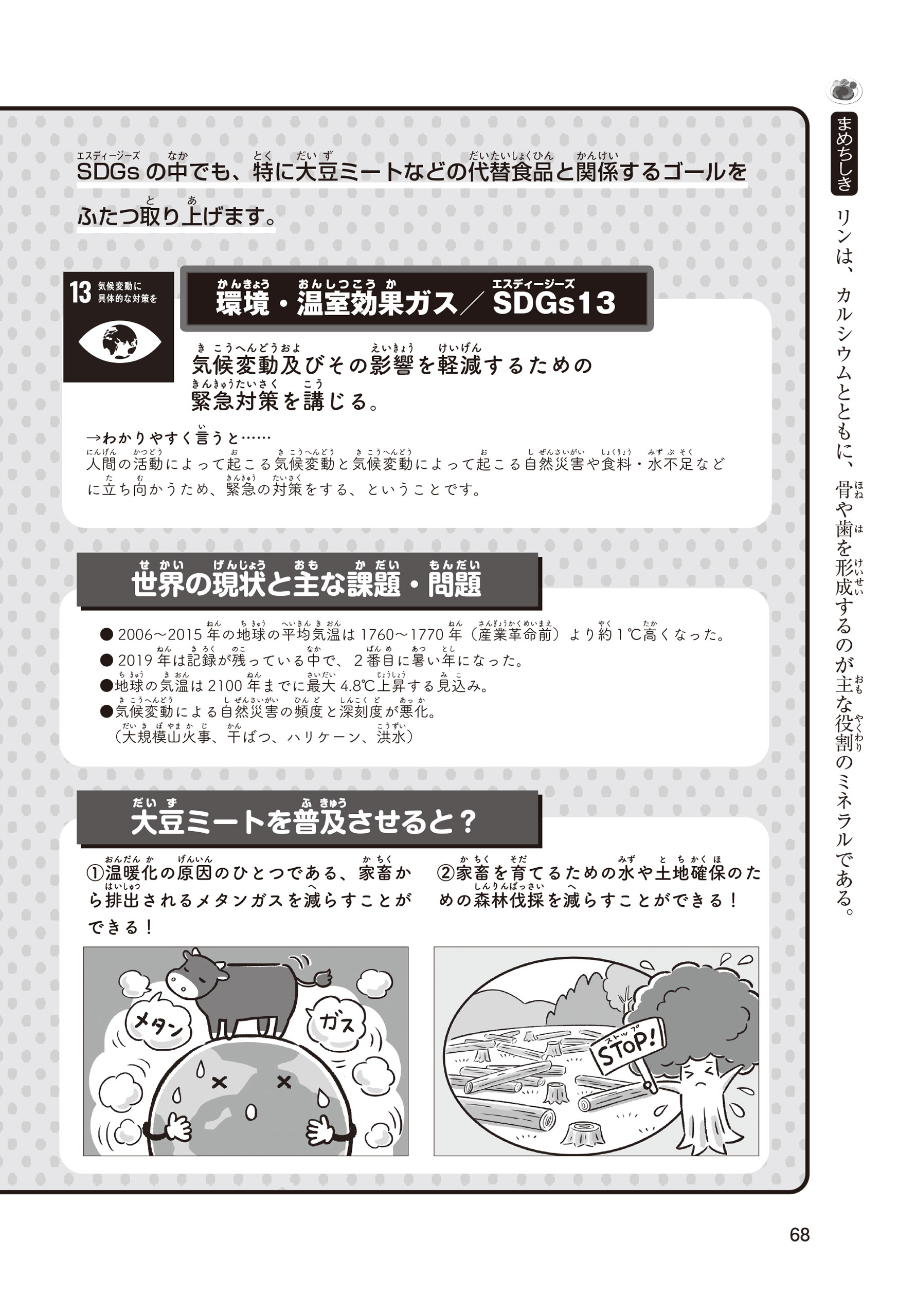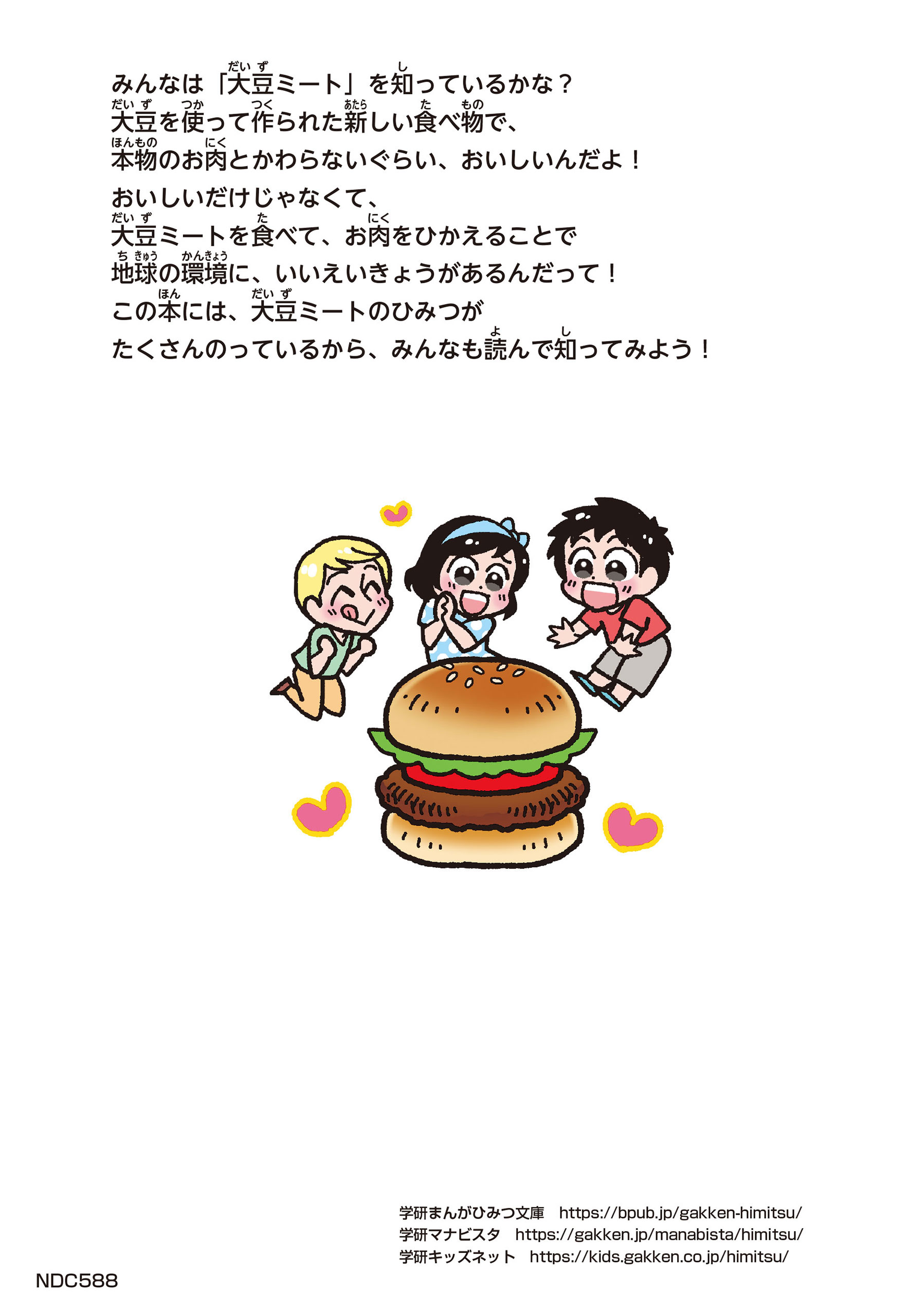みんな「大豆ミート」を知っているかな? 大豆を使って作られた食べ物で、本物のお肉とかわらないぐらいおいしいんだよ! おいしいだけじゃなくて、大豆ミートを食べて、お肉をひかえることで、地球の環境に、いいえいきょうがあるんだって! この本には、大豆ミートのひみつがたくさんのっているから、みんなも読んで知ってみよう!