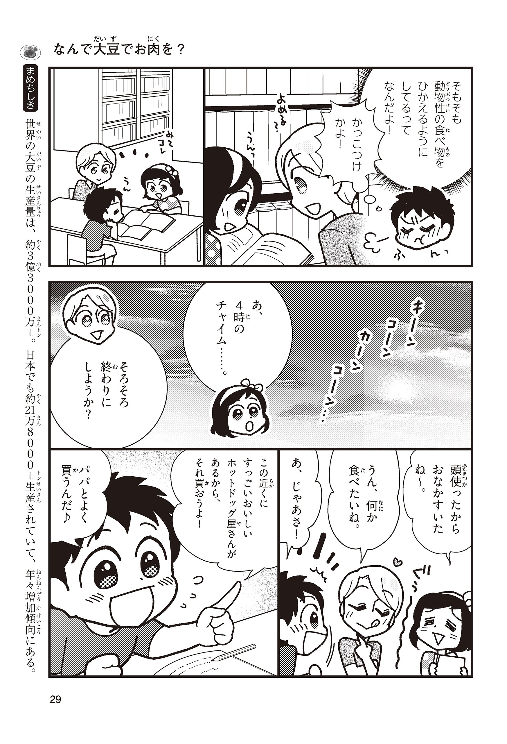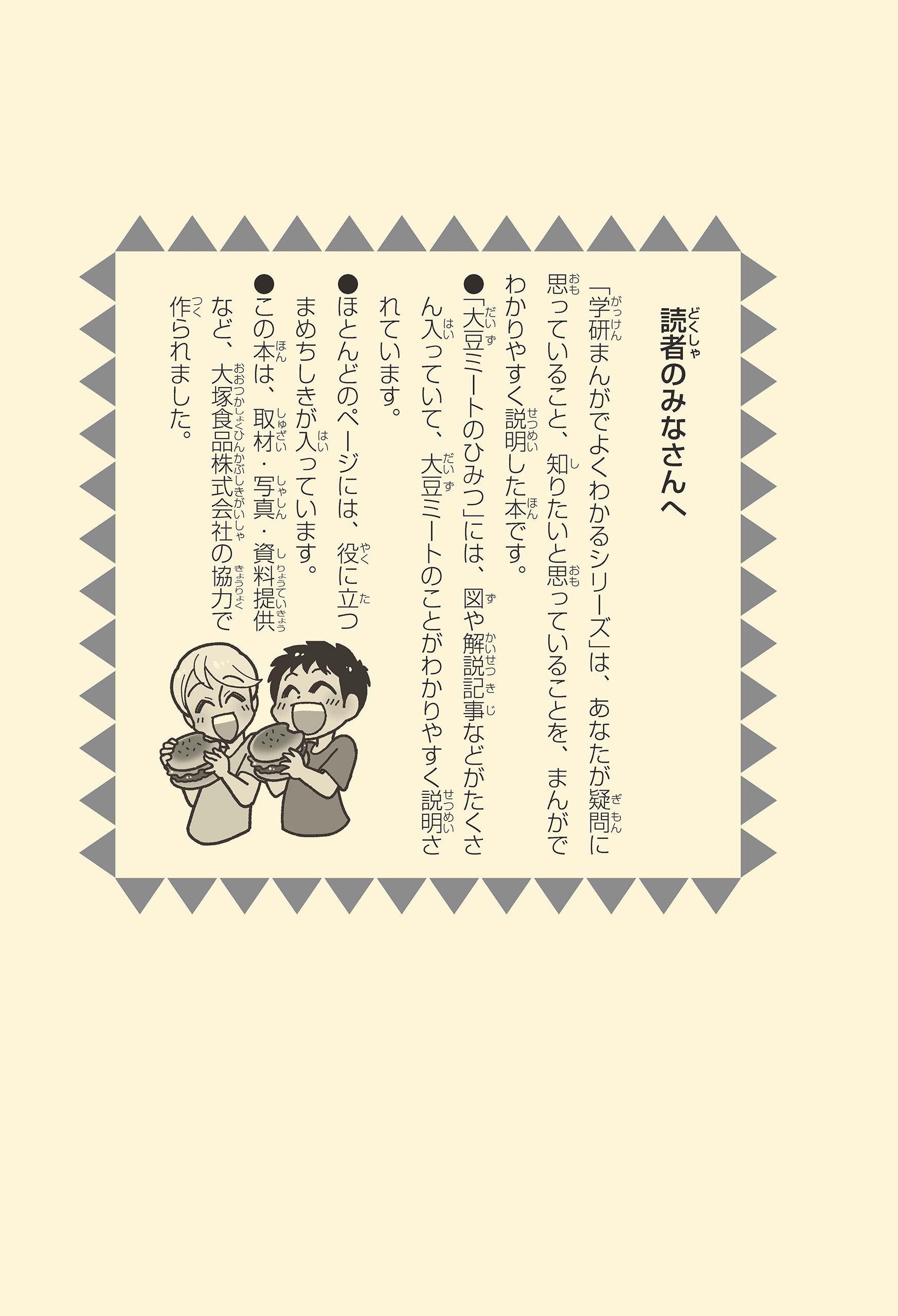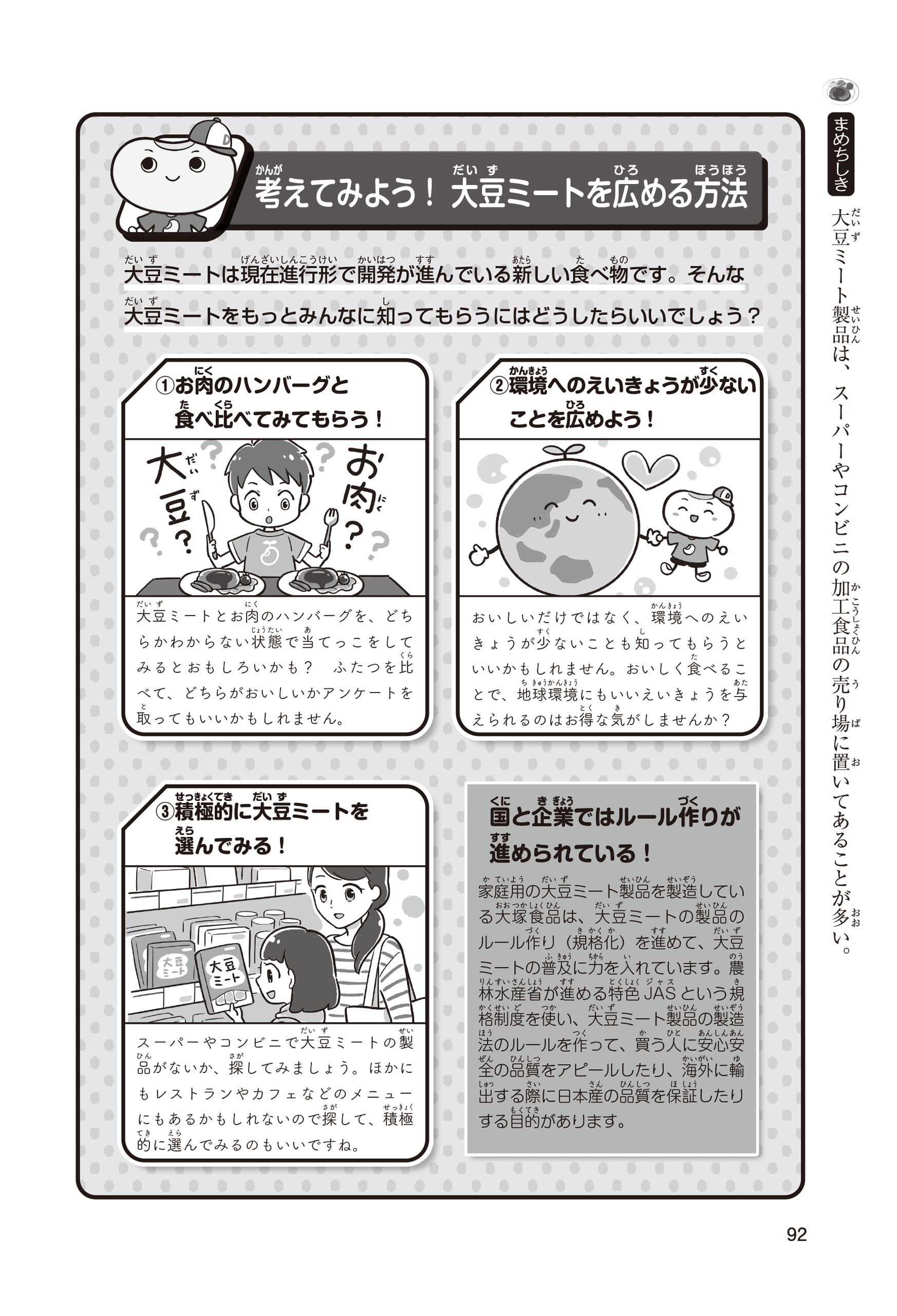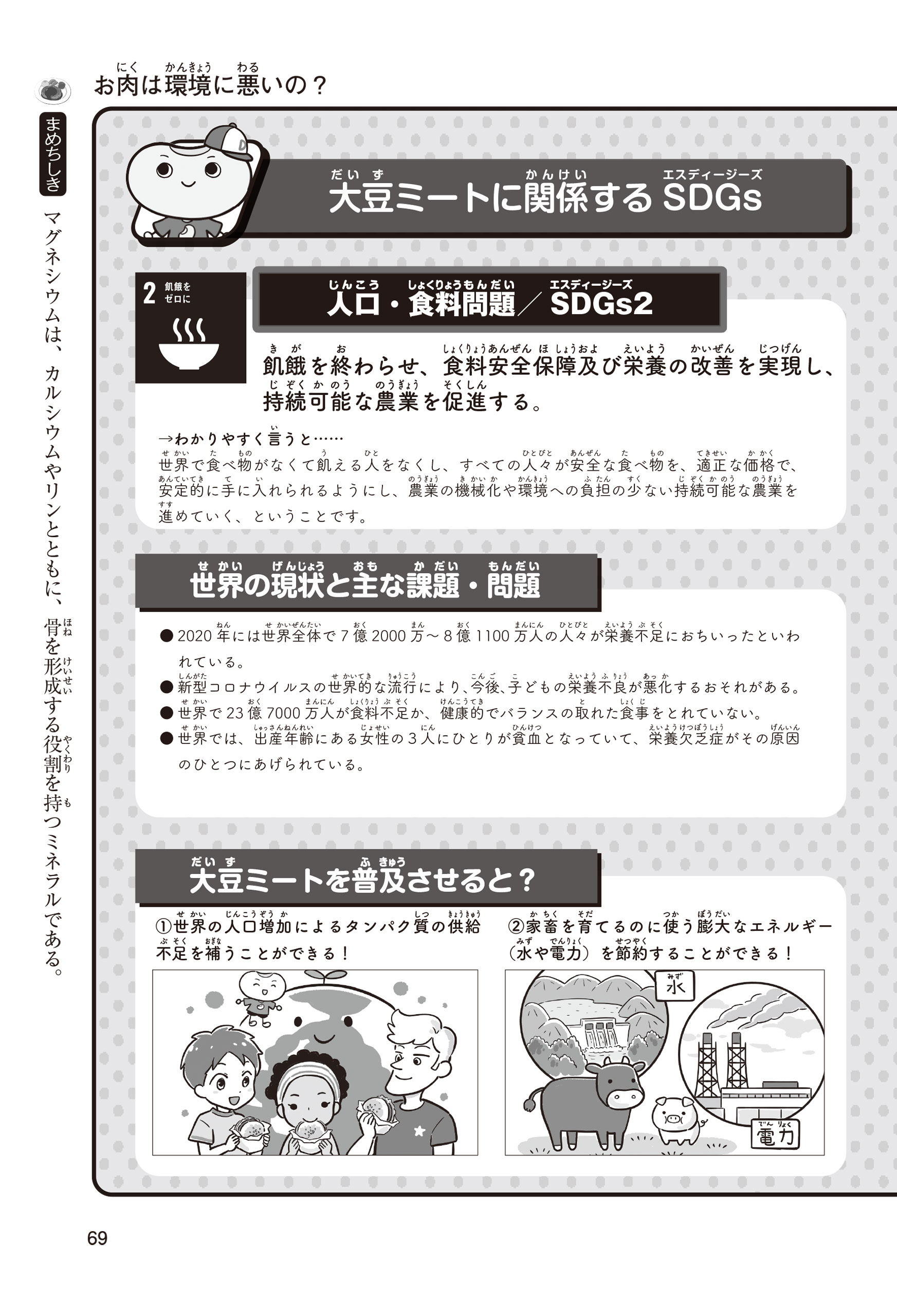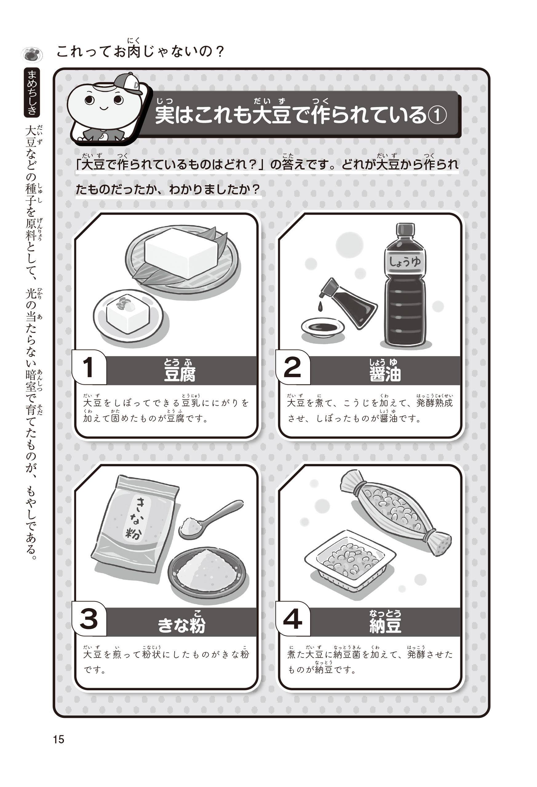 みんな「大豆ミート」を知っているかな? 大豆を使って作られた食べ物で、本物のお肉とかわらないぐらいおいしいんだよ! おいしいだけじゃなくて、大豆ミートを食べて、お肉をひかえることで、地球の環境に、いいえいきょうがあるんだって! この本には、大豆ミートのひみつがたくさんのっているから、みんなも読んで知ってみよう!