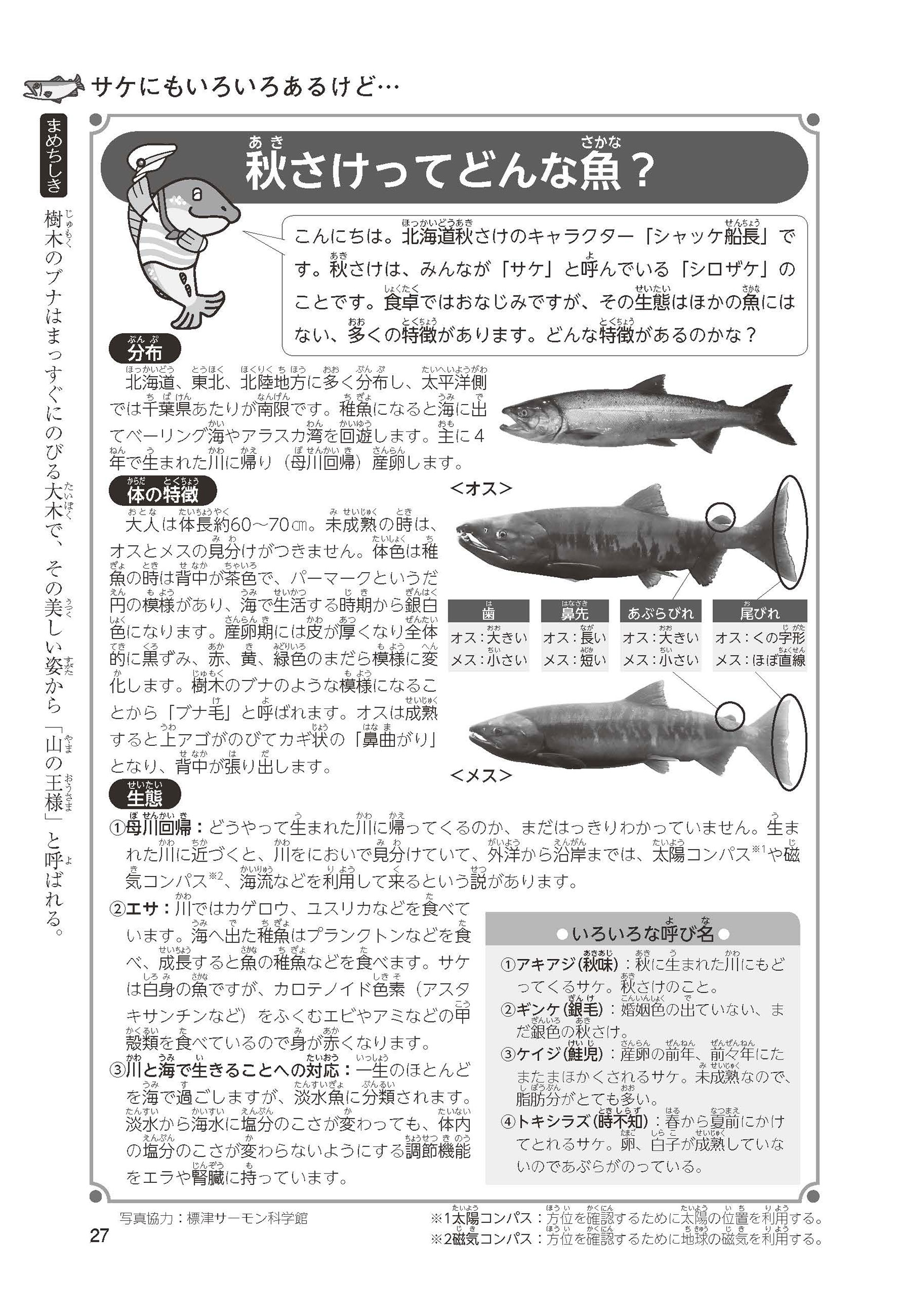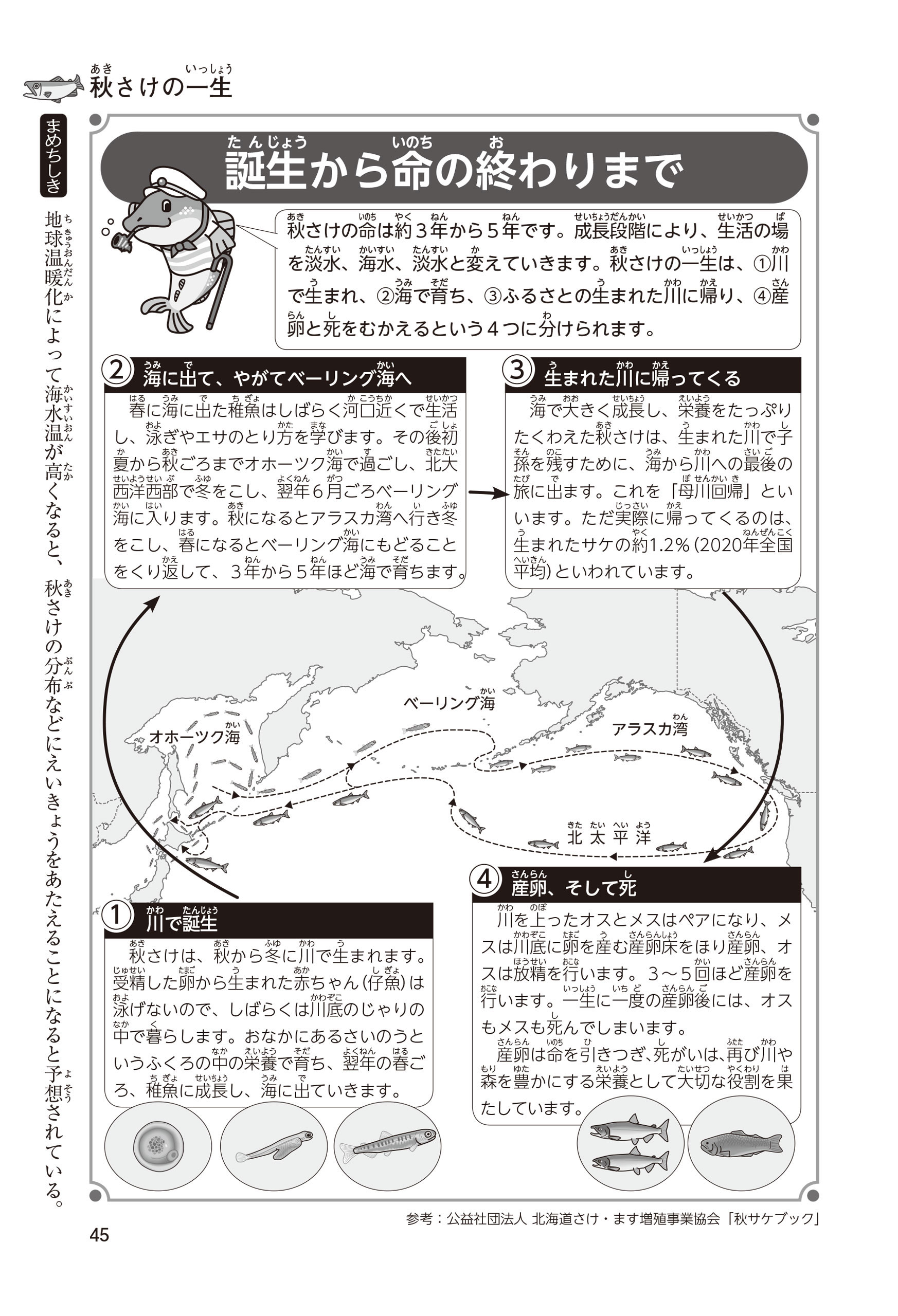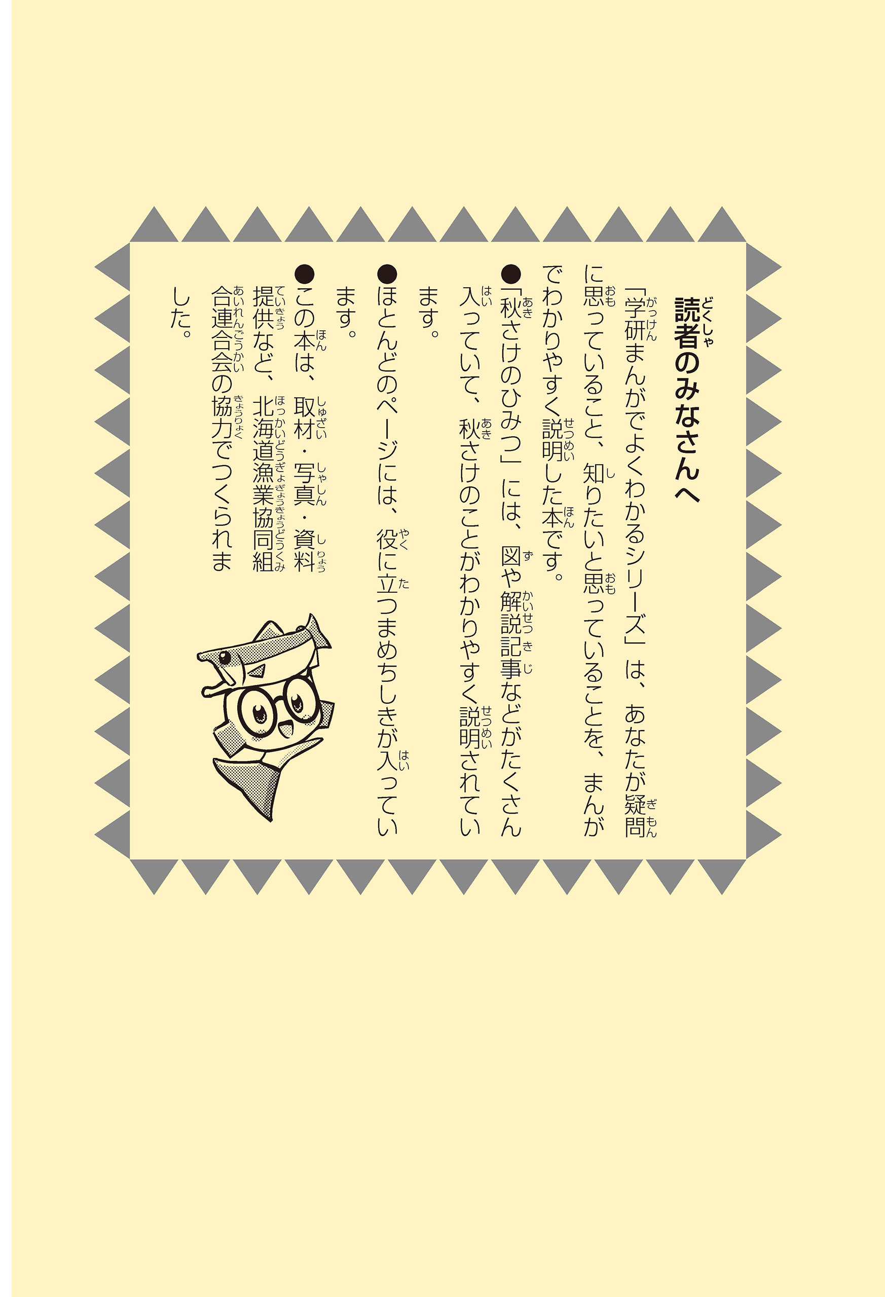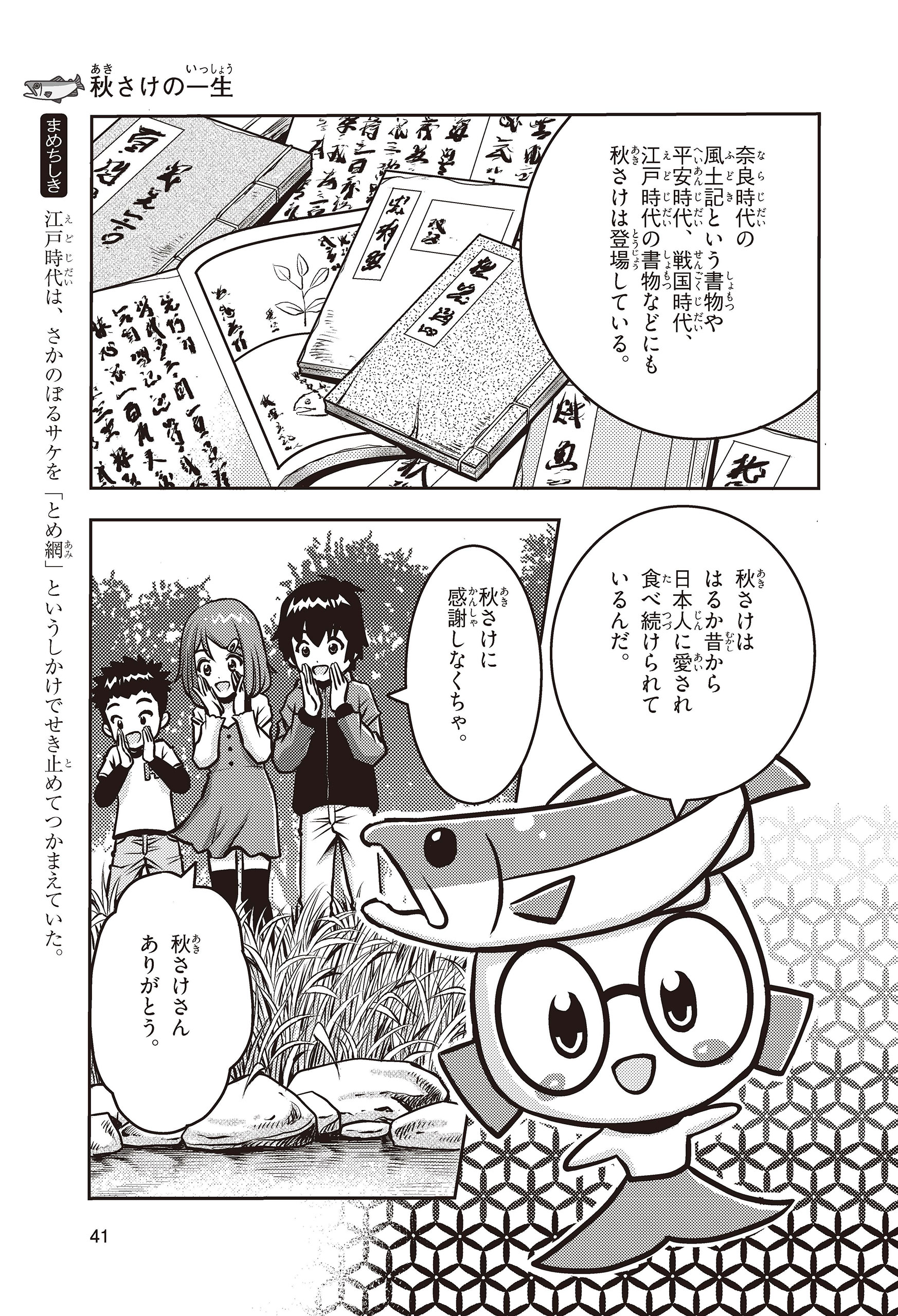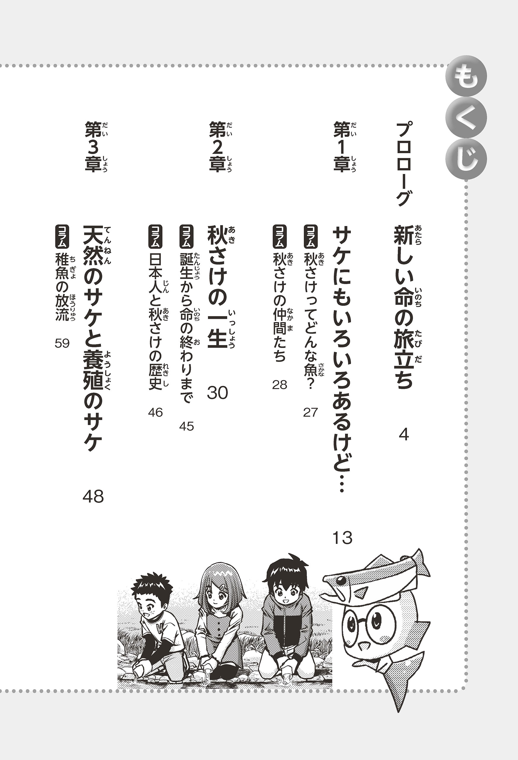 秋さけはサケ科の魚、シロザケのことなんだ。川で生まれて、海で育つって知ってた? 毎年秋になると、成長した秋さけが遠くはなれた広い海から生まれた川にもどってくるんだって。どんな一生を送るのかな? どんな特徴があるのかな? 漁師さんは、どんな方法で秋さけをとっているんだろう? この本を読めば、秋さけのことがとてもよくわかるよ!